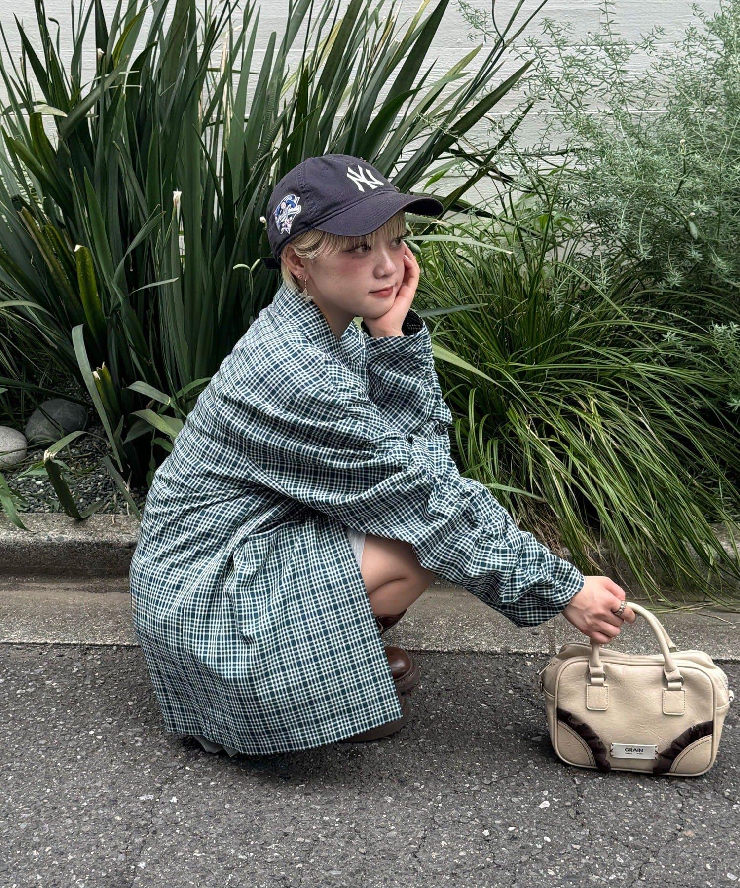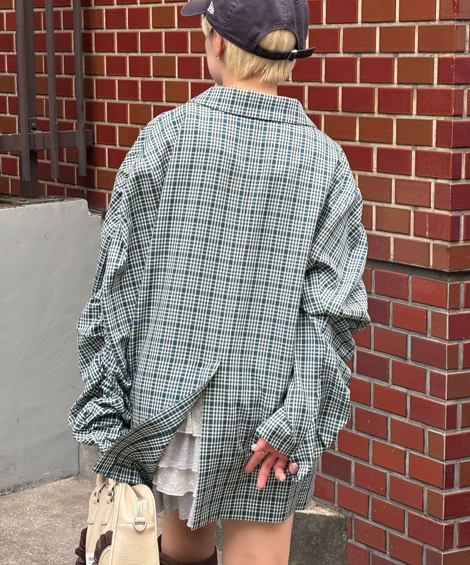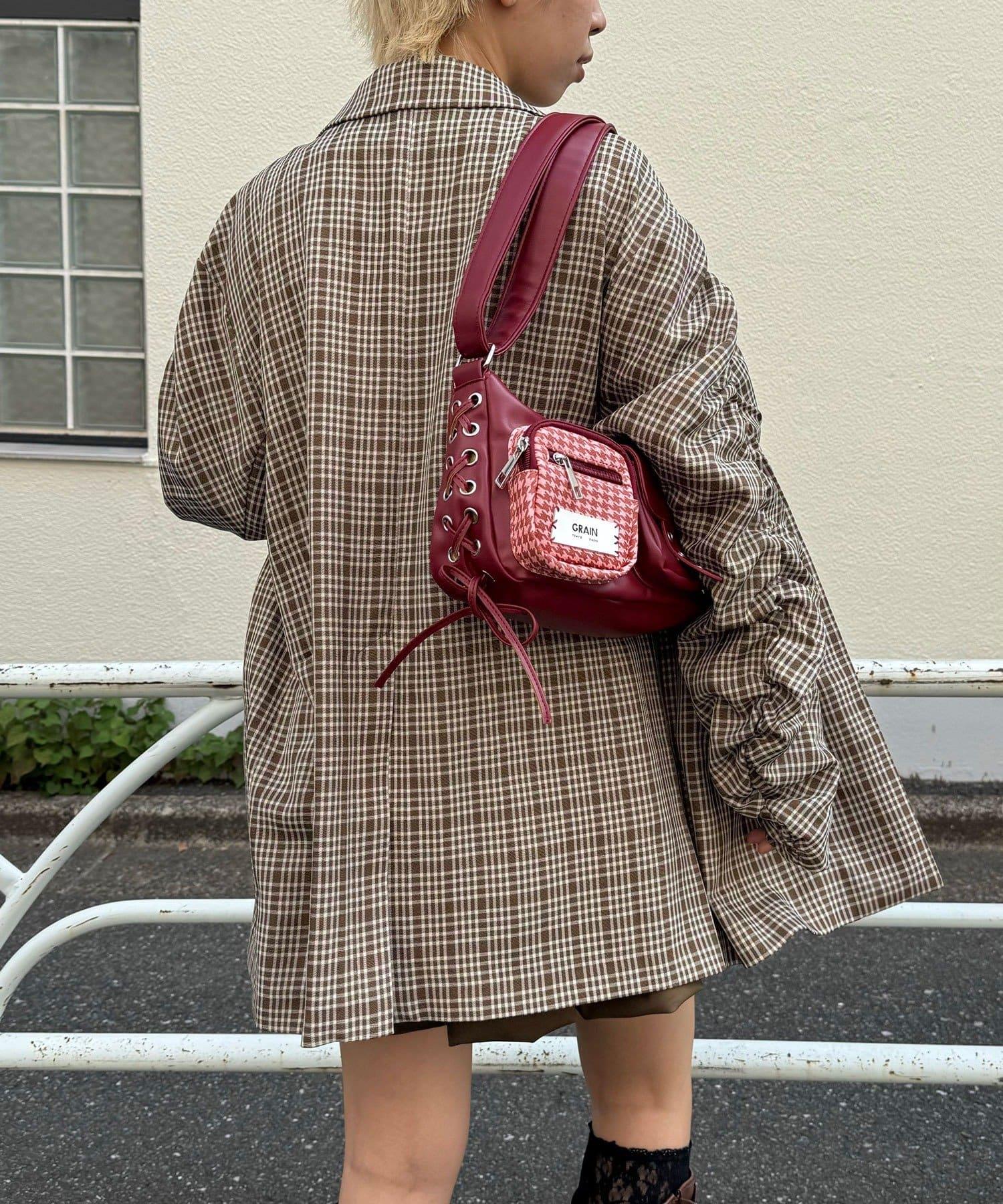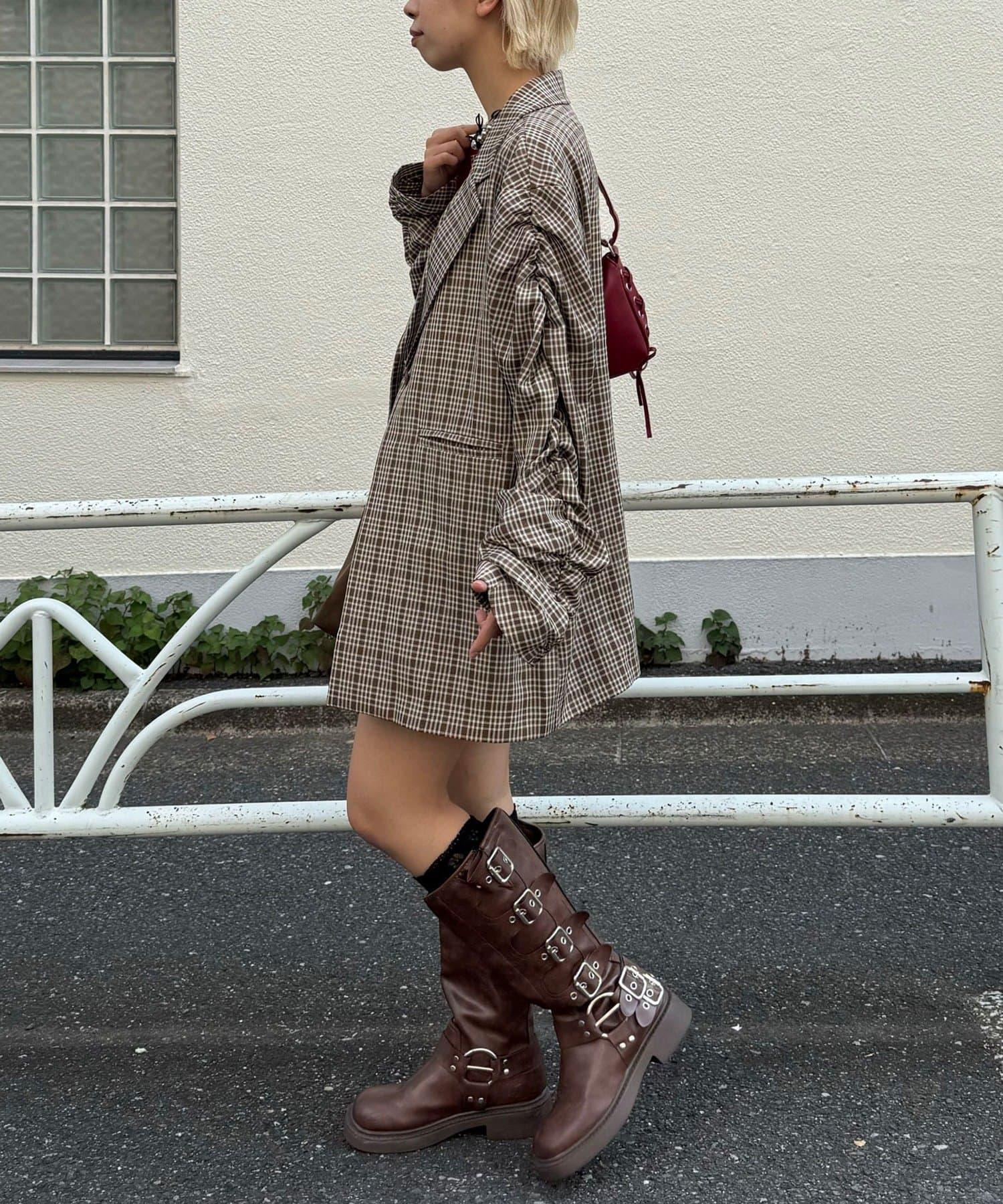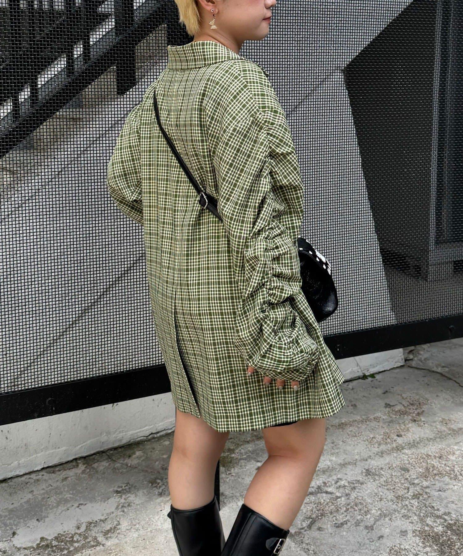 寬鬆廓形的 "老爺爺 "式夾克,肩部平放,飾有棋盤格圖案。