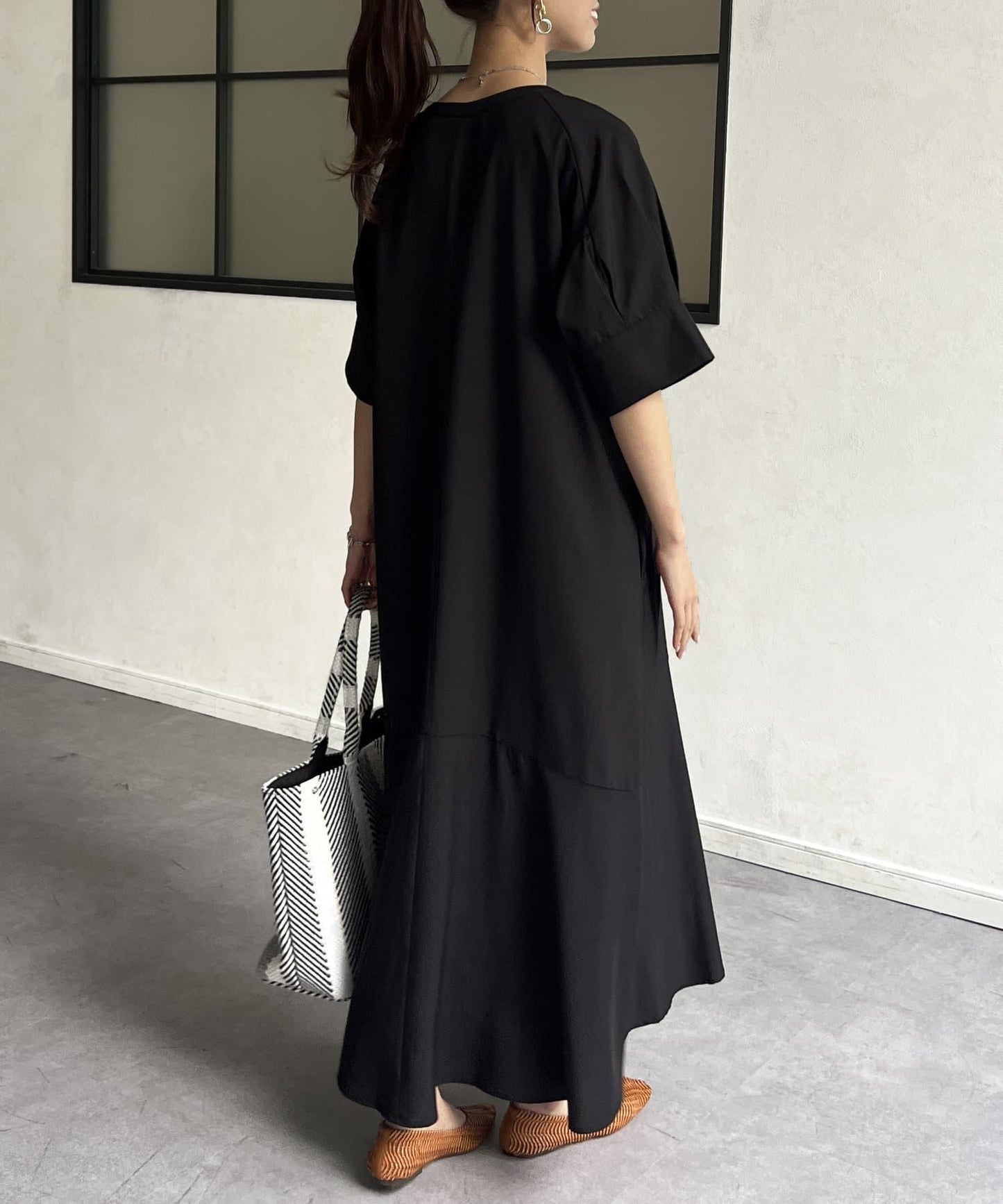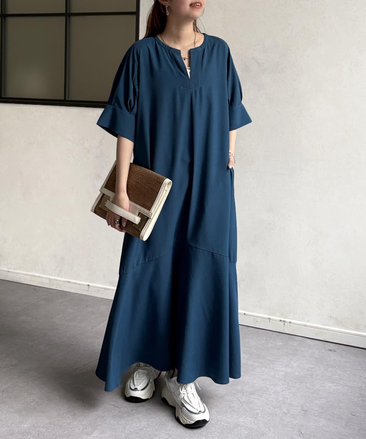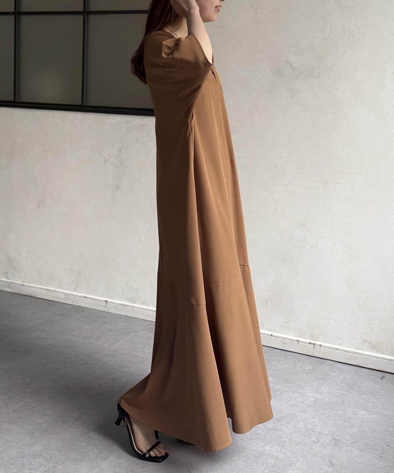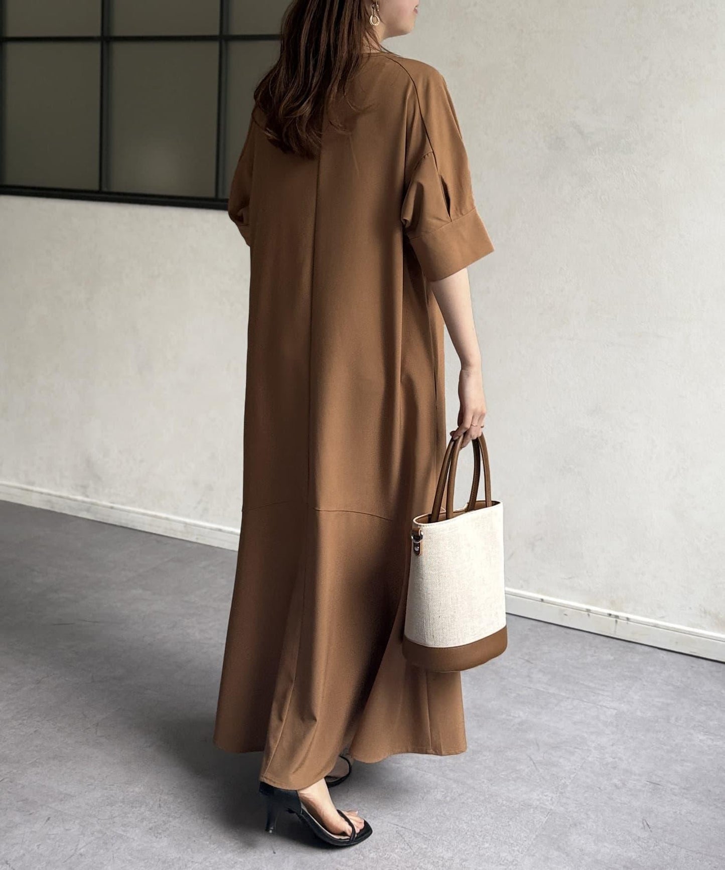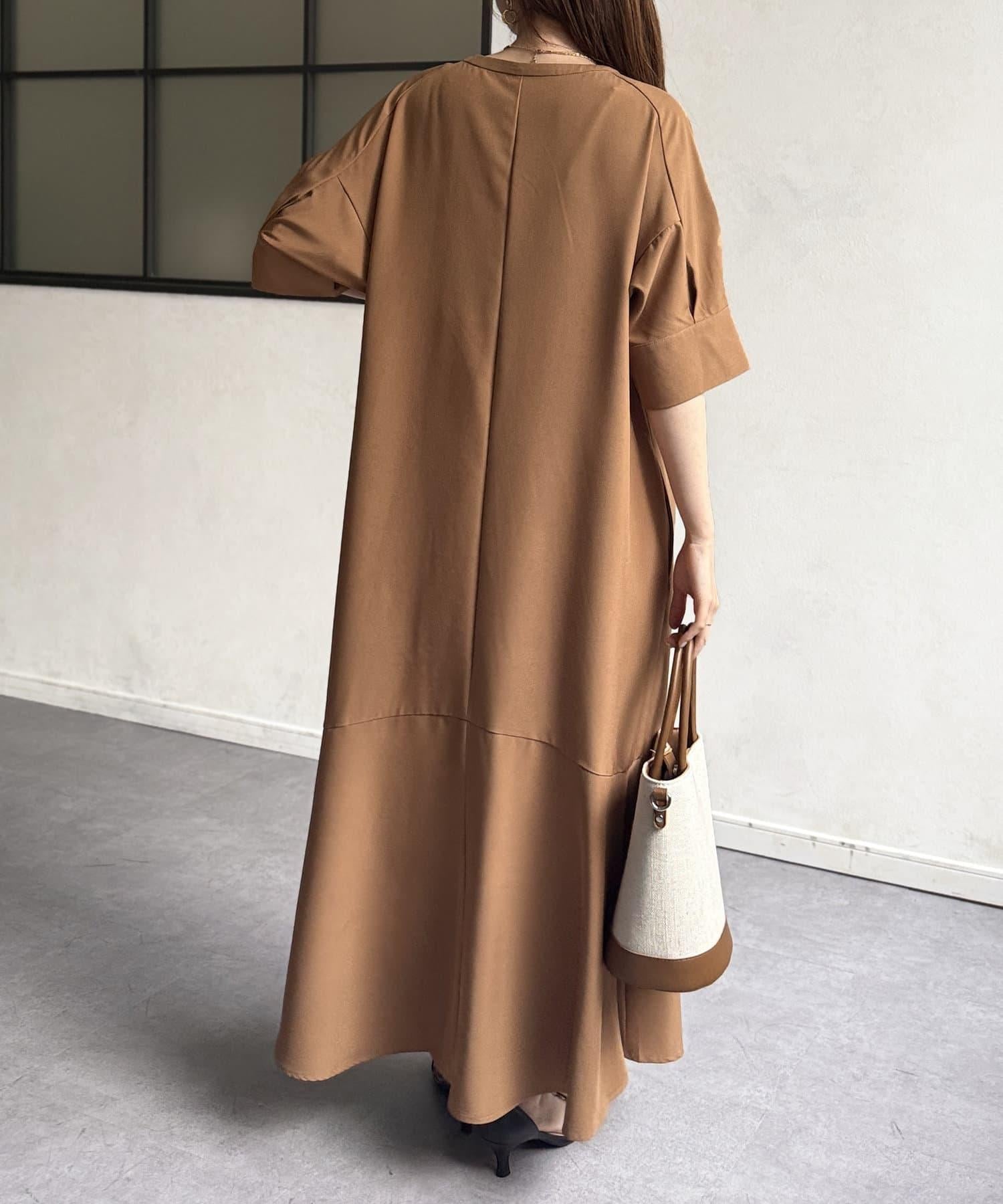 這款連衣裙的輪廓蓬鬆,向下擺延伸,並採用了大方的聚攏設計。