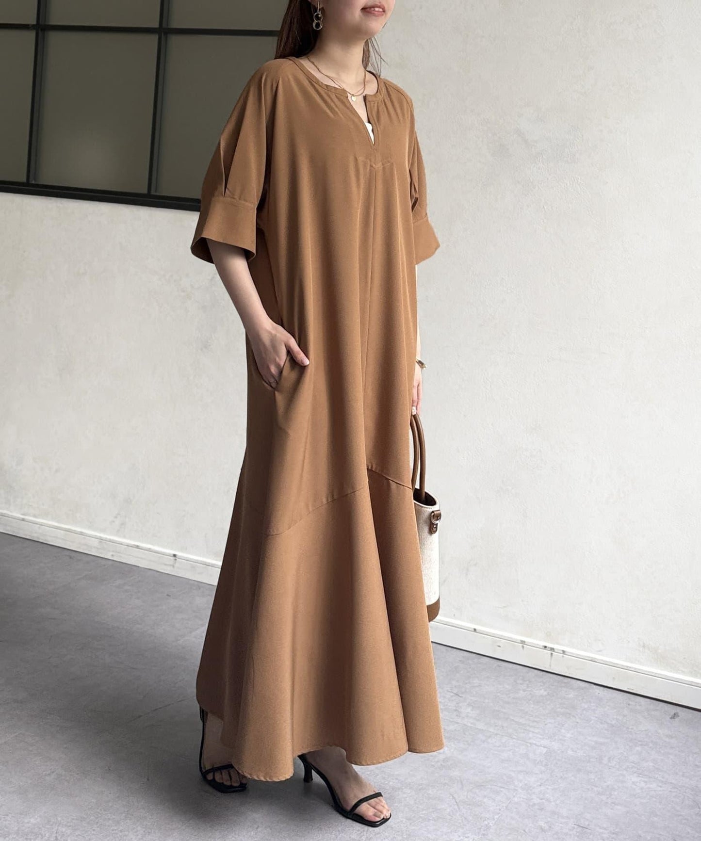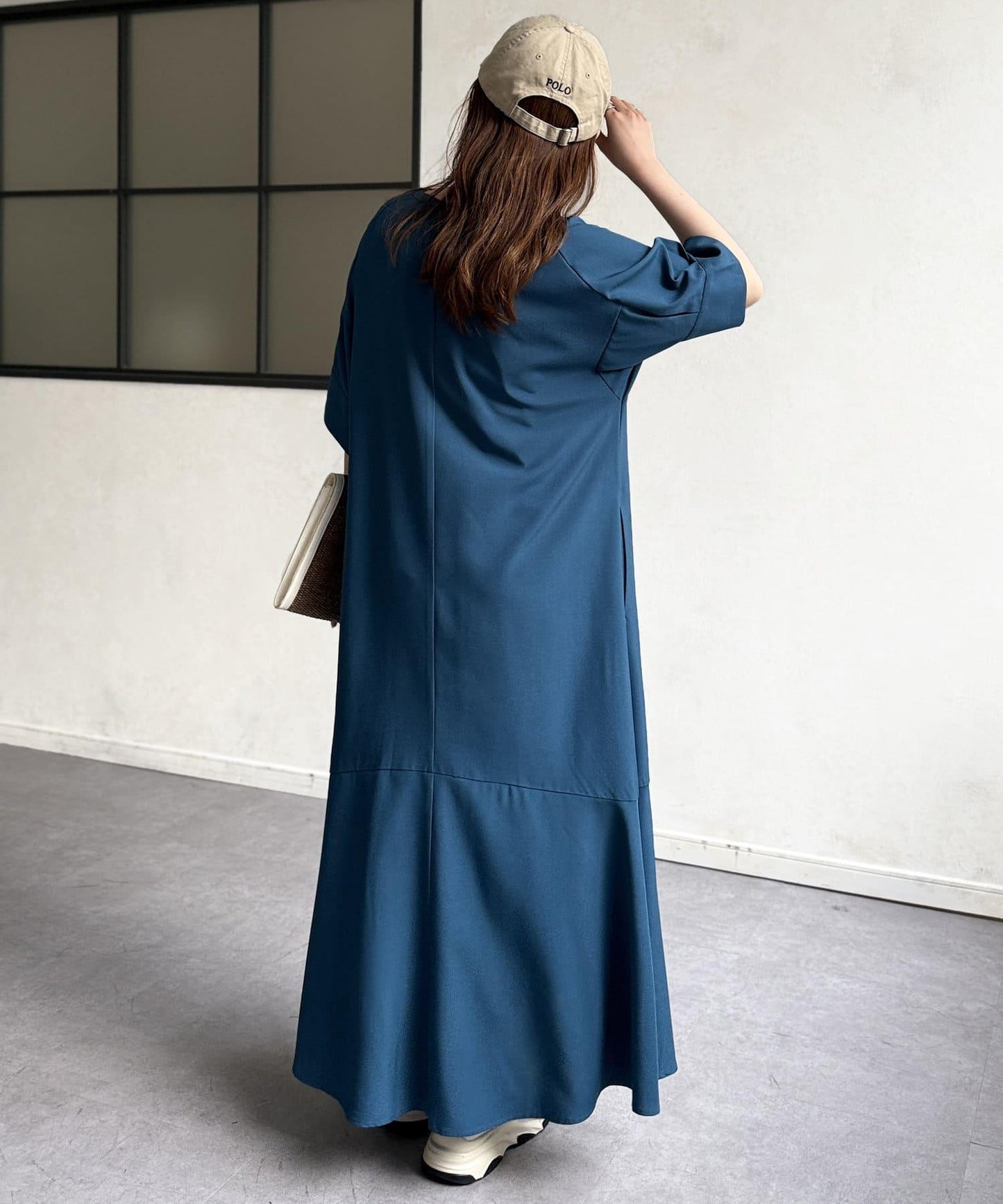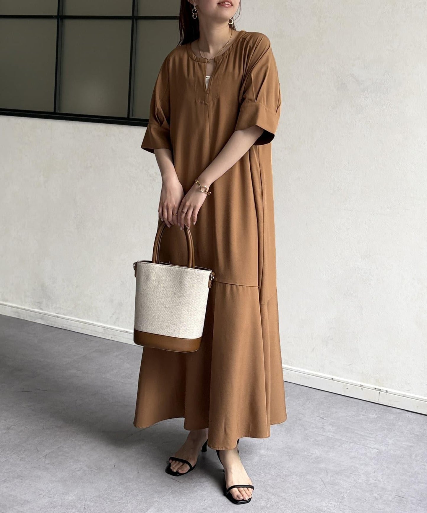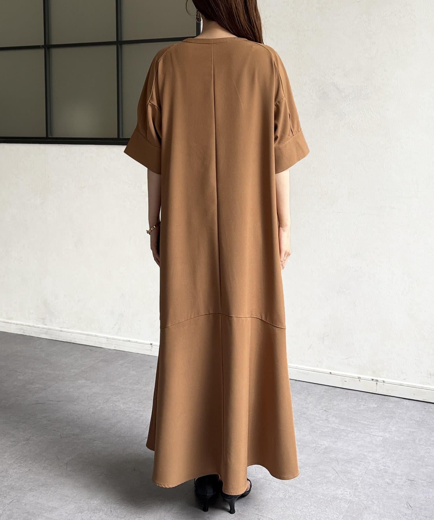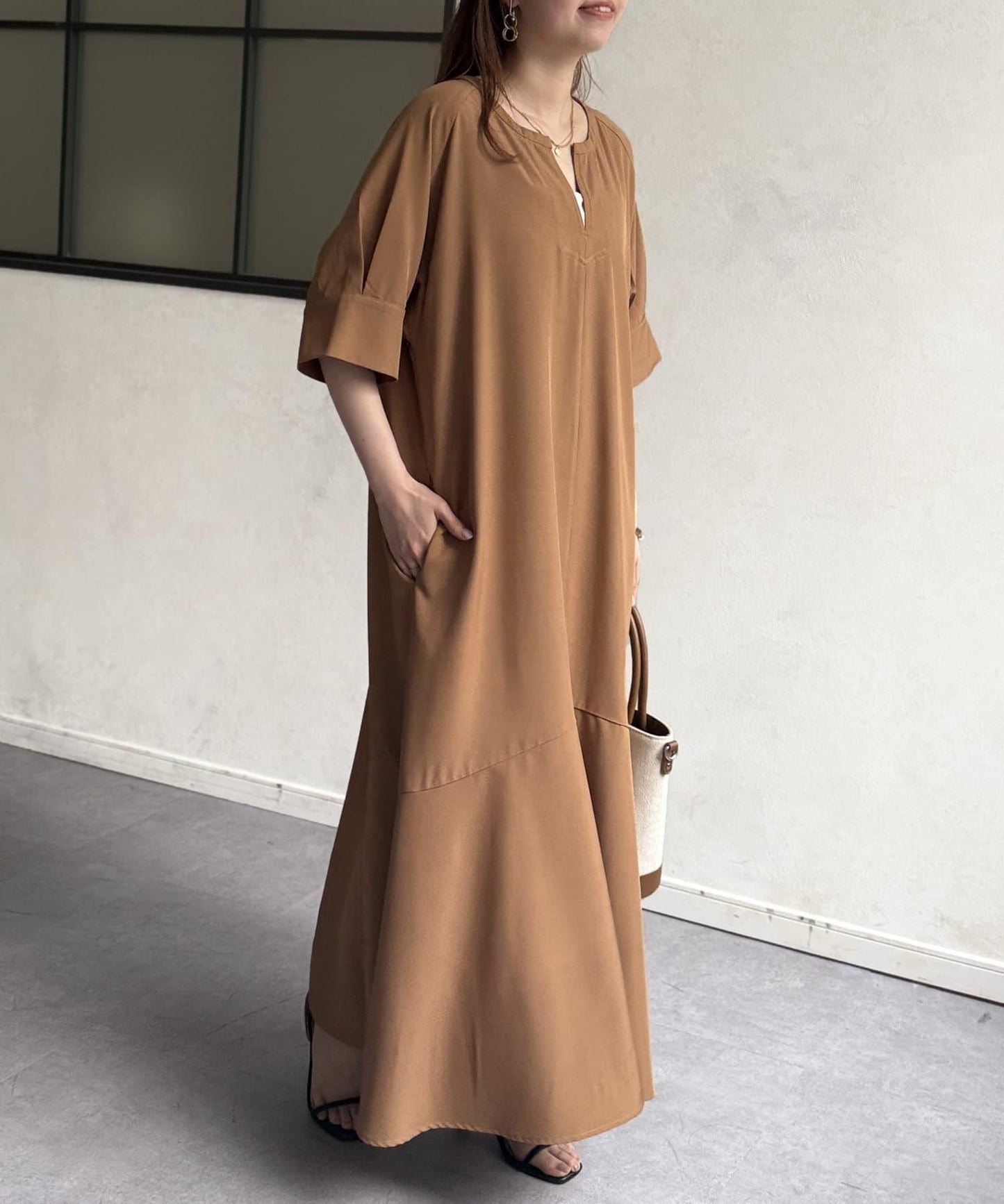 這款連衣裙的輪廓蓬鬆,向下擺延伸,並採用了大方的聚攏設計。