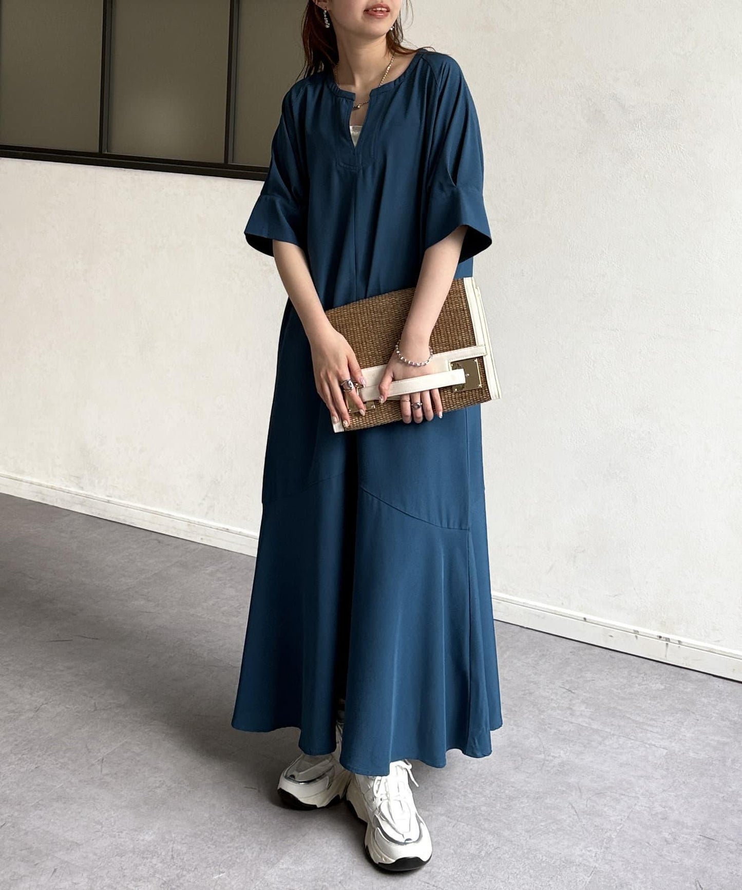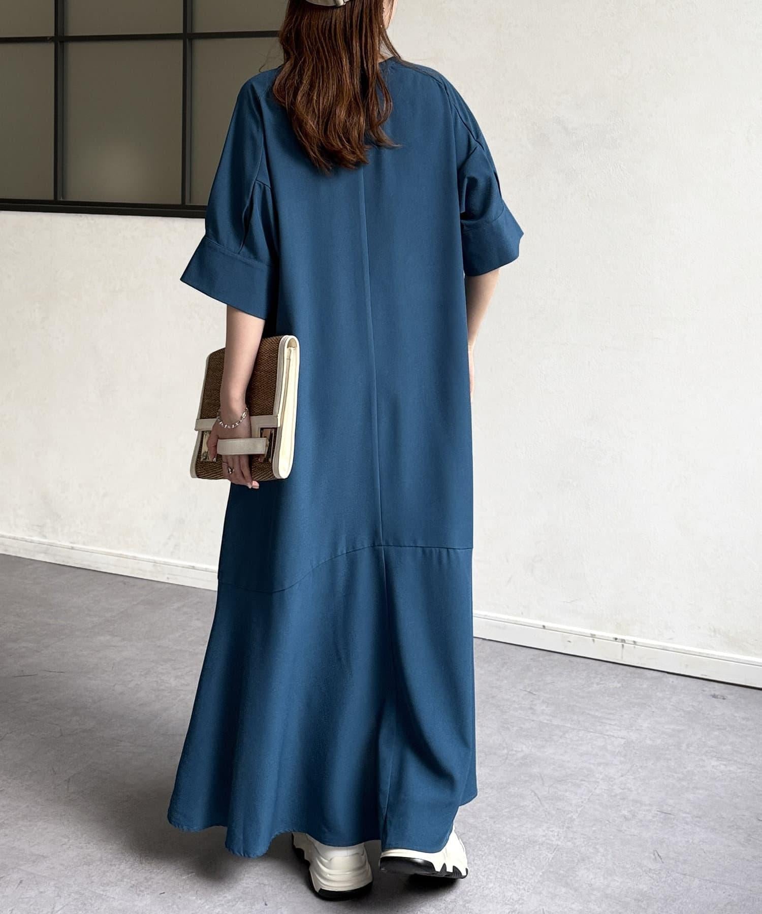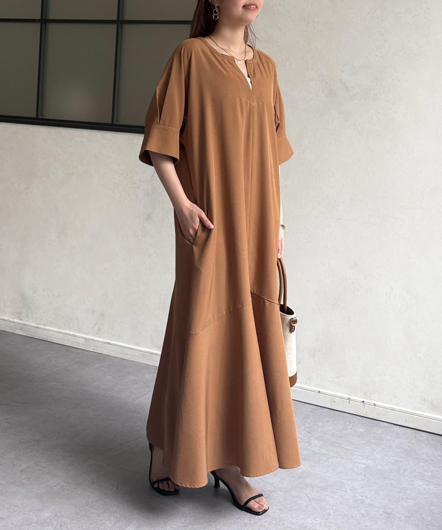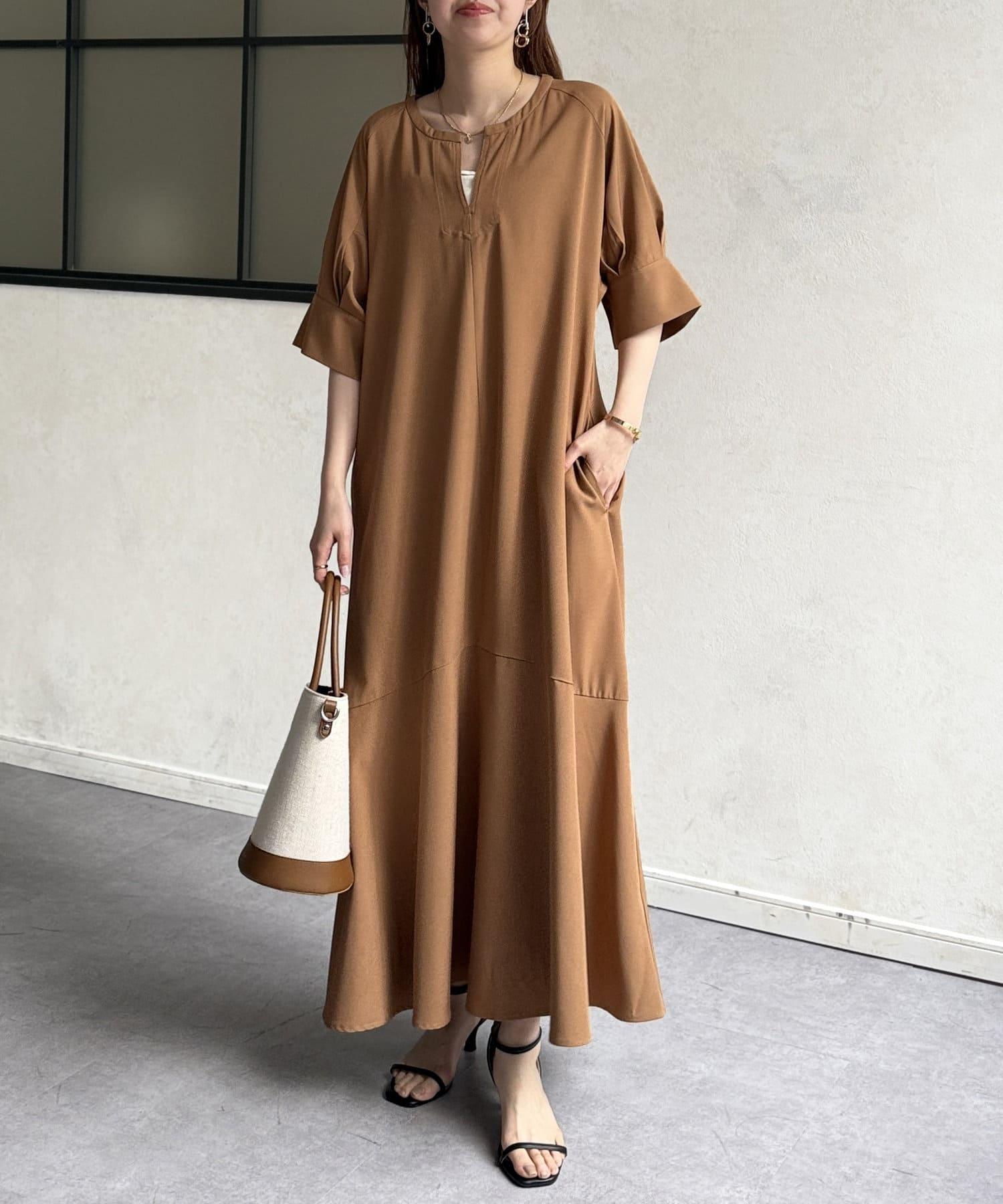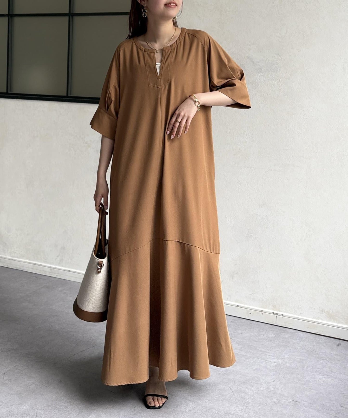 這款連衣裙的輪廓蓬鬆,向下擺延伸,並採用了大方的聚攏設計。