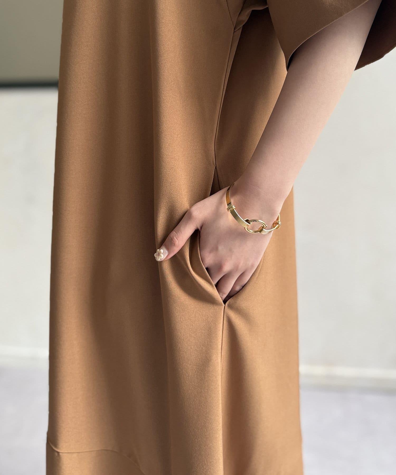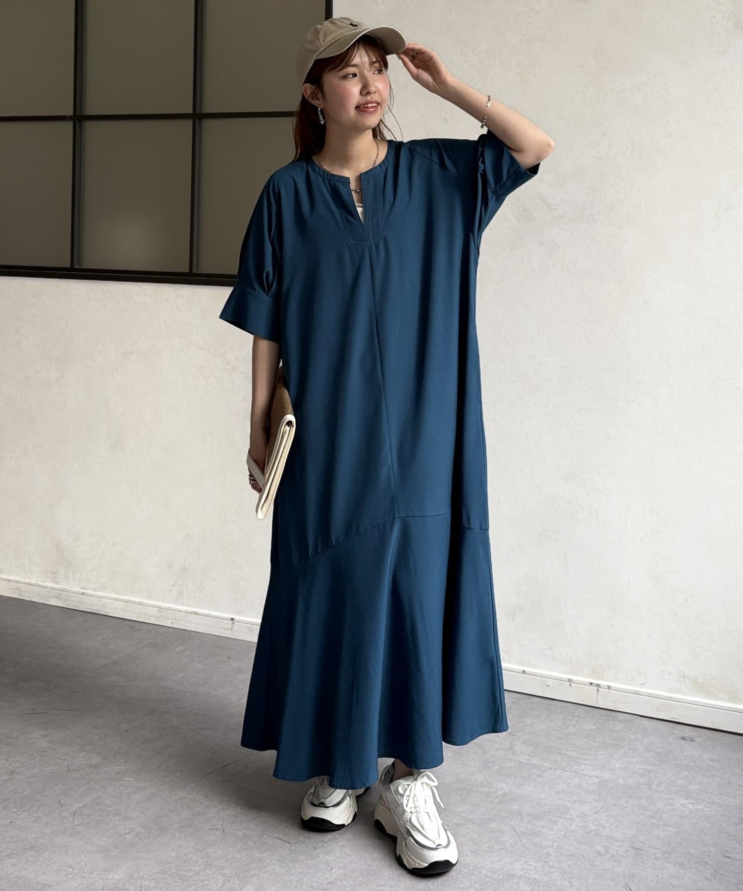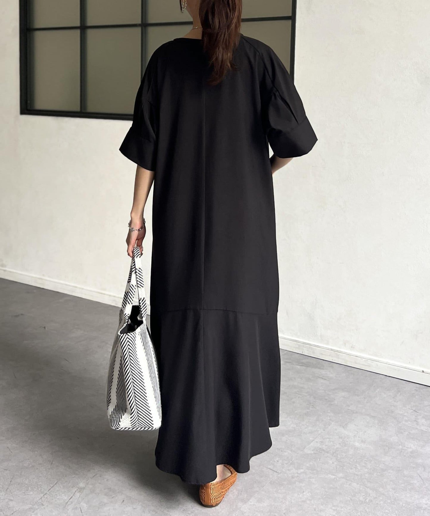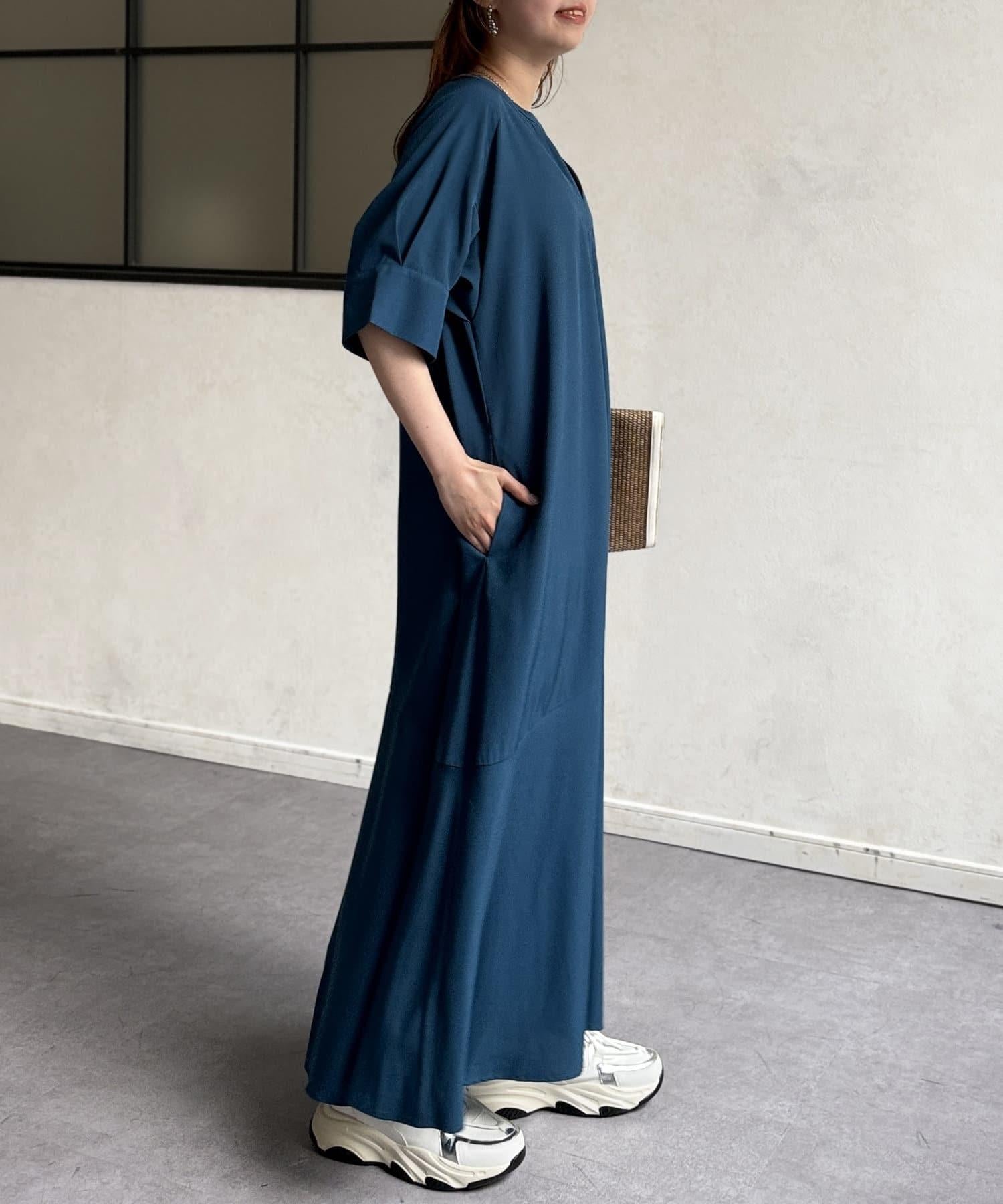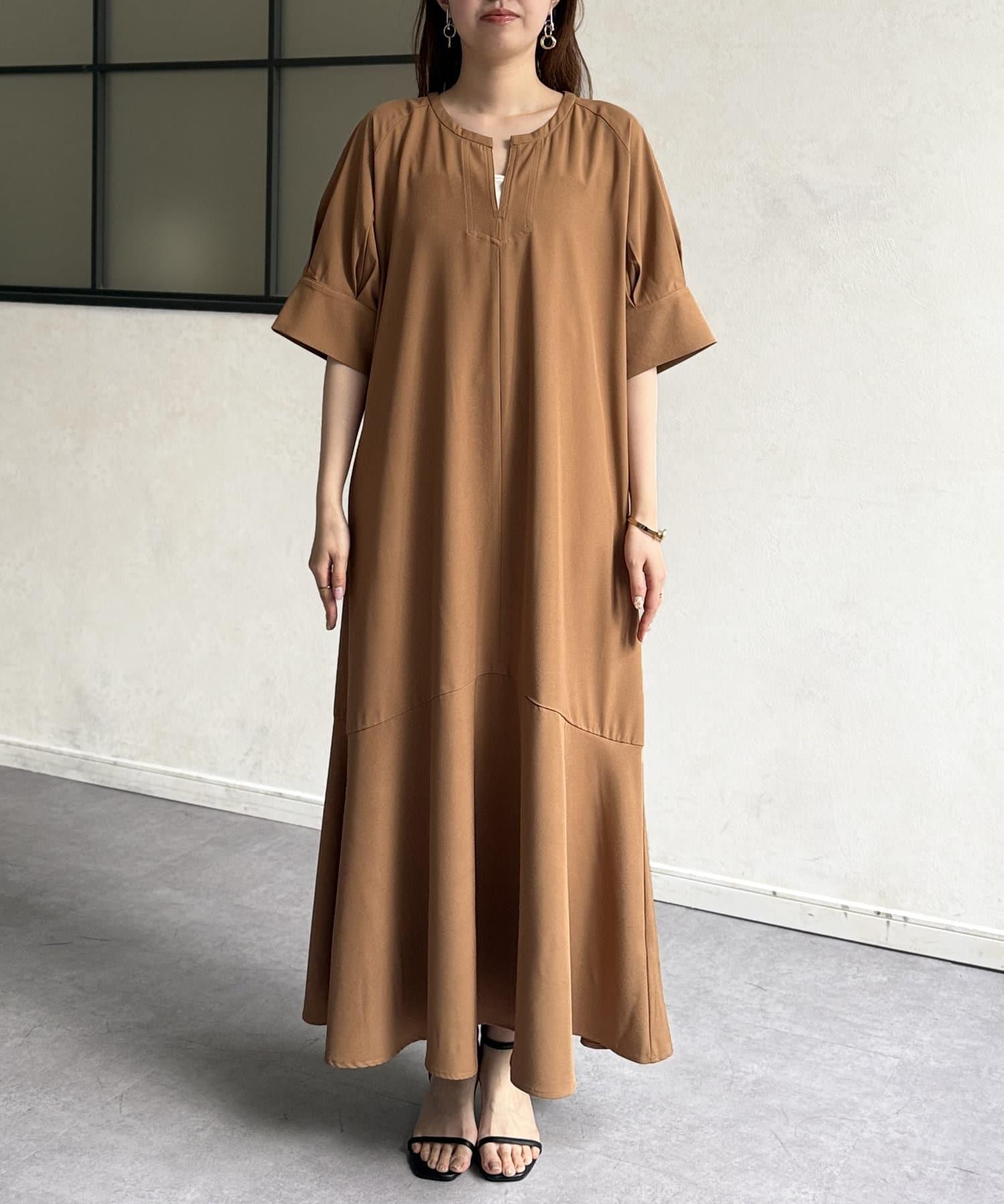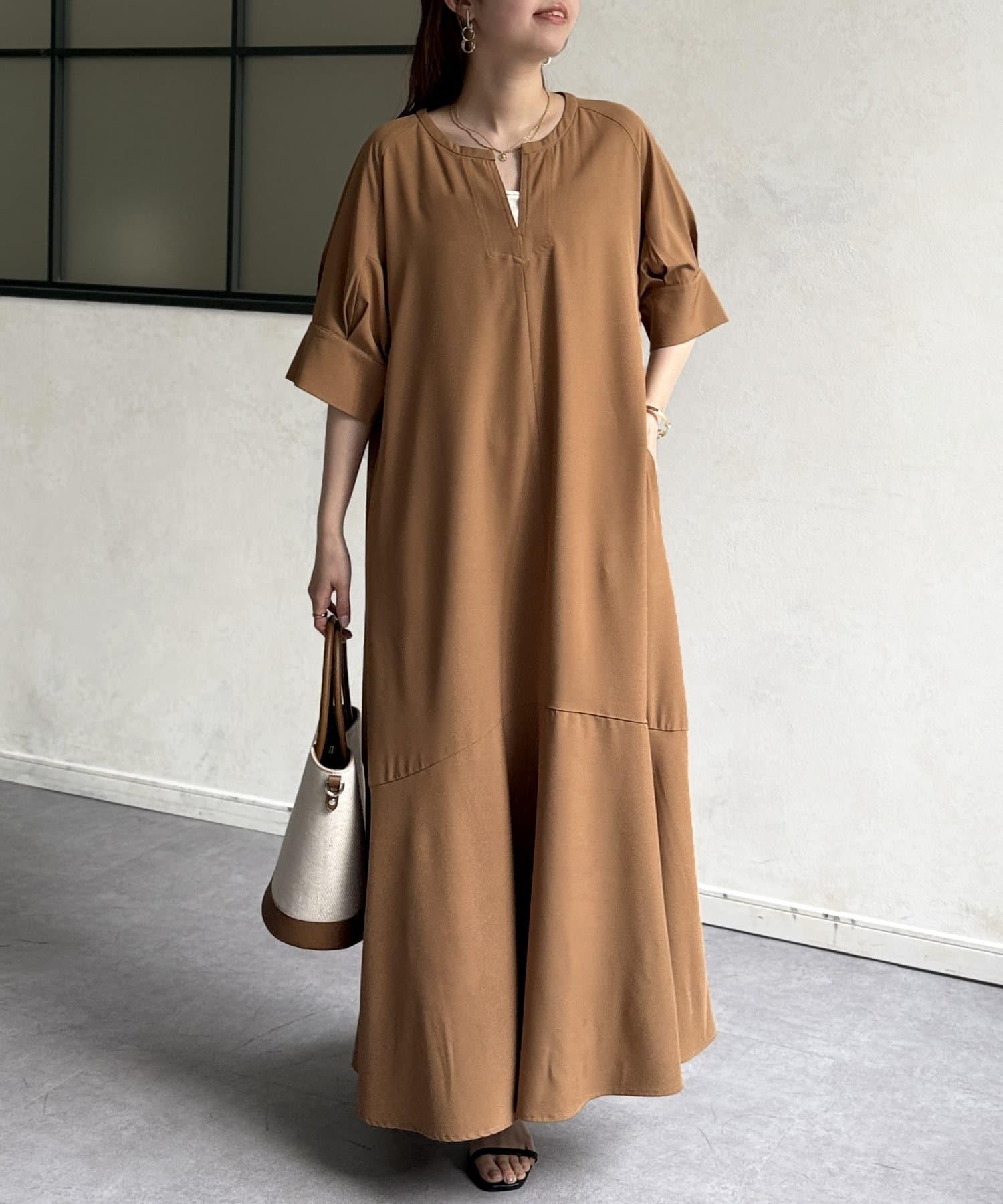 這款連衣裙的輪廓蓬鬆,向下擺延伸,並採用了大方的聚攏設計。