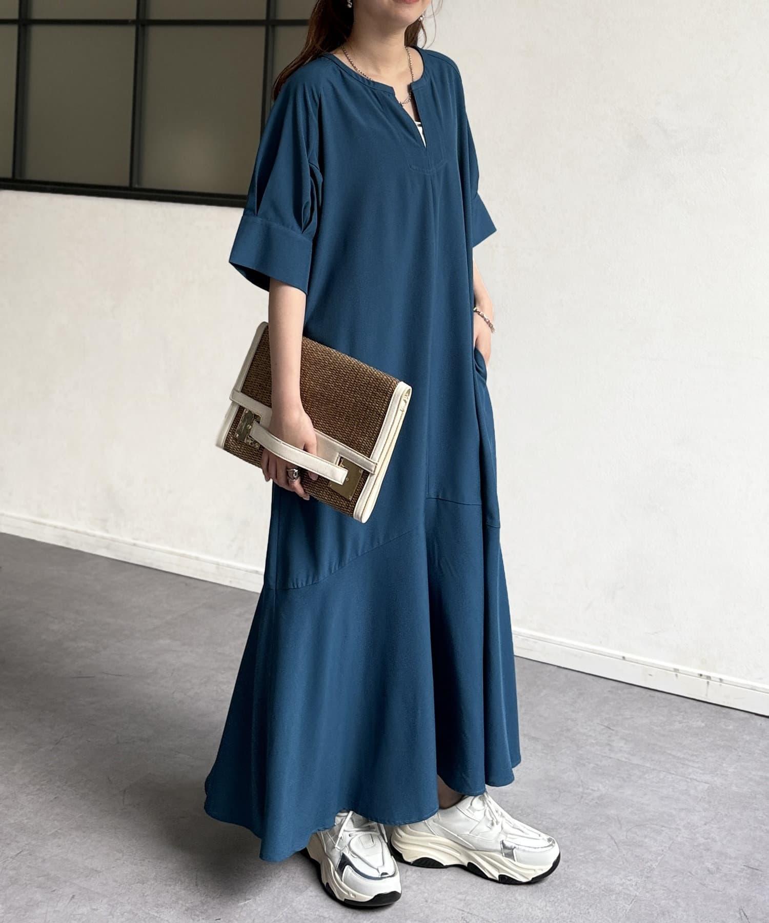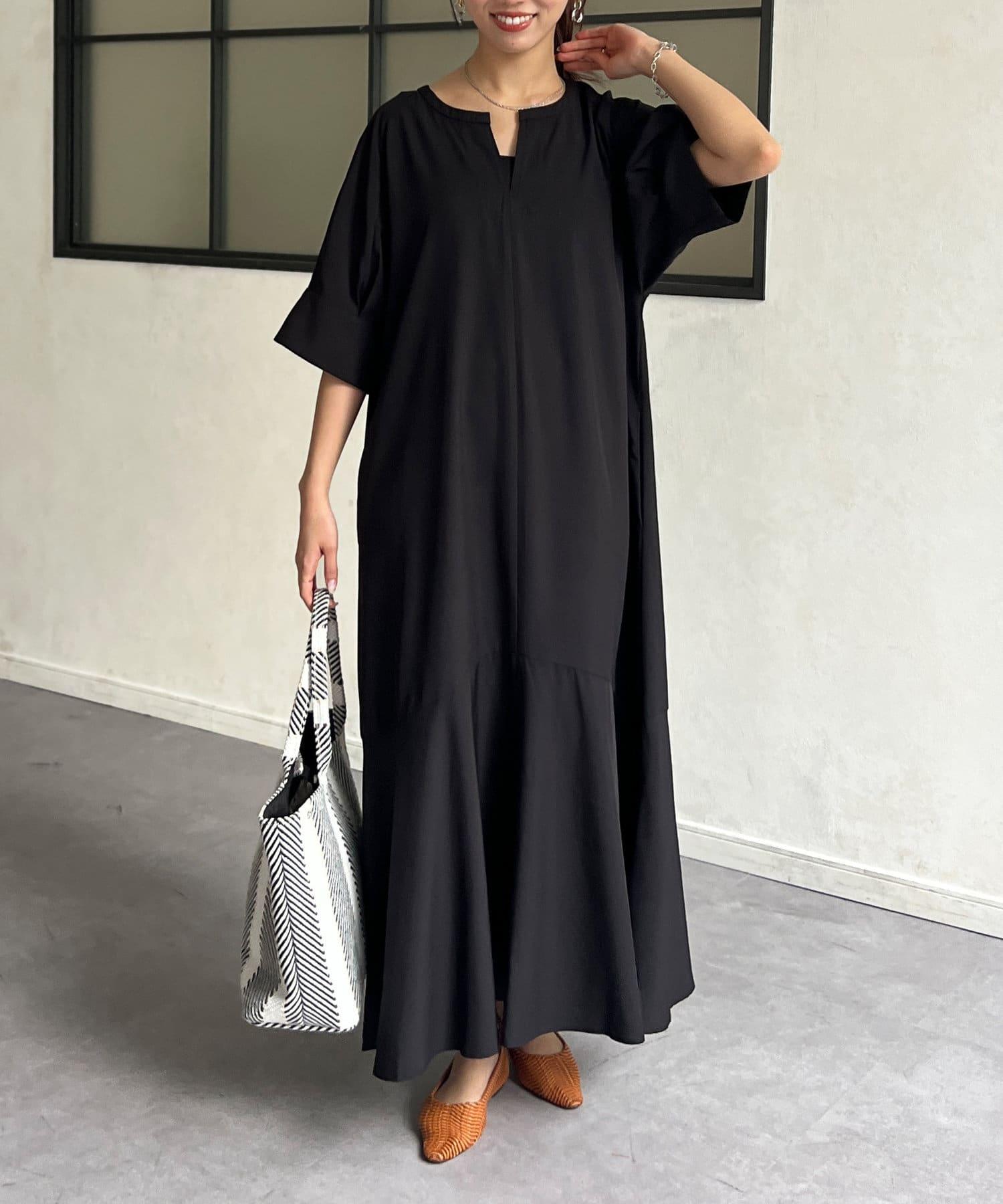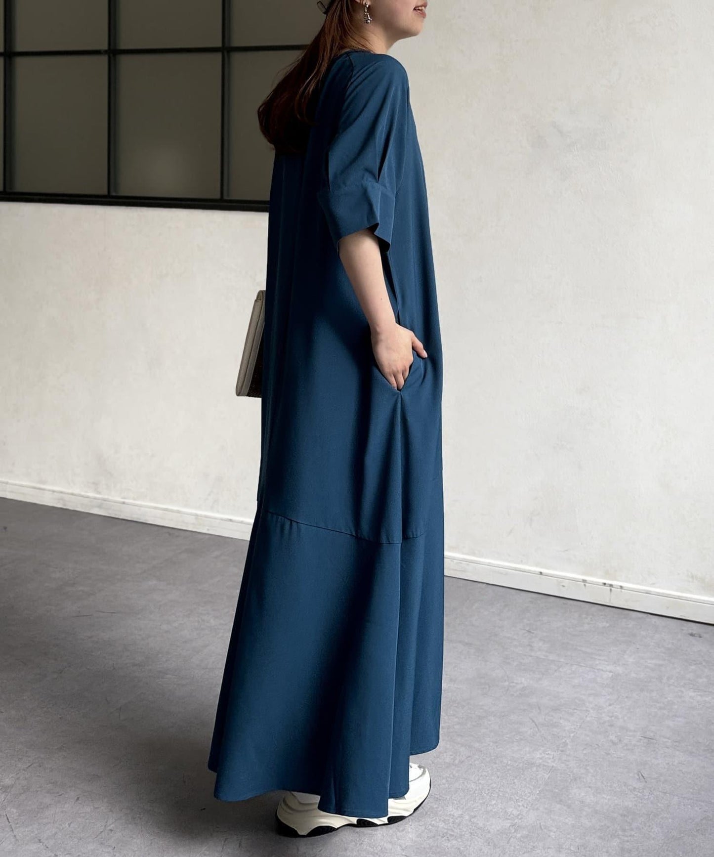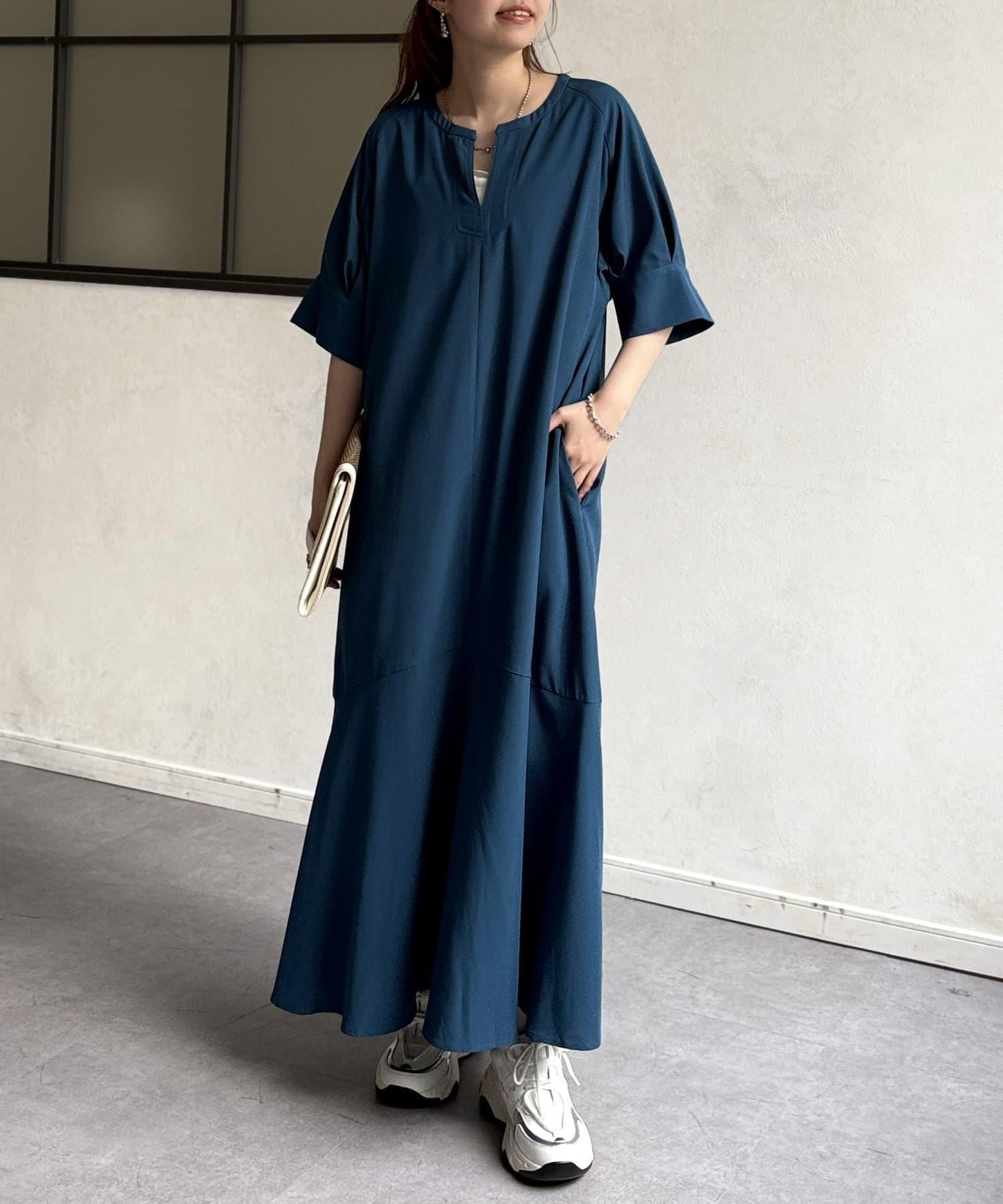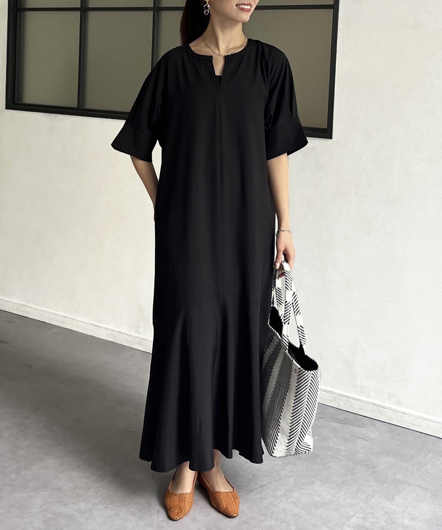 這款連衣裙的輪廓蓬鬆,向下擺延伸,並採用了大方的聚攏設計。