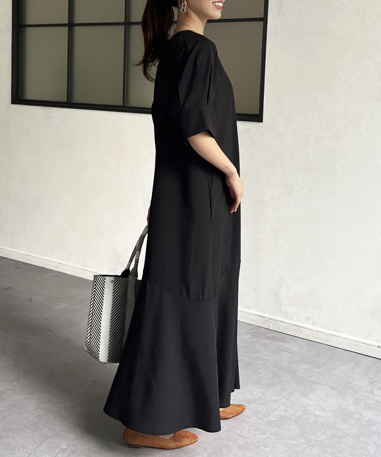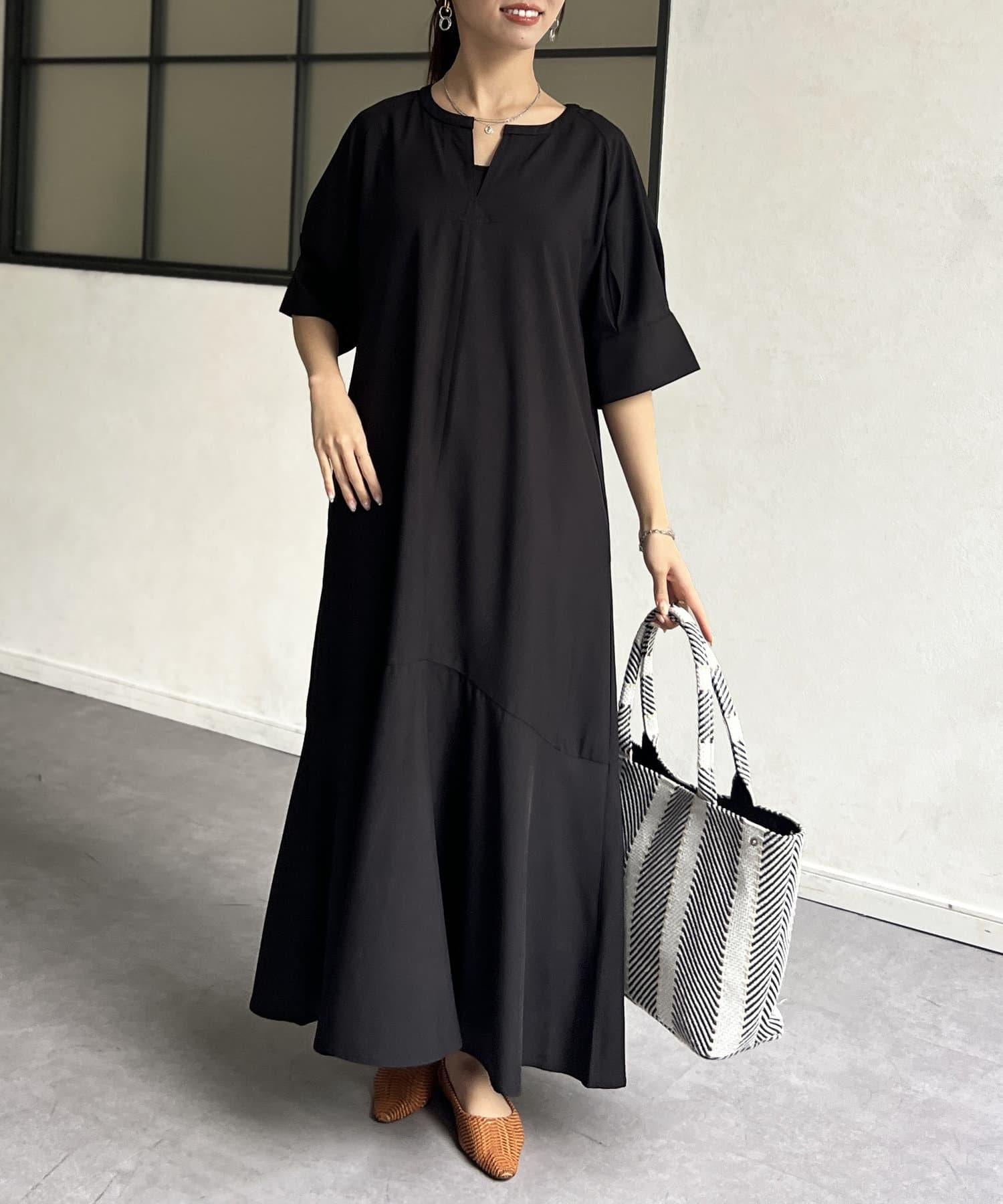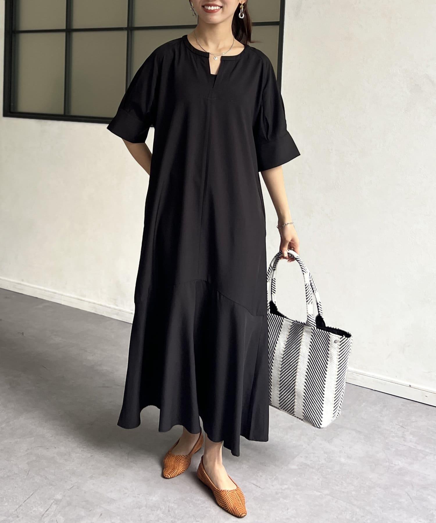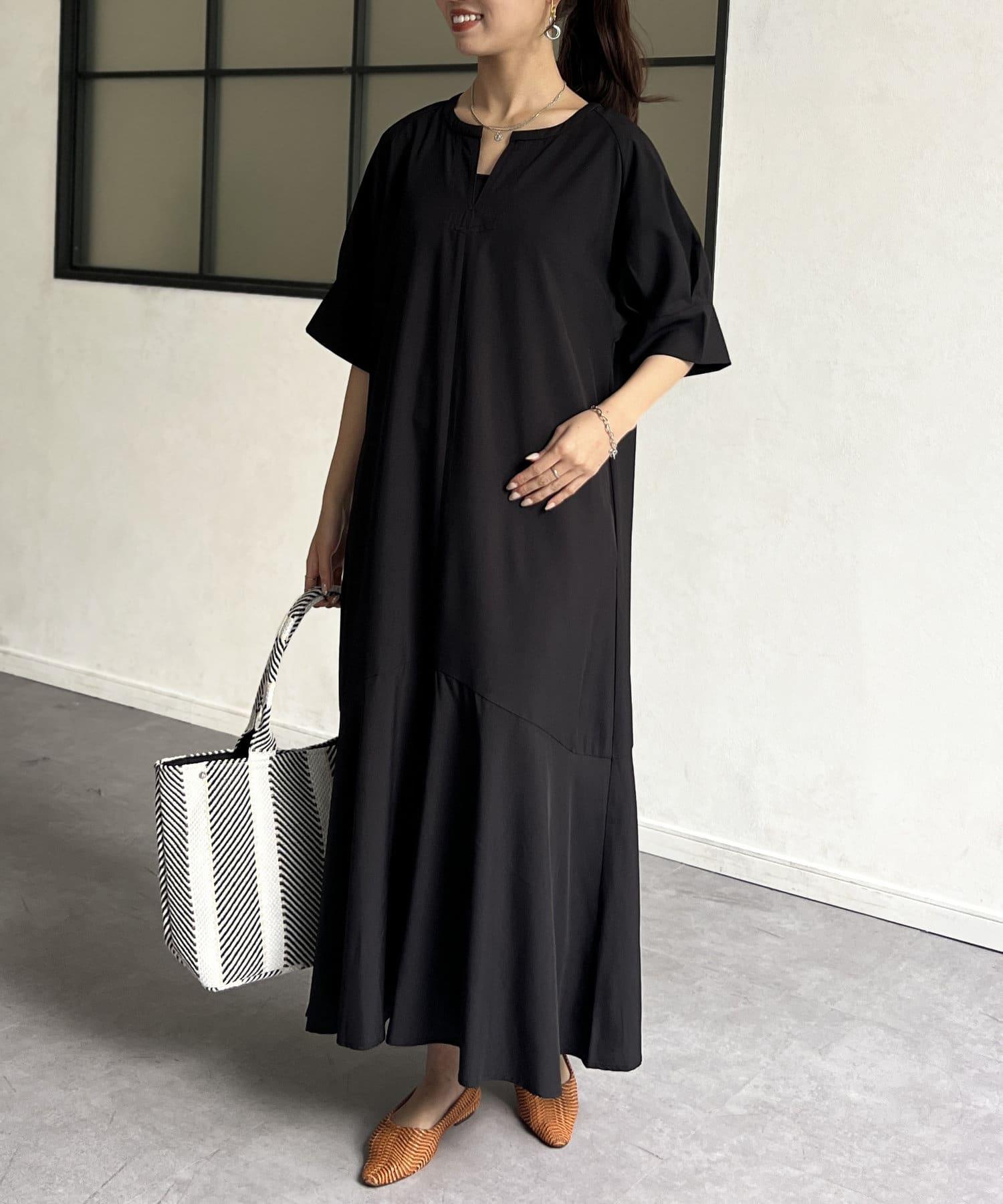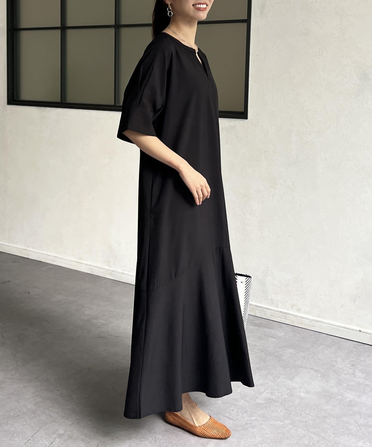 這款連衣裙的輪廓蓬鬆,向下擺延伸,並採用了大方的聚攏設計。