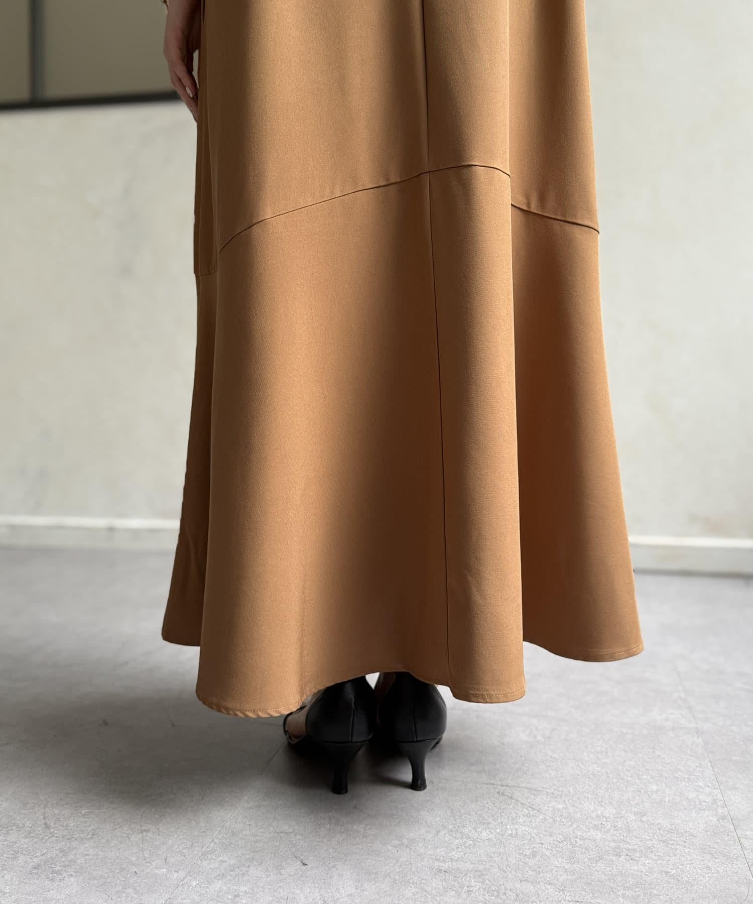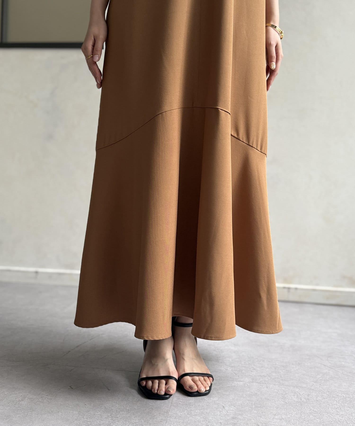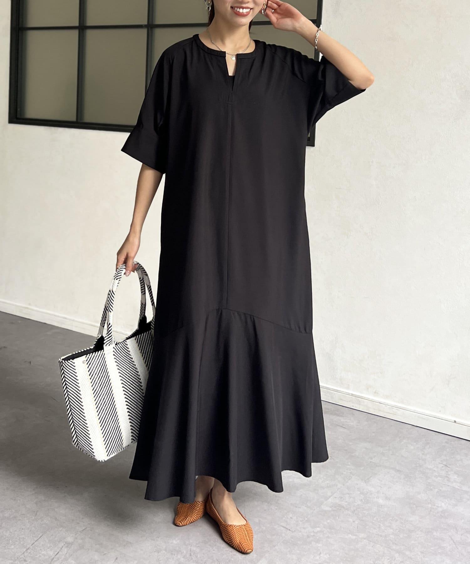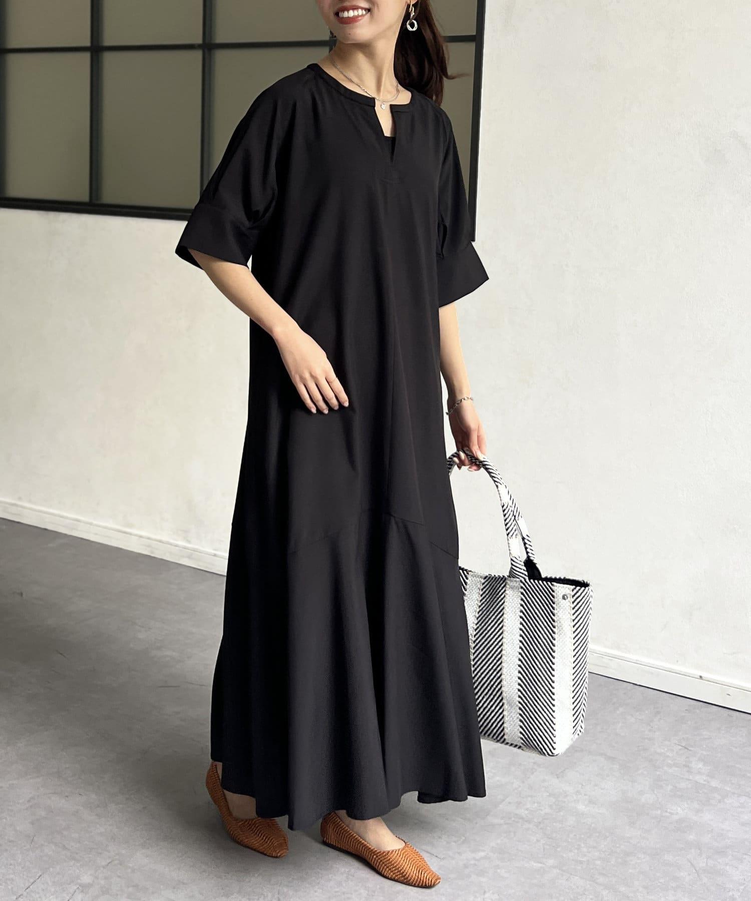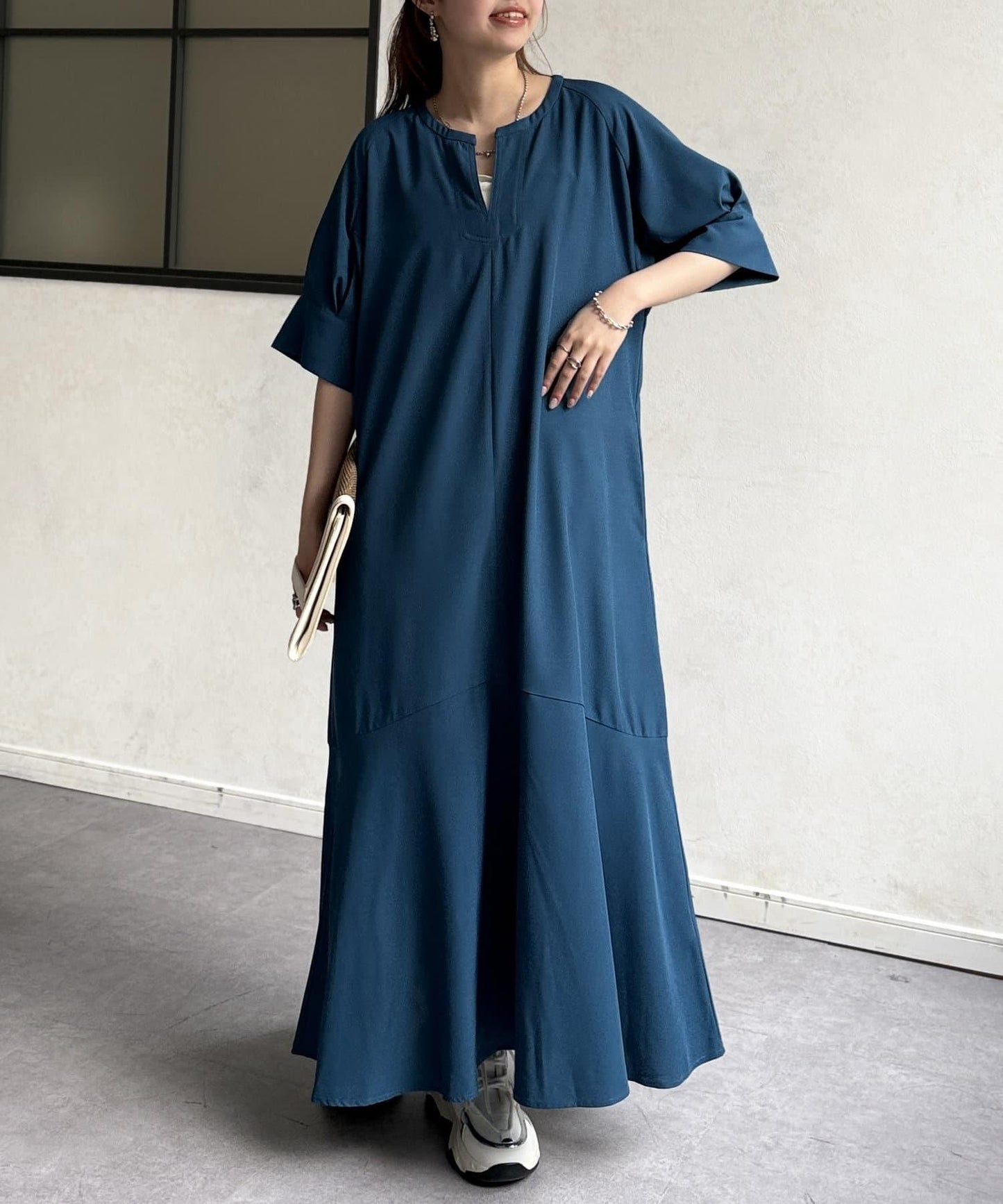 這款連衣裙的輪廓蓬鬆,向下擺延伸,並採用了大方的聚攏設計。