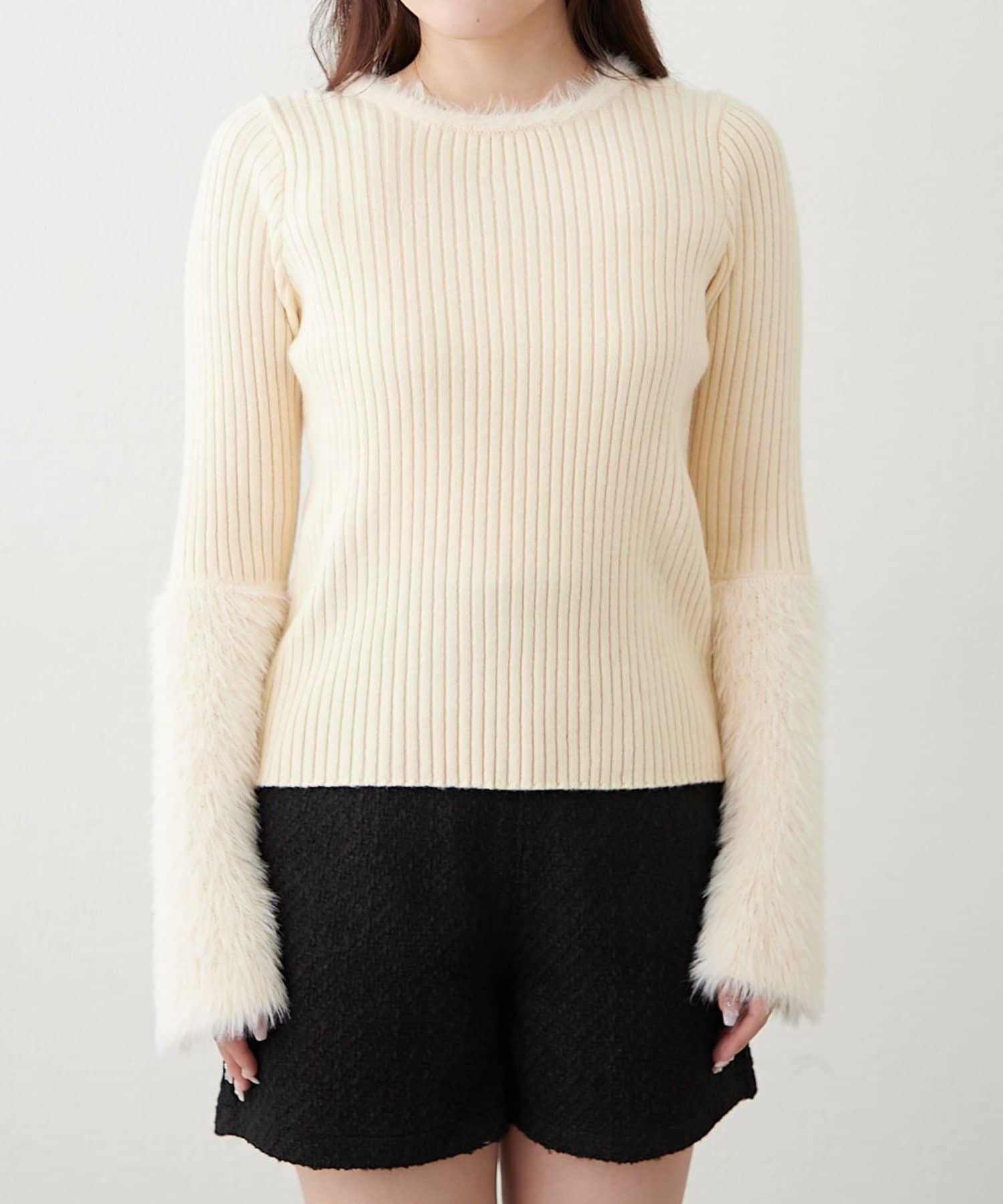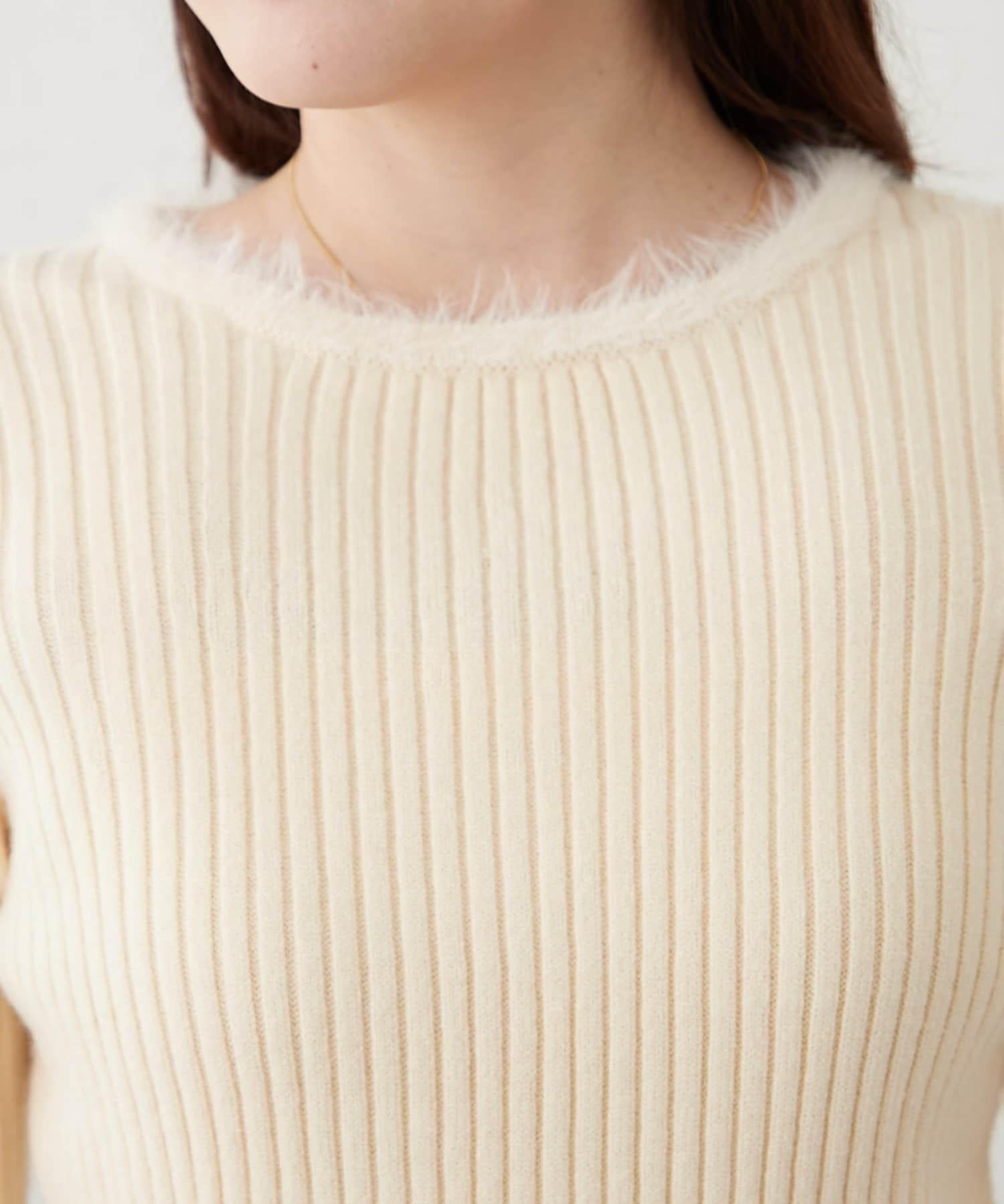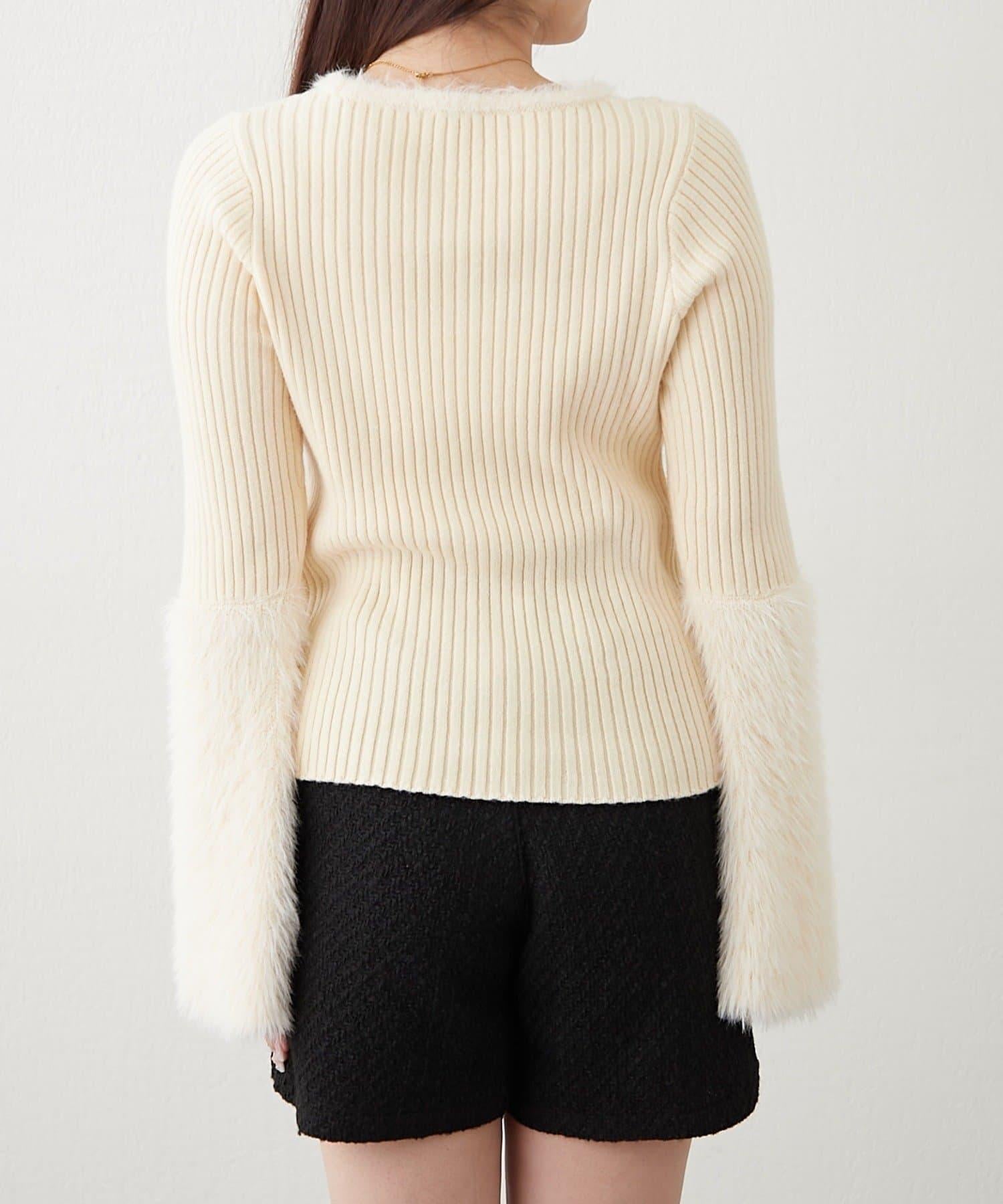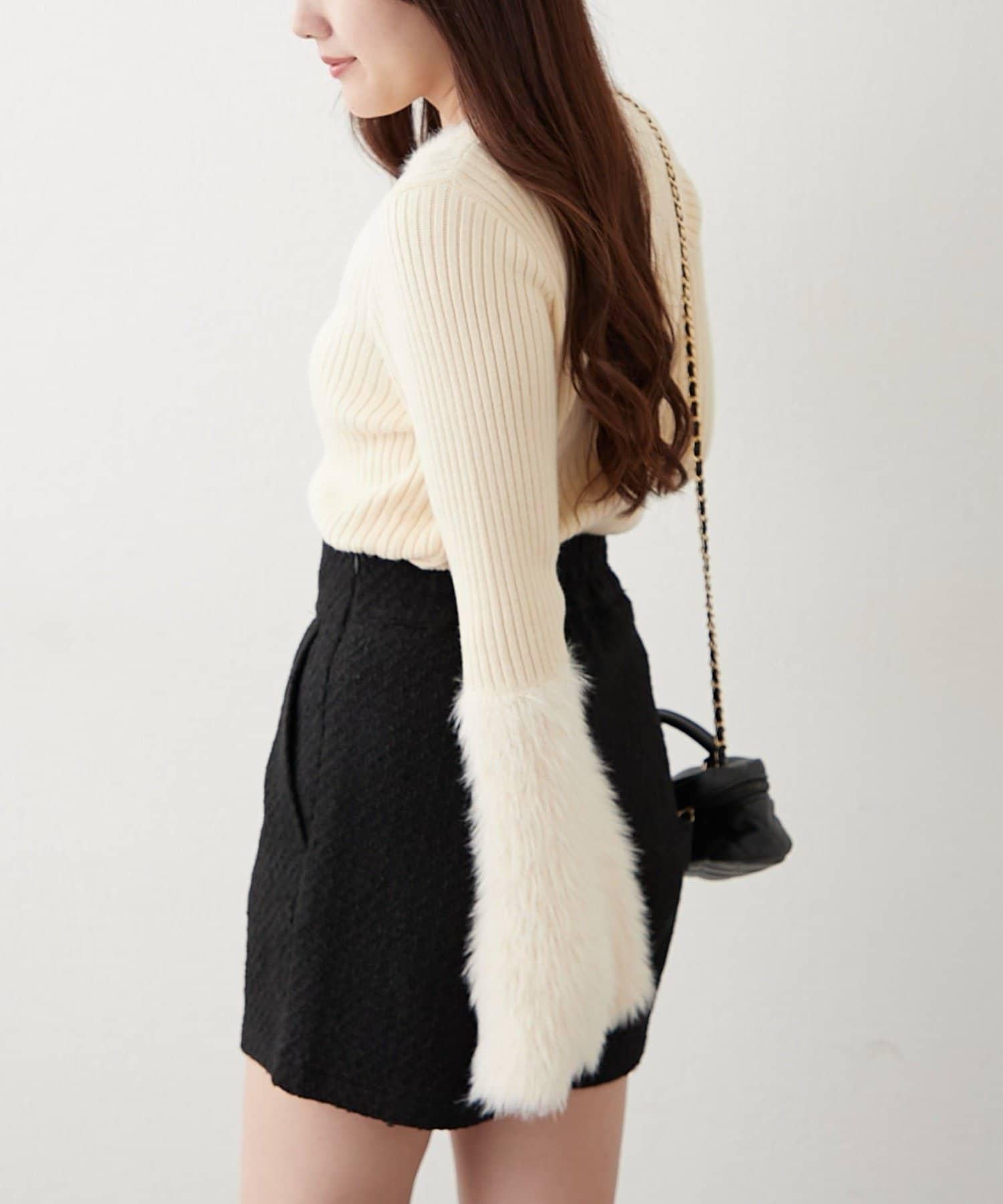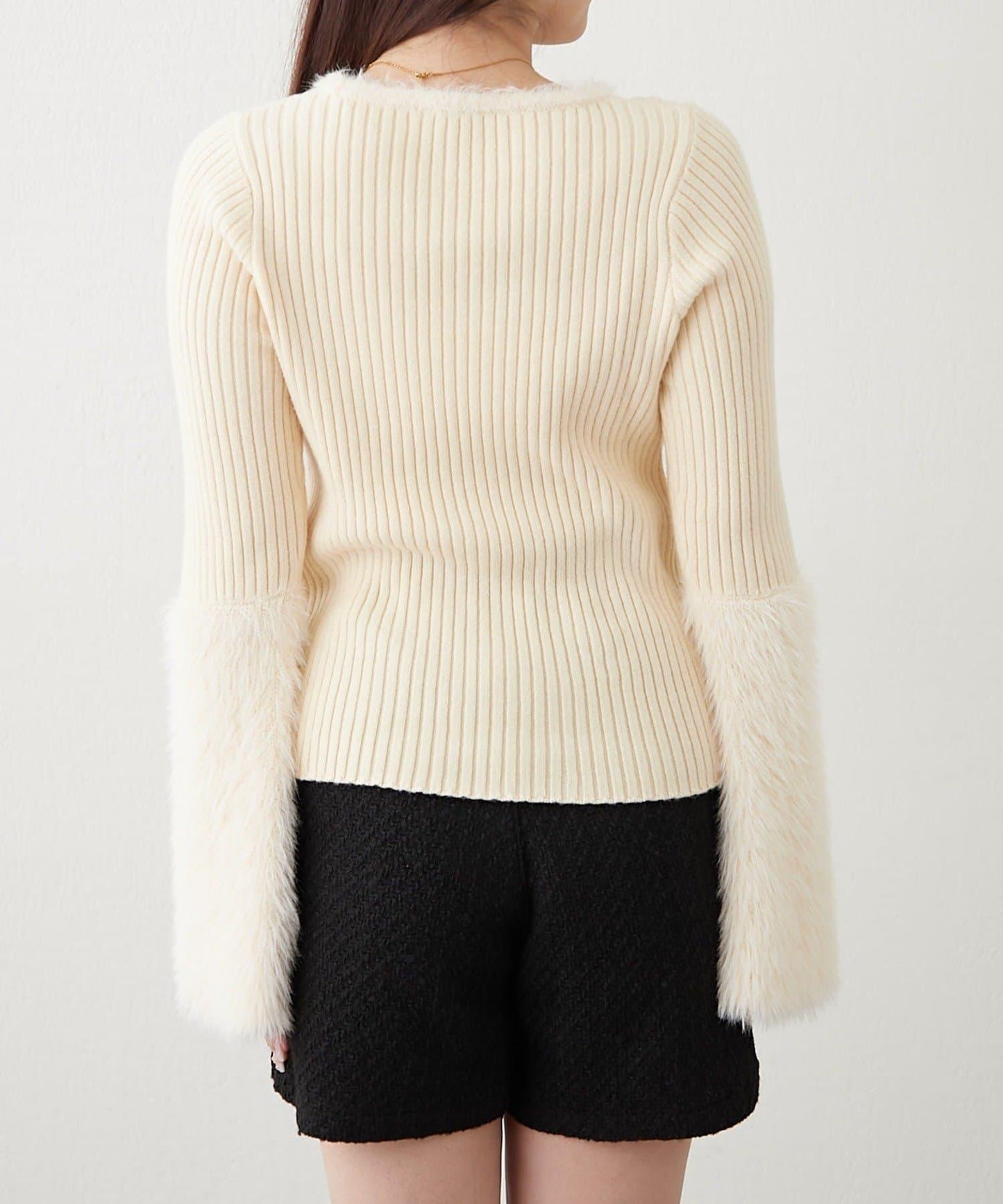 這款針織套衫的衣領和衣袖均採用羽毛紗設計。