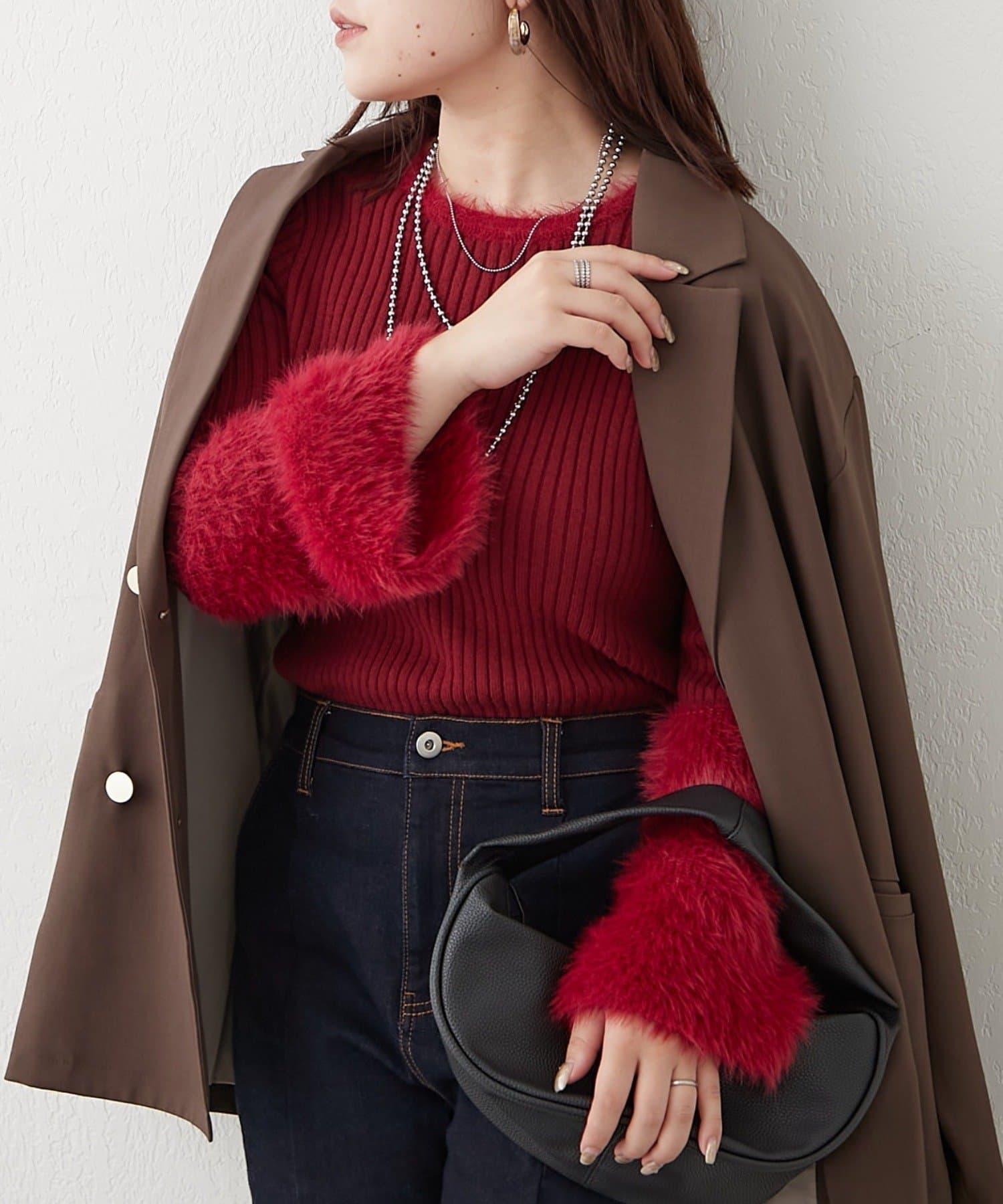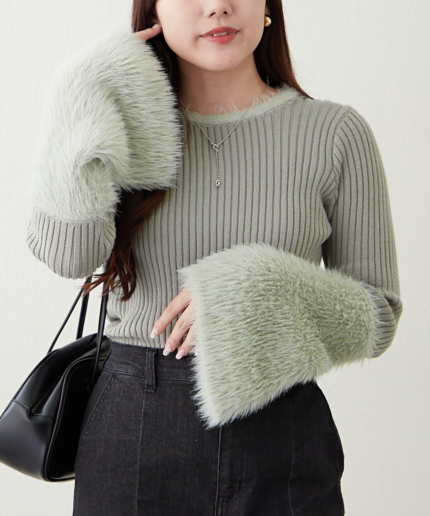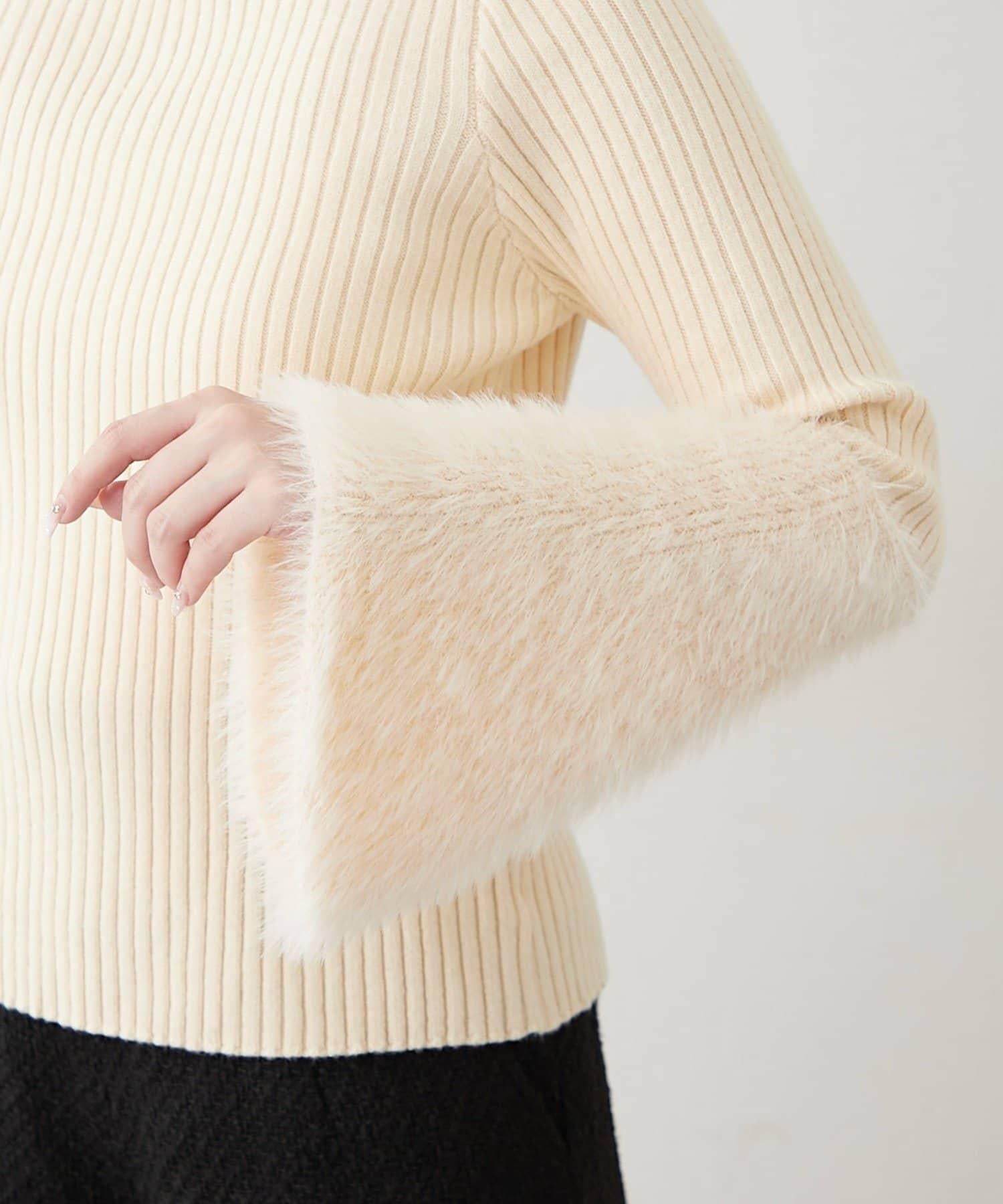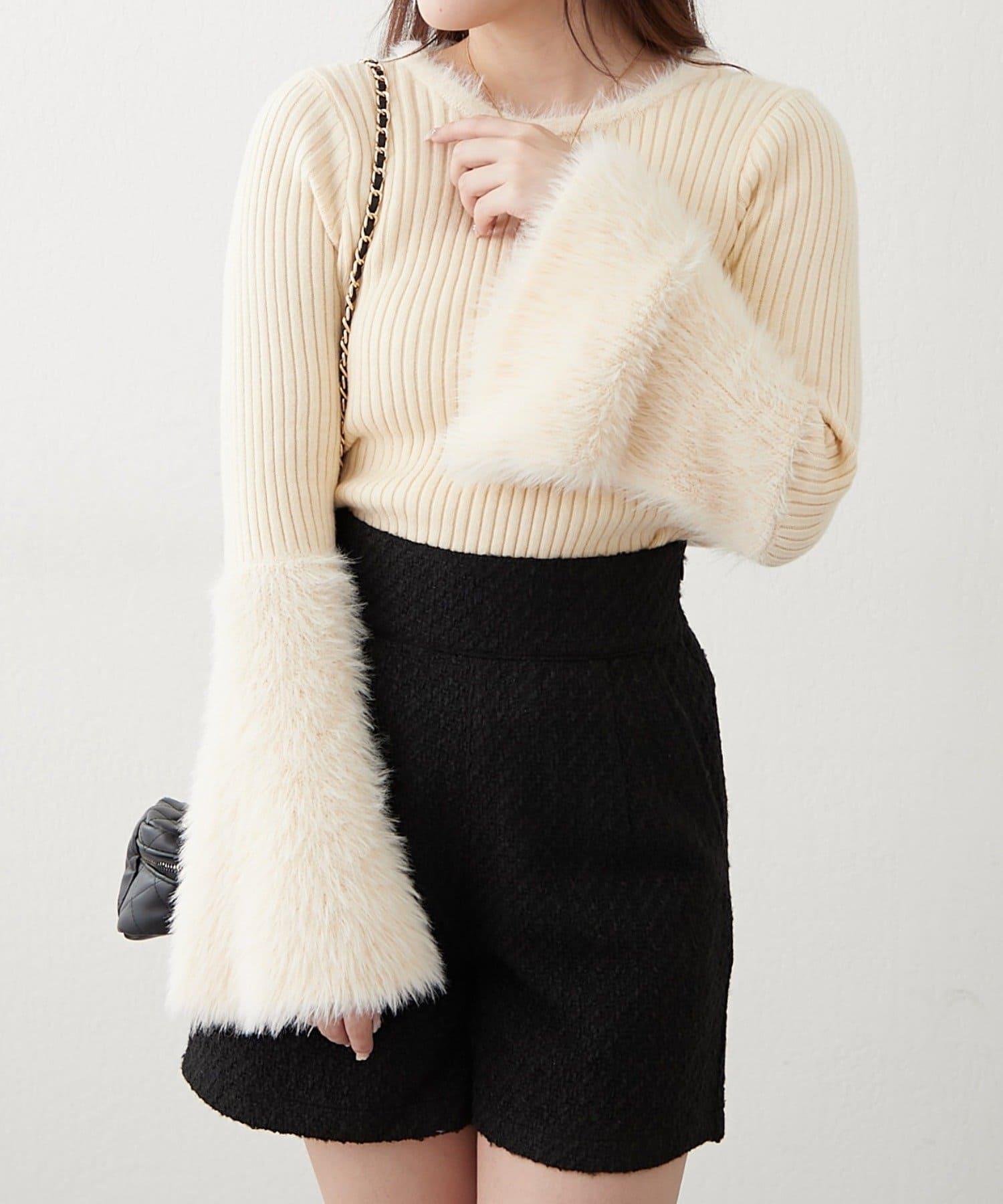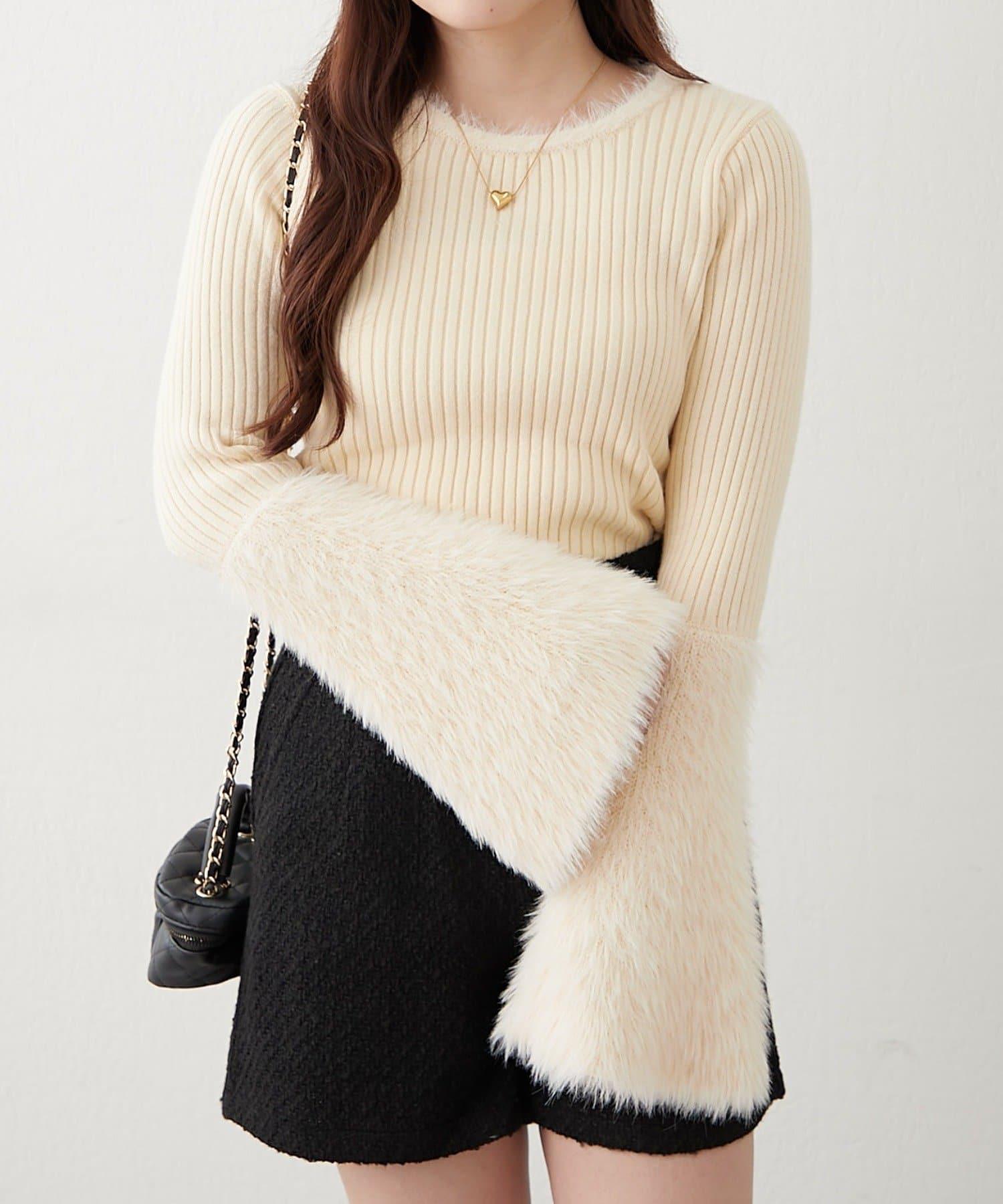 這款針織套衫的衣領和衣袖均採用羽毛紗設計。