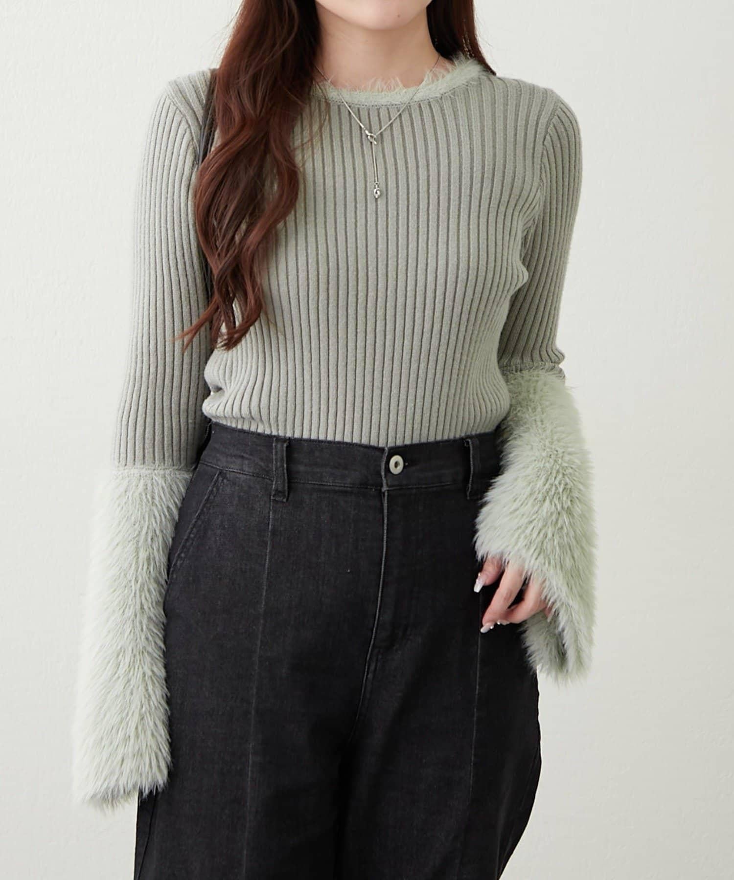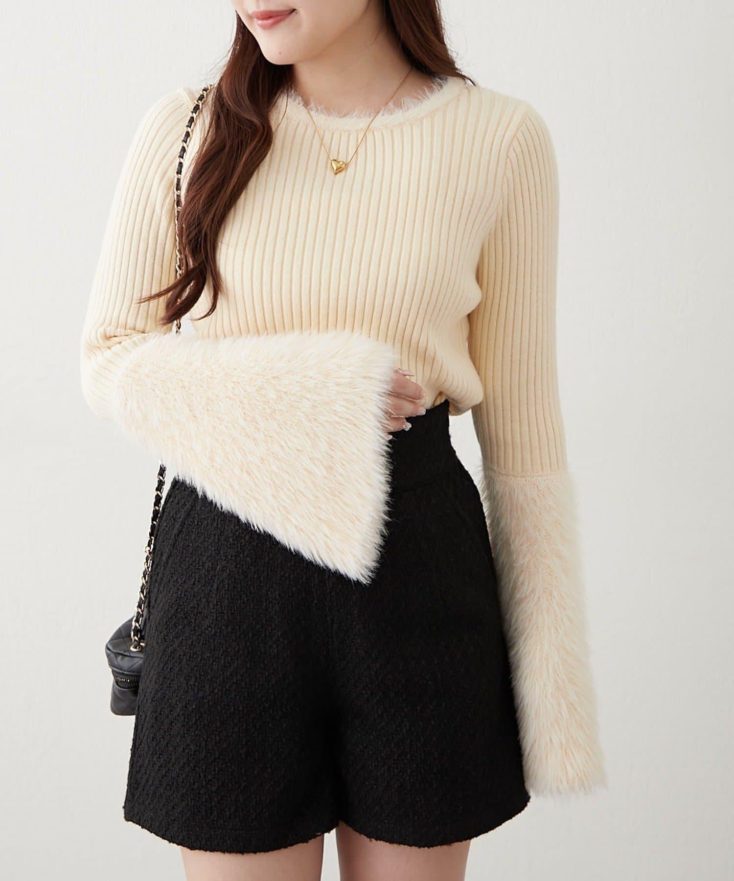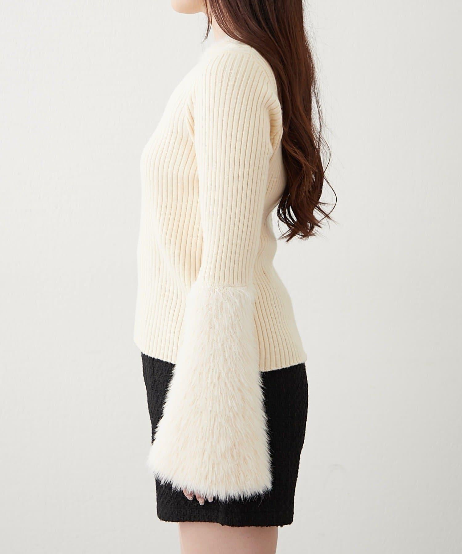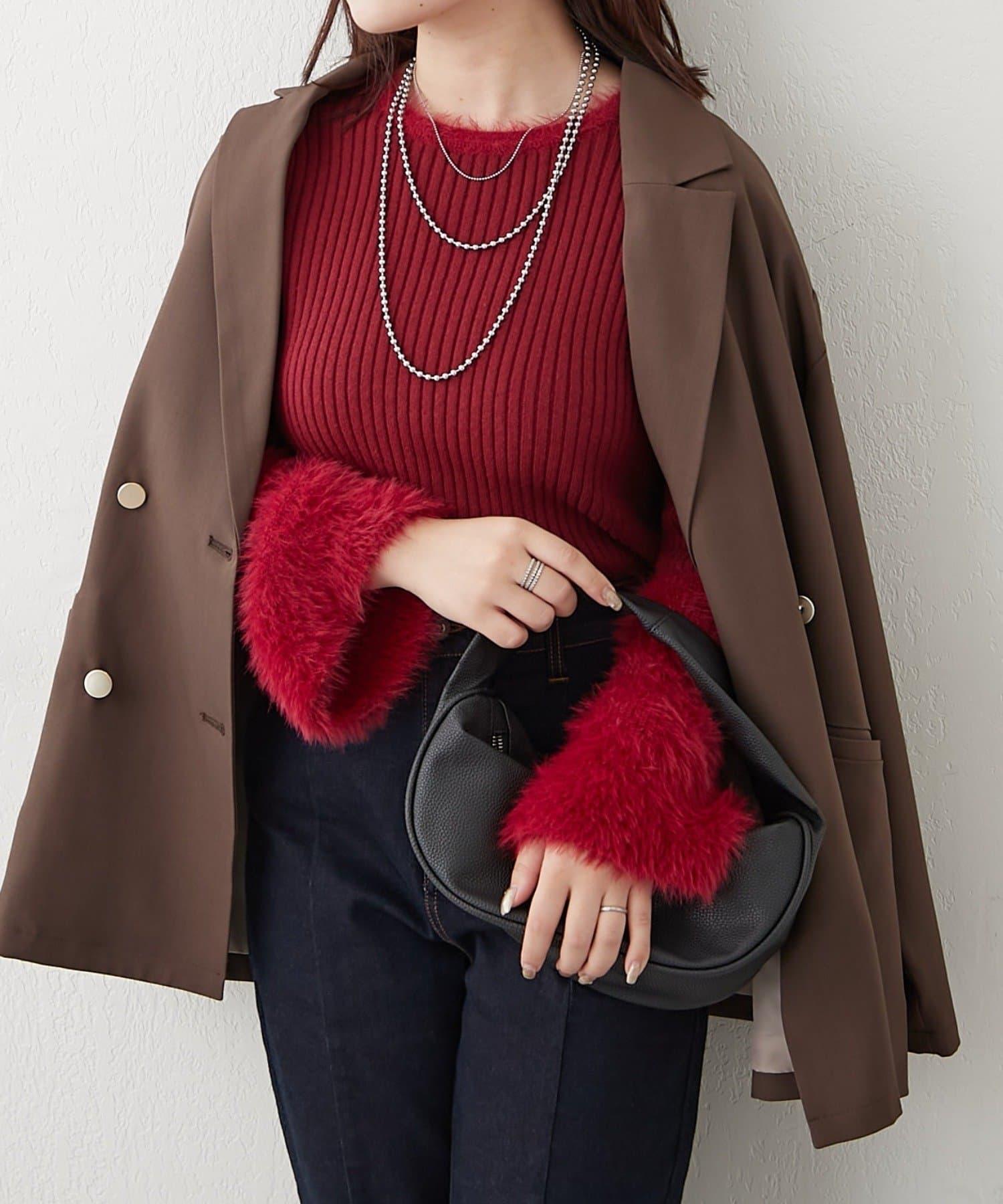 這款針織套衫的衣領和衣袖均採用羽毛紗設計。