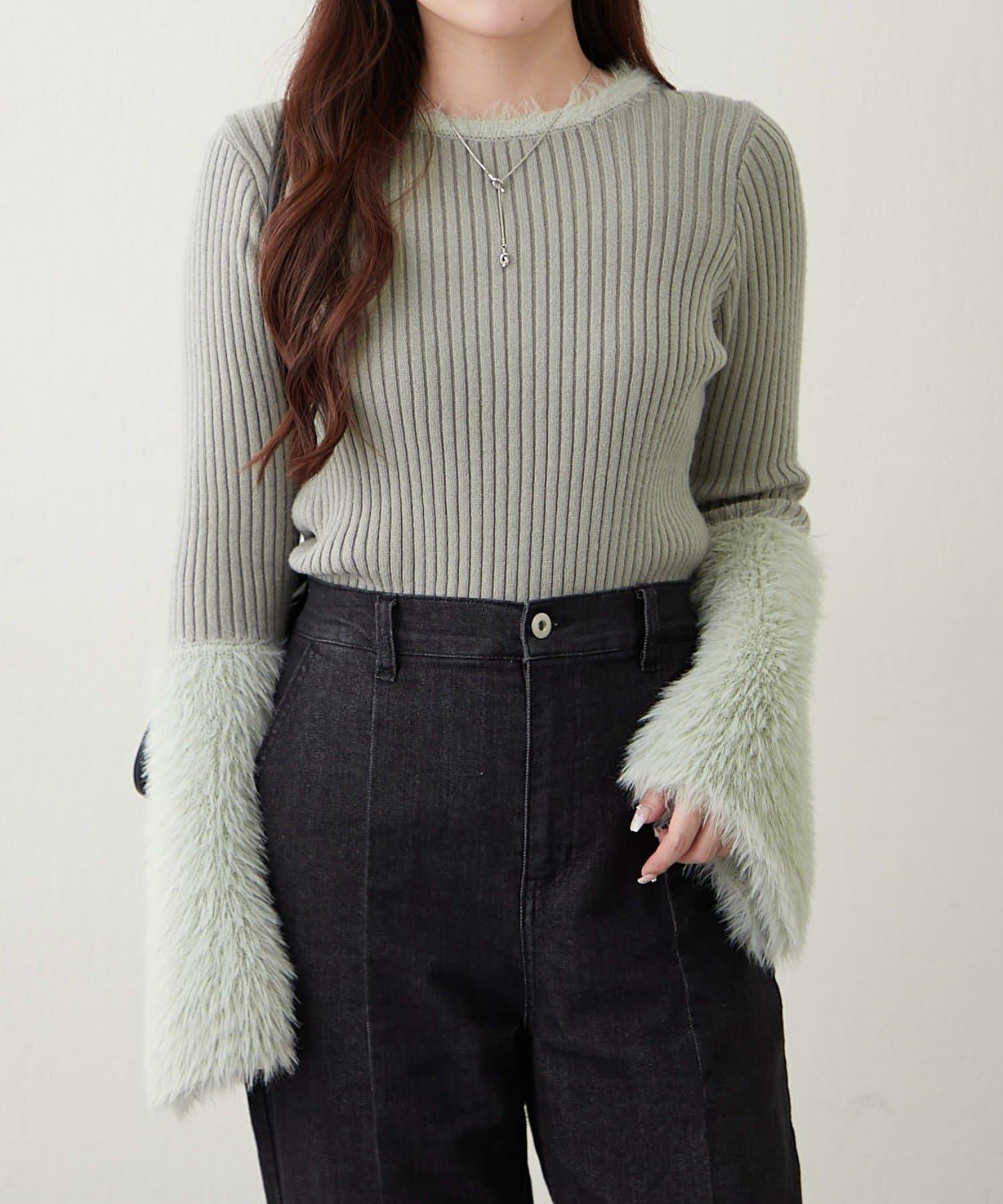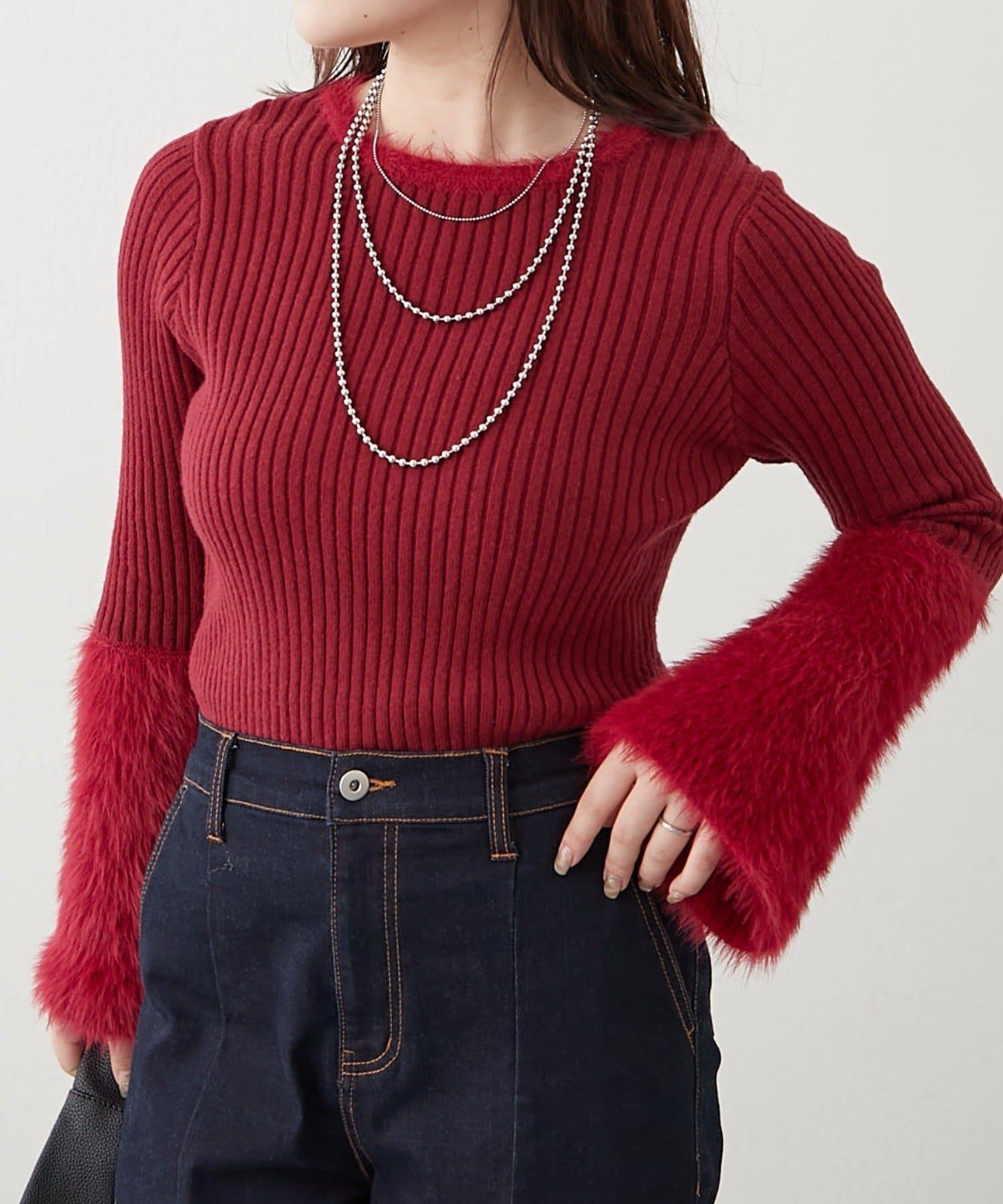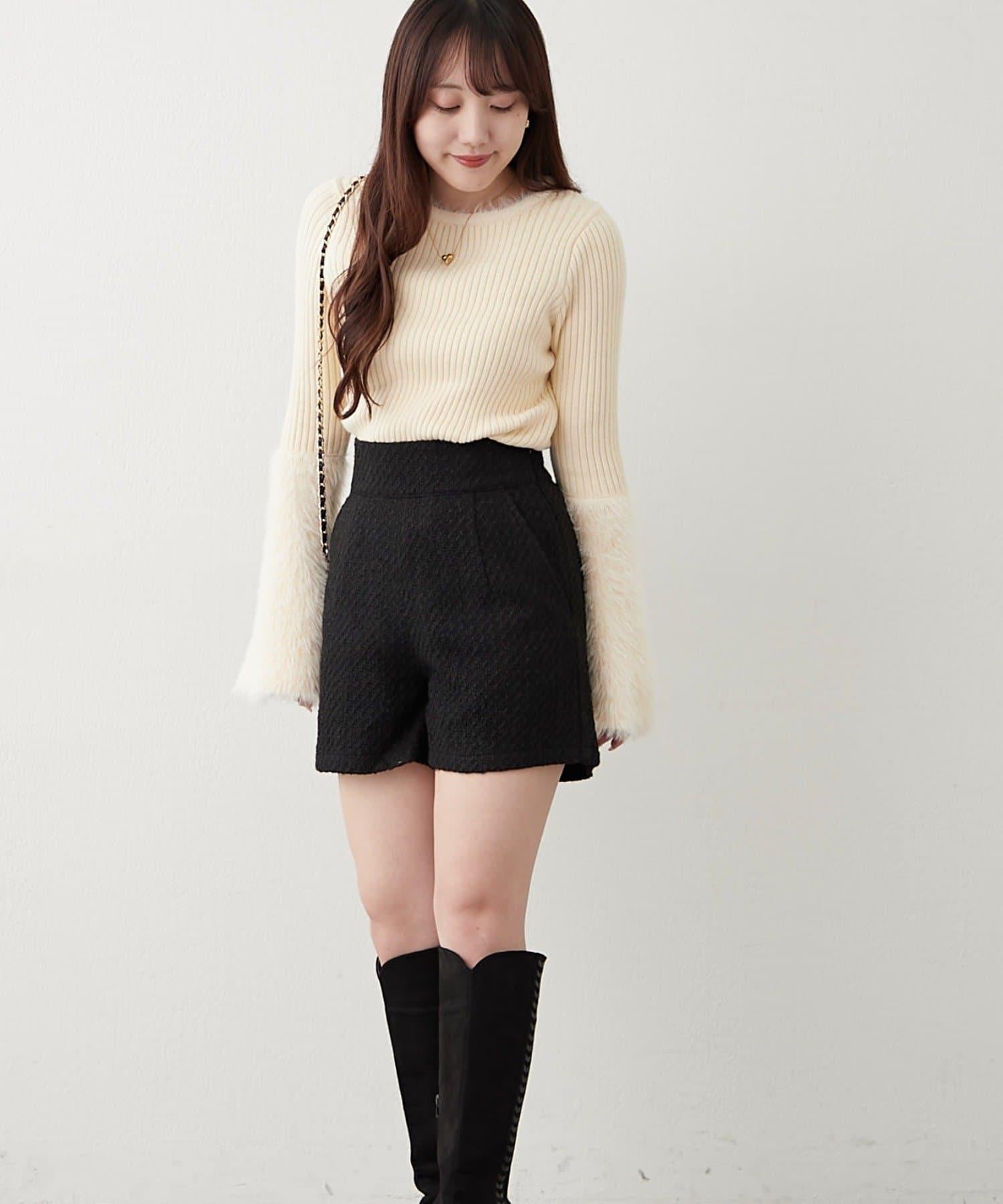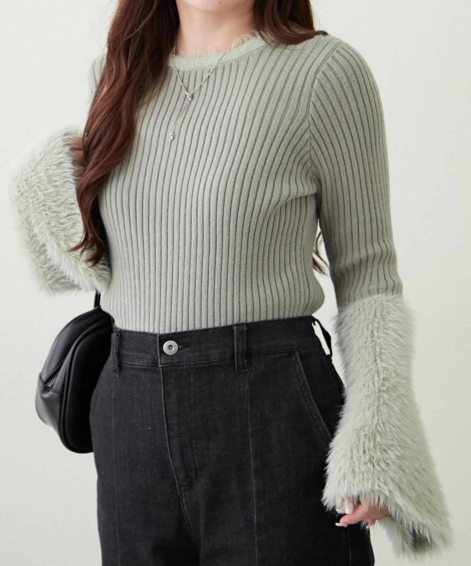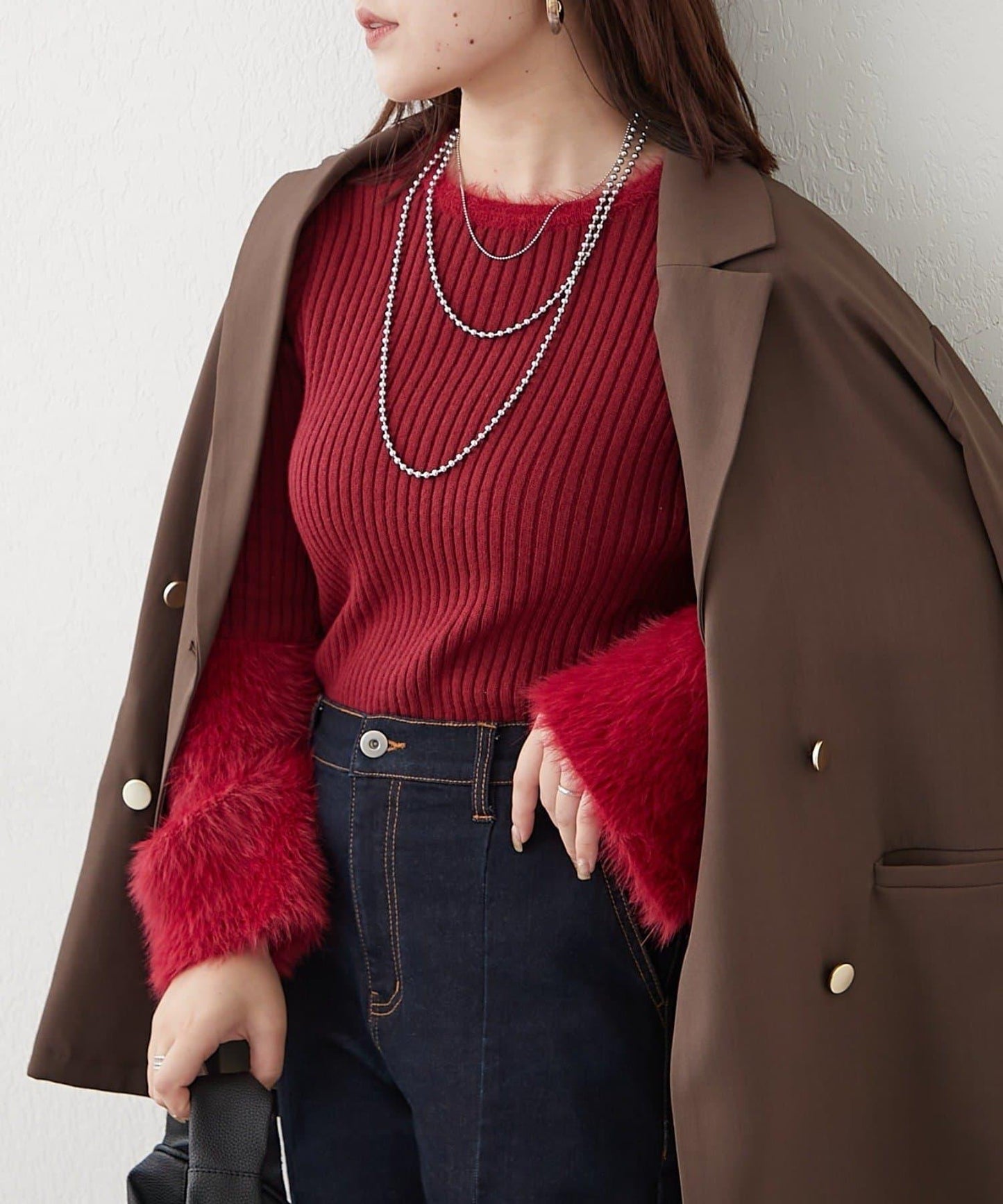 這款針織套衫的衣領和衣袖均採用羽毛紗設計。