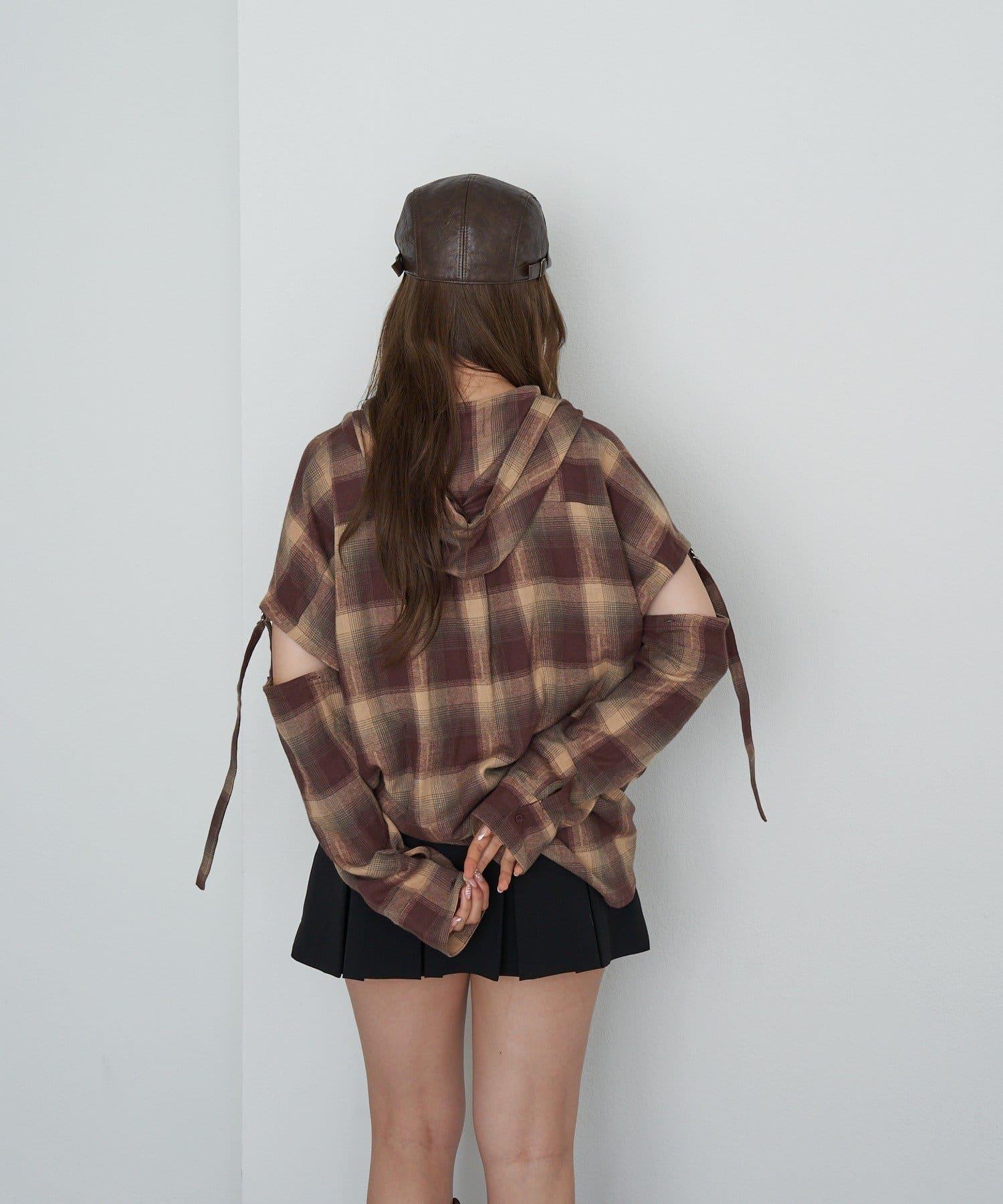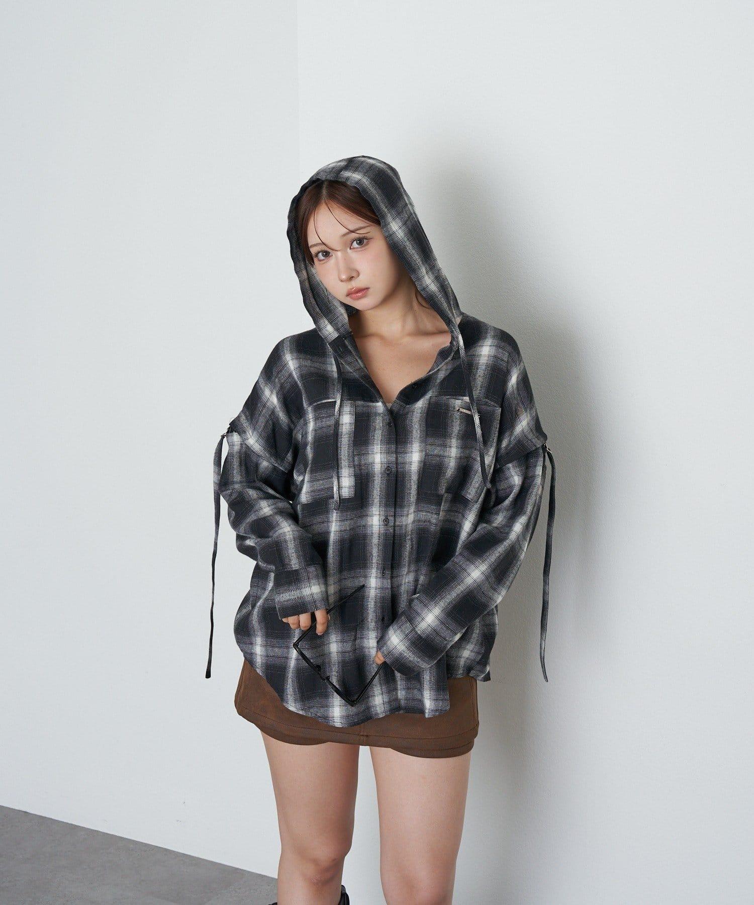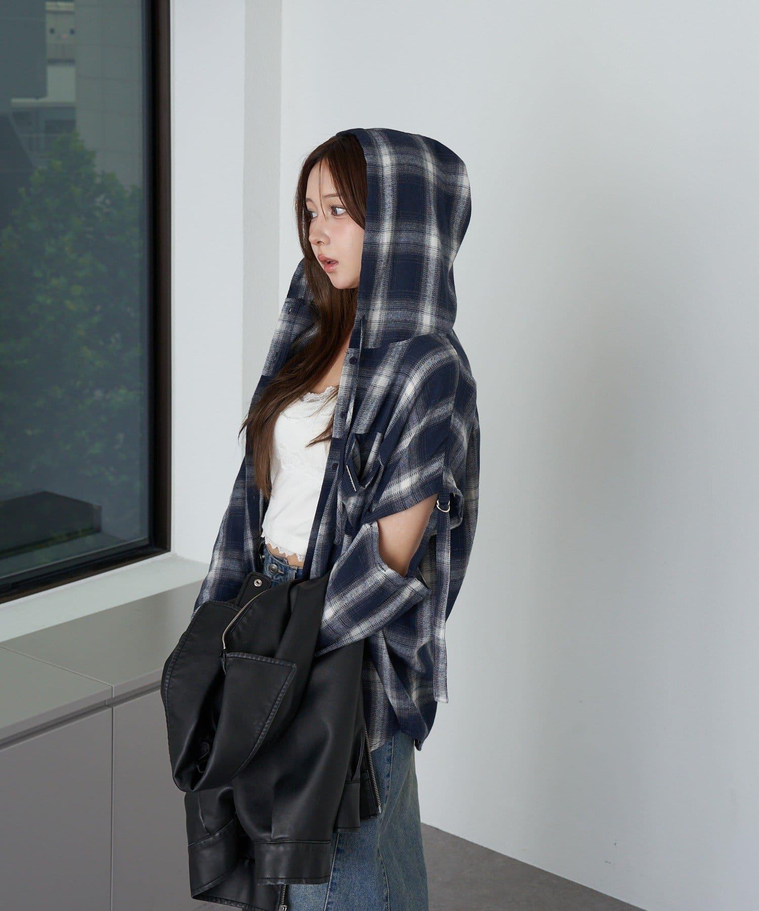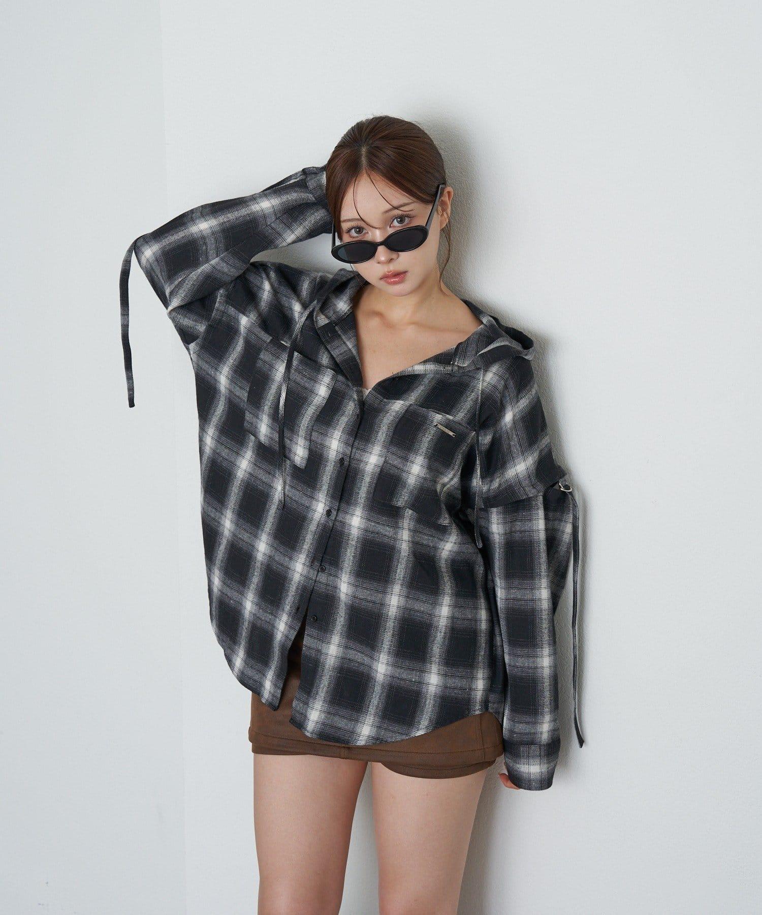 袖開叉連帽格子襯衫