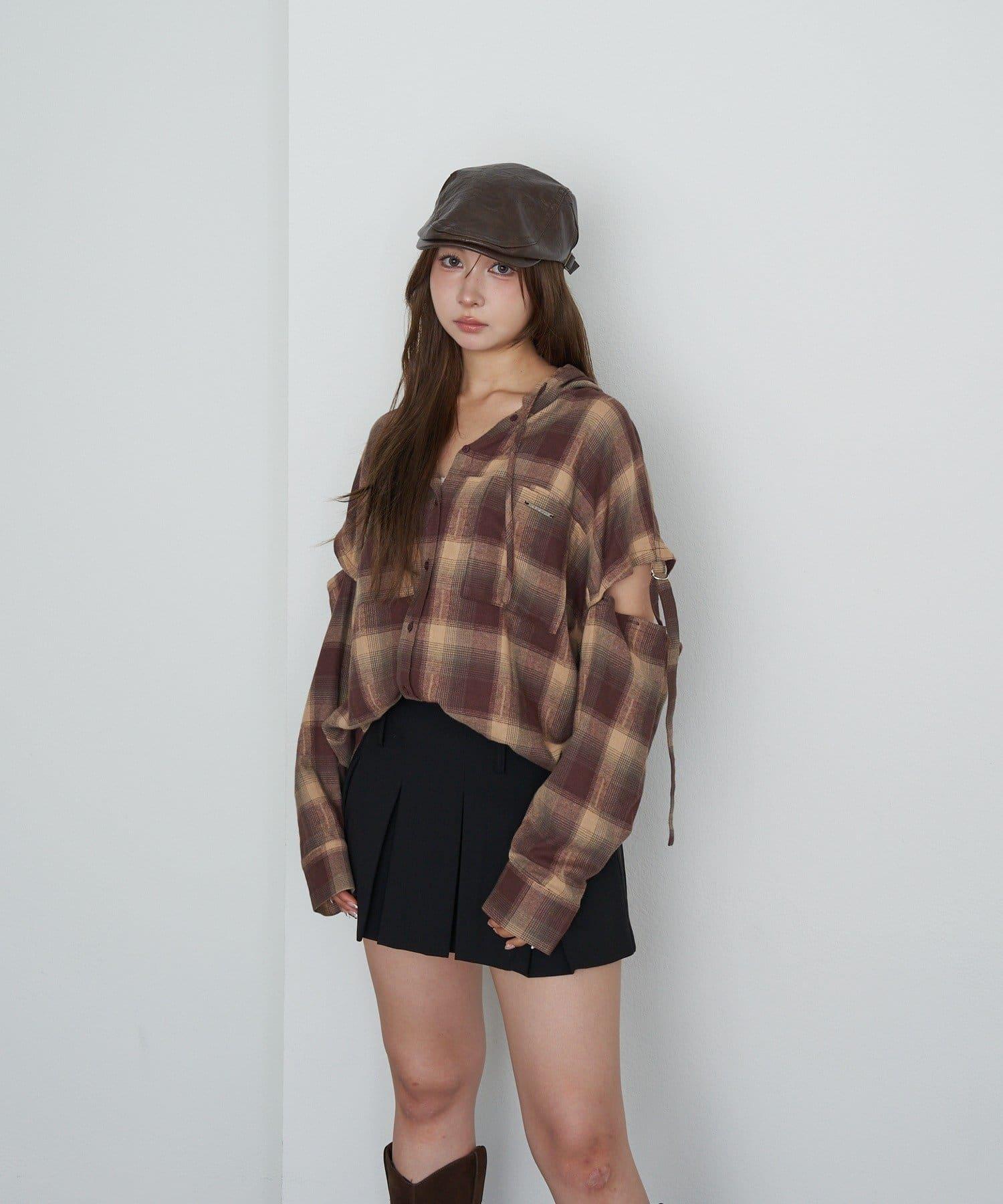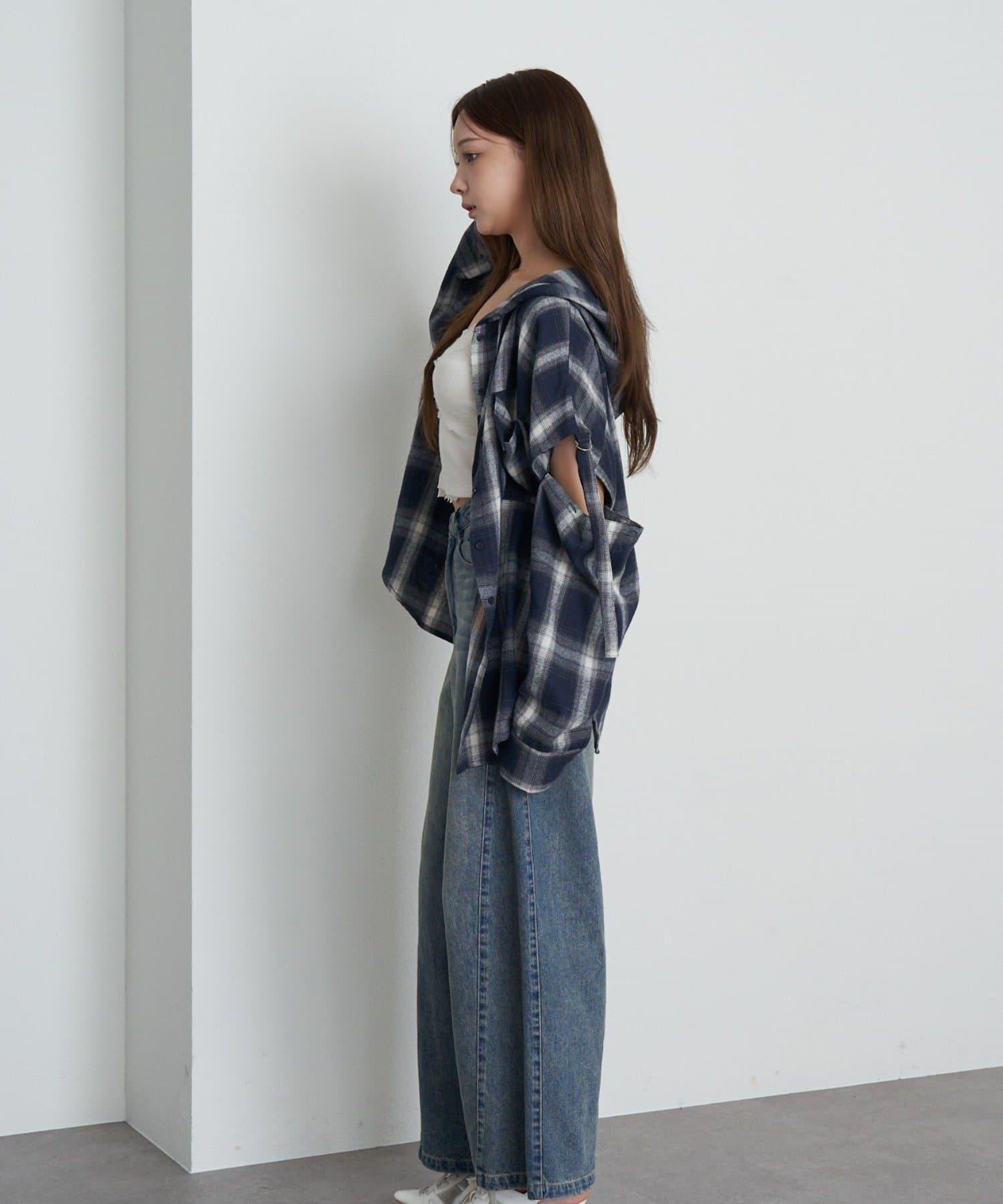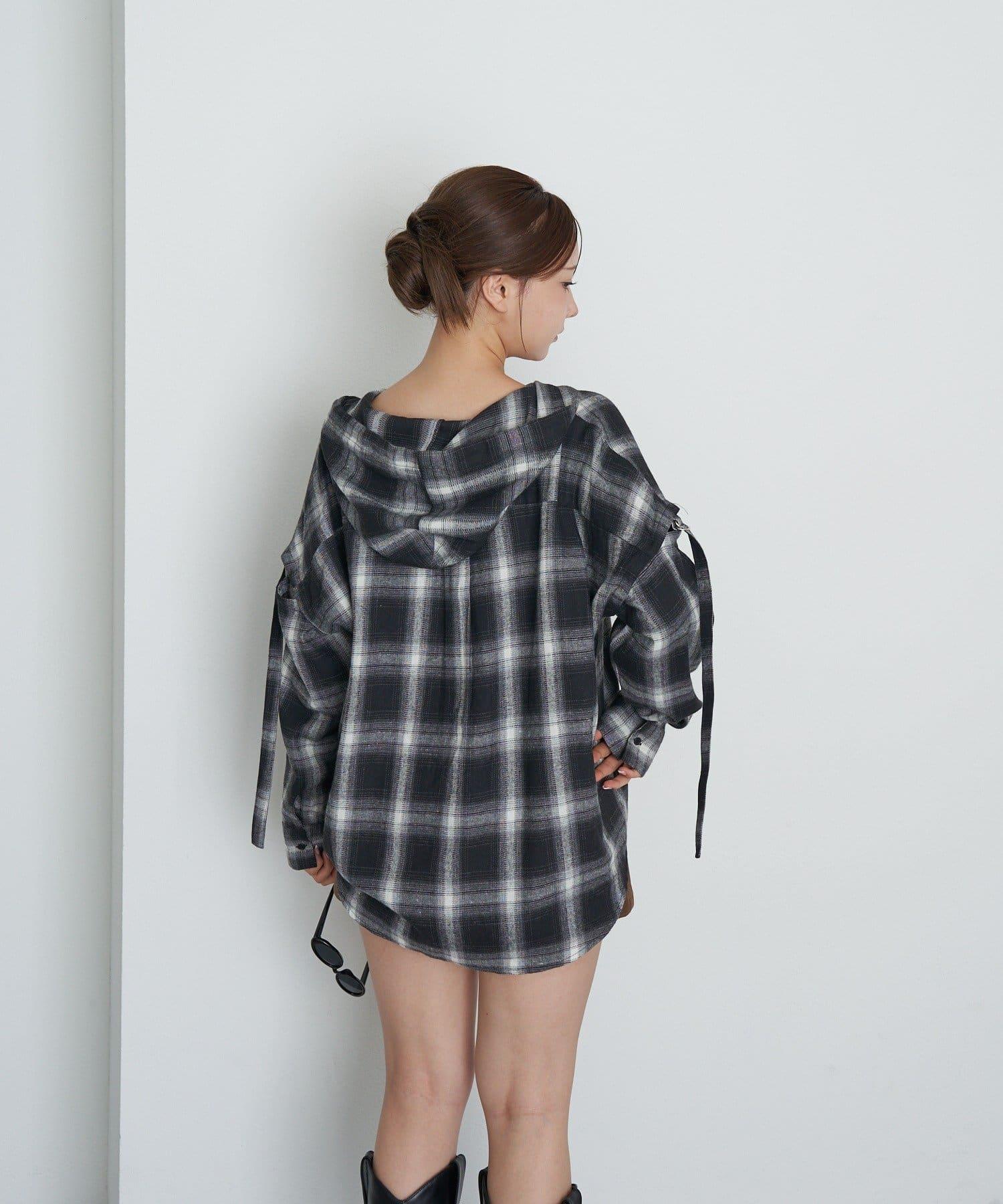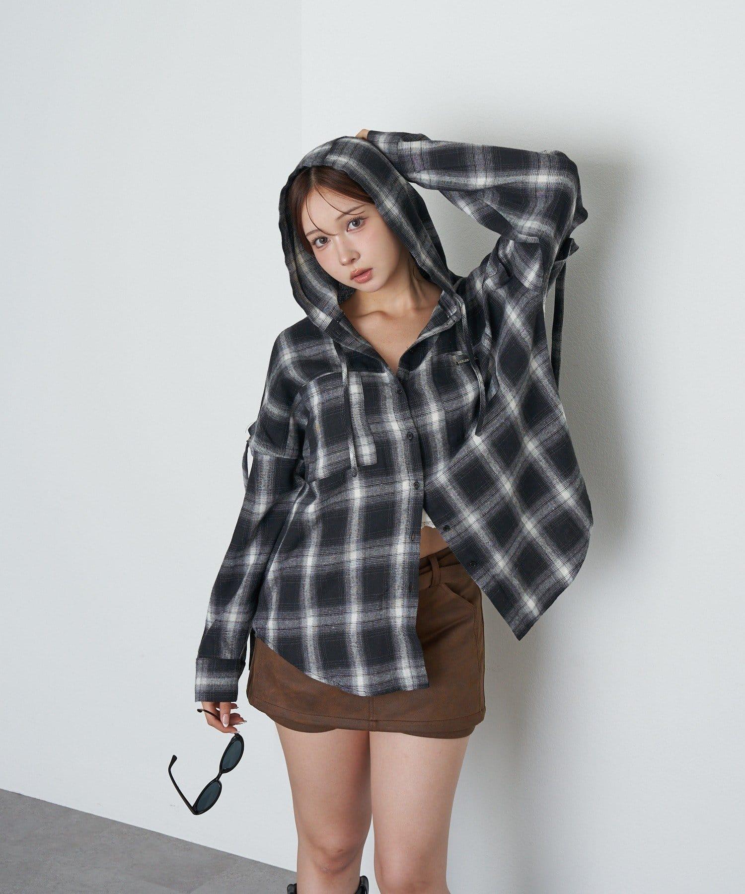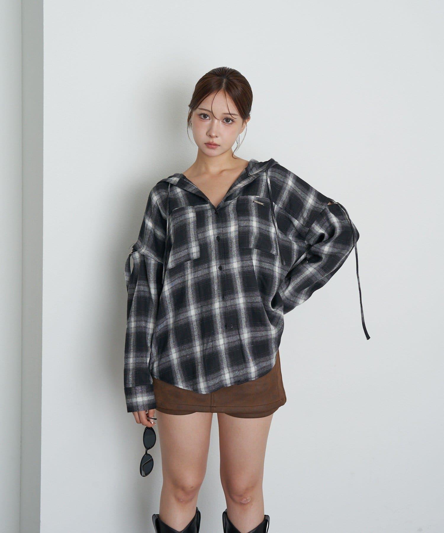 袖開叉連帽格子襯衫