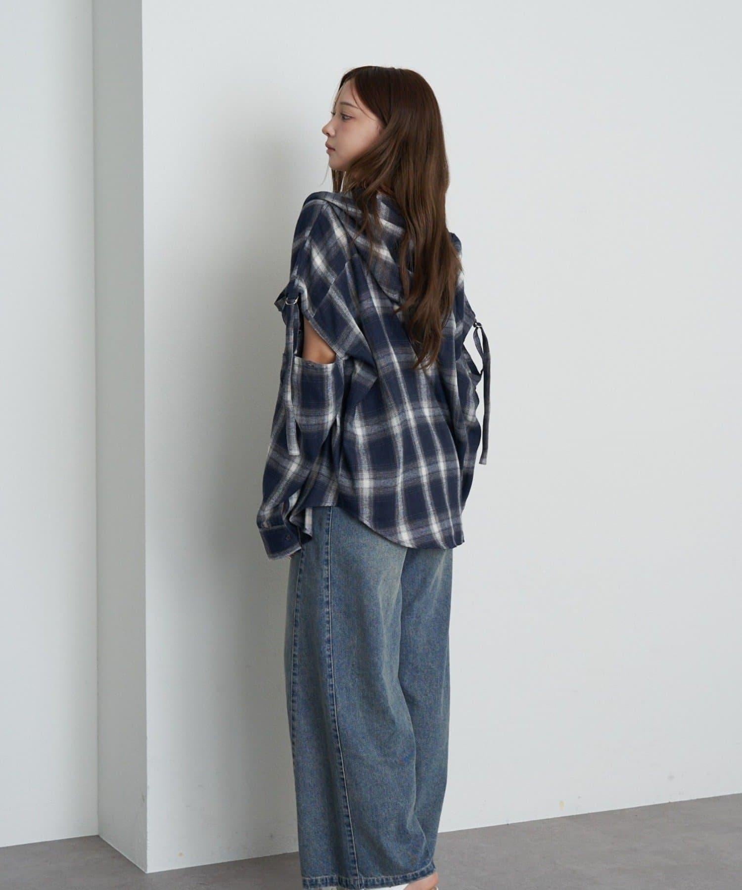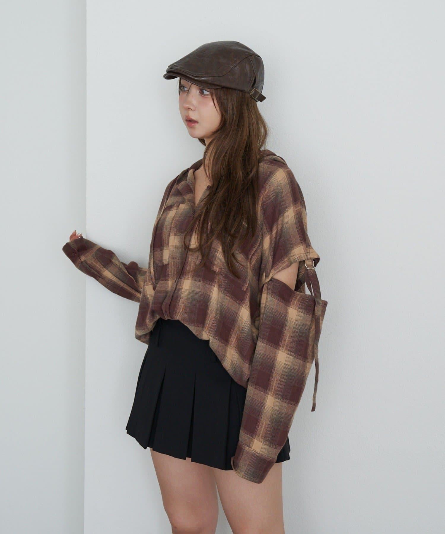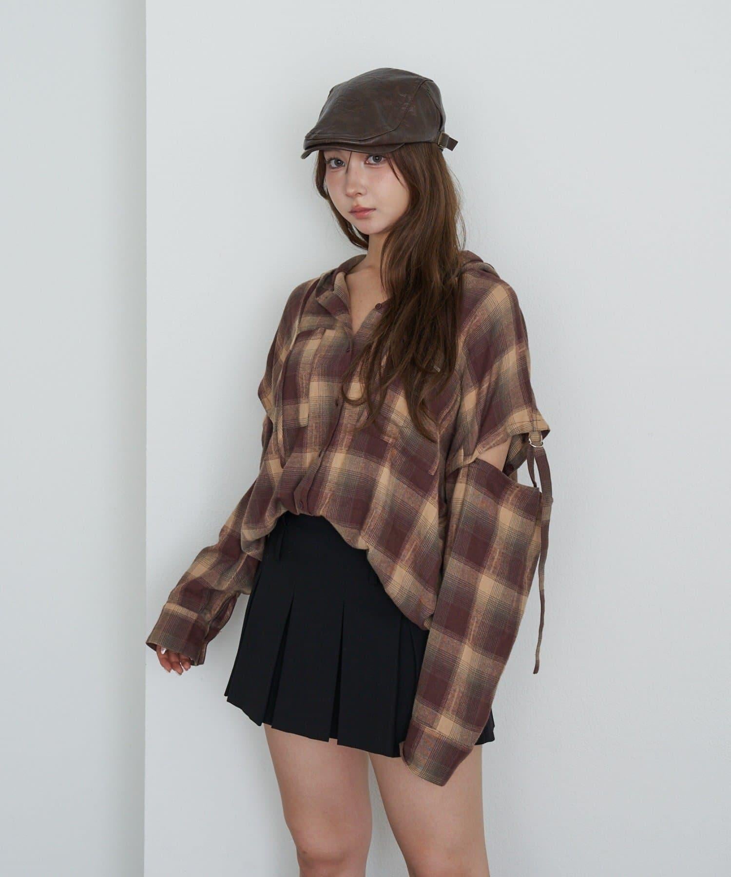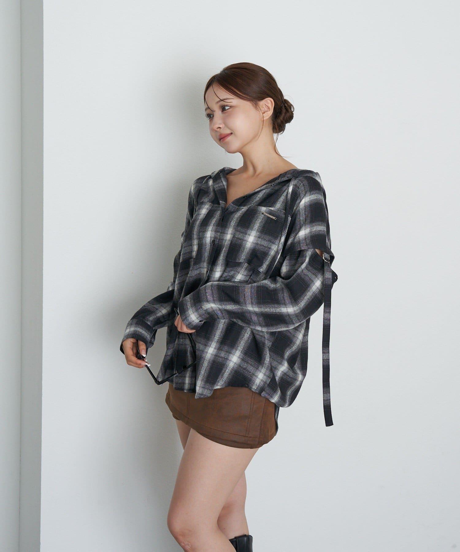 袖開叉連帽格子襯衫