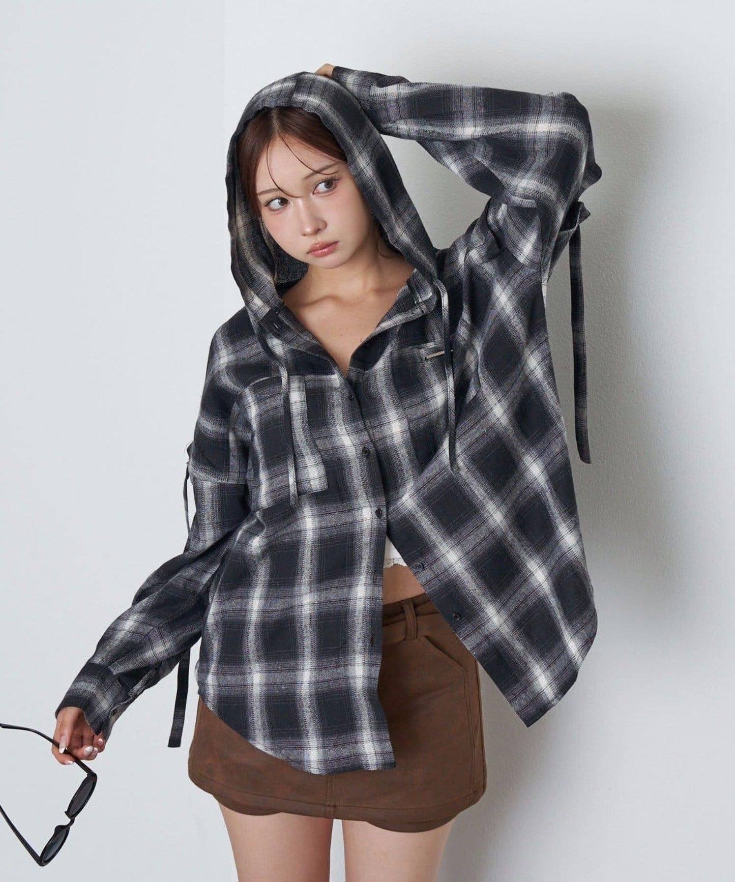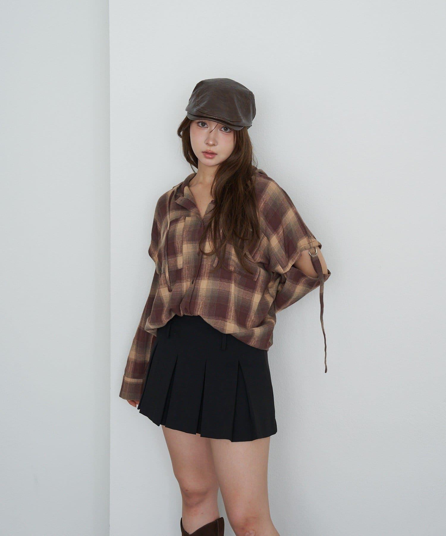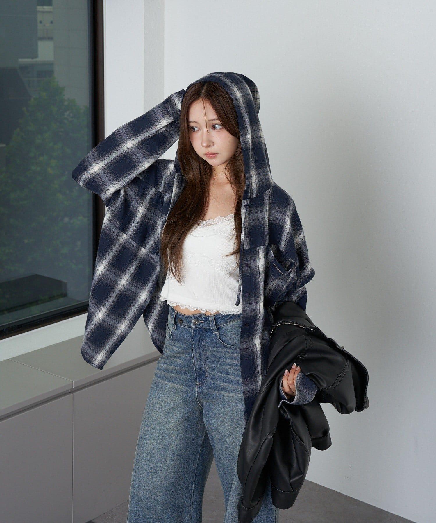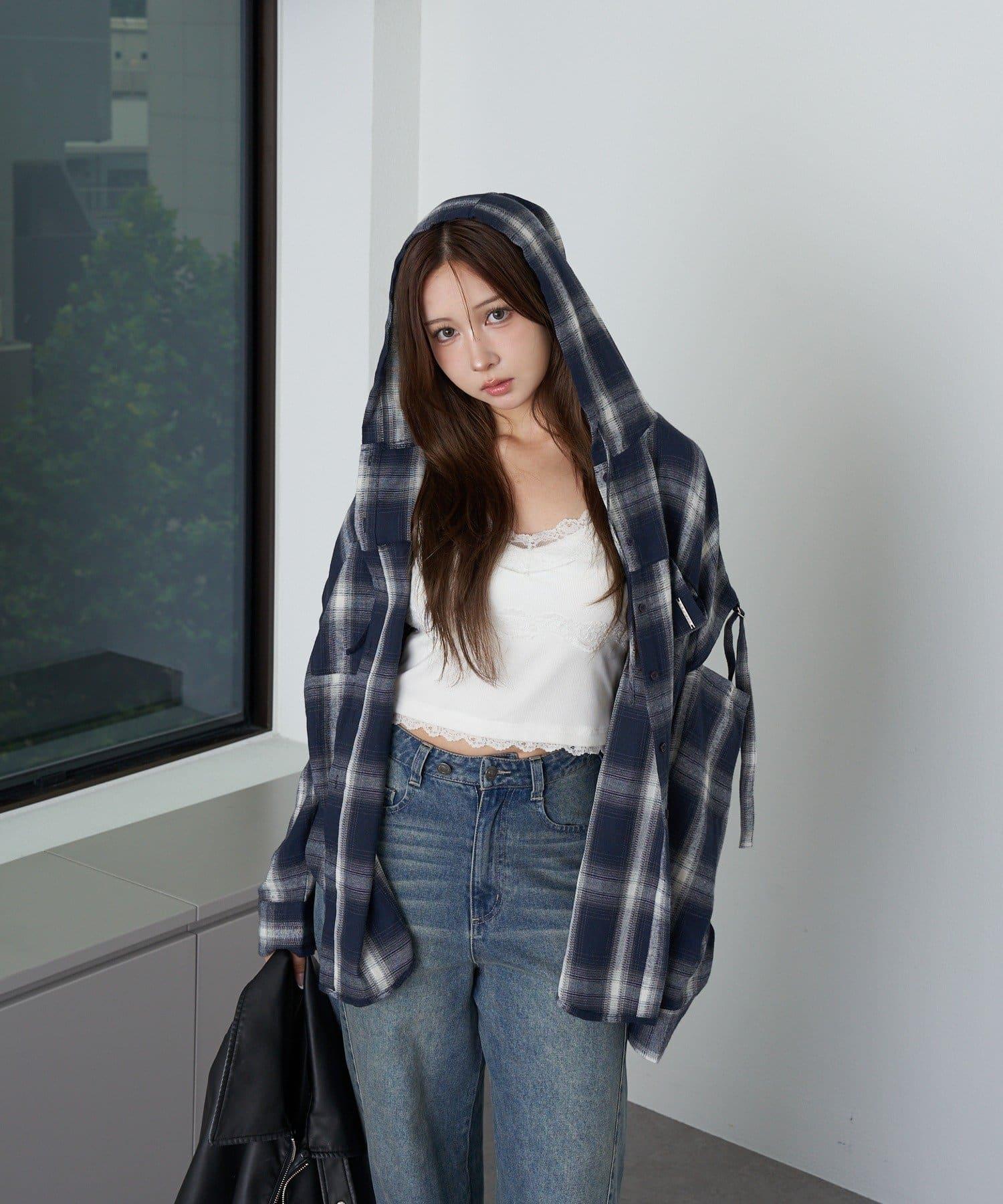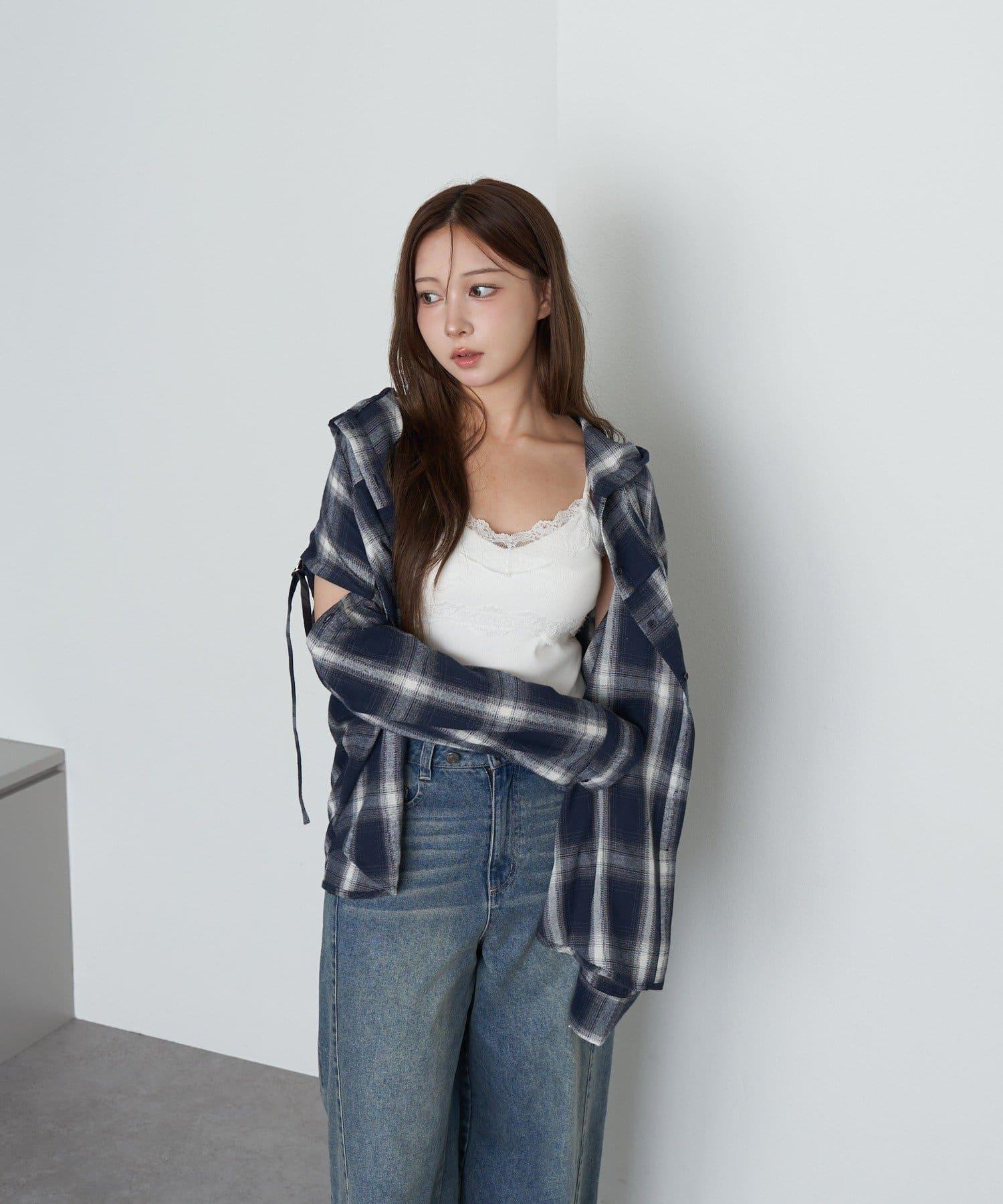 袖開叉連帽格子襯衫