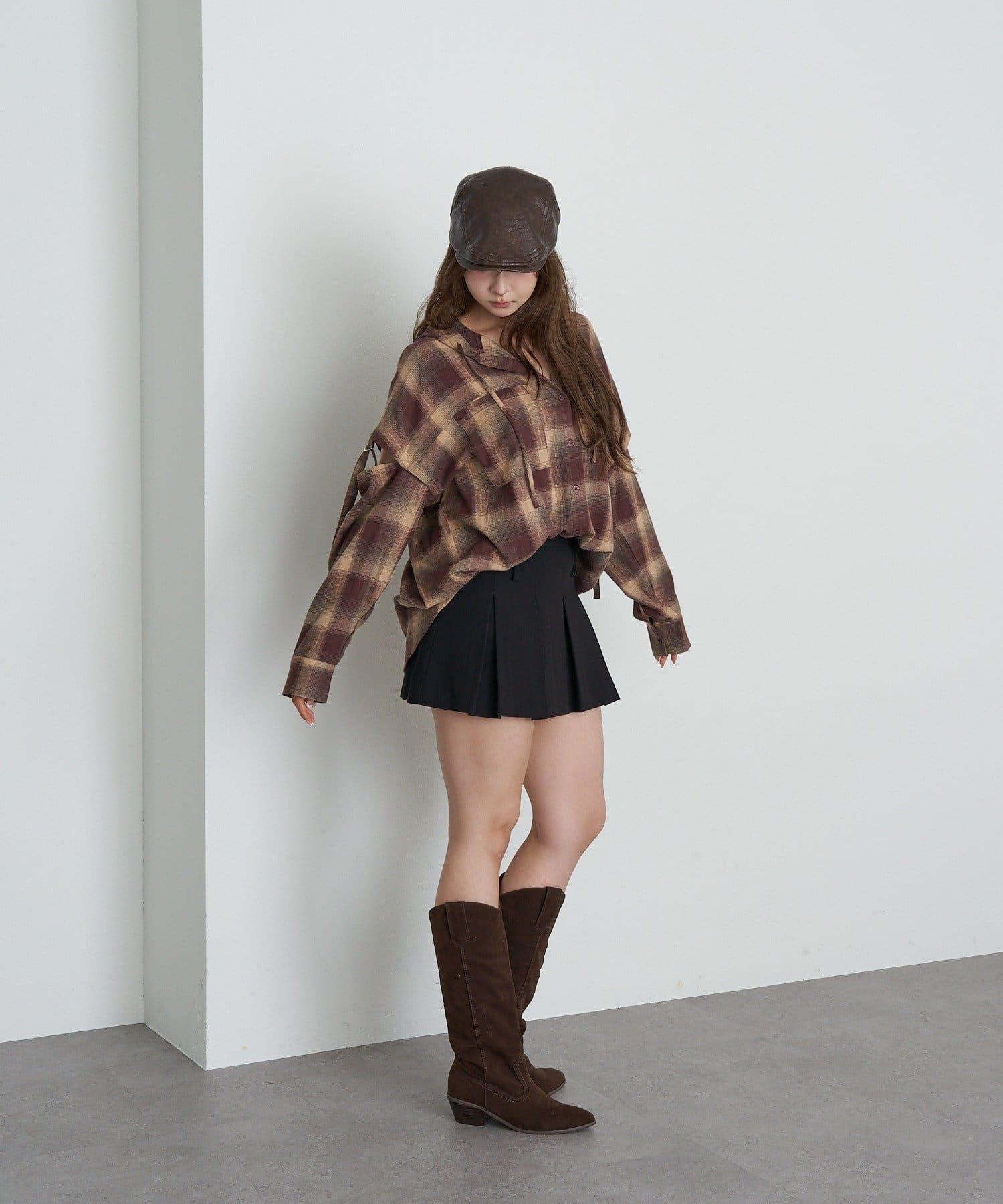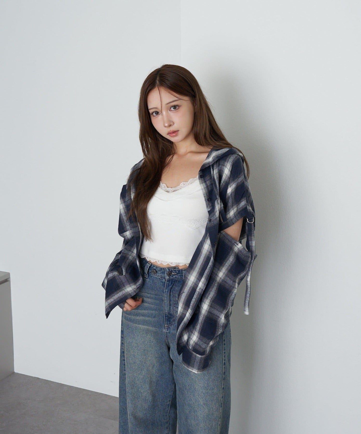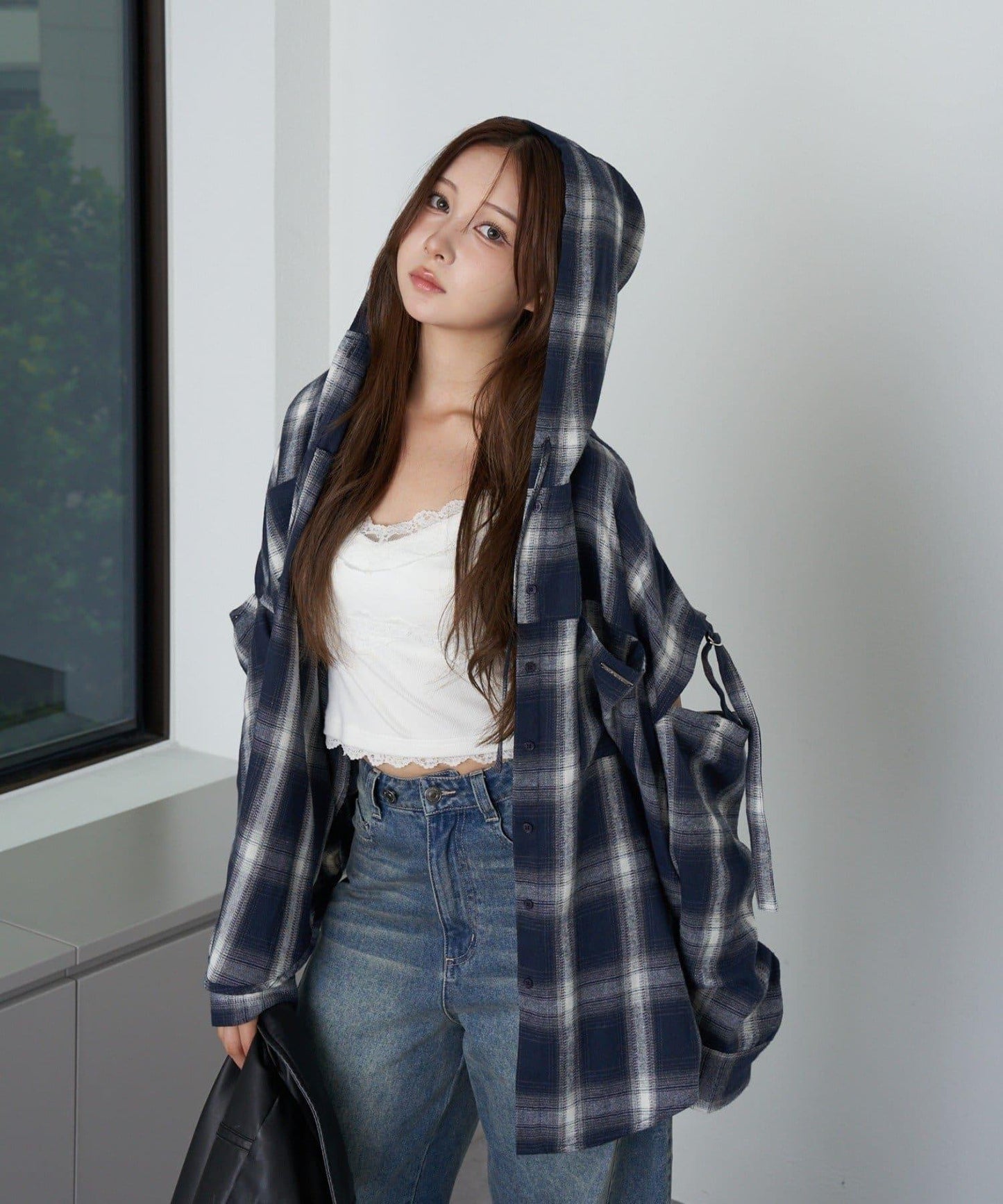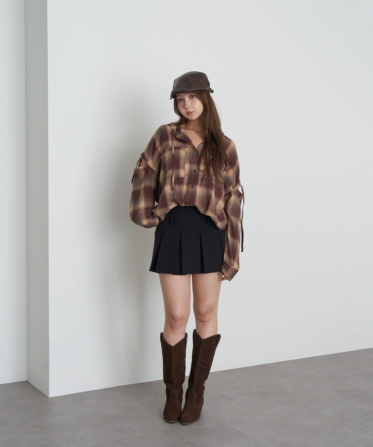 袖開叉連帽格子襯衫