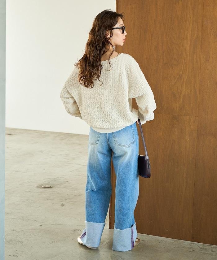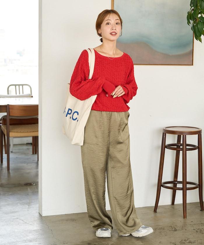 船形領口與中壓褲搭配,給人整潔、休閒的感覺。