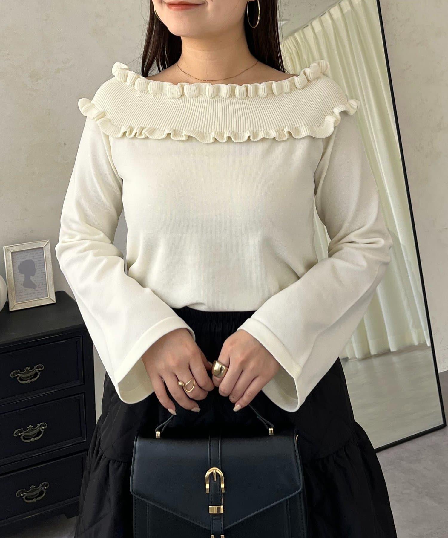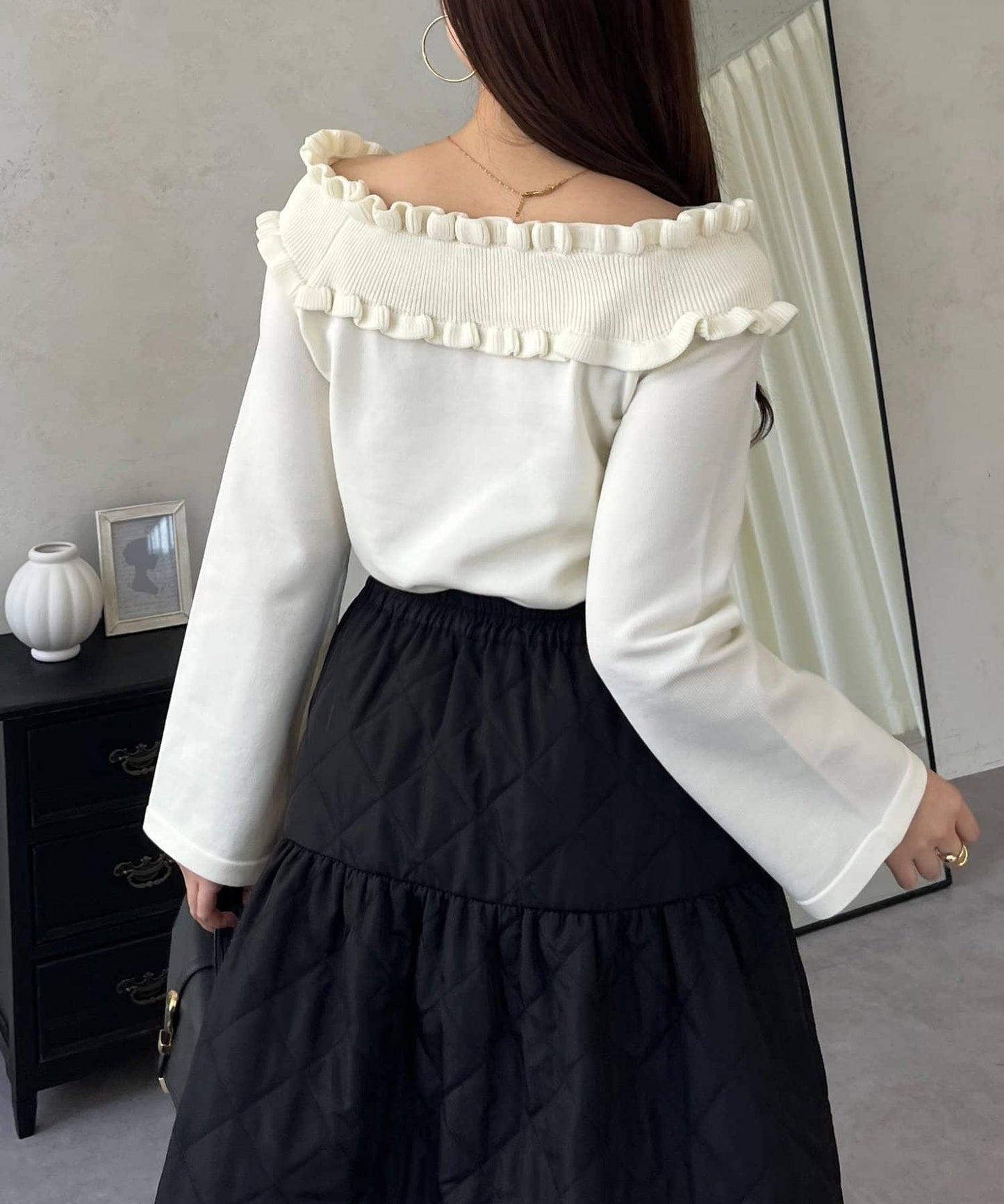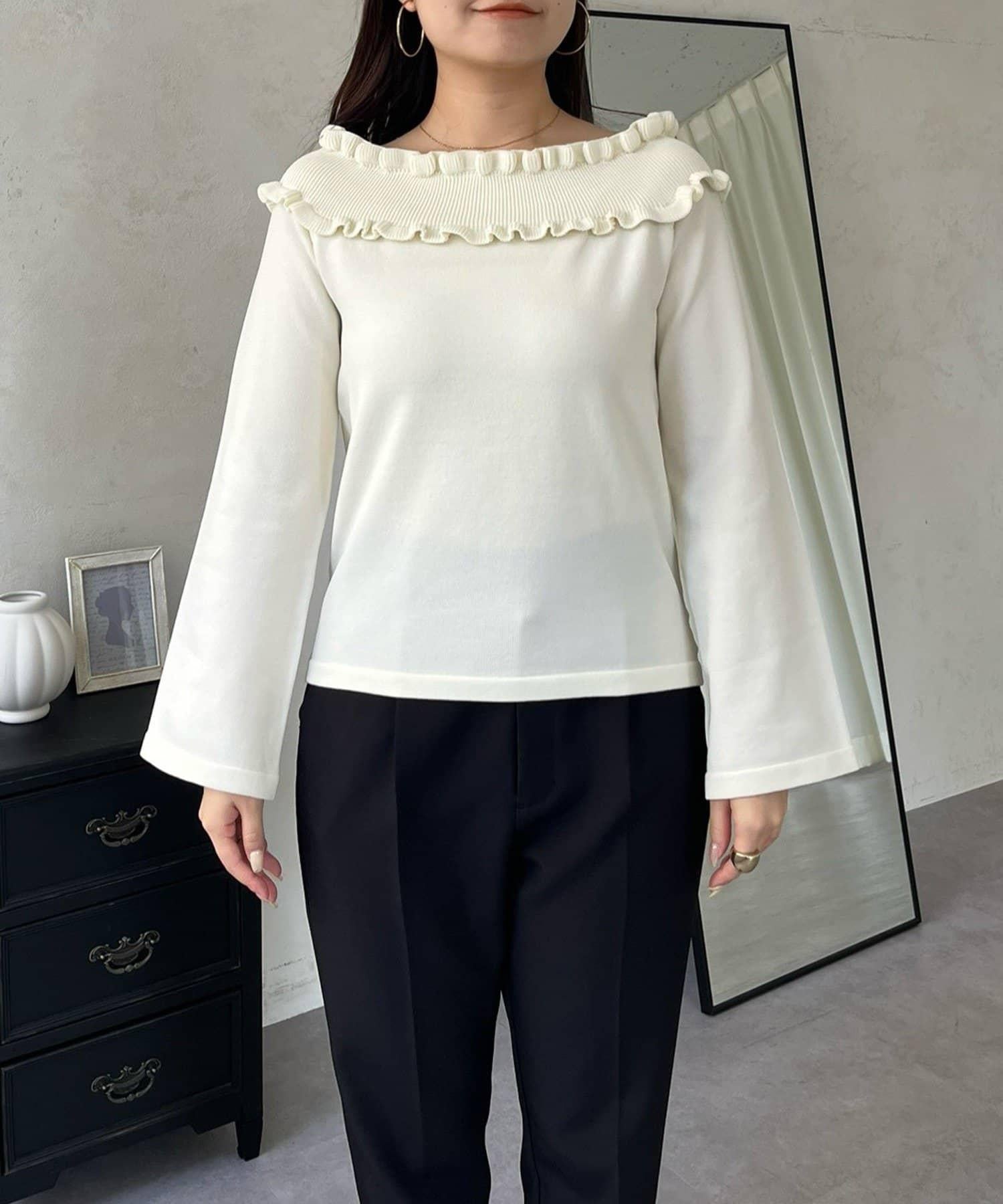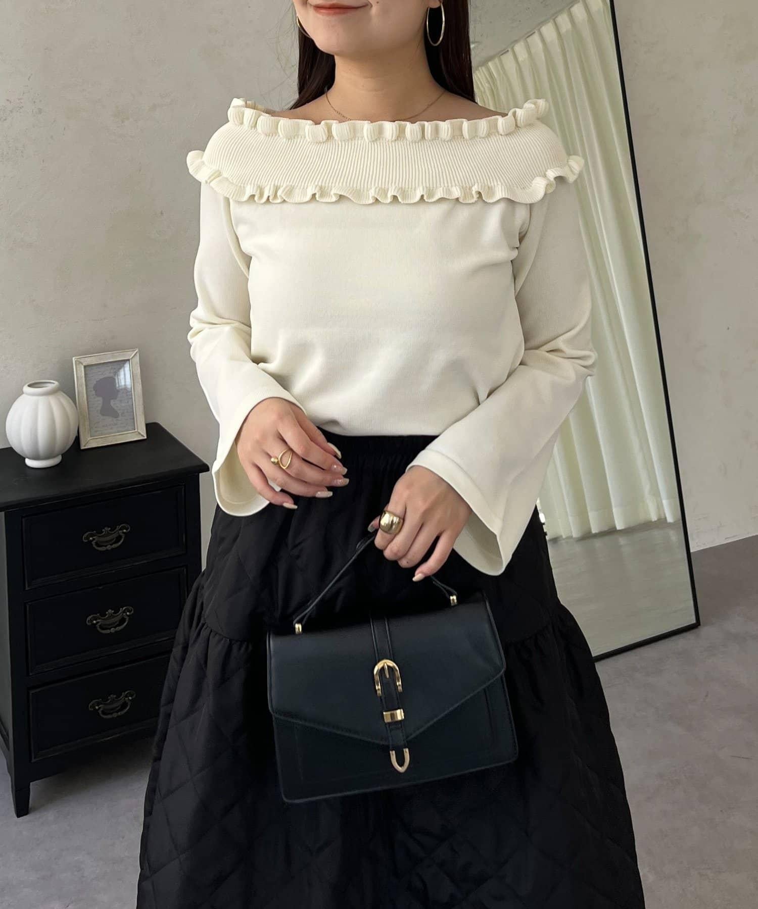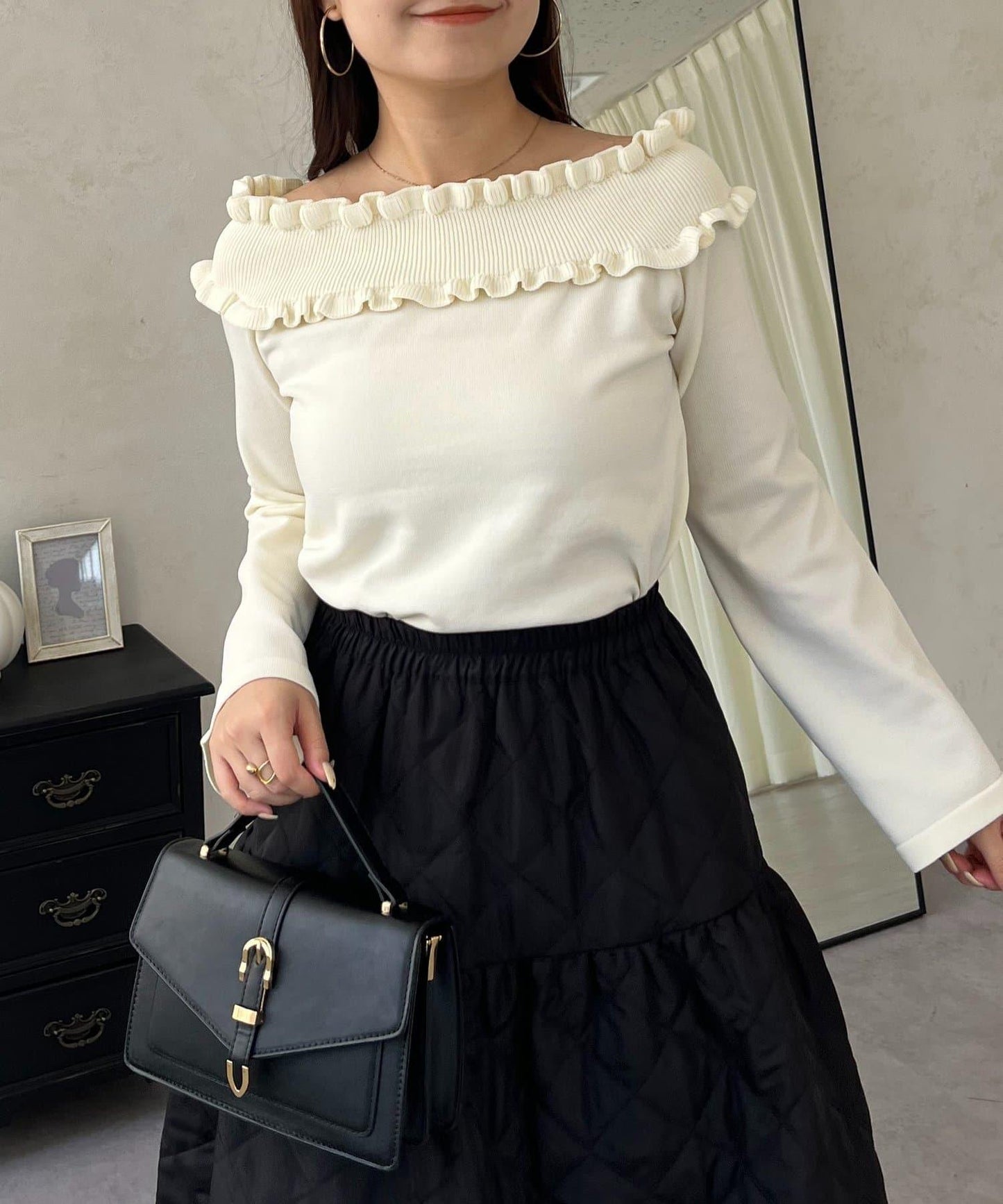 露肩針織衫,荷葉邊設計讓你看起來更有女人味。