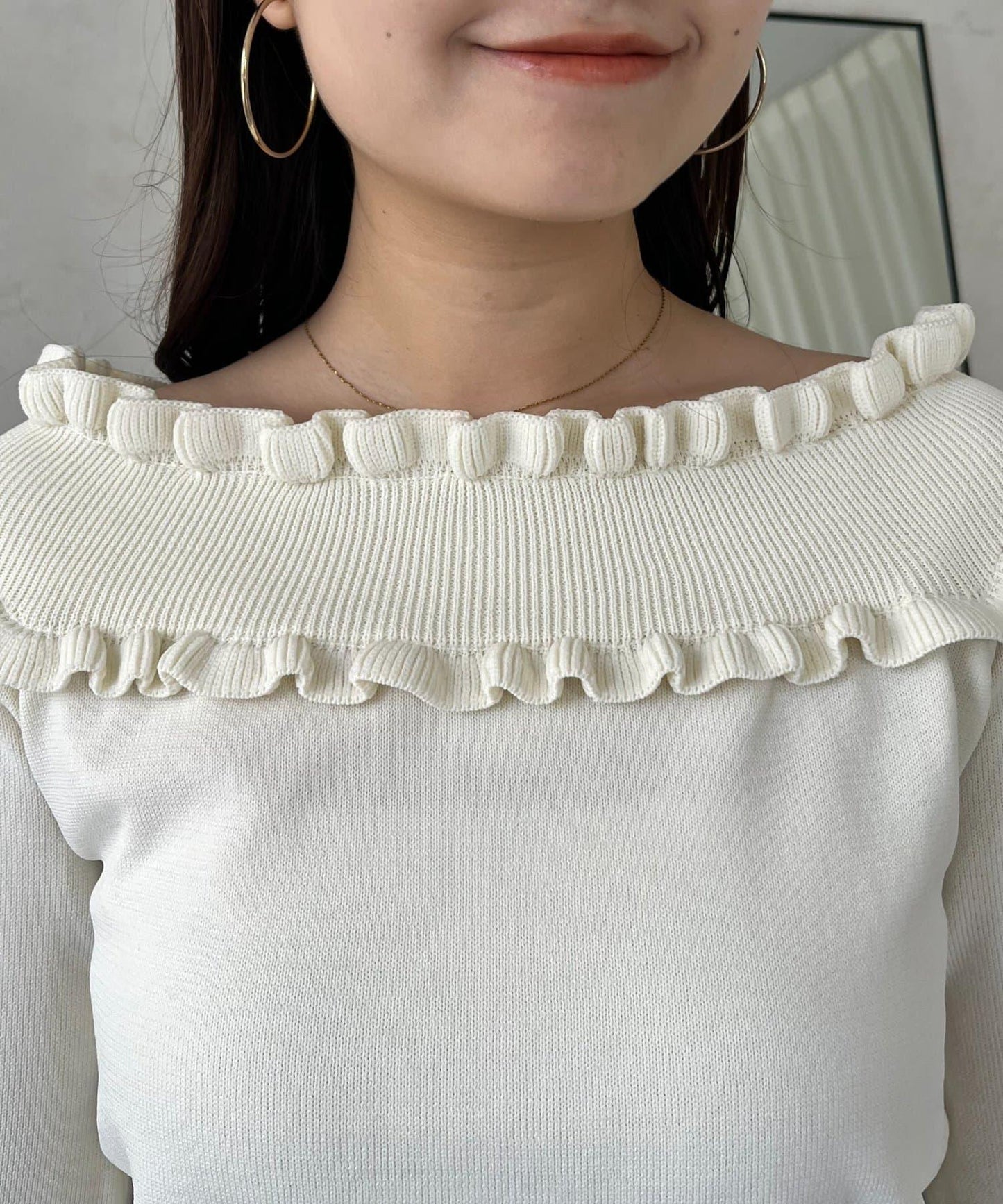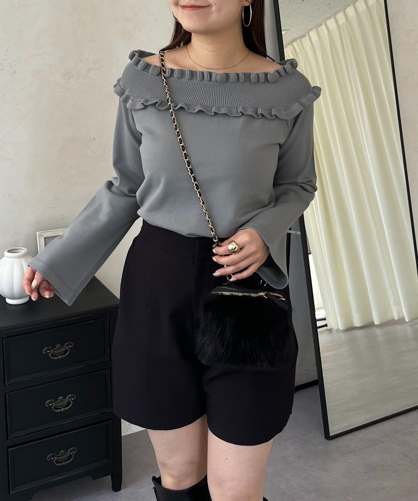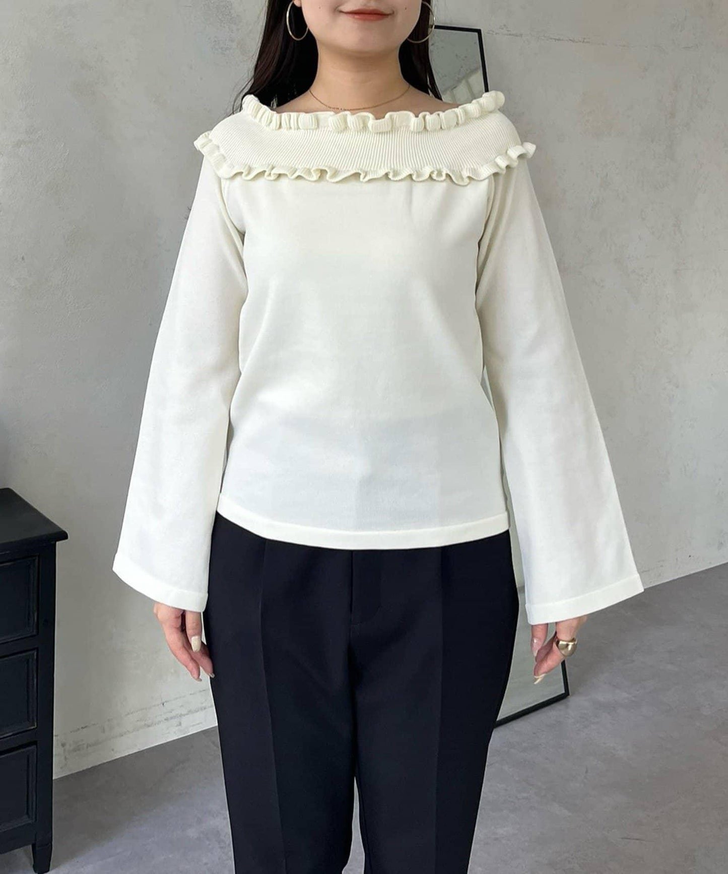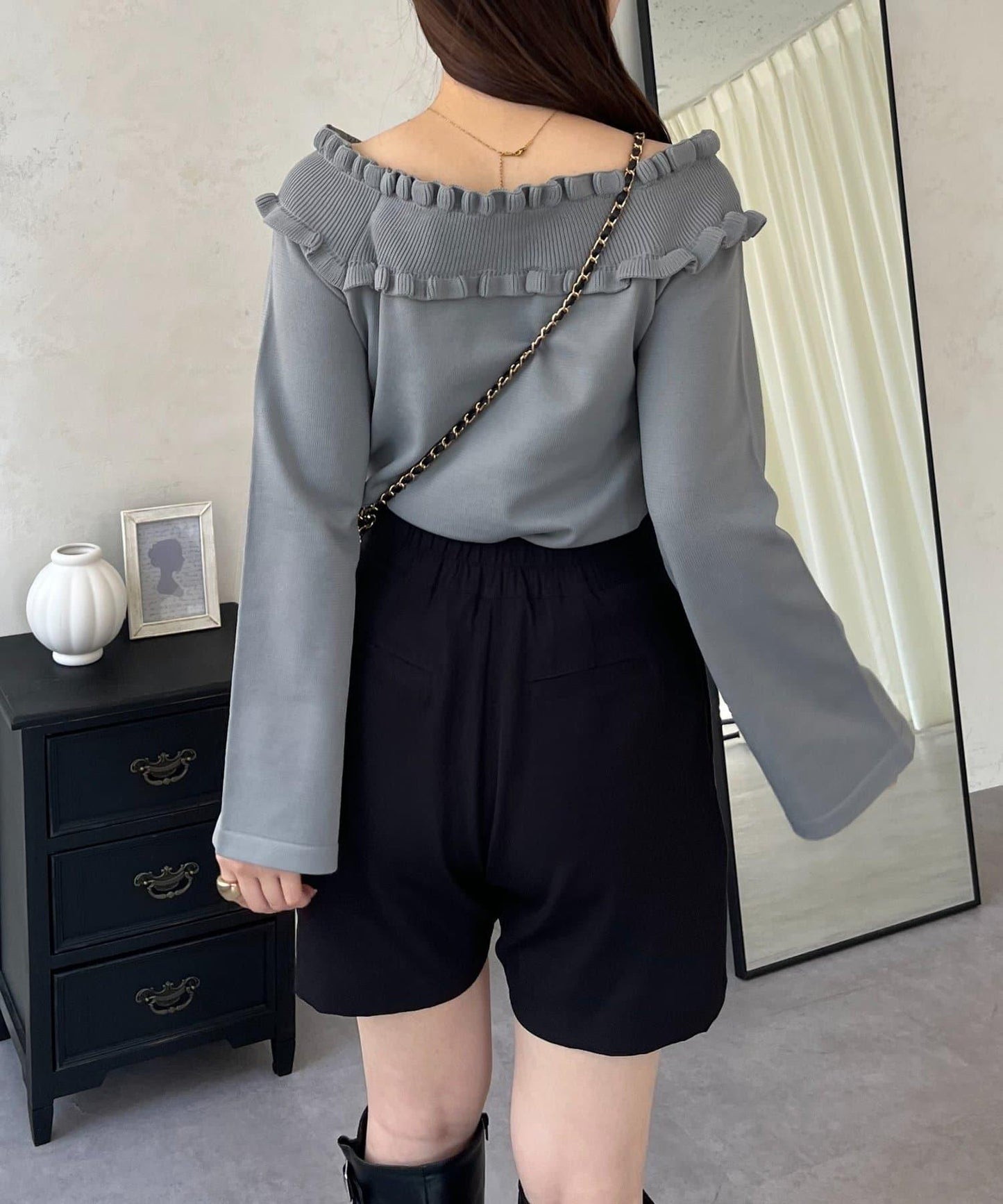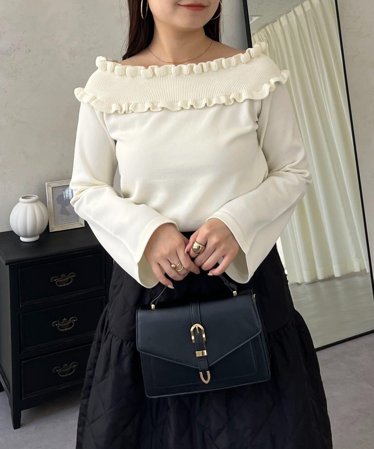 露肩針織衫,荷葉邊設計讓你看起來更有女人味。