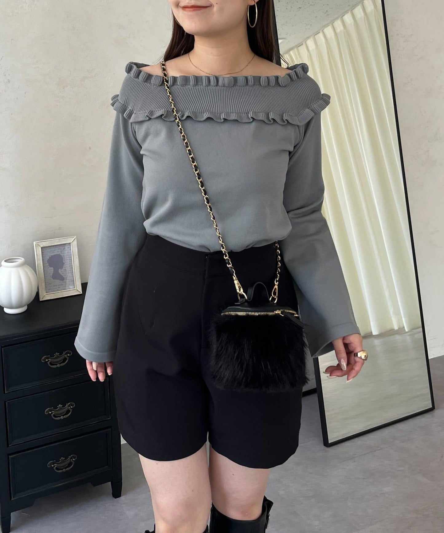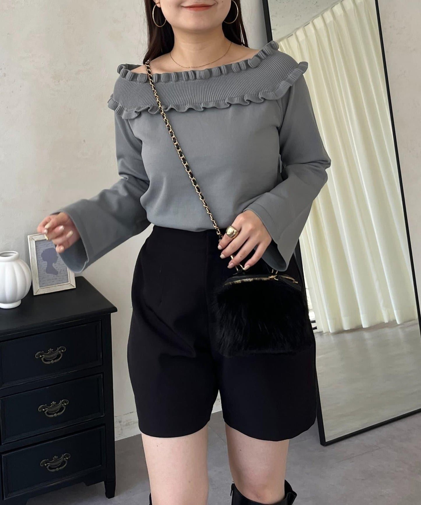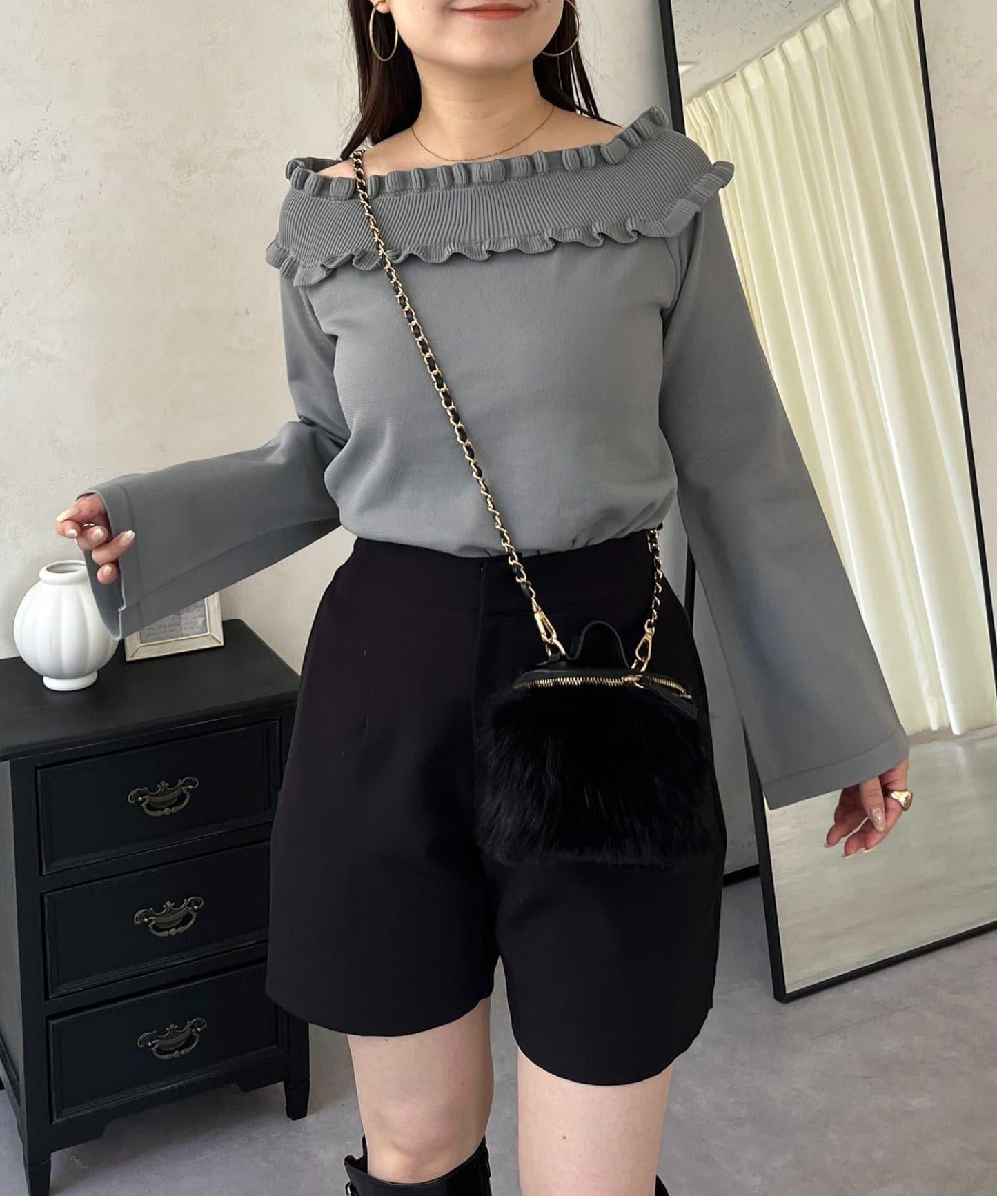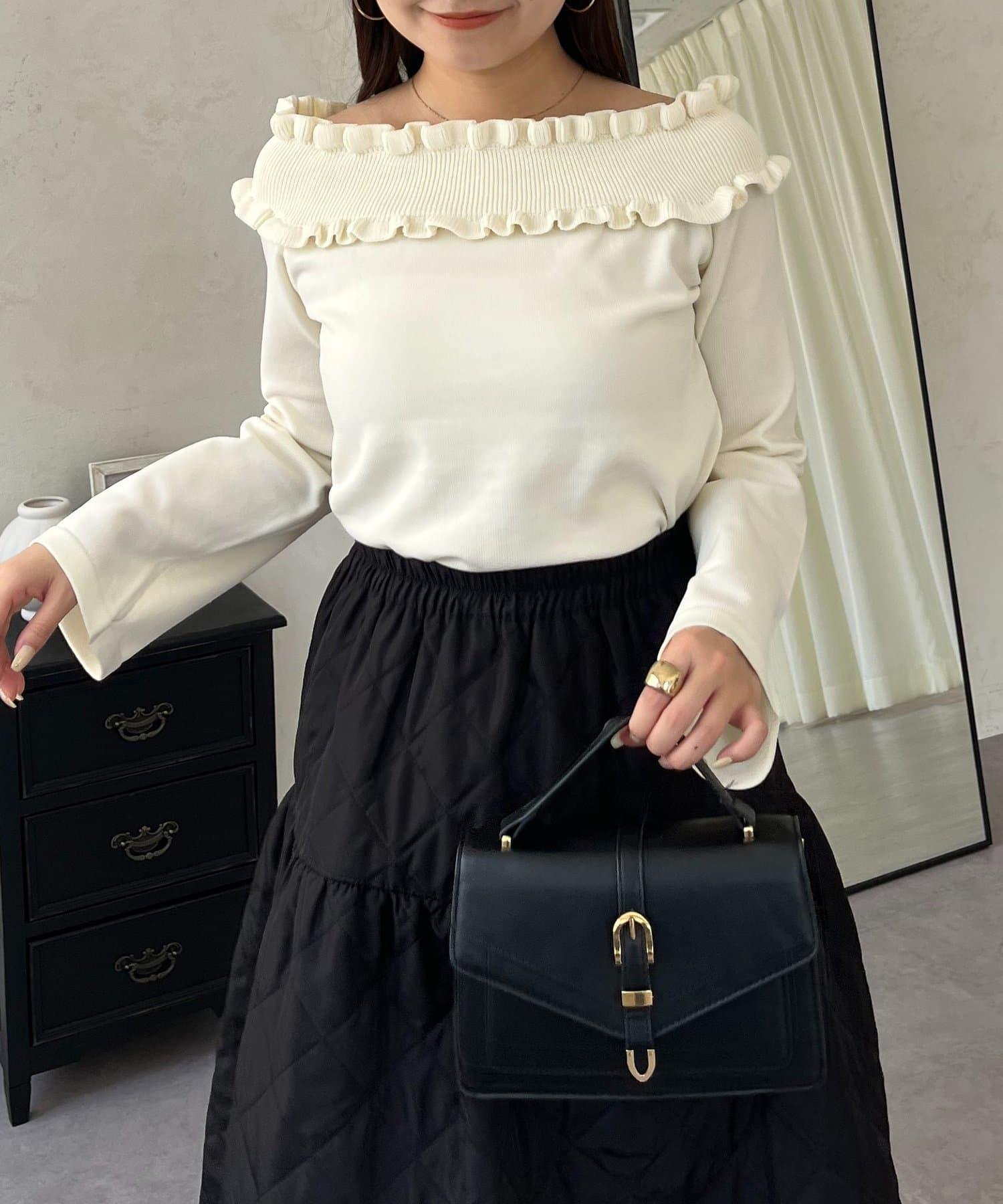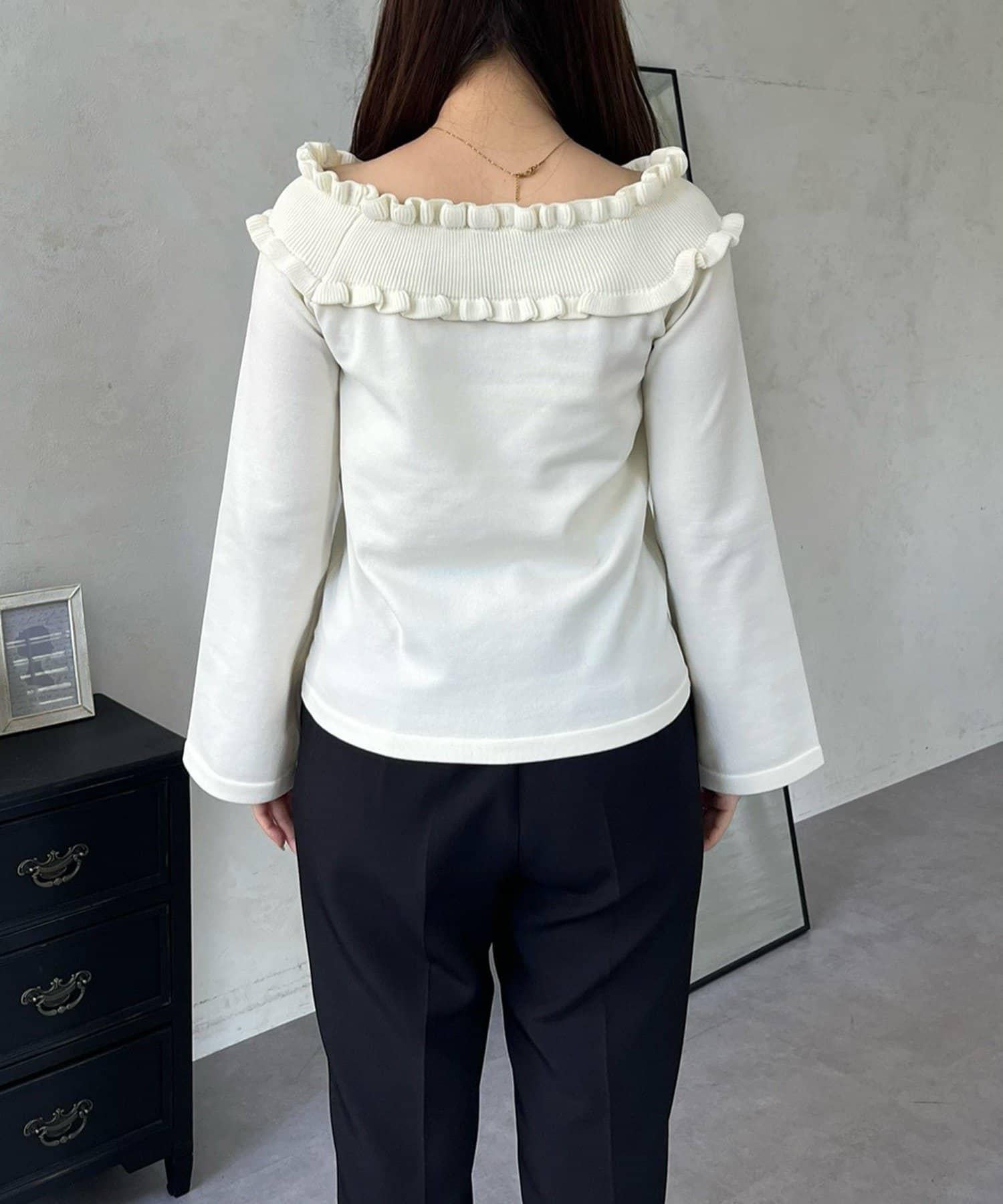 露肩針織衫,荷葉邊設計讓你看起來更有女人味。