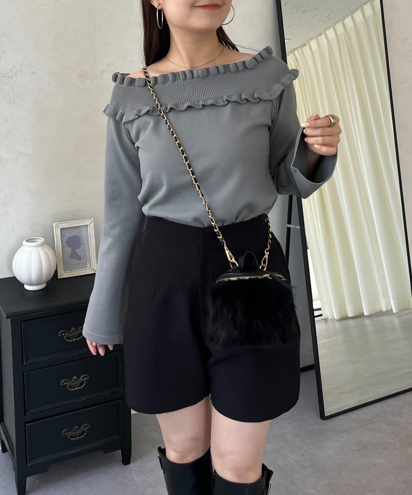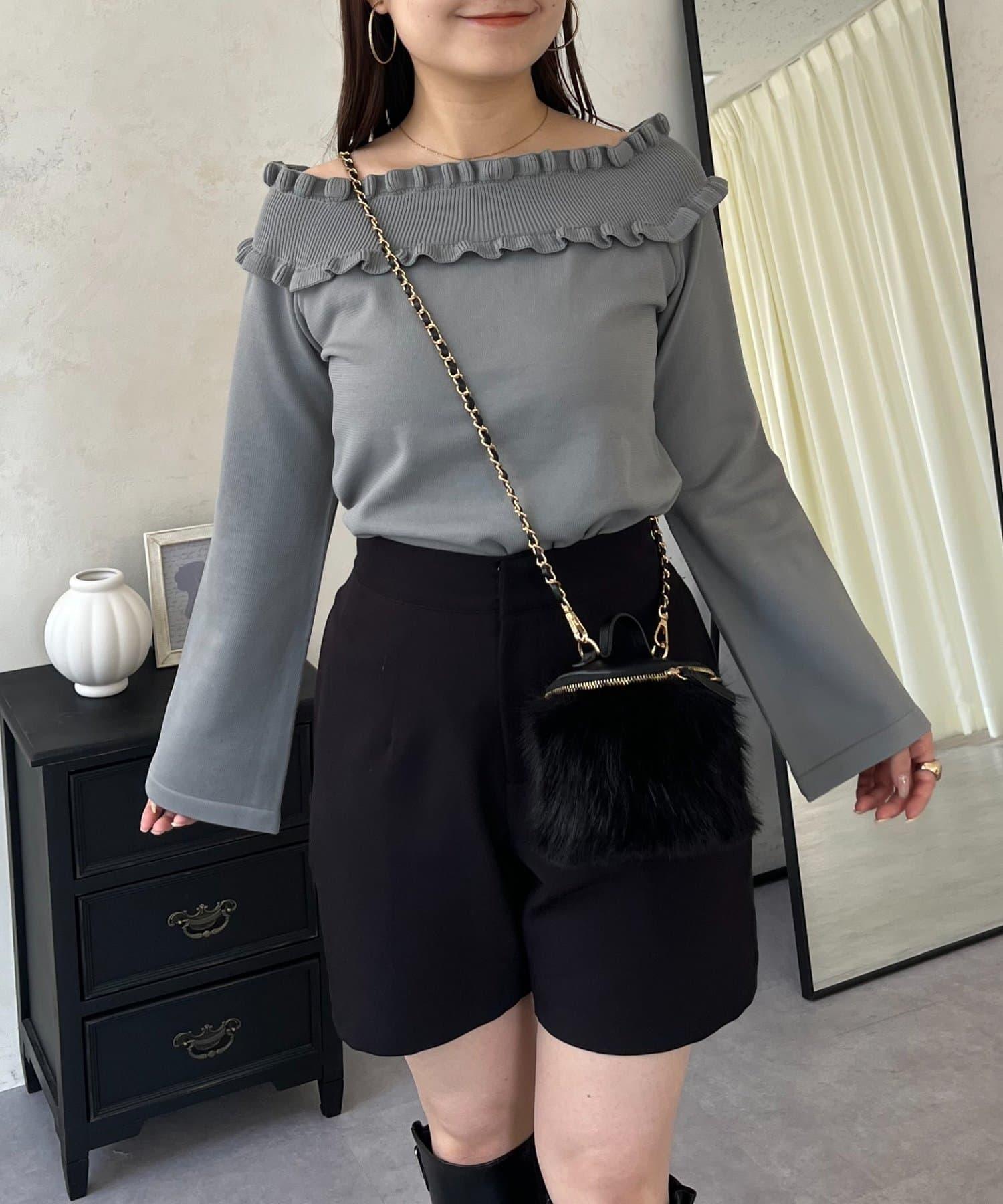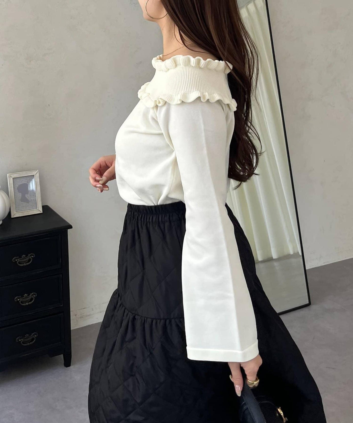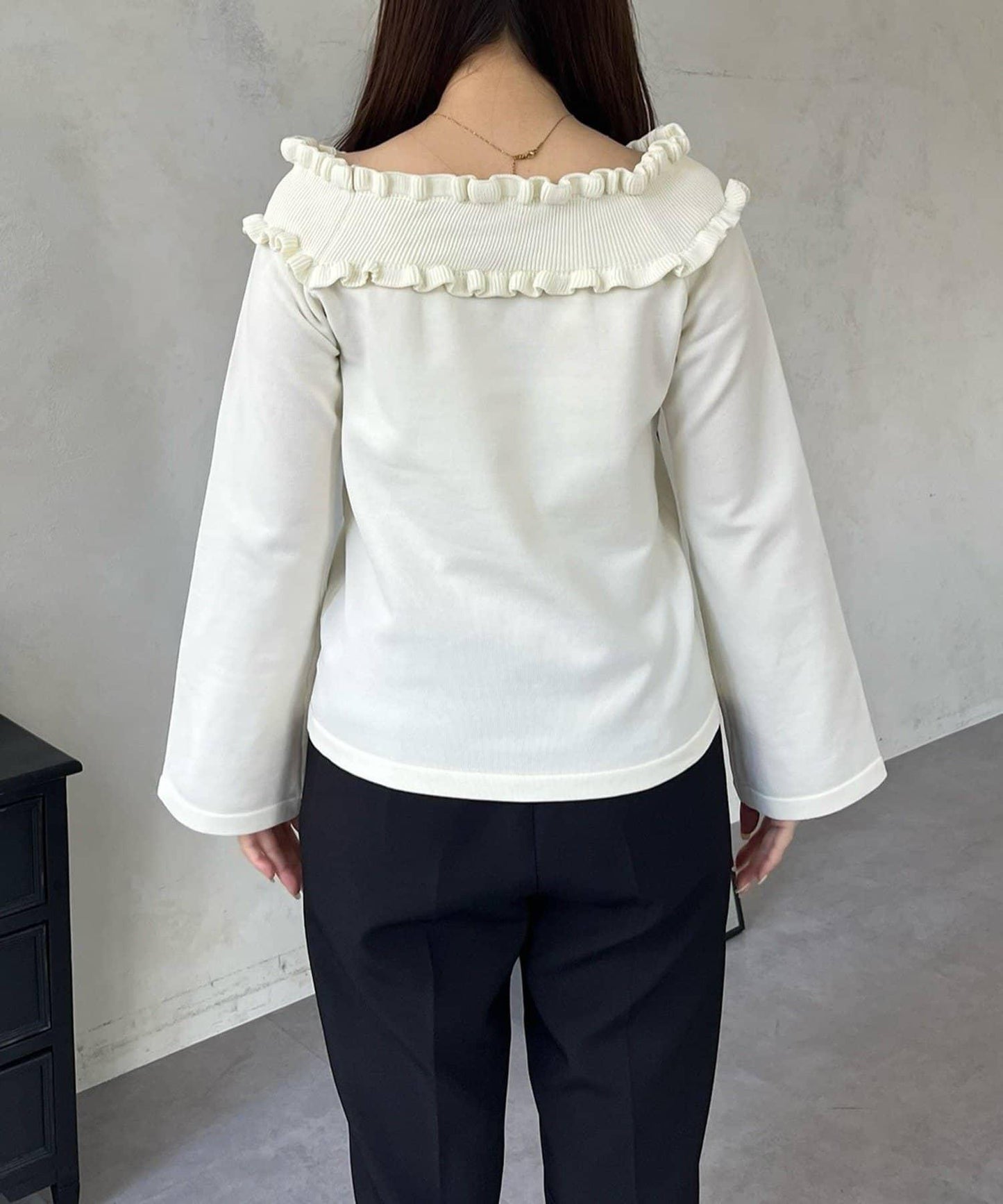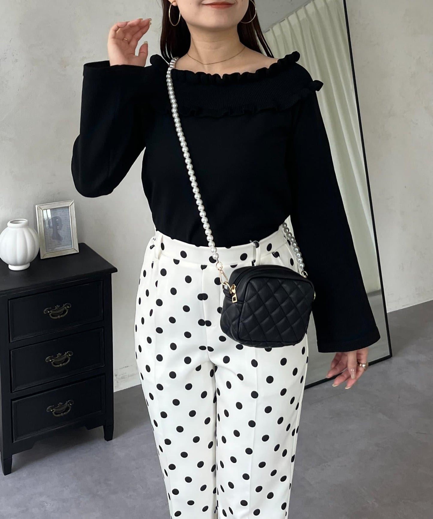 露肩針織衫,荷葉邊設計讓你看起來更有女人味。