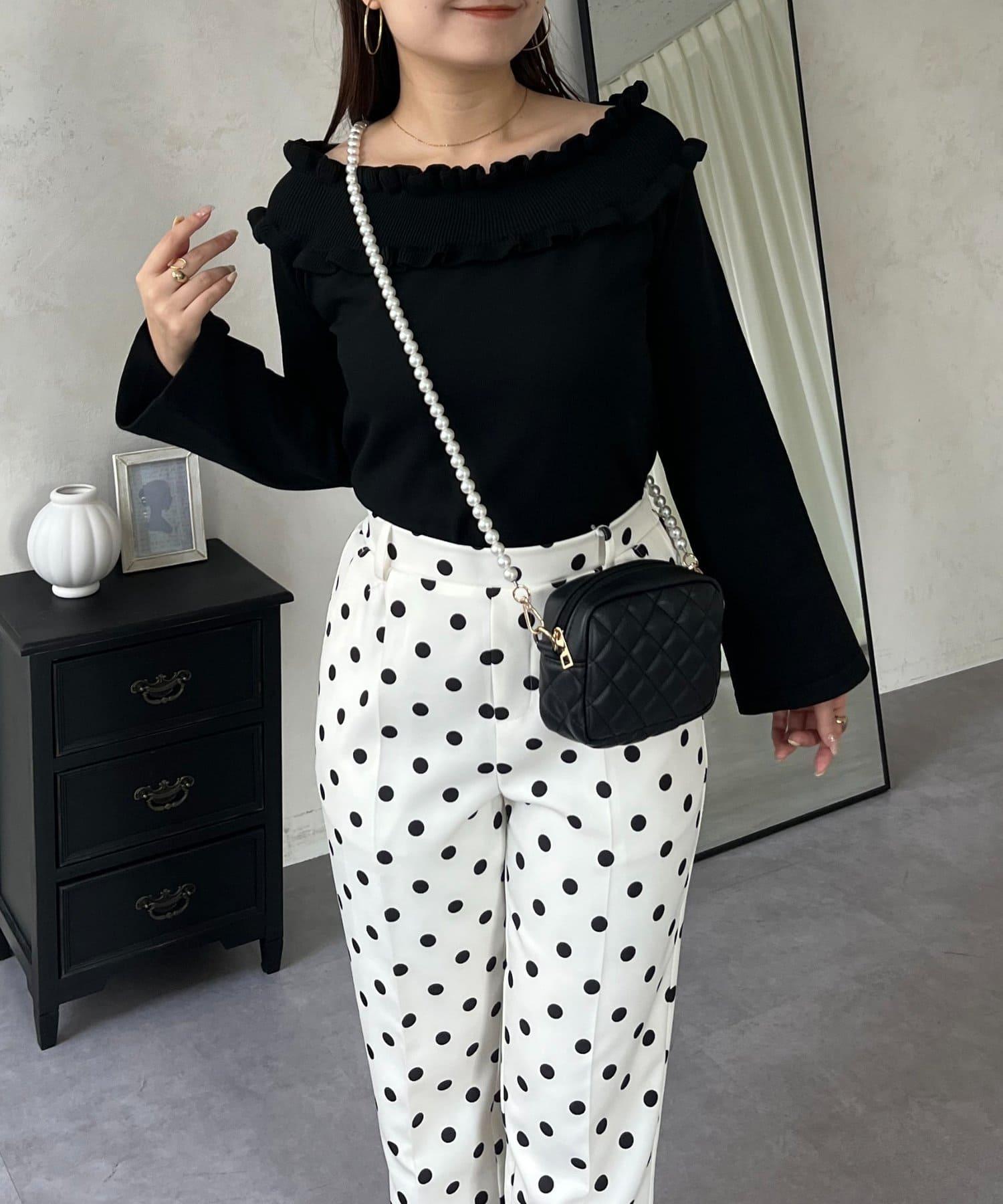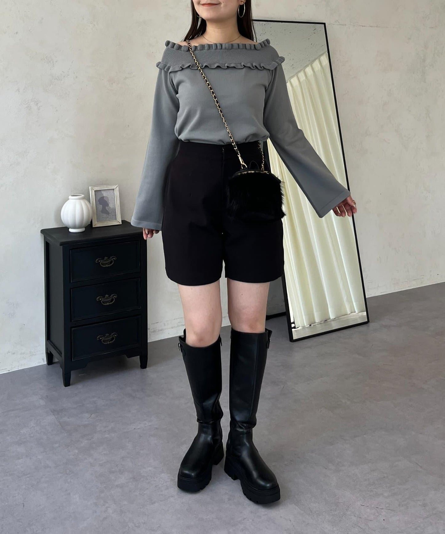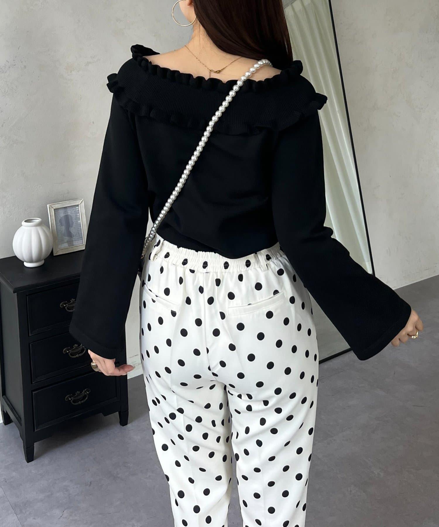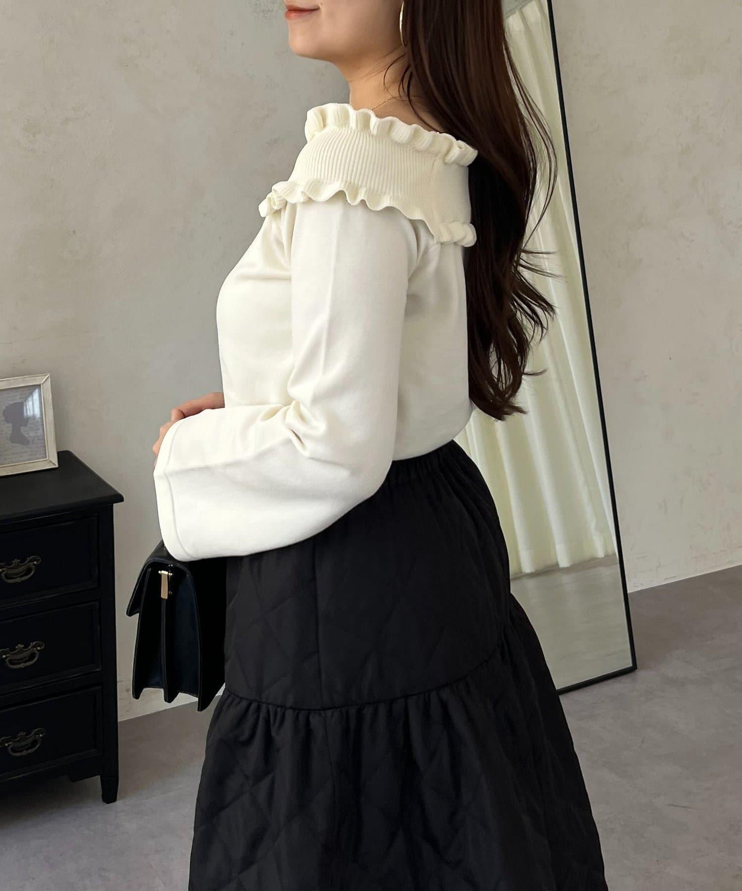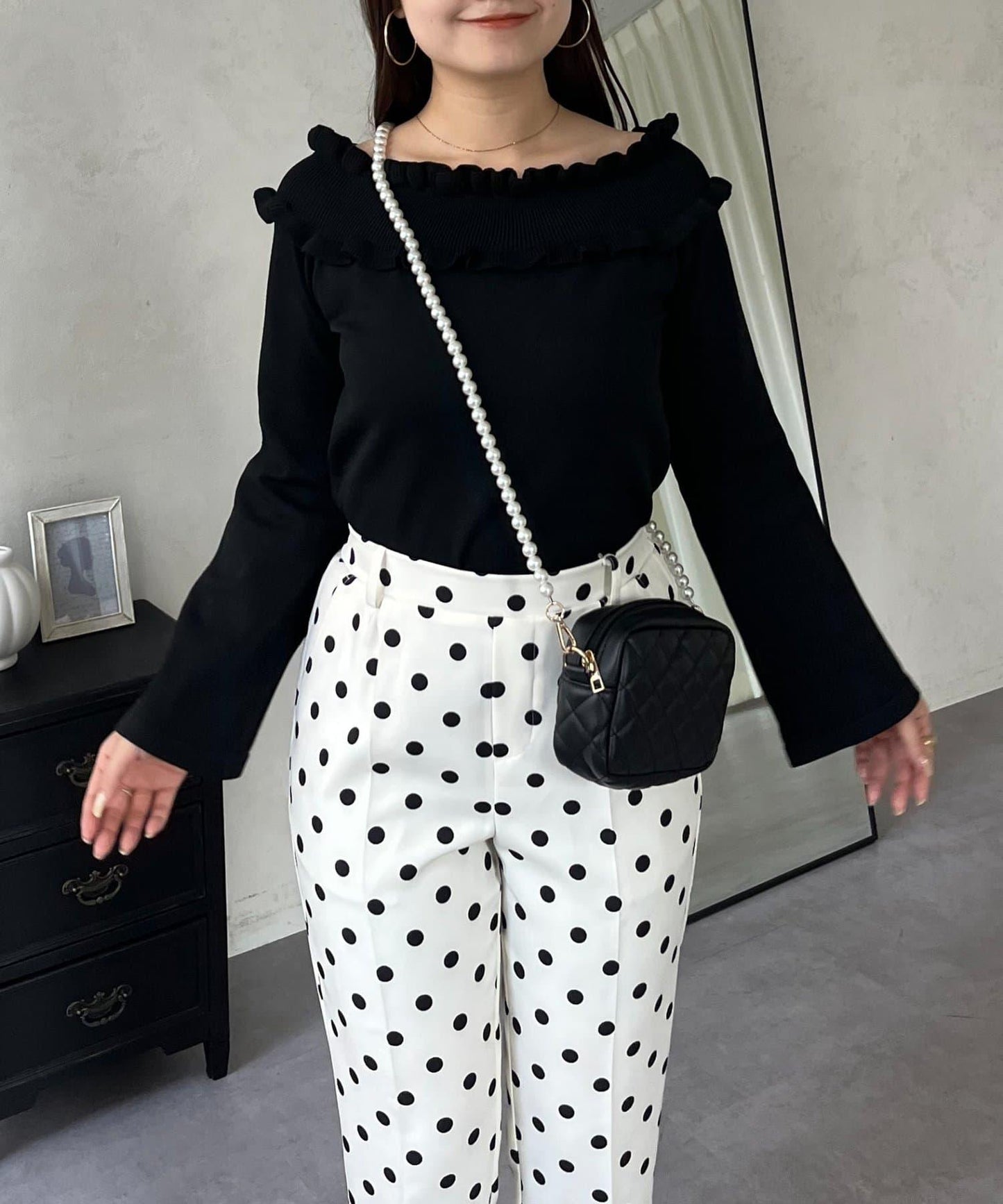 露肩針織衫,荷葉邊設計讓你看起來更有女人味。