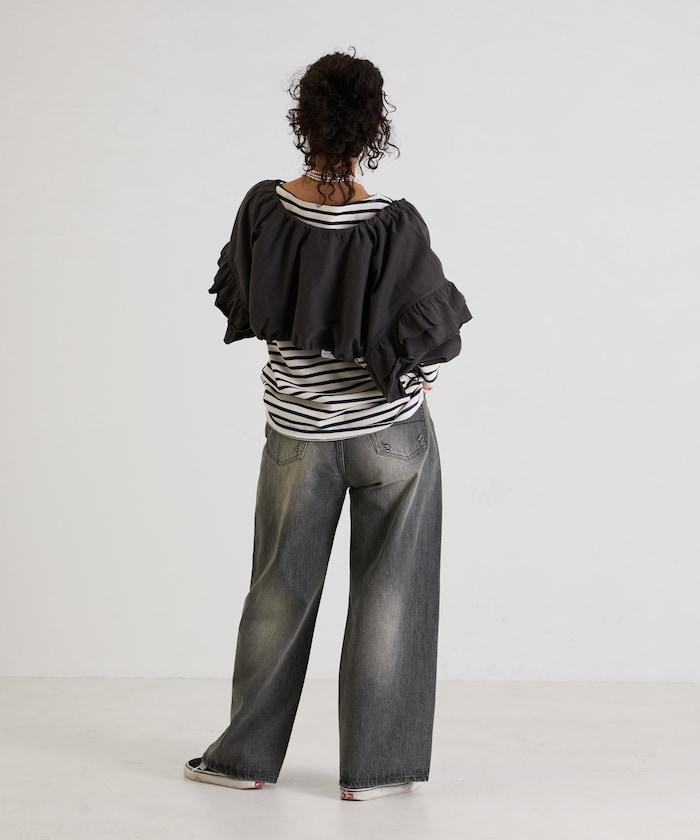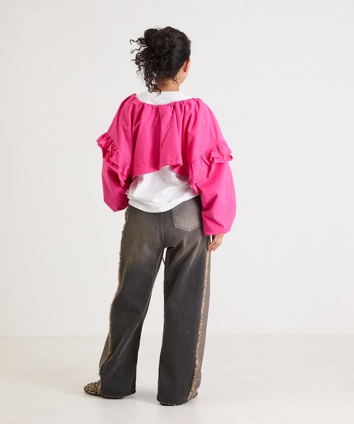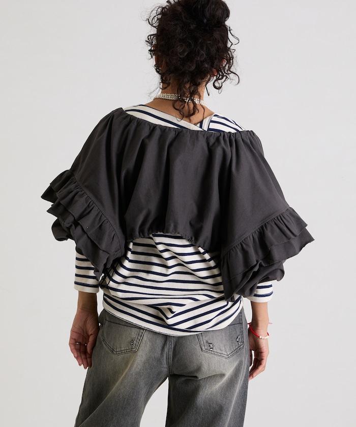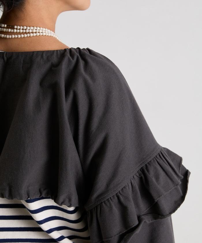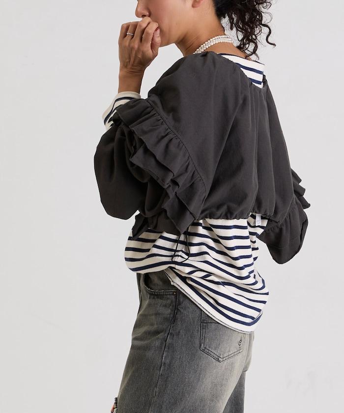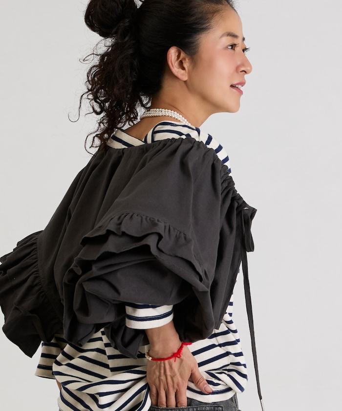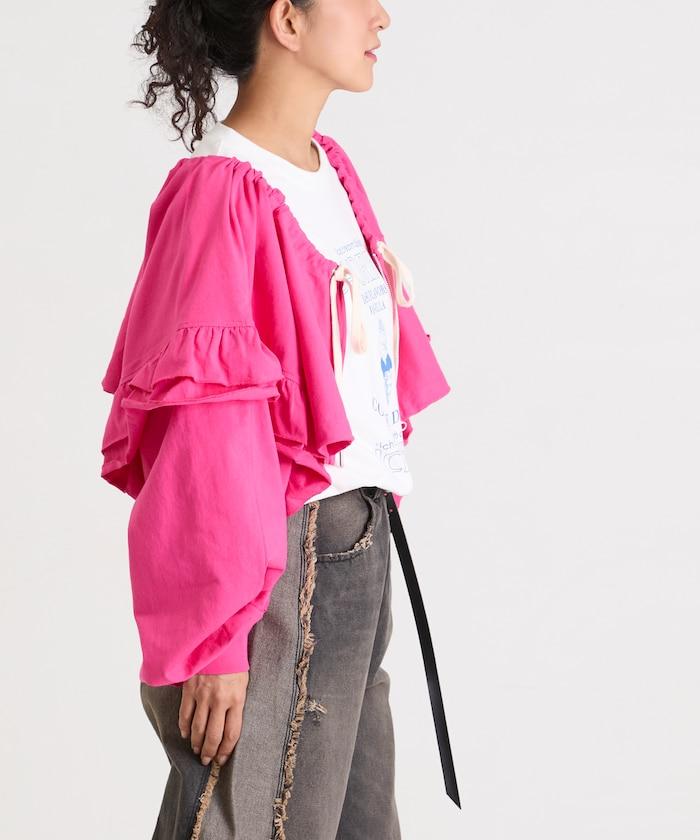 面料厚薄適中,有男裝的感覺,但大量的荷葉邊和褶皺又賦予了它女性的柔美氣質。