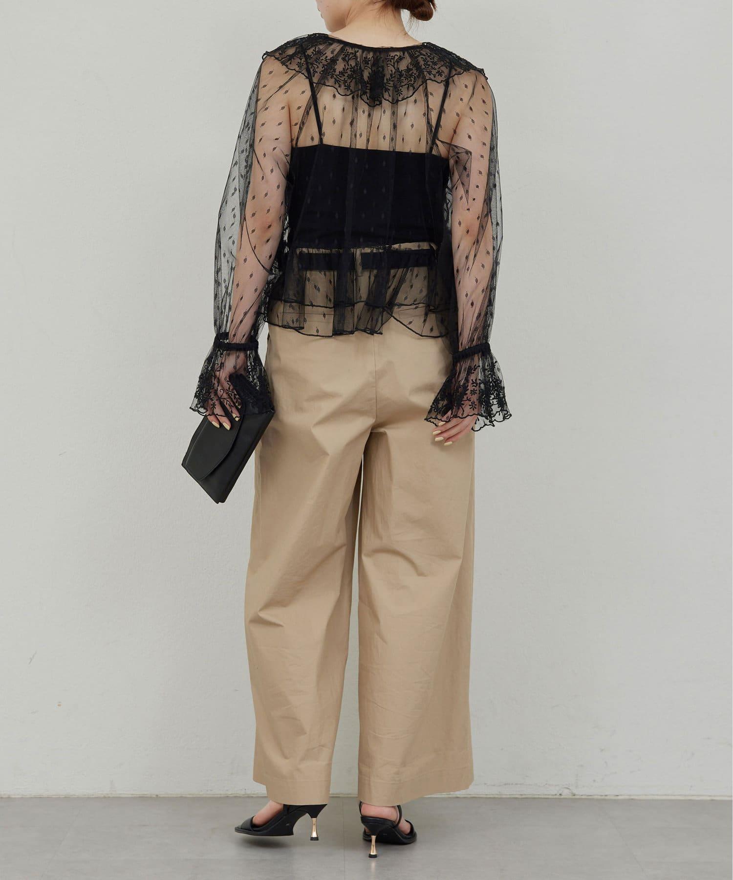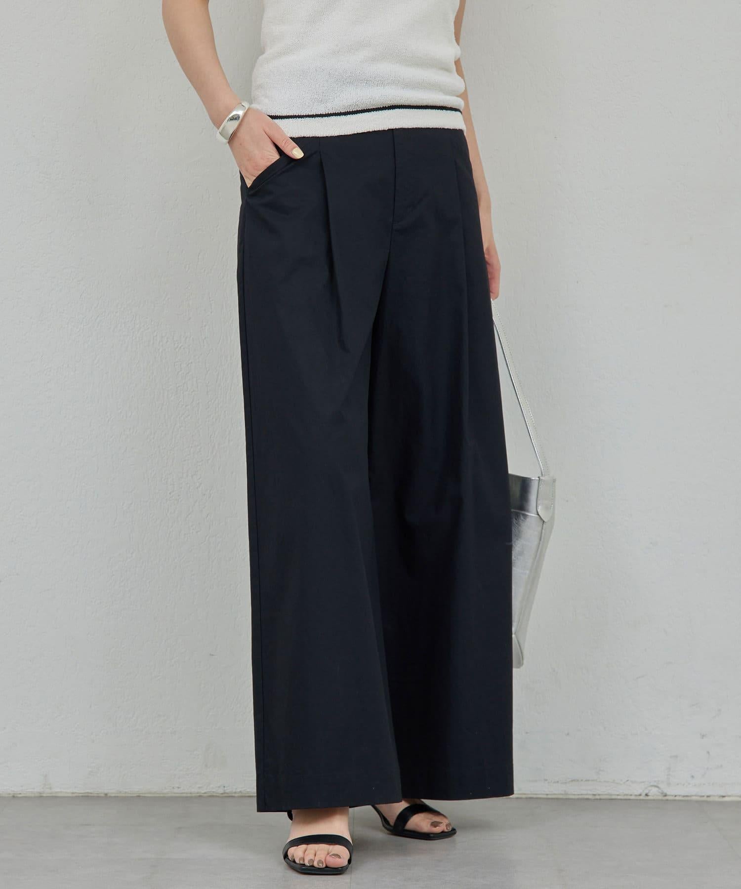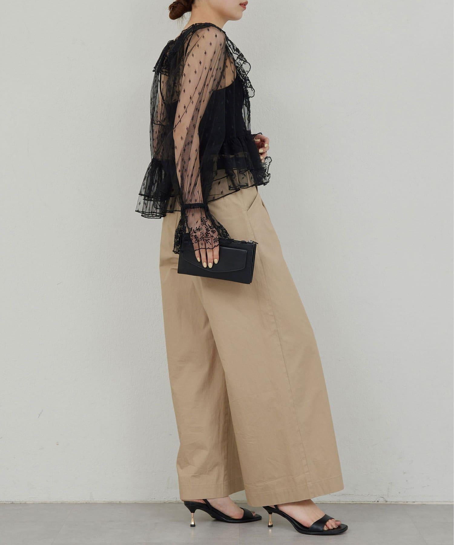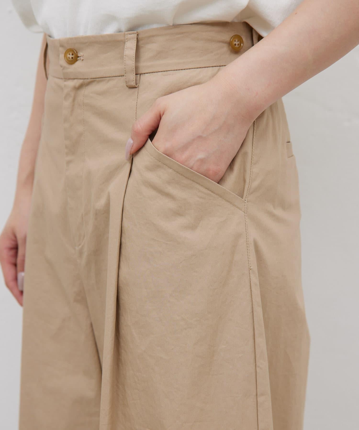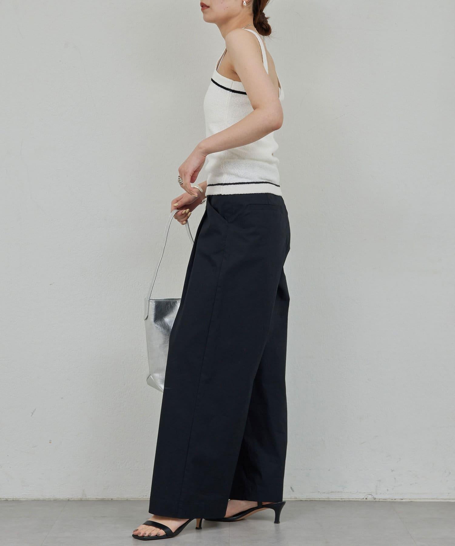 寬鬆長褲,腰部有整齊的束帶。