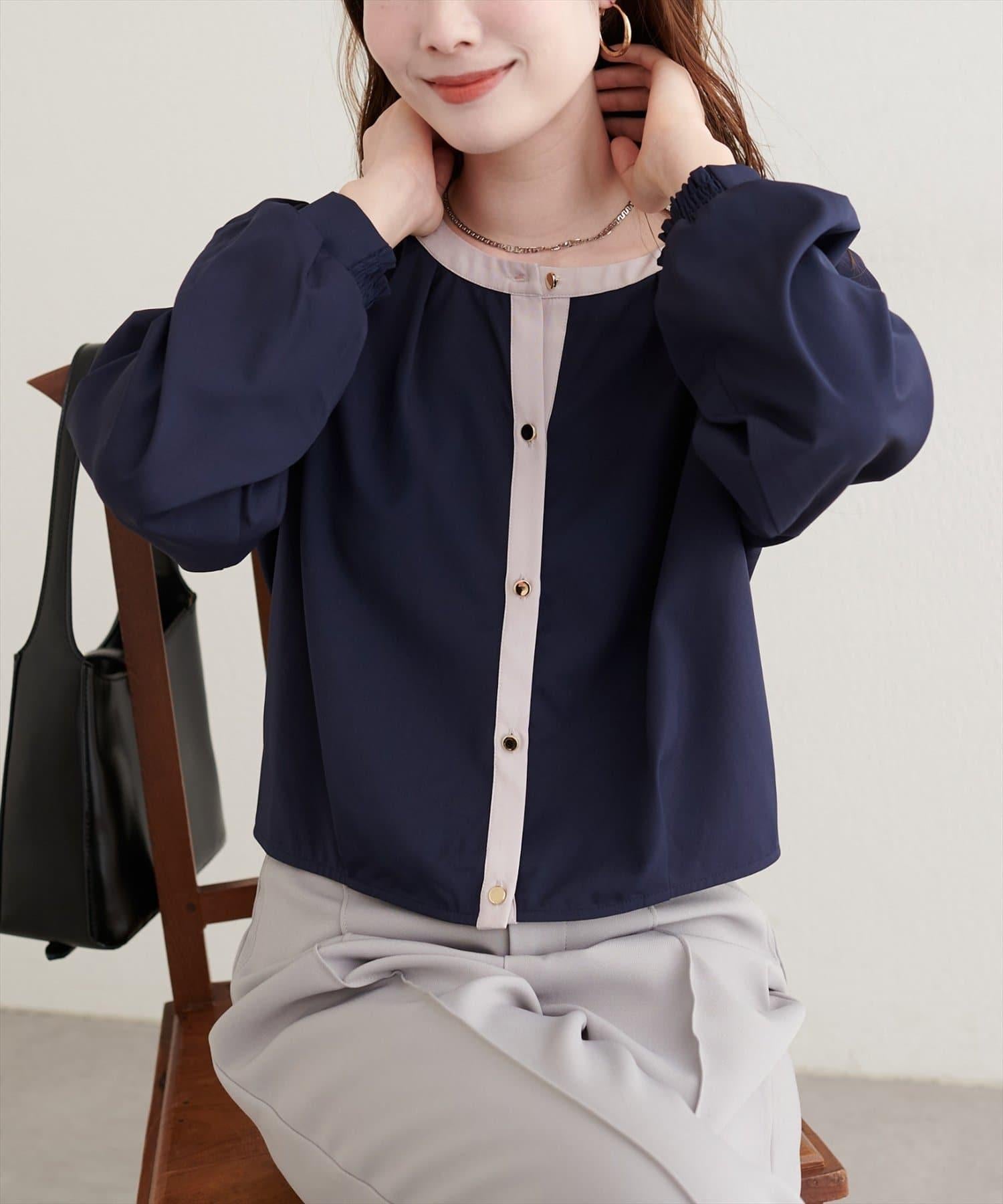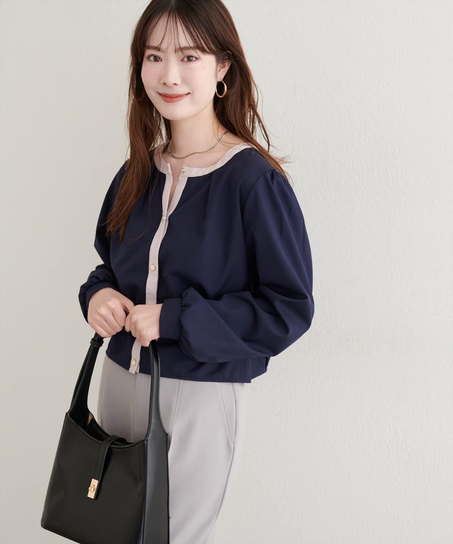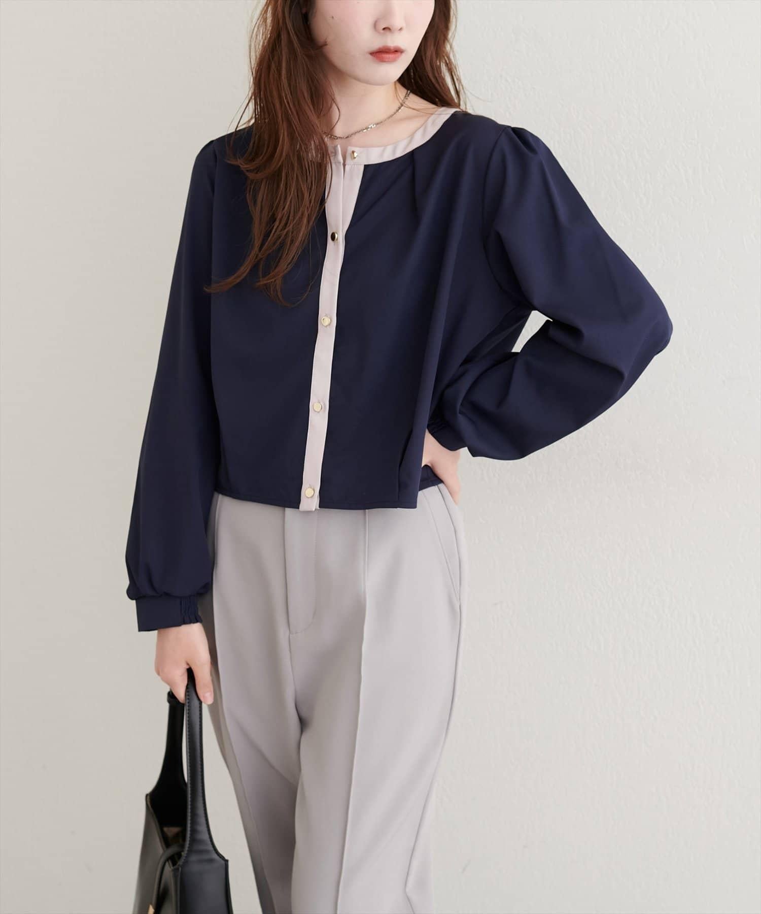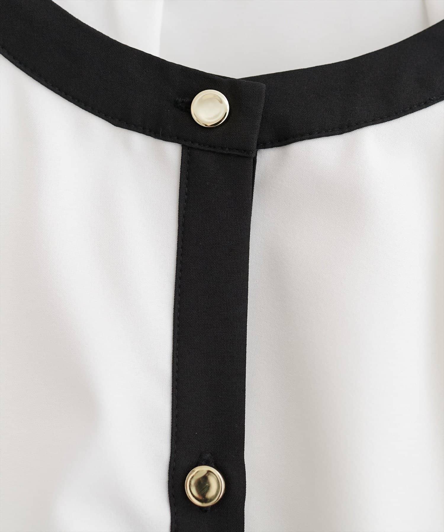正面的紐扣設計和下襬內收的蓬鬆剪裁是這款襯衫的特色。