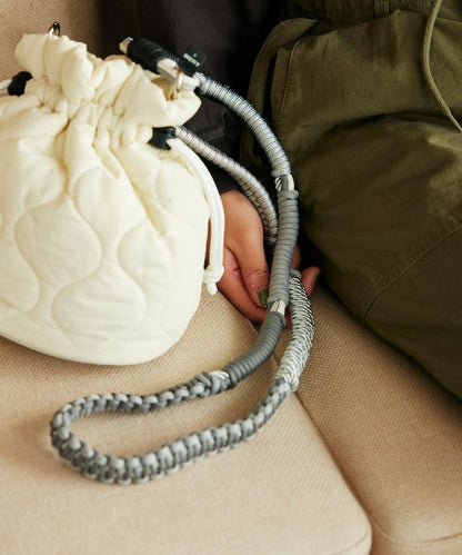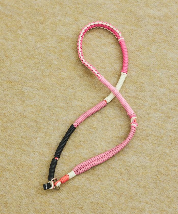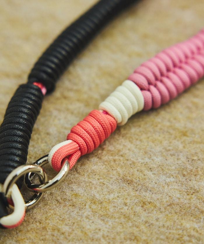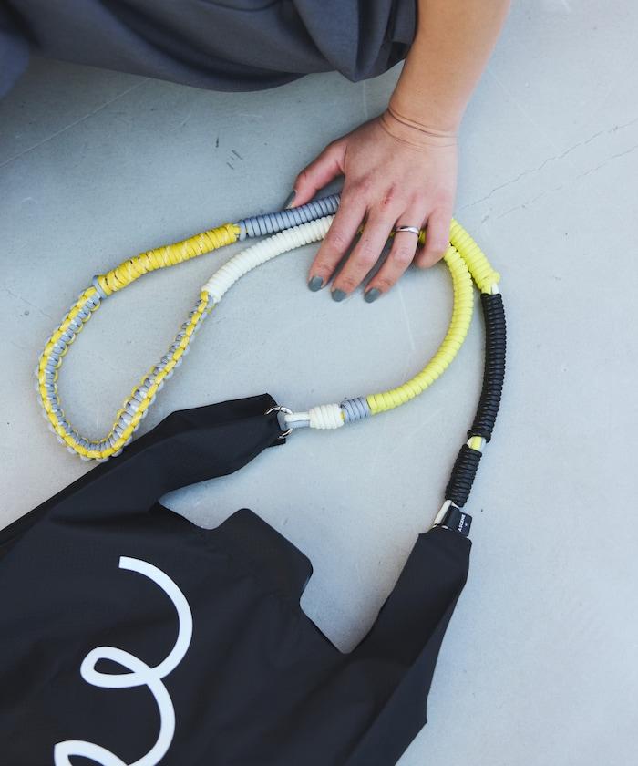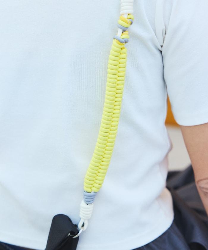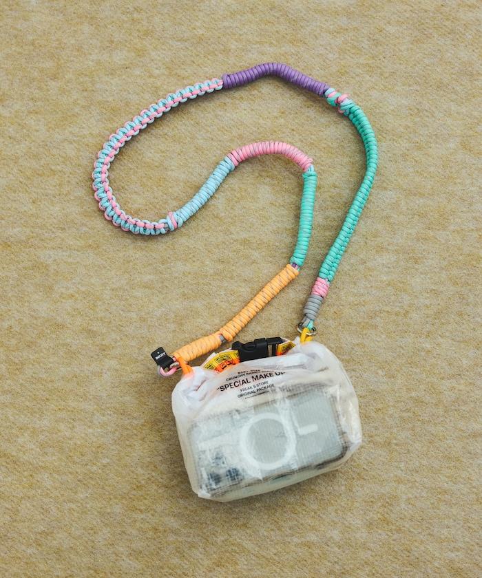 肩帶由色彩繽紛、編織複雜的傘繩編織而成,具有強烈的視覺衝擊力。
