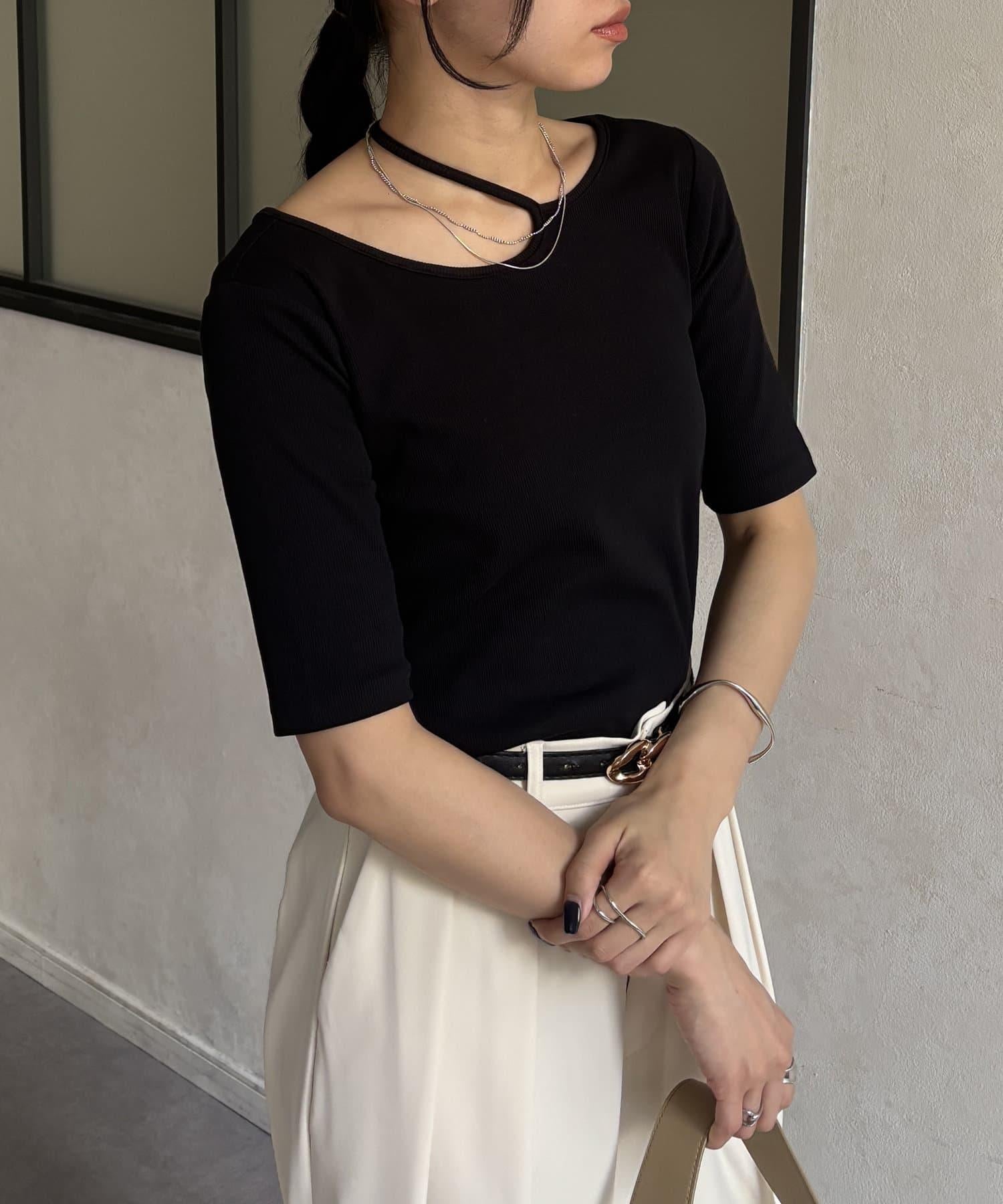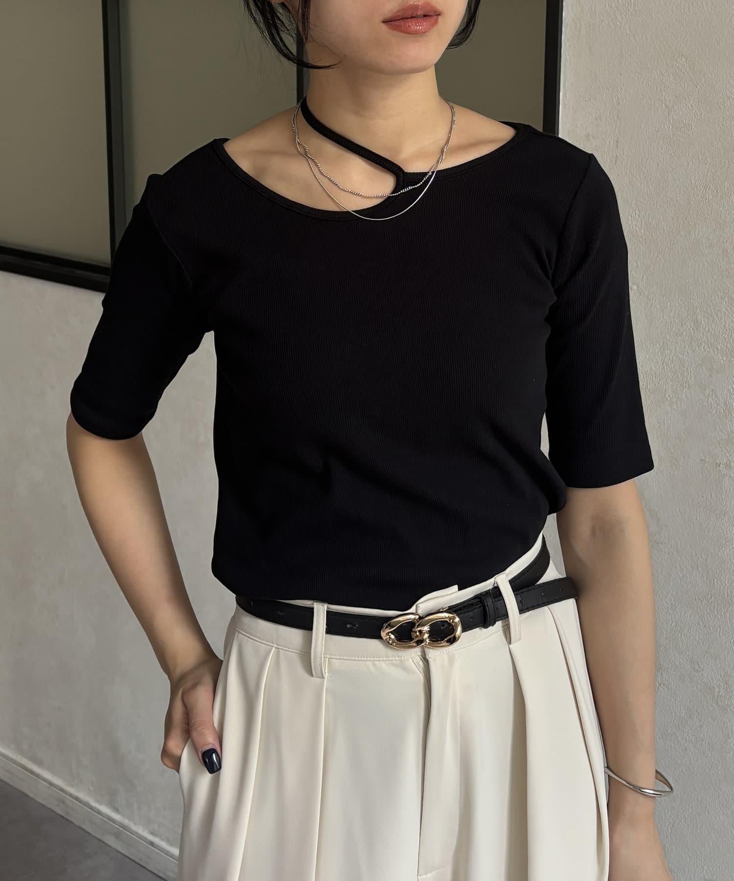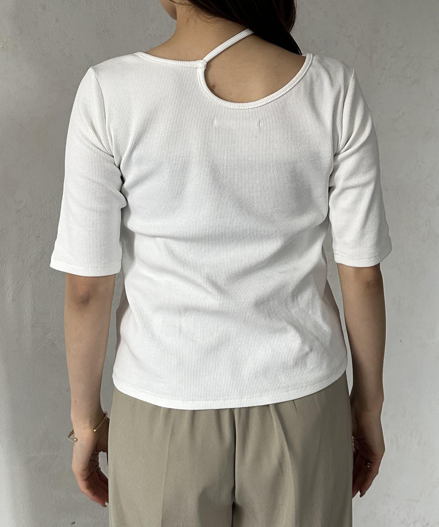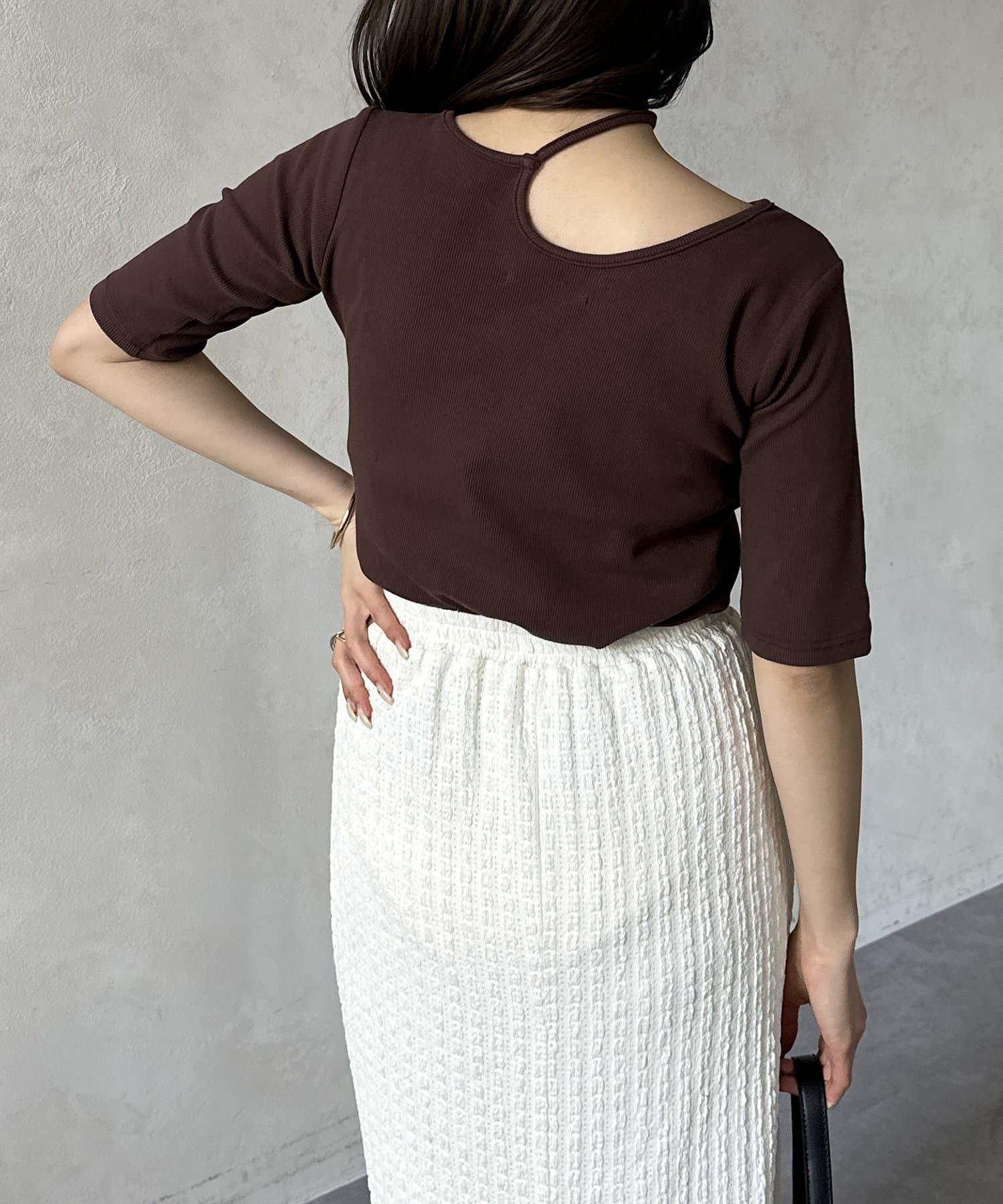 變形露肩領5分袖條紋針織套頭衫