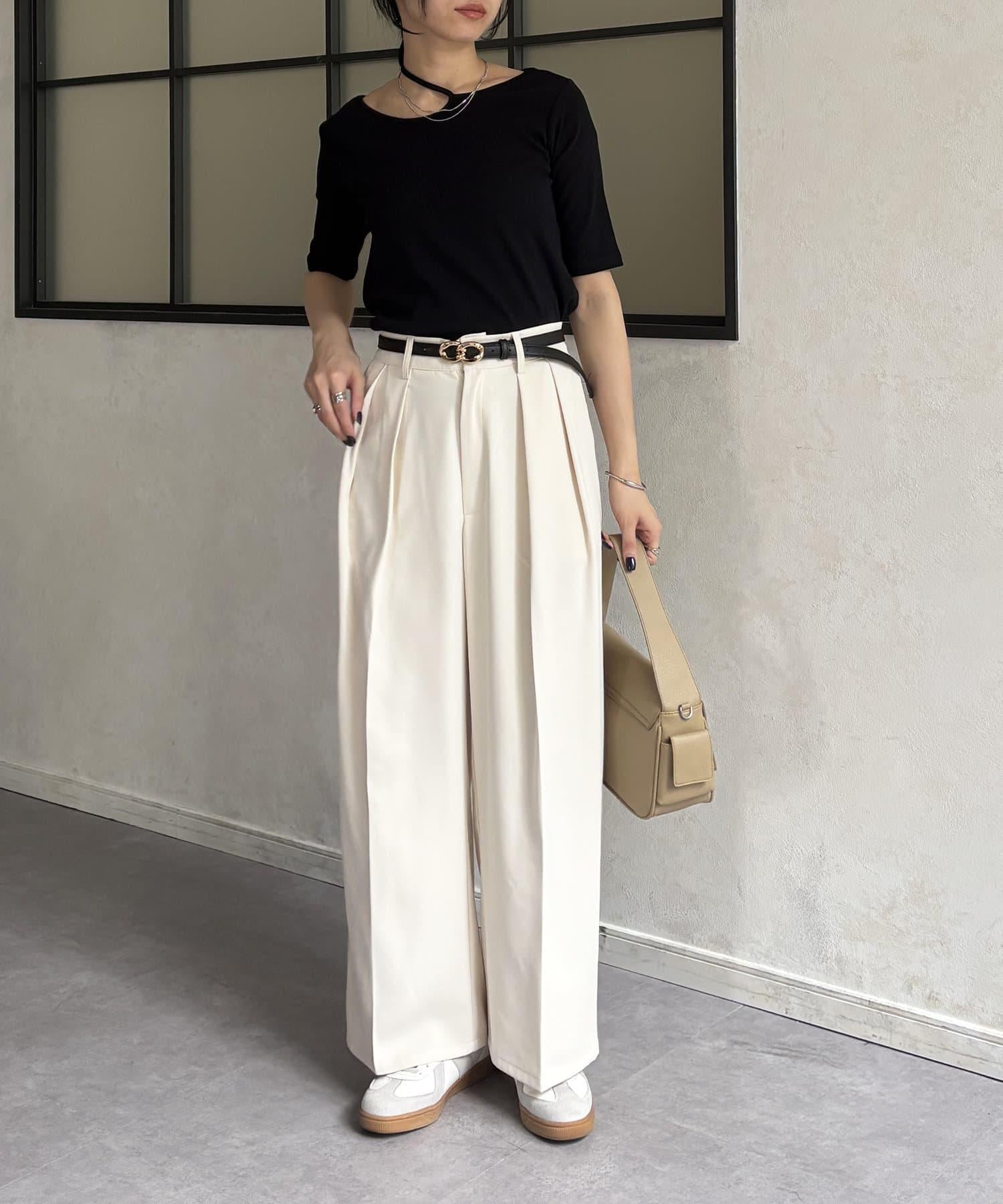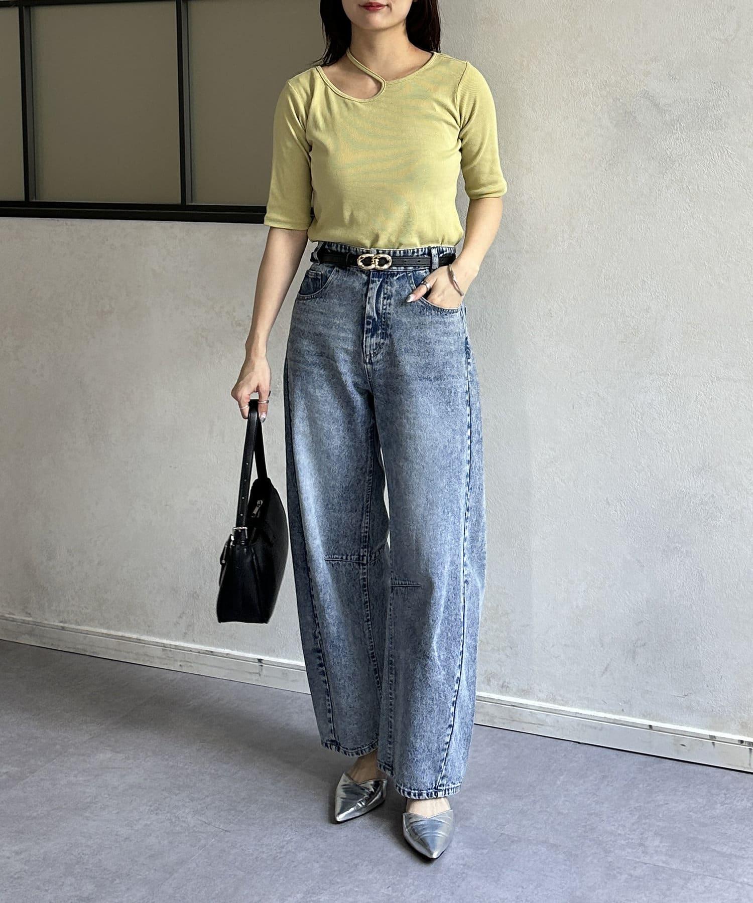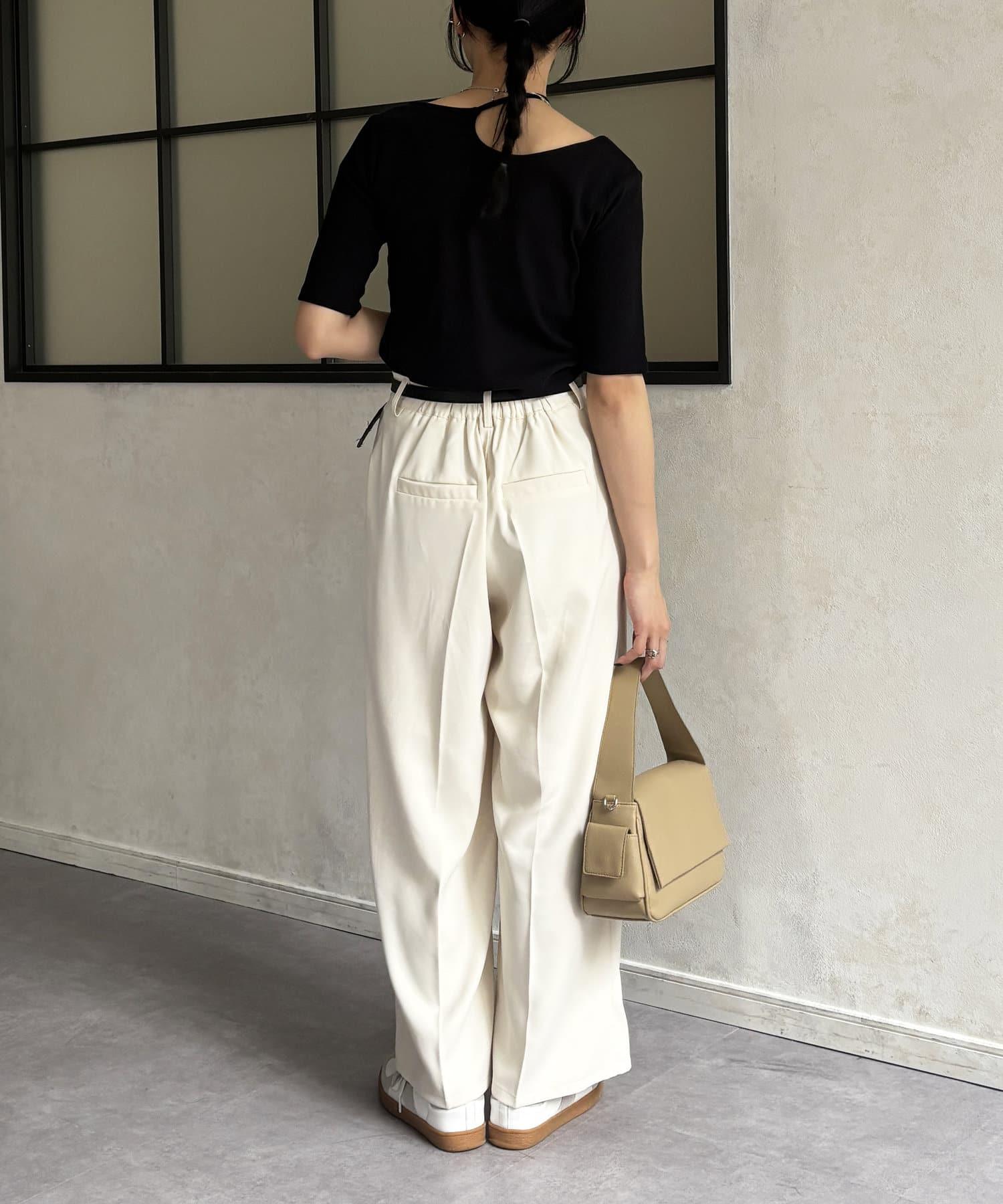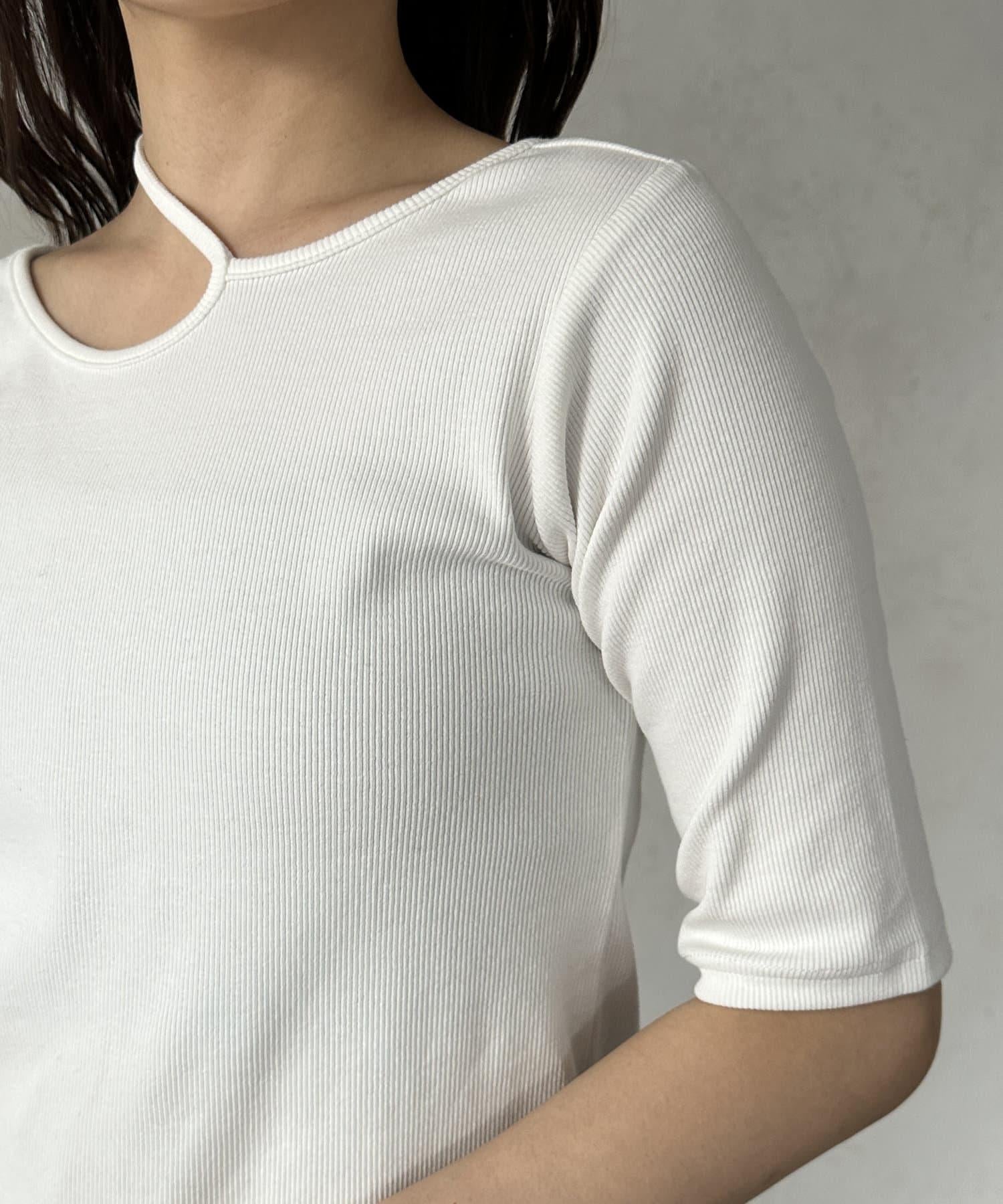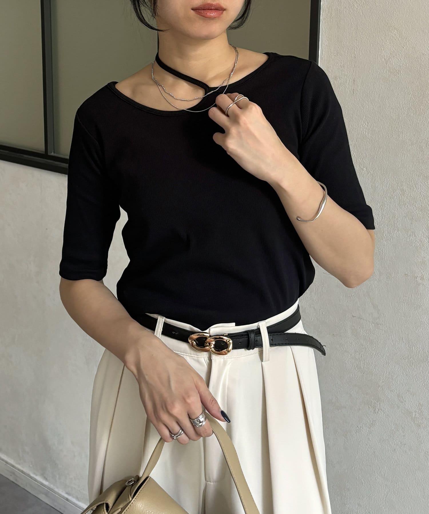 變形露肩領5分袖條紋針織套頭衫
