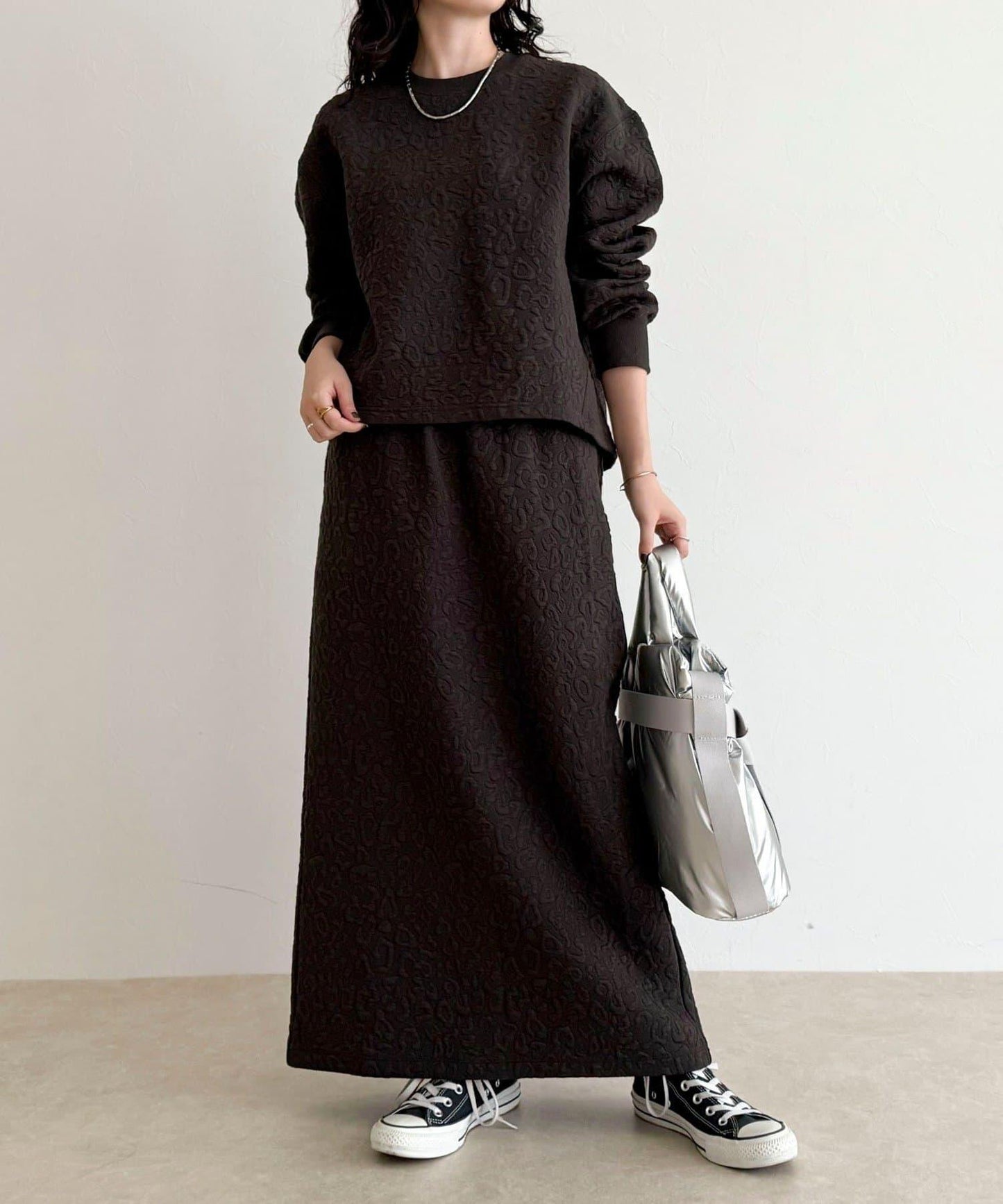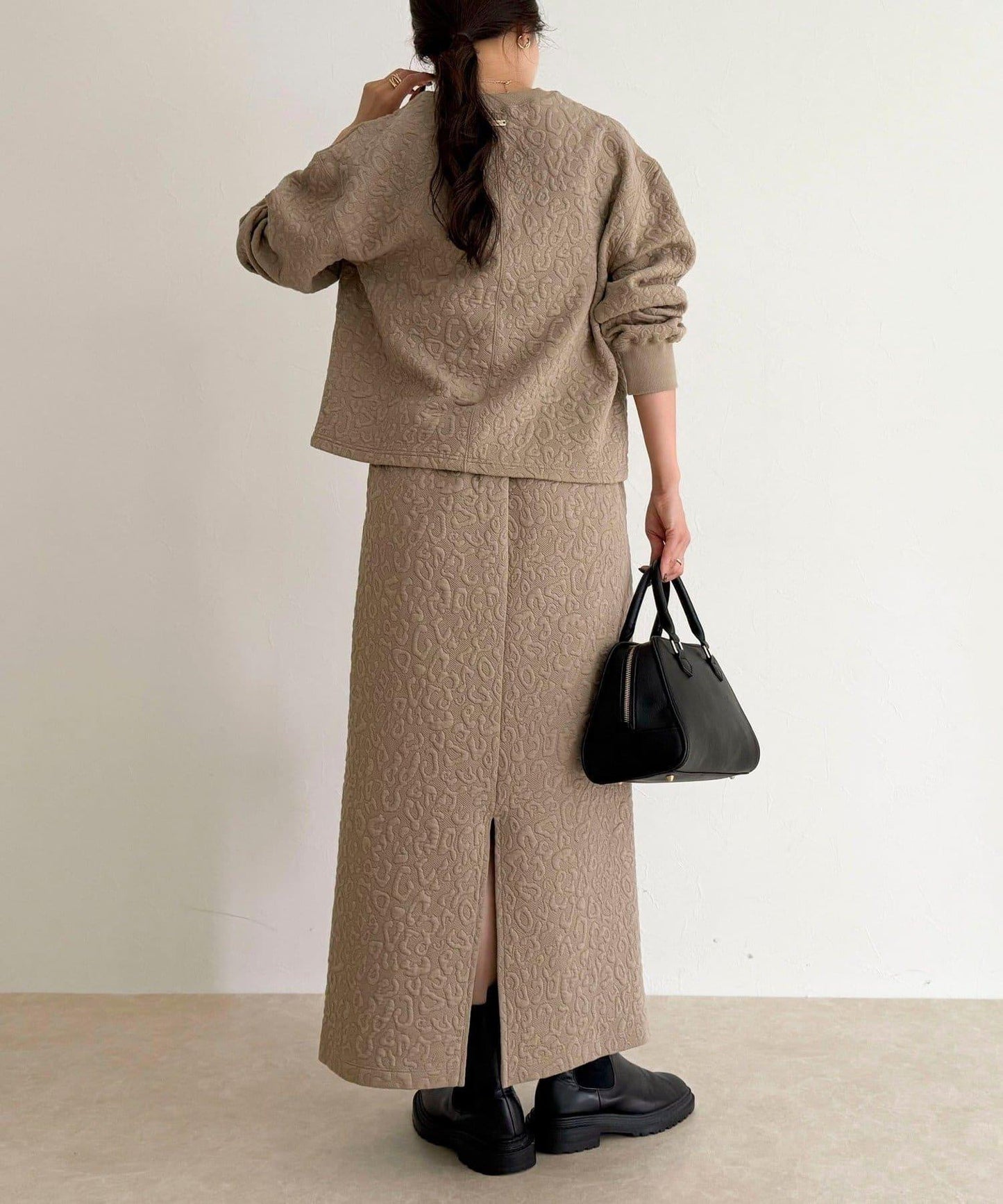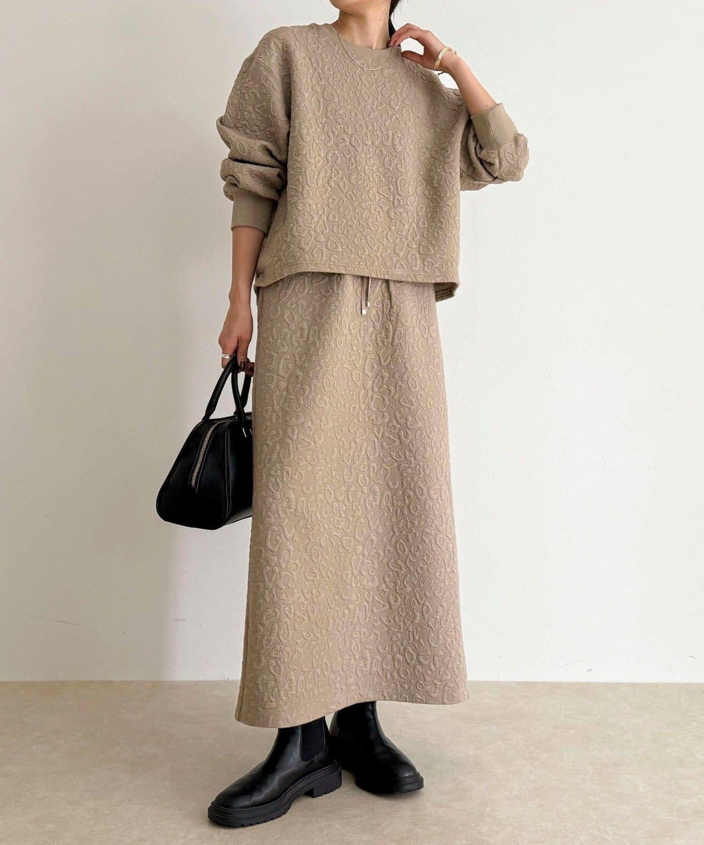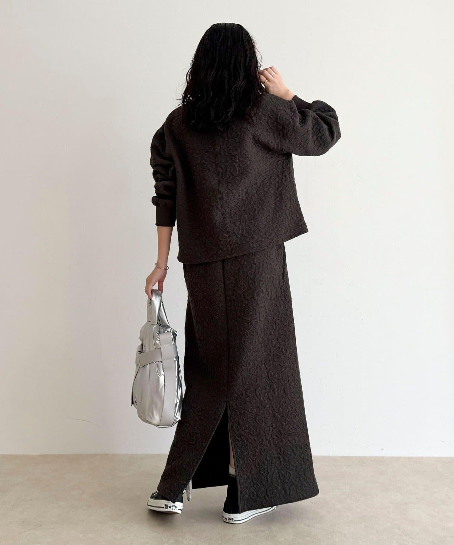 與同樣材質的裙子搭配成套穿著,打造連體造型。