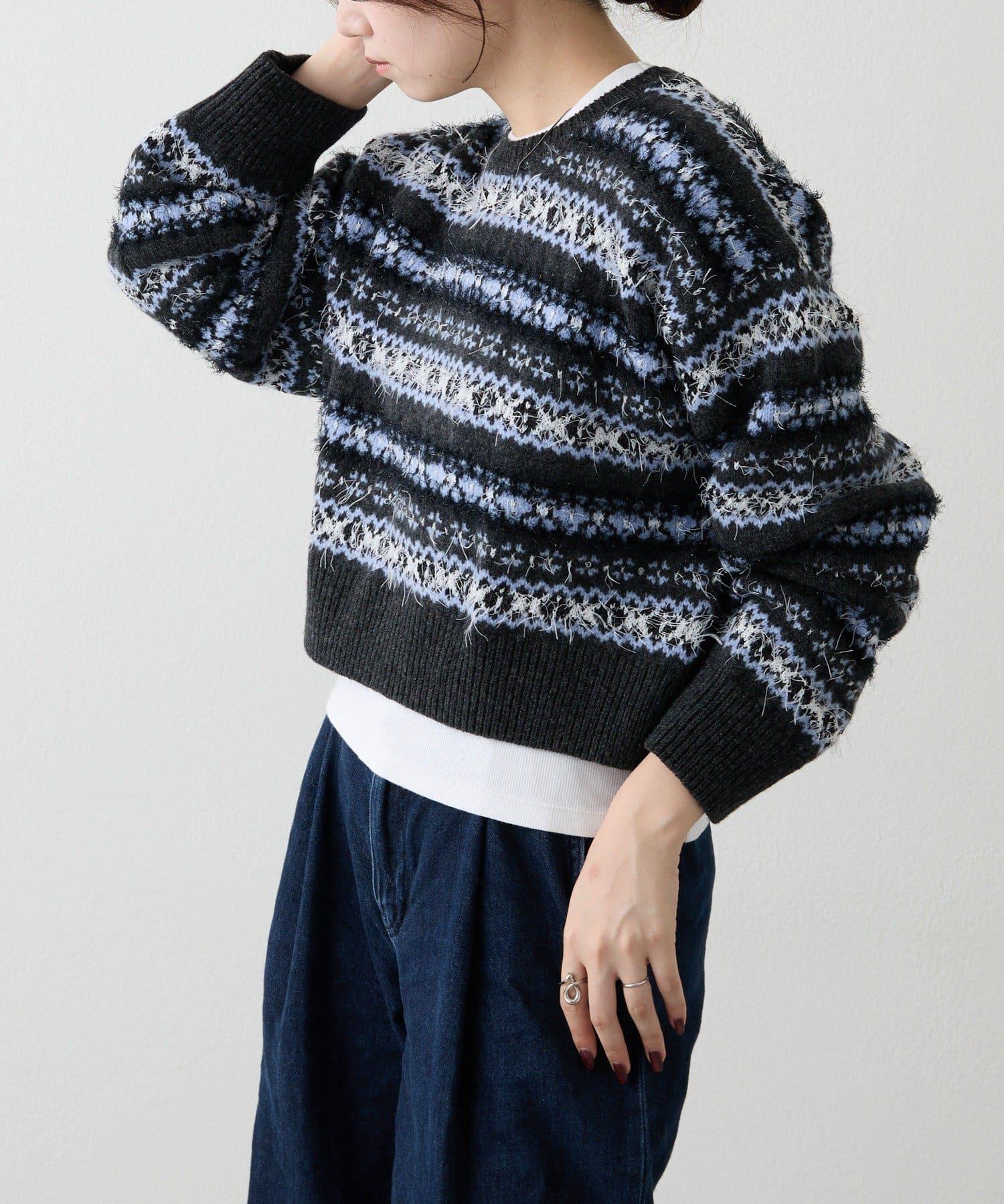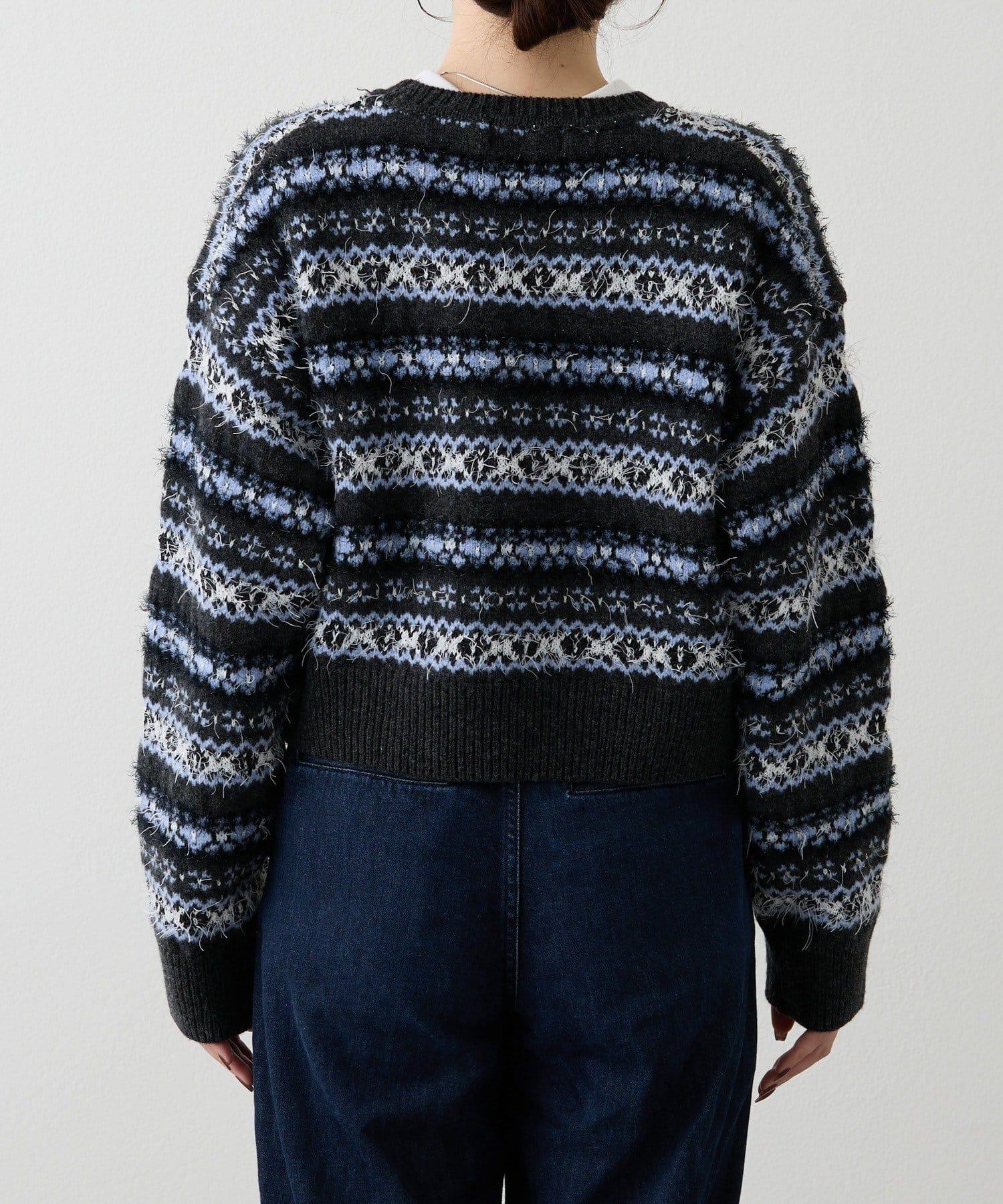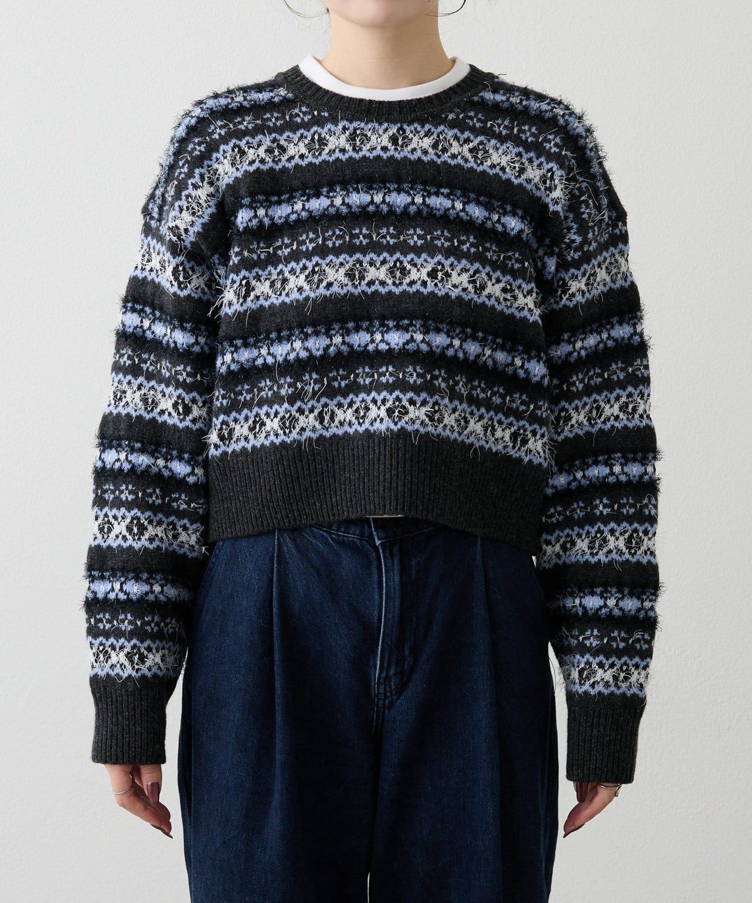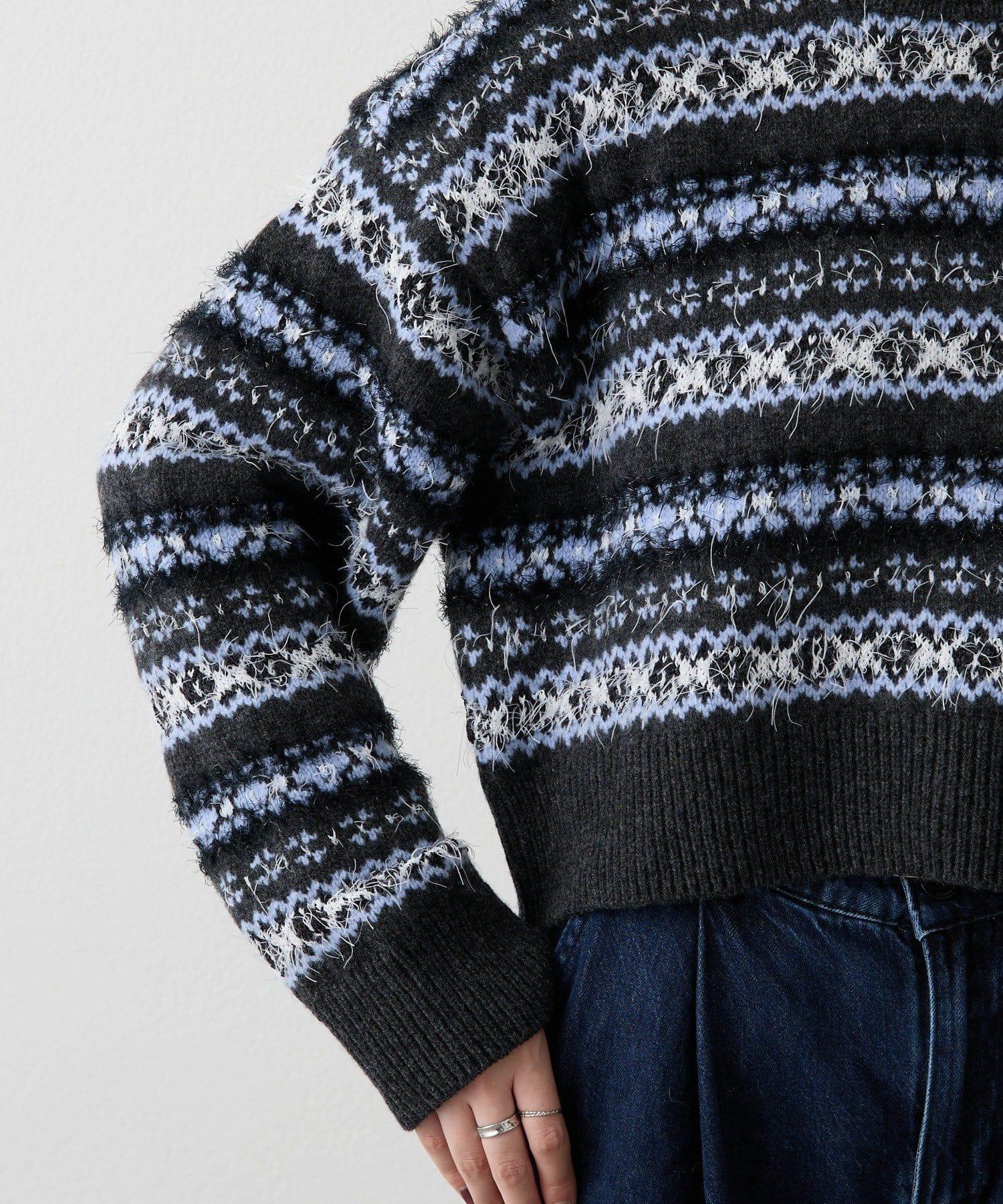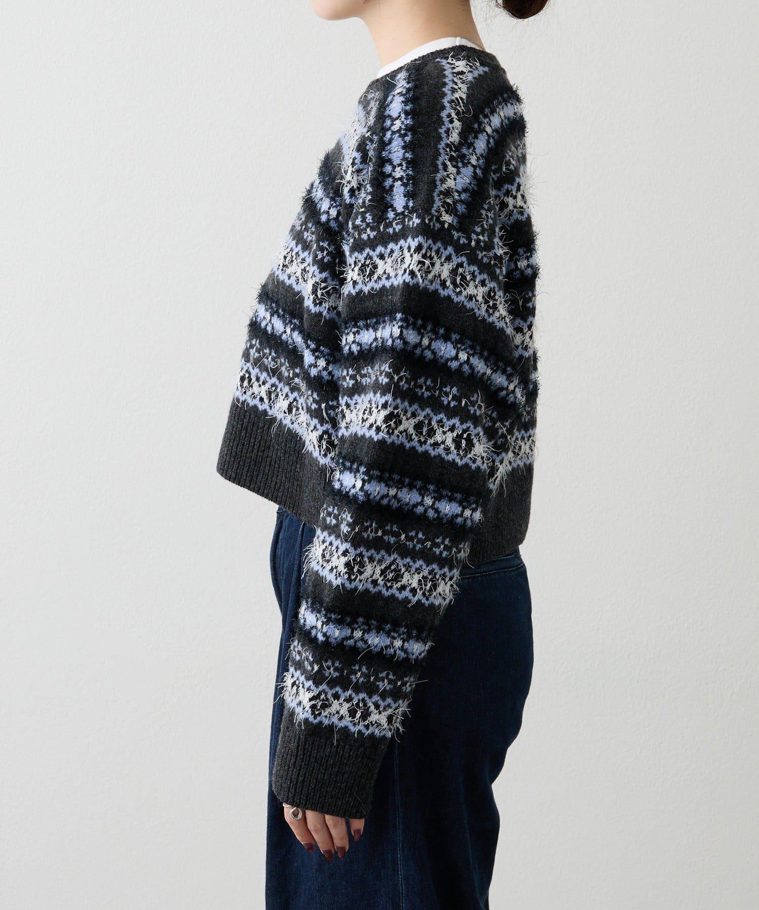 採用費爾島圖案的短款針織衫,以美利奴羊毛為基料,結合羽毛紗和日本紙紗等不同材料編織而成。
