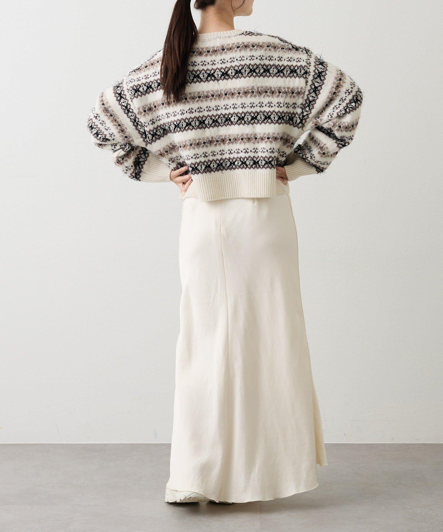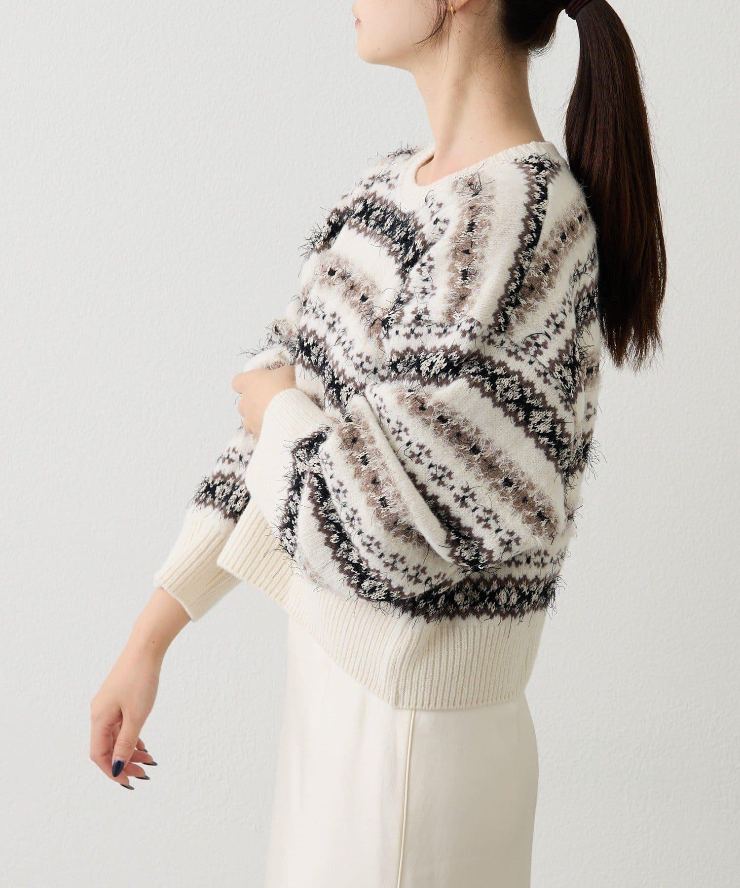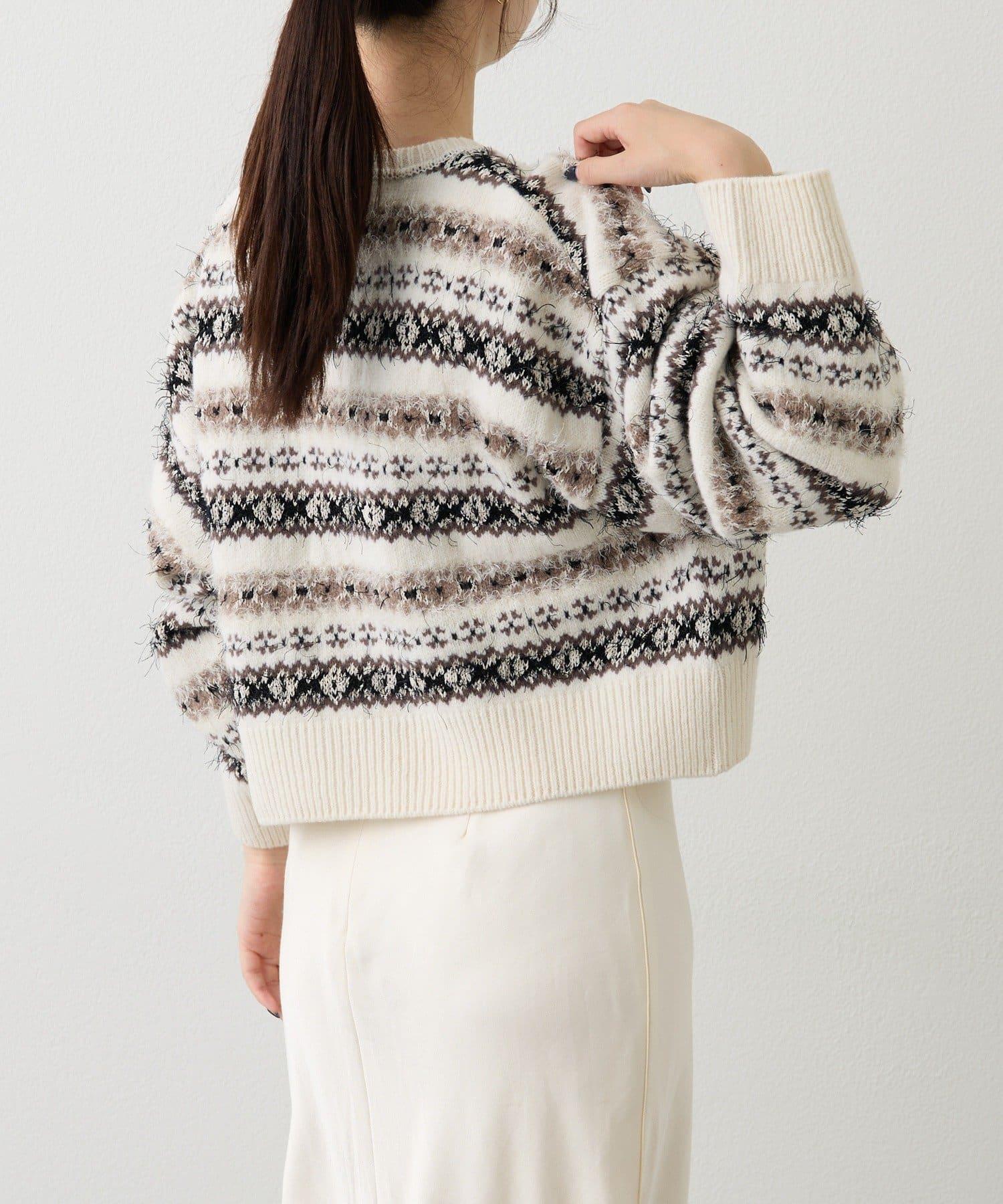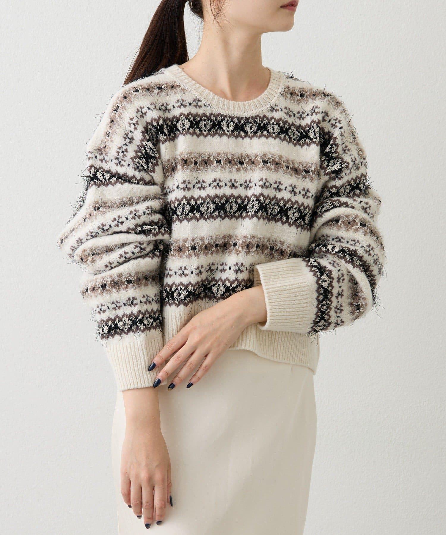 採用費爾島圖案的短款針織衫,以美利奴羊毛為基料,結合羽毛紗和日本紙紗等不同材料編織而成。