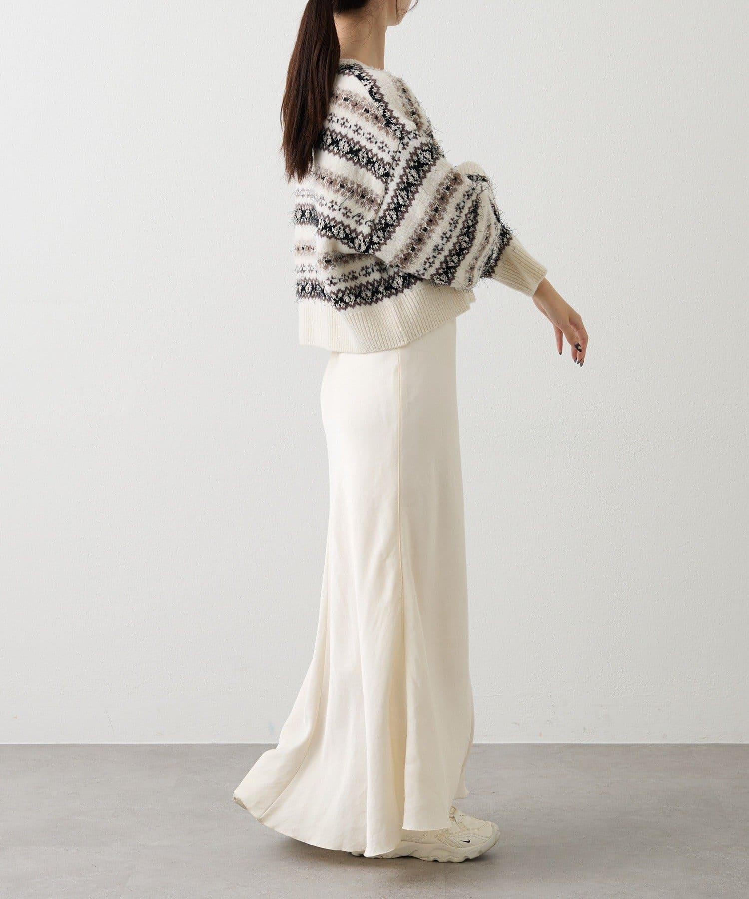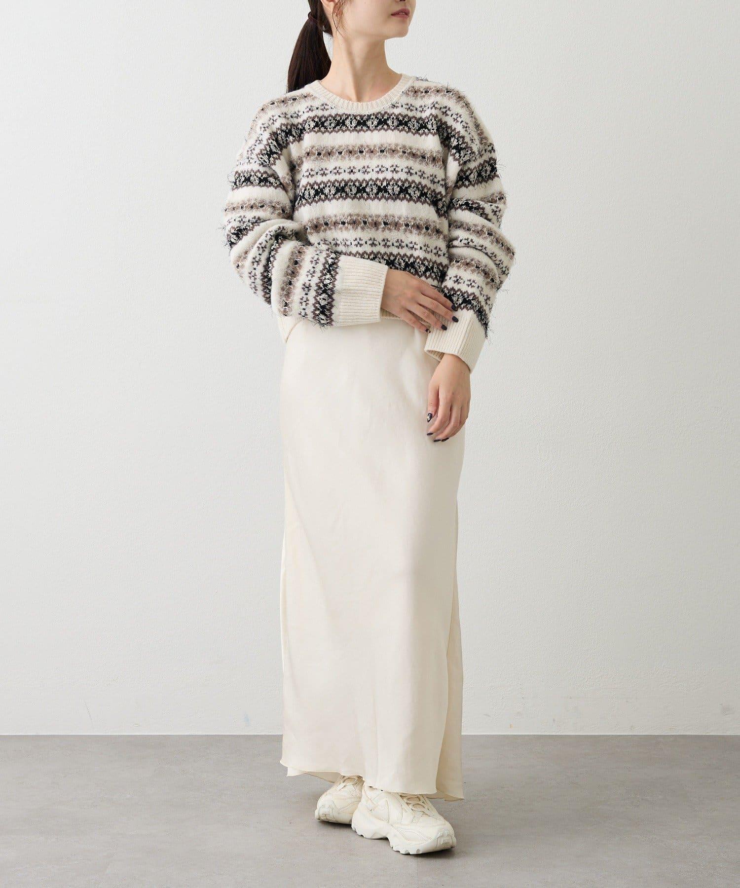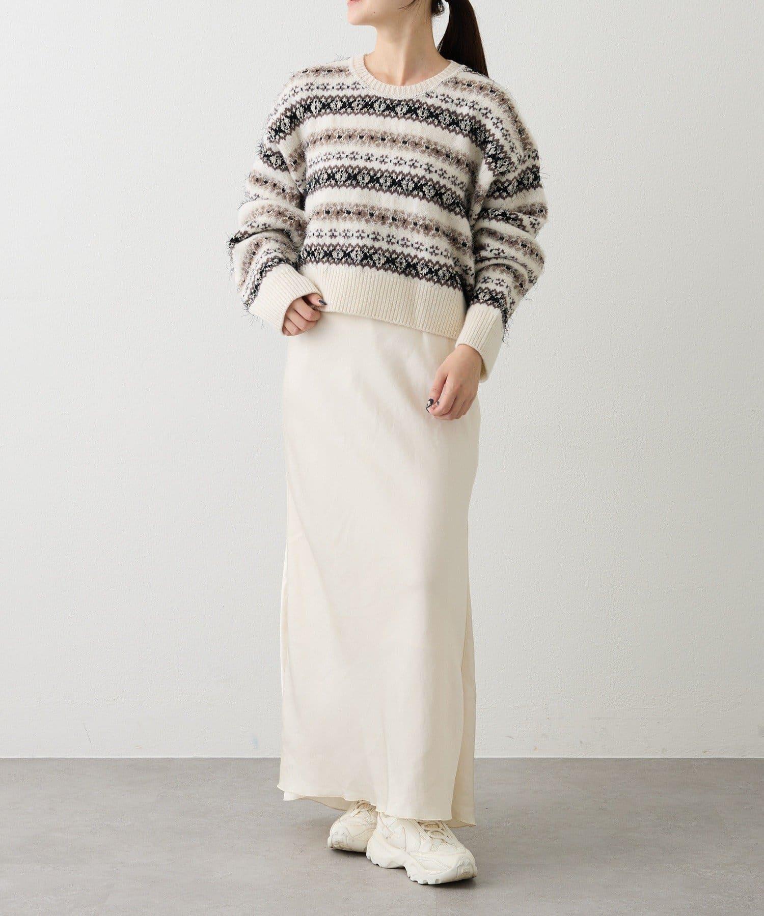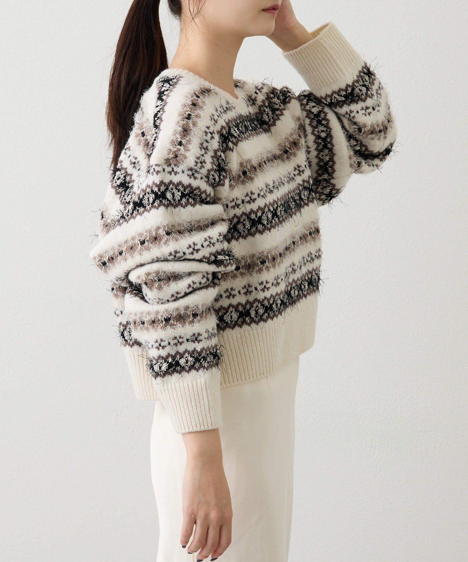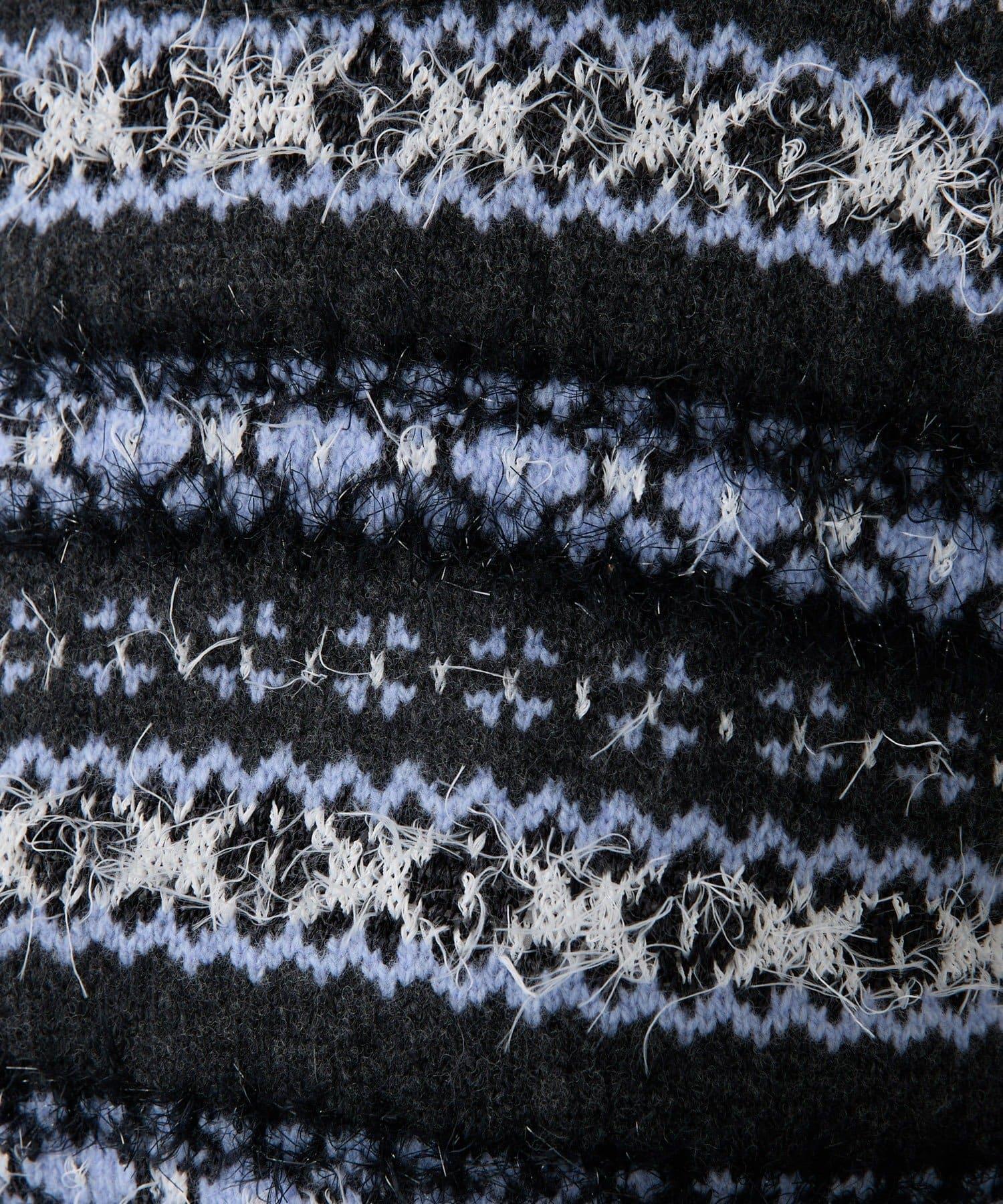 採用費爾島圖案的短款針織衫,以美利奴羊毛為基料,結合羽毛紗和日本紙紗等不同材料編織而成。