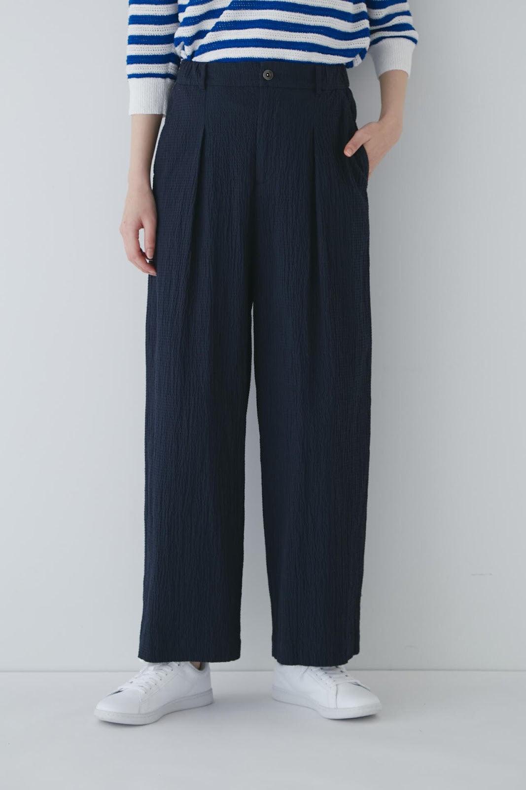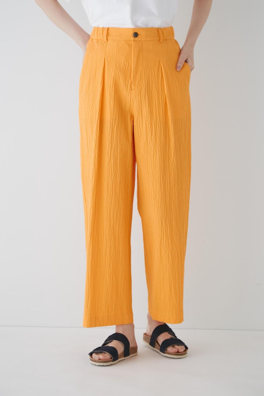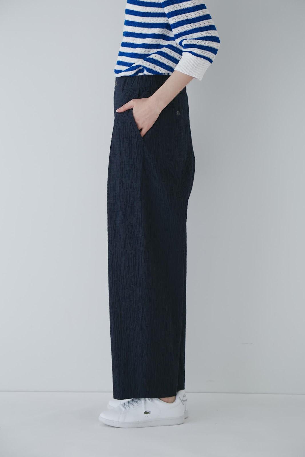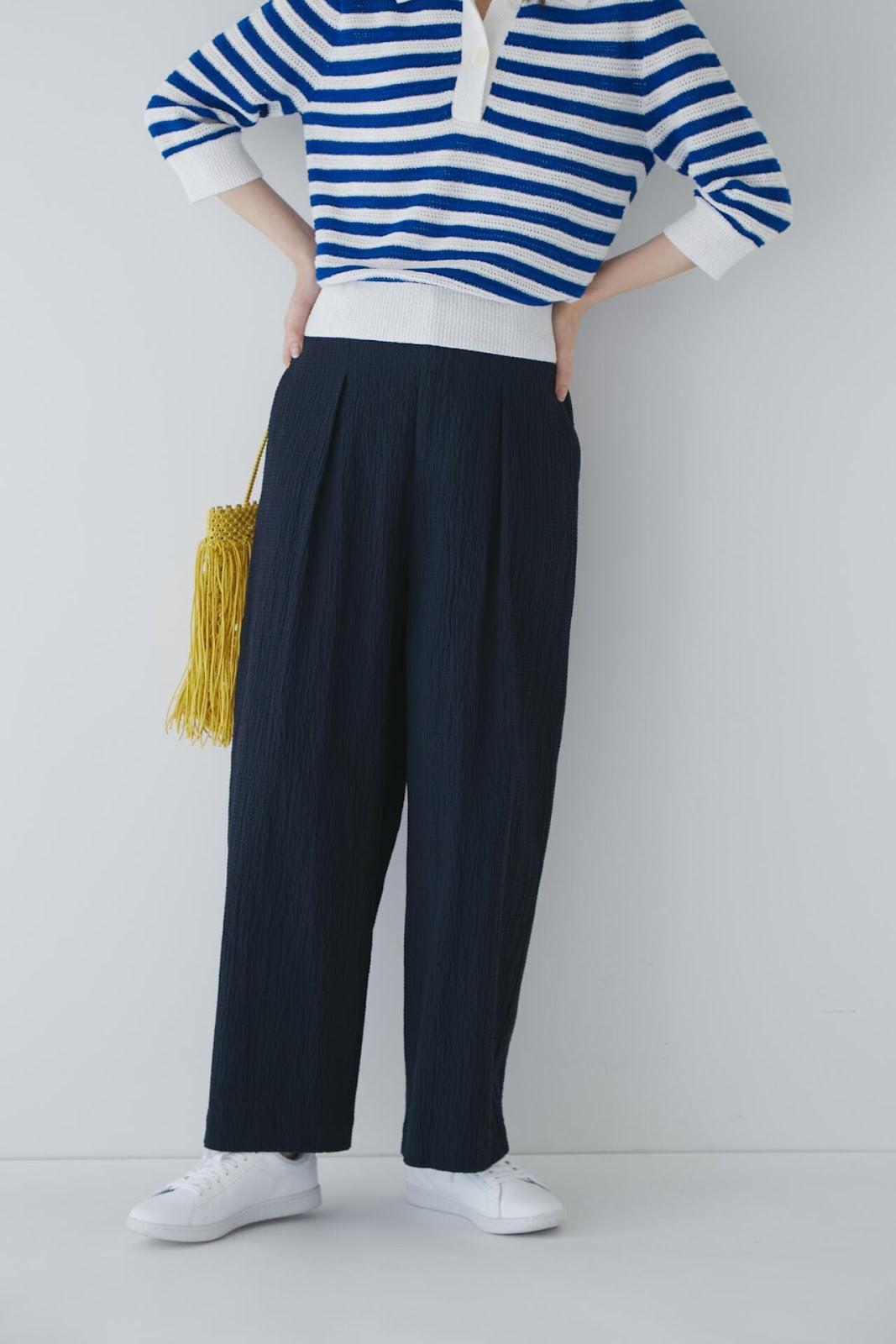 輕鬆長褲,輕質面料,打造輕鬆夏日造型 [設計特色] 這款輕鬆長褲的腰部有鬆緊帶,還可以用腰帶的內置繫帶收緊腰部。寬鬆的錐形剪裁是夏日休閒的理想之選。採用波紋面料製成,給人涼爽的感覺,穿著舒適。波紋是一種將面料局部強力收縮,形成凹凸紋理的面料。推薦搭配:與同款上衣搭配,營造輕鬆愜意的感覺。搭配簡潔的上衣,會給人一種時尚的感覺,是日常穿著的👍選擇。