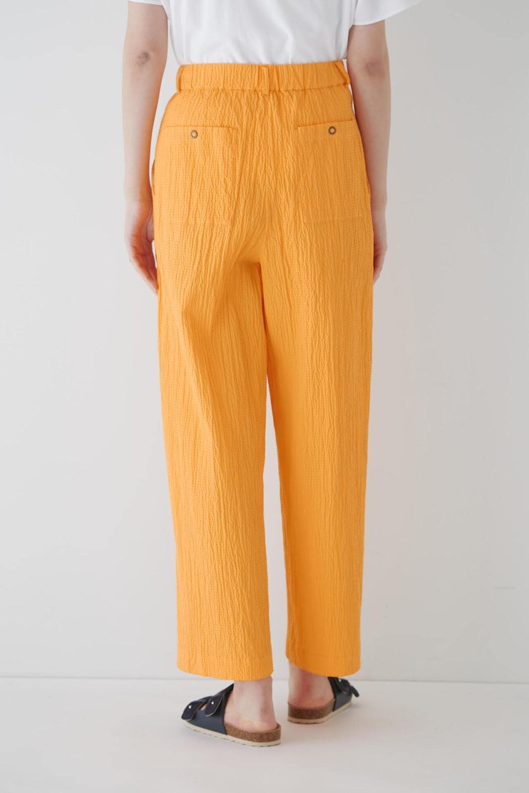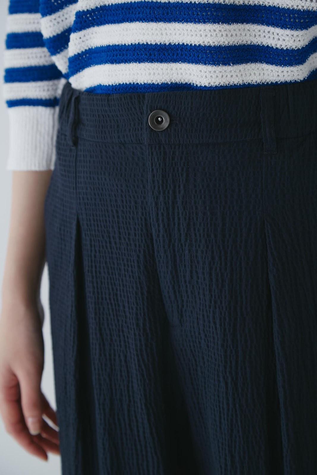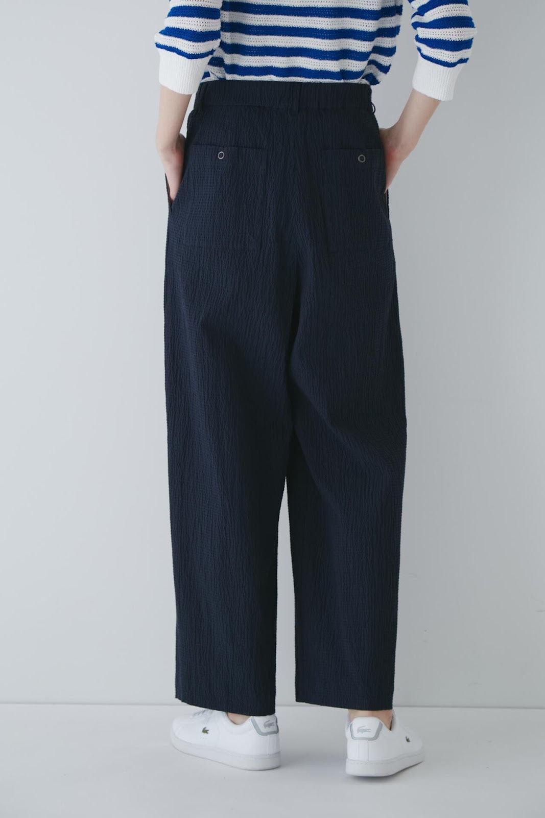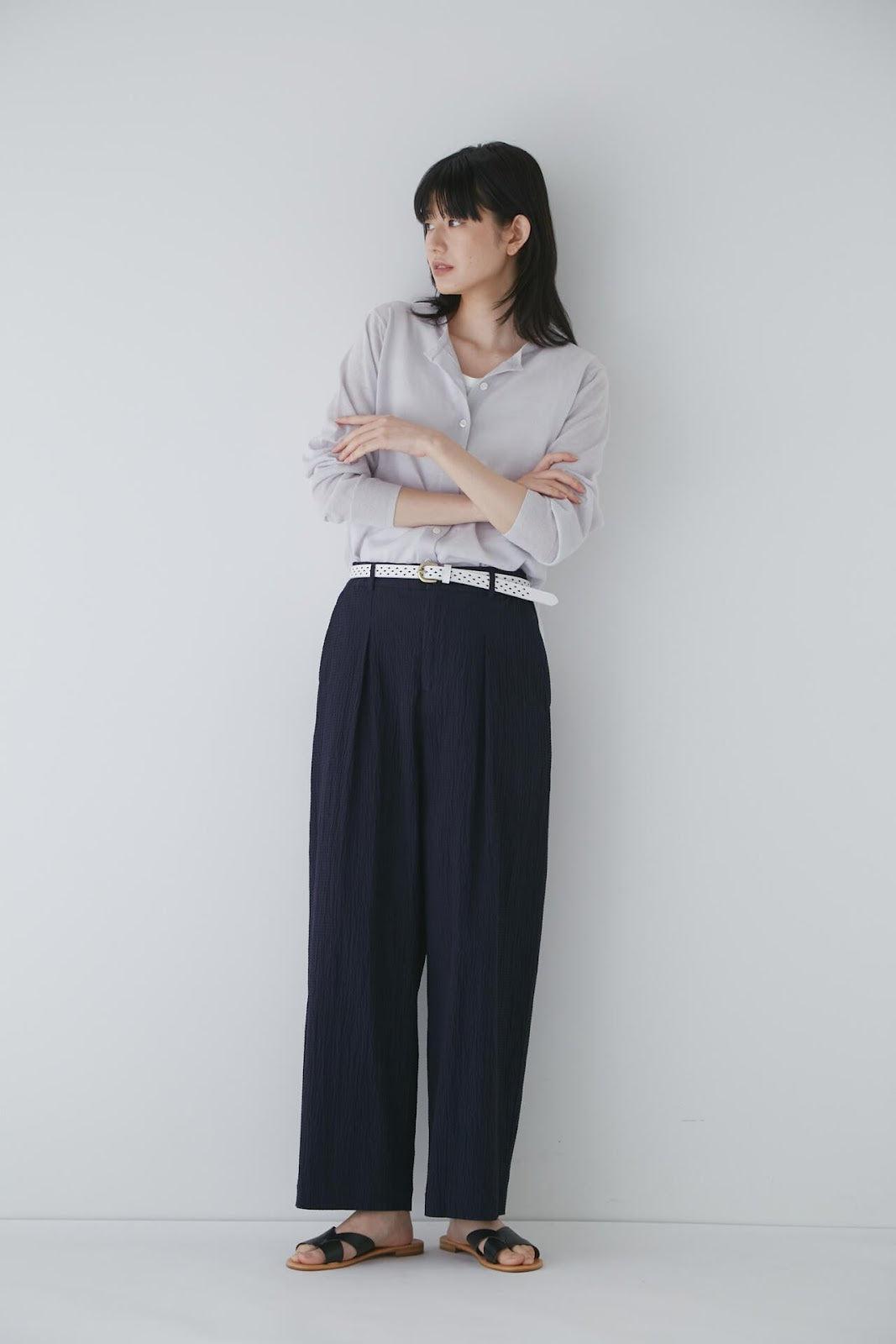輕鬆長褲,輕質面料,打造輕鬆夏日造型 [設計特色] 這款輕鬆長褲的腰部有鬆緊帶,還可以用腰帶的內置繫帶收緊腰部。寬鬆的錐形剪裁是夏日休閒的理想之選。採用波紋面料製成,給人涼爽的感覺,穿著舒適。波紋是一種將面料局部強力收縮,形成凹凸紋理的面料。推薦搭配:與同款上衣搭配,營造輕鬆愜意的感覺。搭配簡潔的上衣,會給人一種時尚的感覺,是日常穿著的👍選擇。