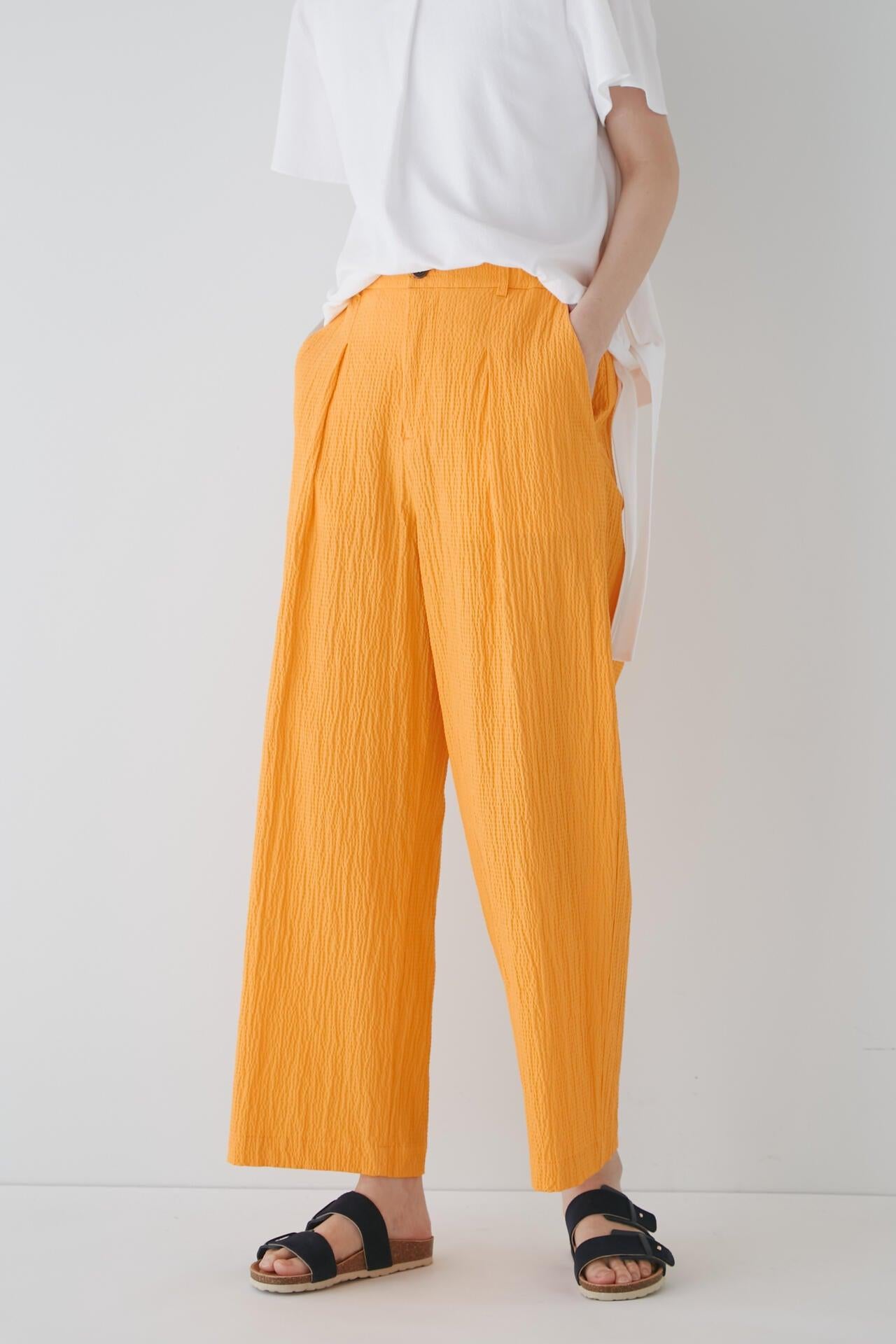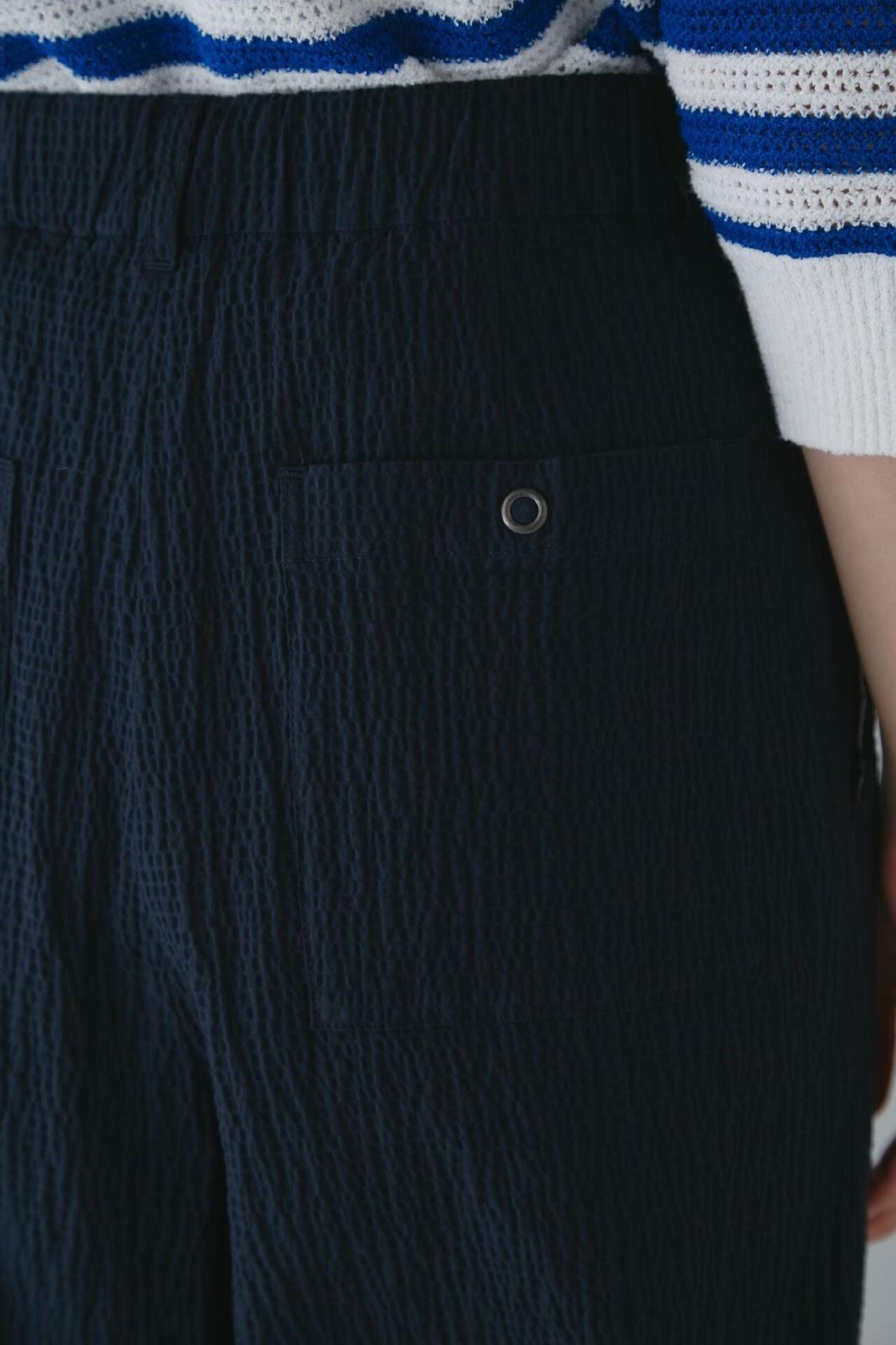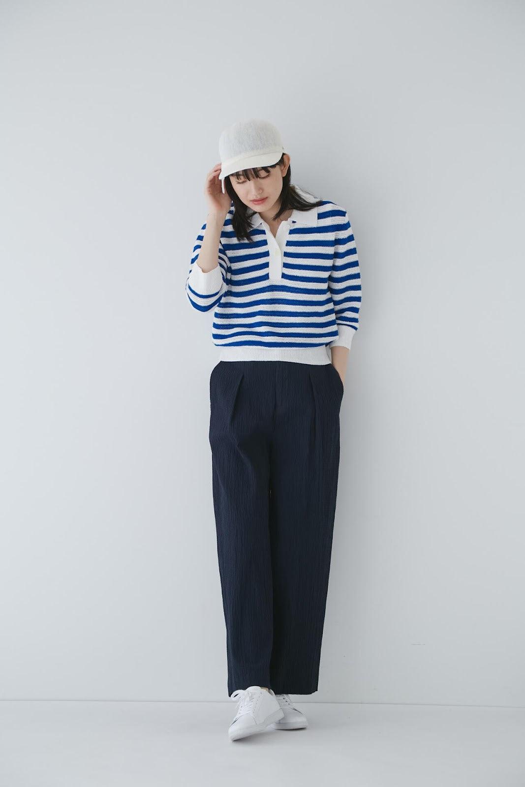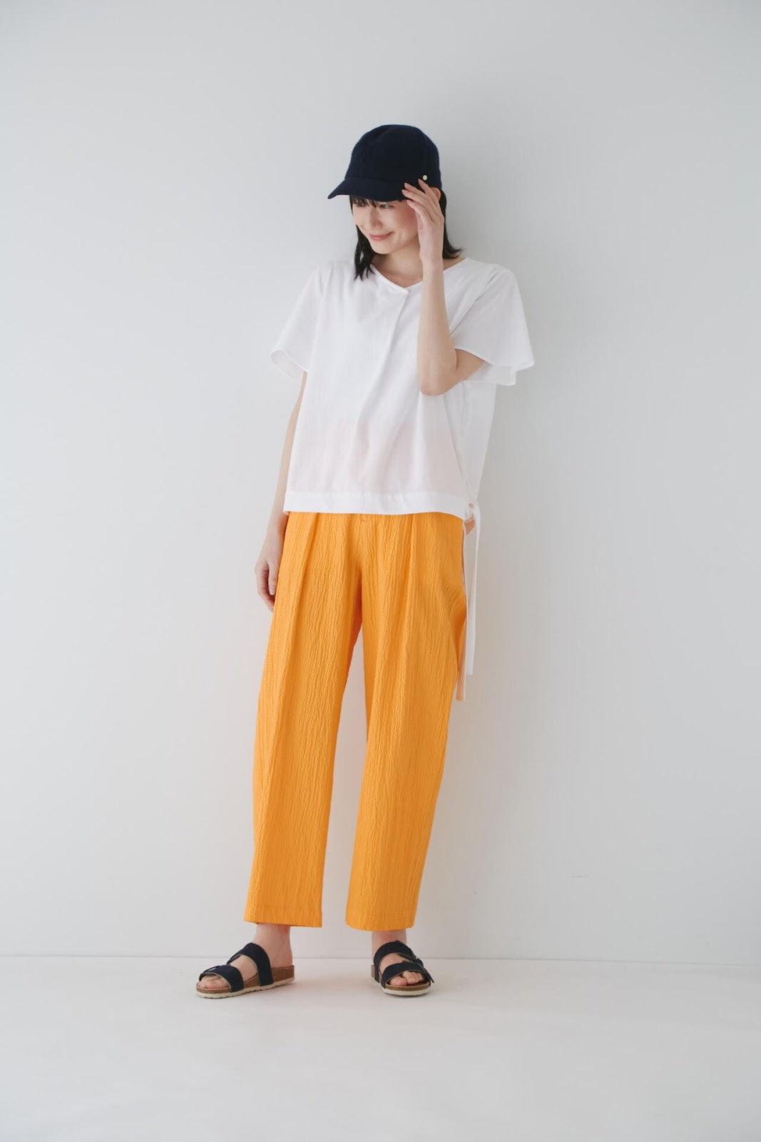 輕鬆長褲,輕質面料,打造輕鬆夏日造型 [設計特色] 這款輕鬆長褲的腰部有鬆緊帶,還可以用腰帶的內置繫帶收緊腰部。寬鬆的錐形剪裁是夏日休閒的理想之選。採用波紋面料製成,給人涼爽的感覺,穿著舒適。波紋是一種將面料局部強力收縮,形成凹凸紋理的面料。推薦搭配:與同款上衣搭配,營造輕鬆愜意的感覺。搭配簡潔的上衣,會給人一種時尚的感覺,是日常穿著的👍選擇。