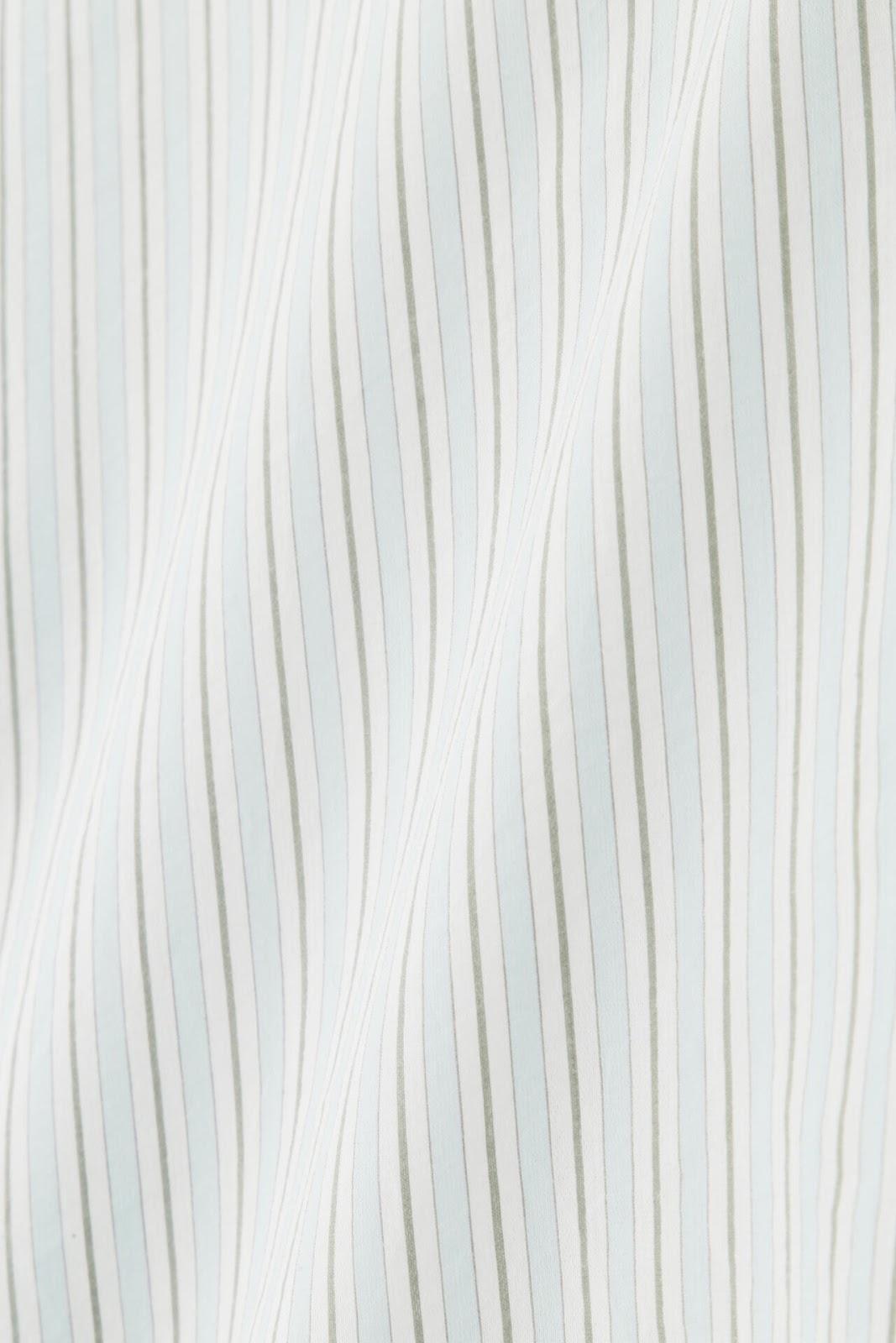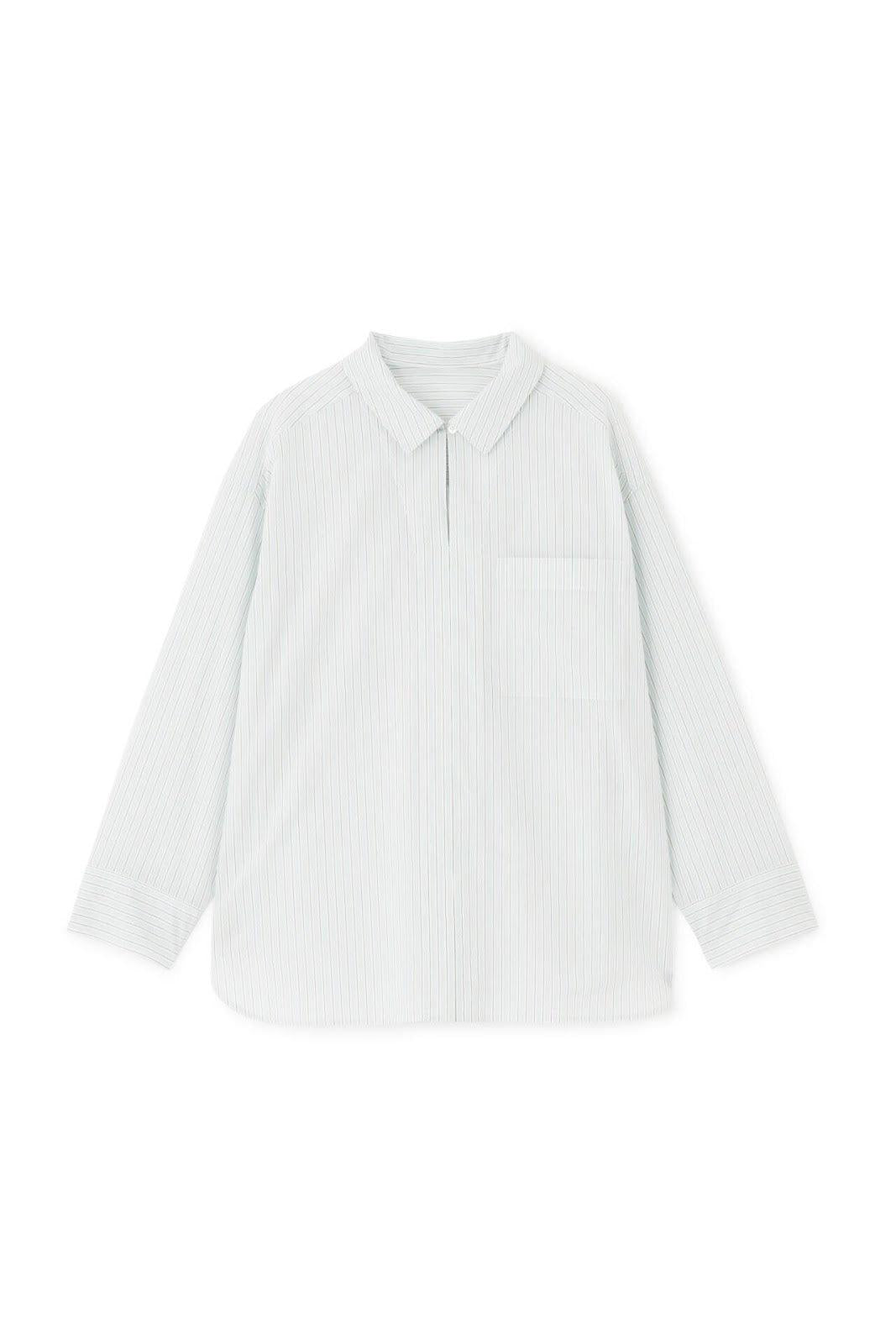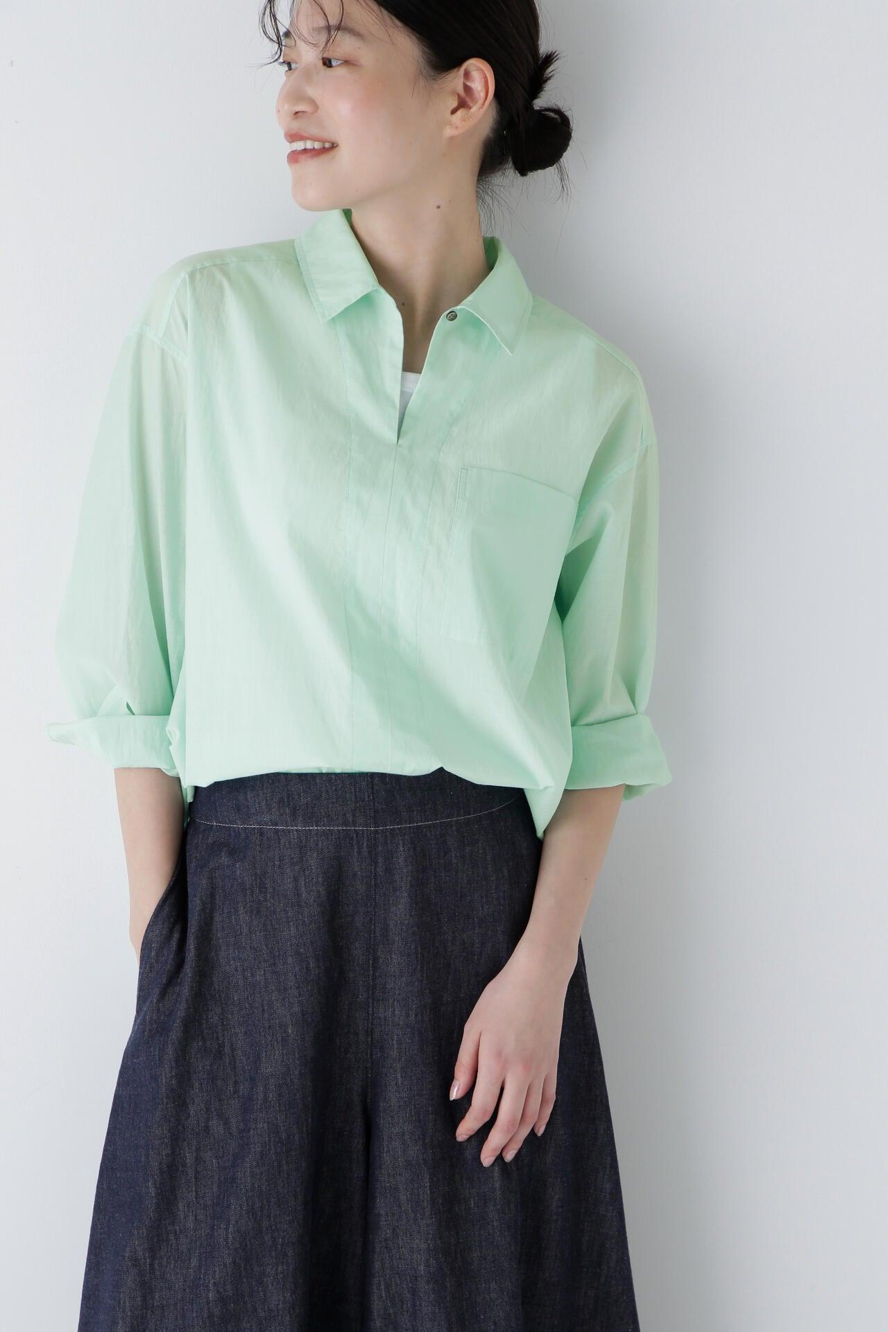 清爽寬鬆的船長襯衫 [設計要點] 這款套頭衫採用了類似船長襯衫的方形剪裁。袖口可通過袖釦調節大小。面料為棉尼龍面料,手感輕盈飄逸,具有襯衫的彈性。有三種顏色可供選擇:藍色條紋、薄荷綠素色和卡其色素色。建議搭配】建議搭配牛仔褲等休閒下裝。也可與同材質的長褲搭配作為套裝穿著。