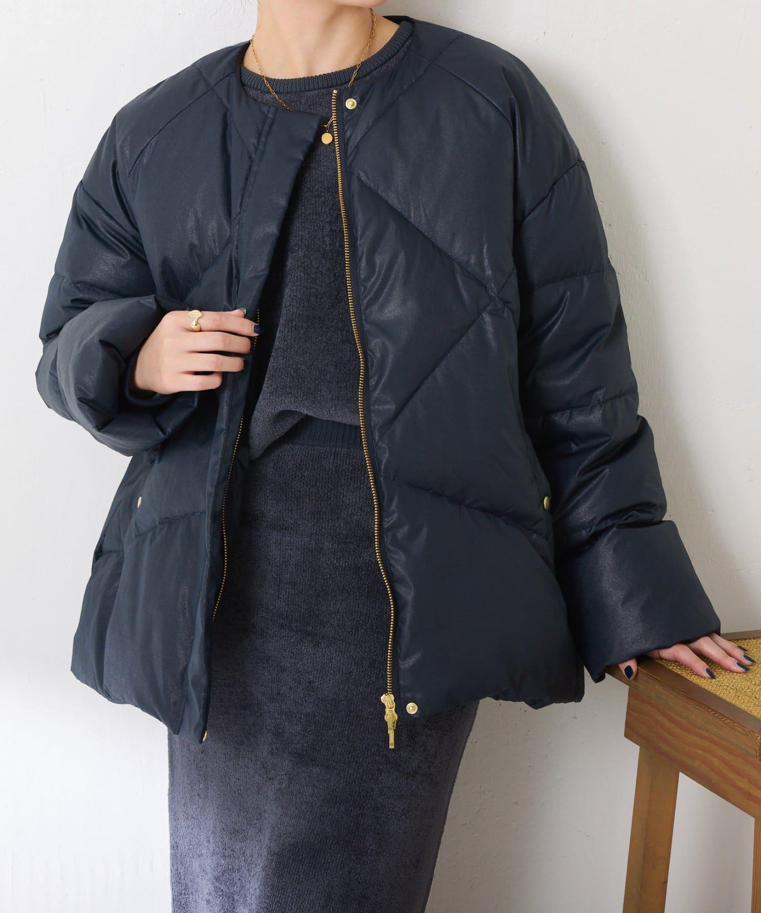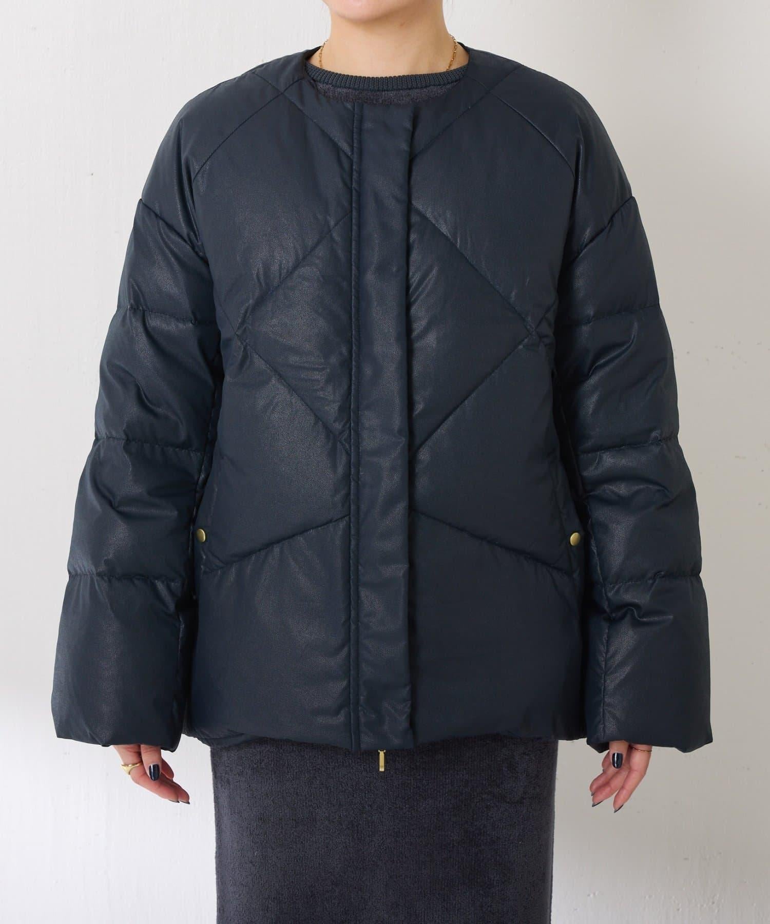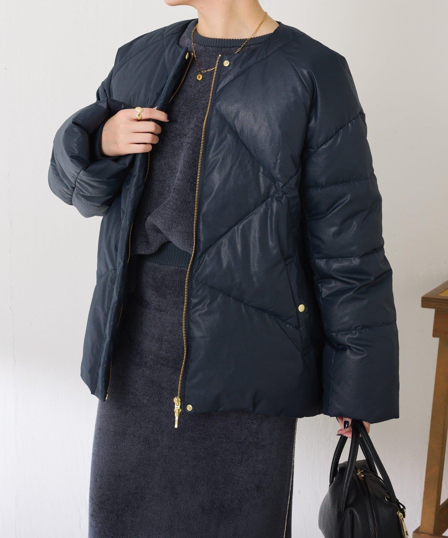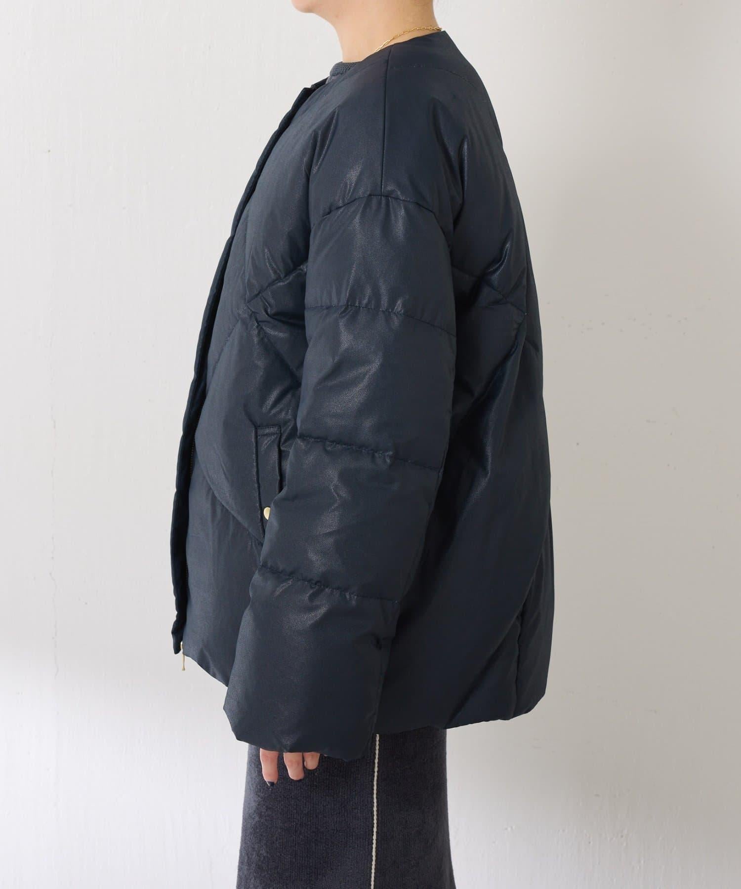 這款無領羽絨服採用壓花織物,看起來像皮革。啞光質感給人以沉穩的印象。