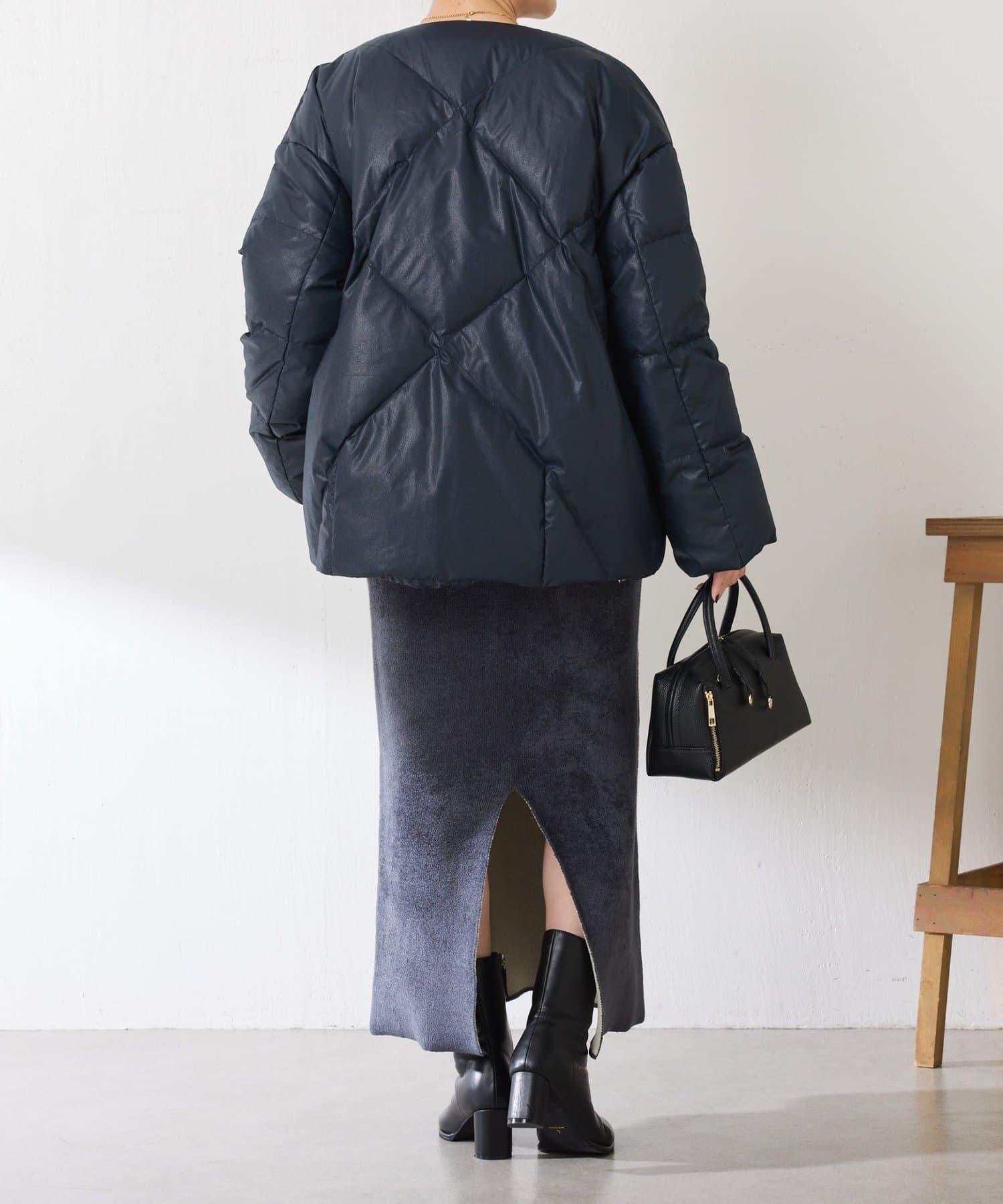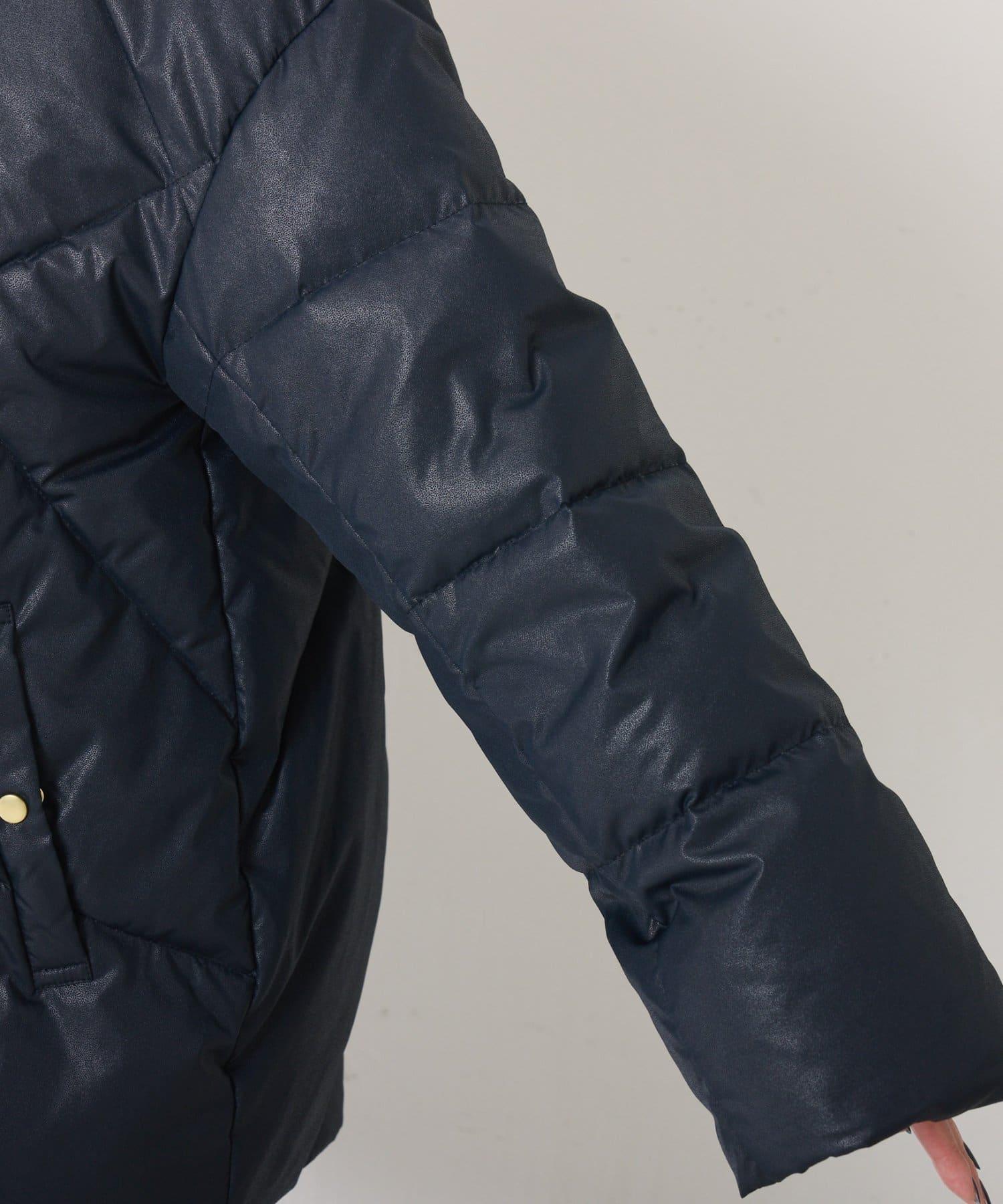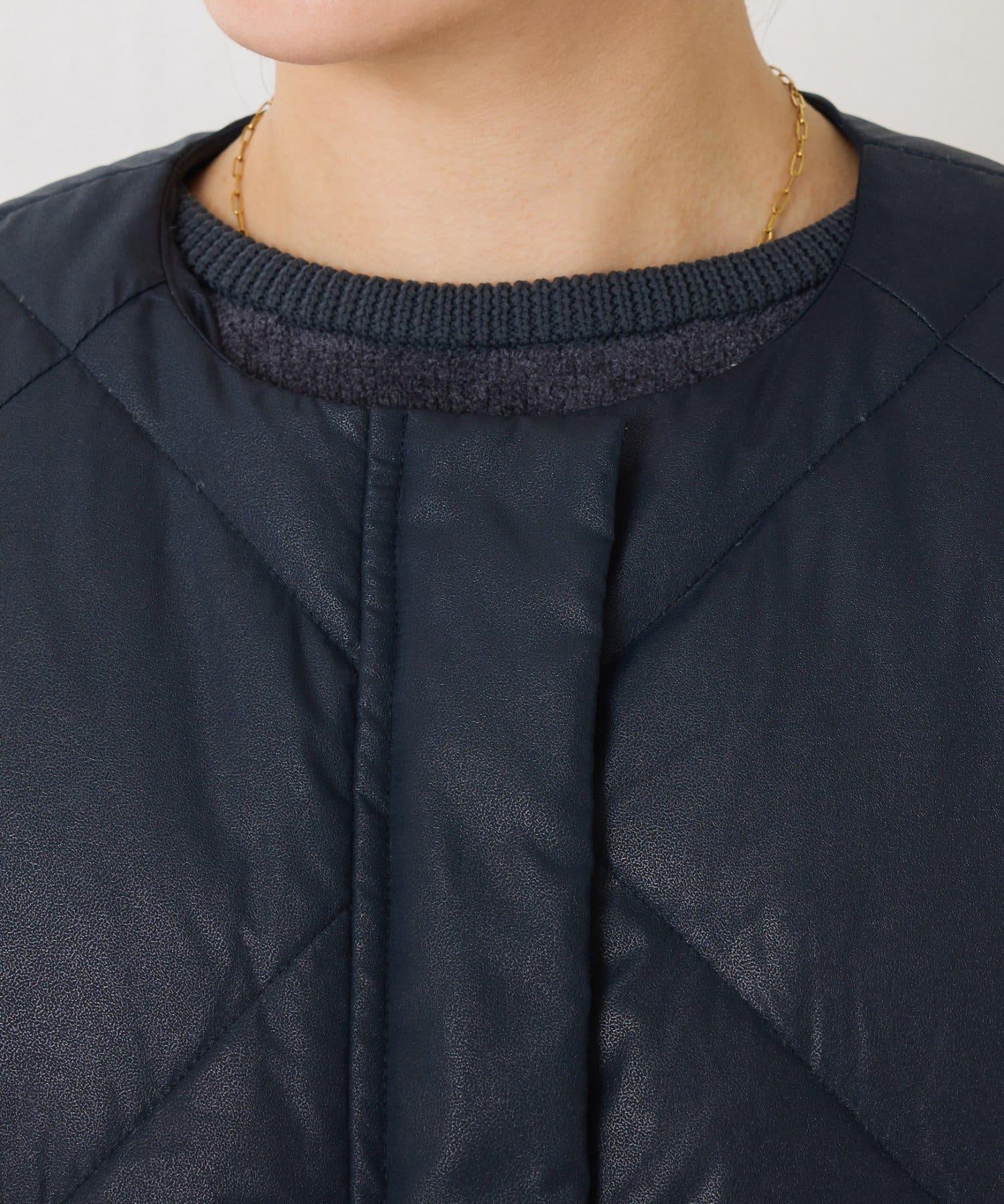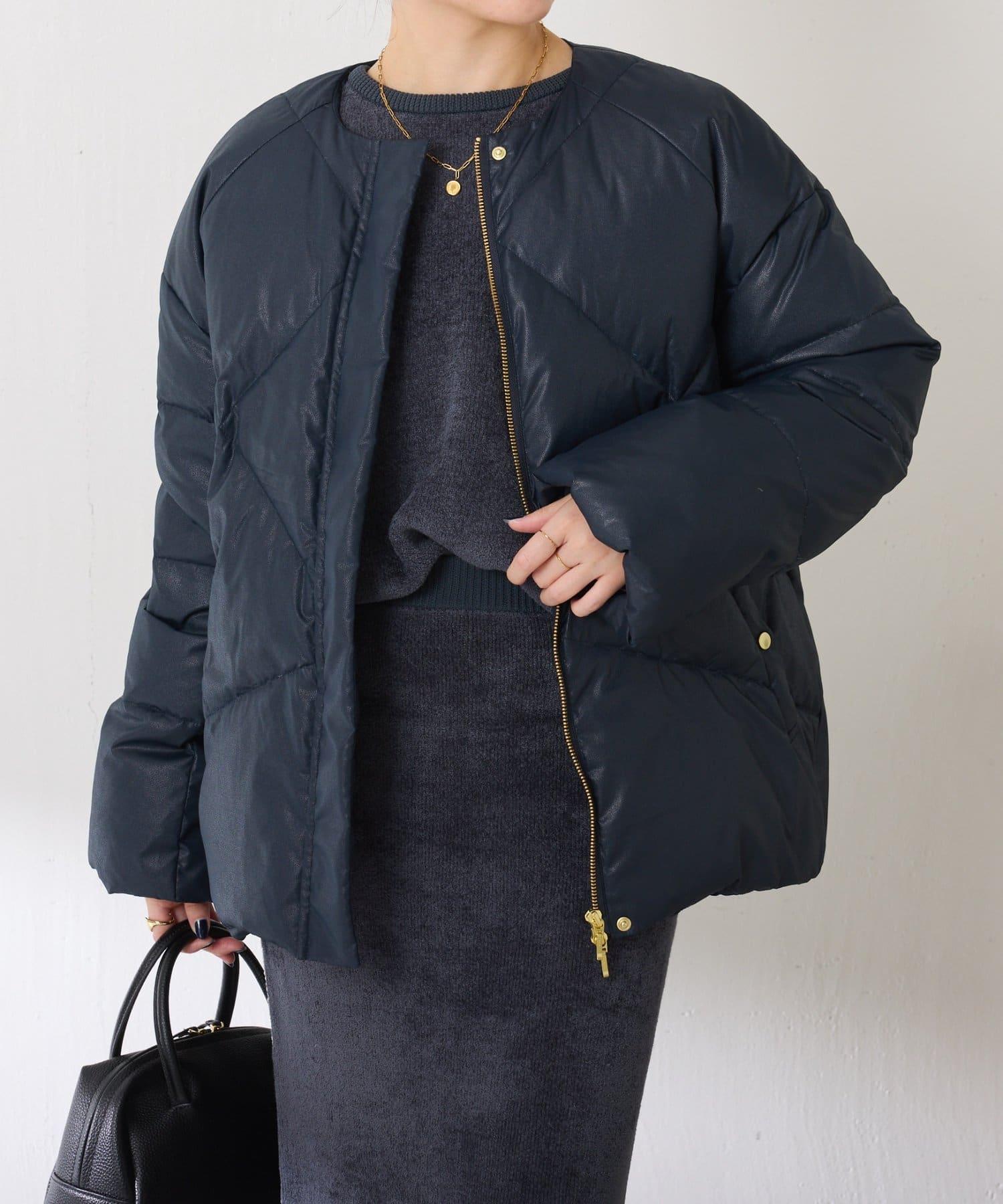 這款無領羽絨服採用壓花織物,看起來像皮革。啞光質感給人以沉穩的印象。