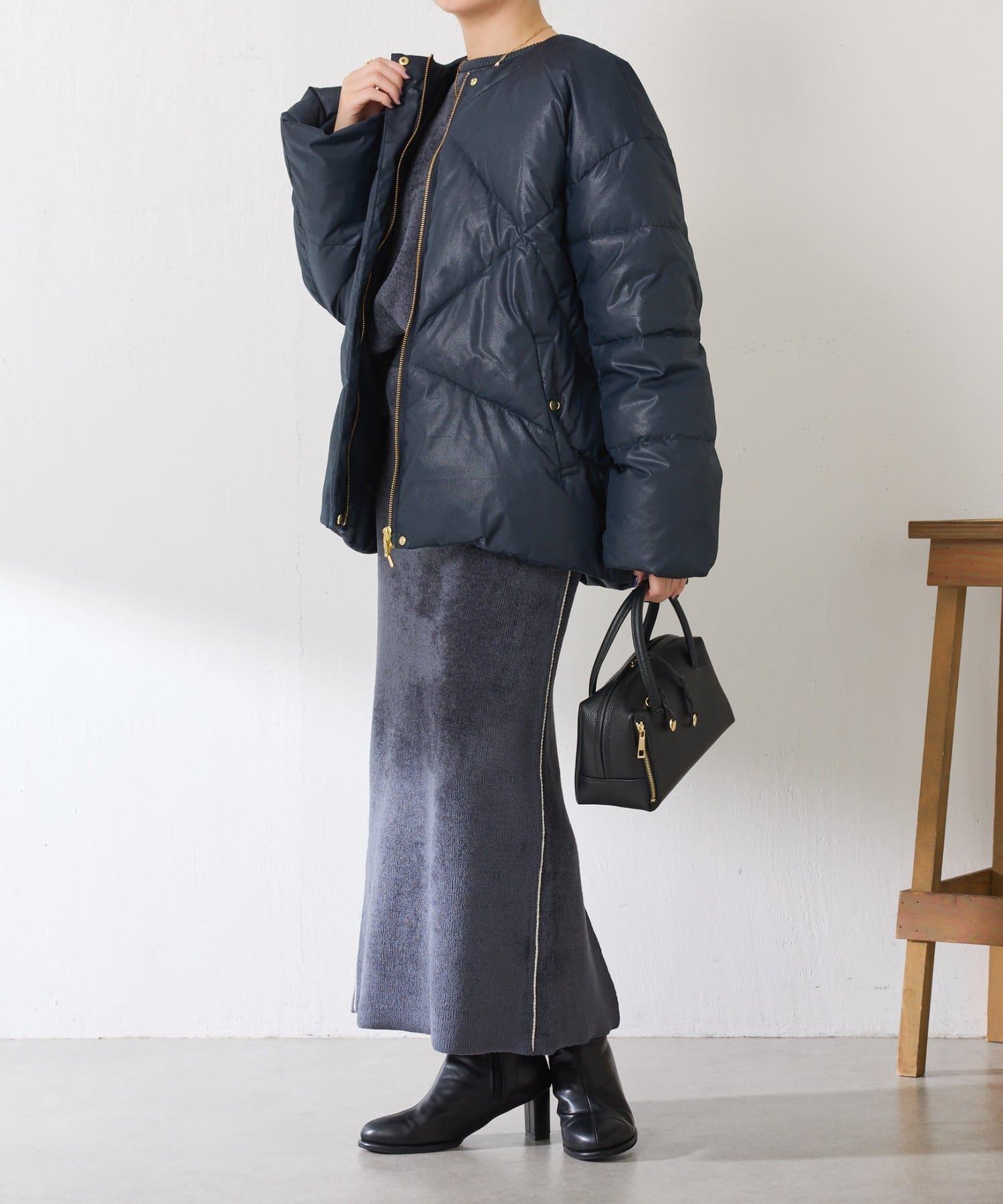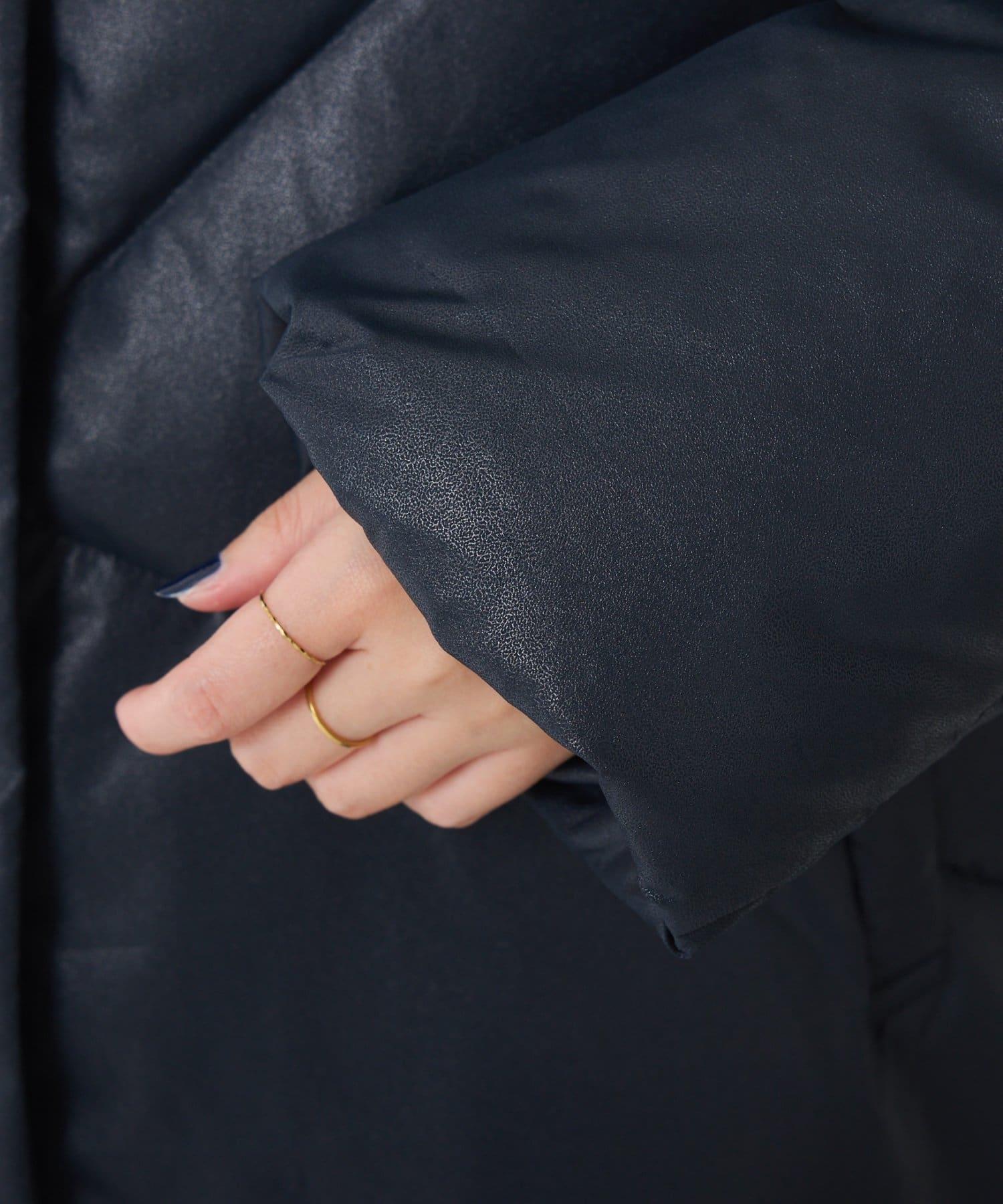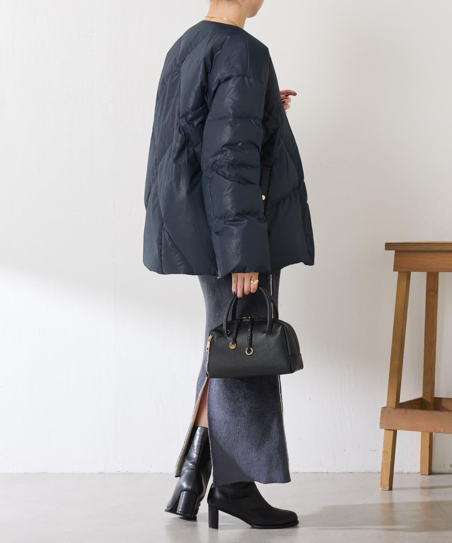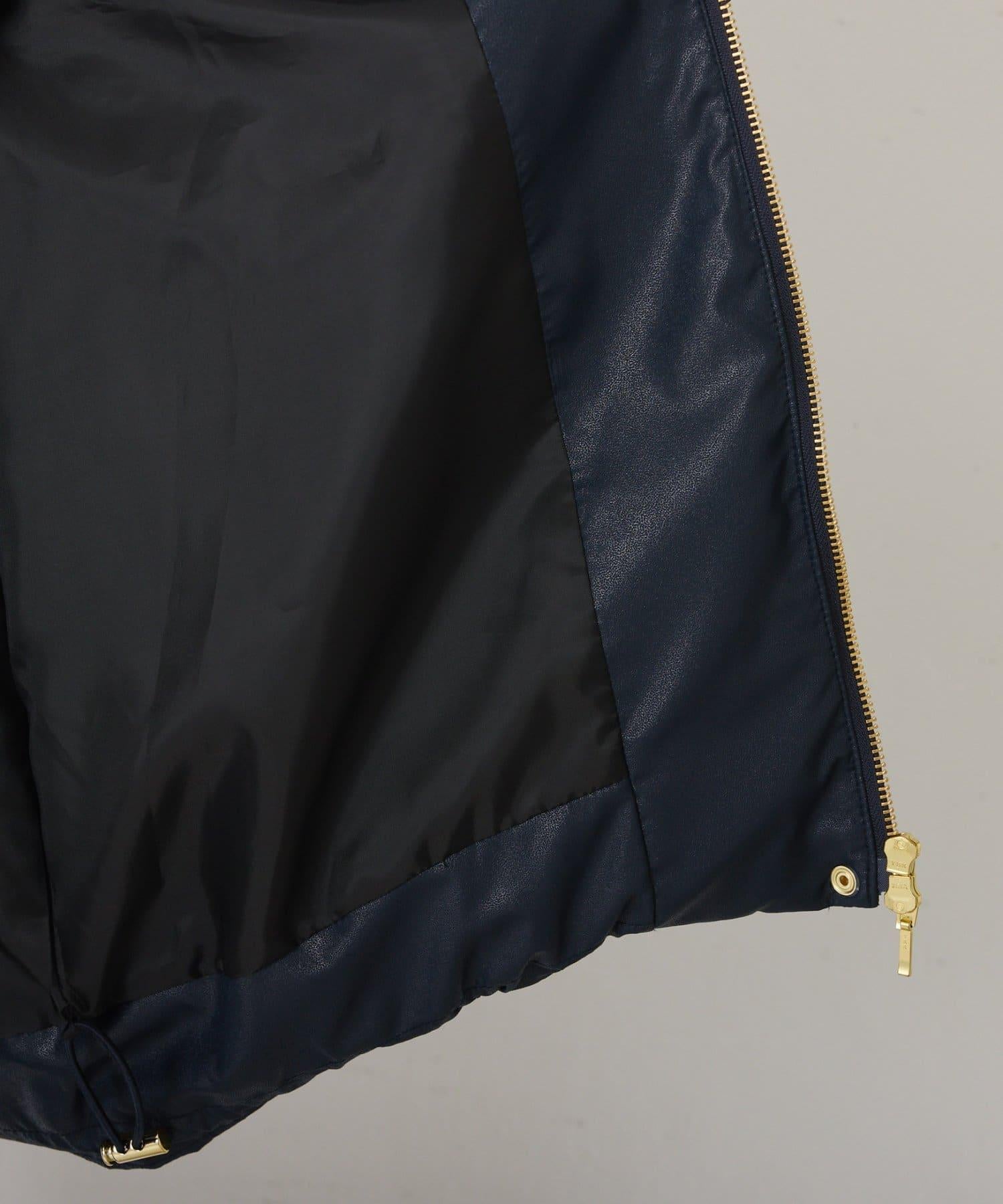 這款無領羽絨服採用壓花織物,看起來像皮革。啞光質感給人以沉穩的印象。