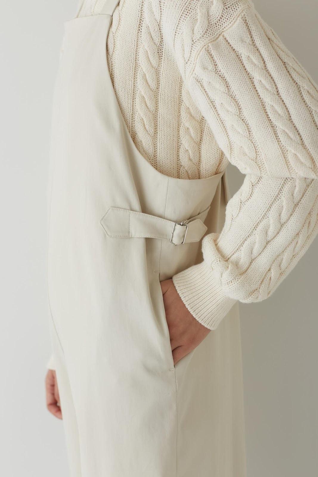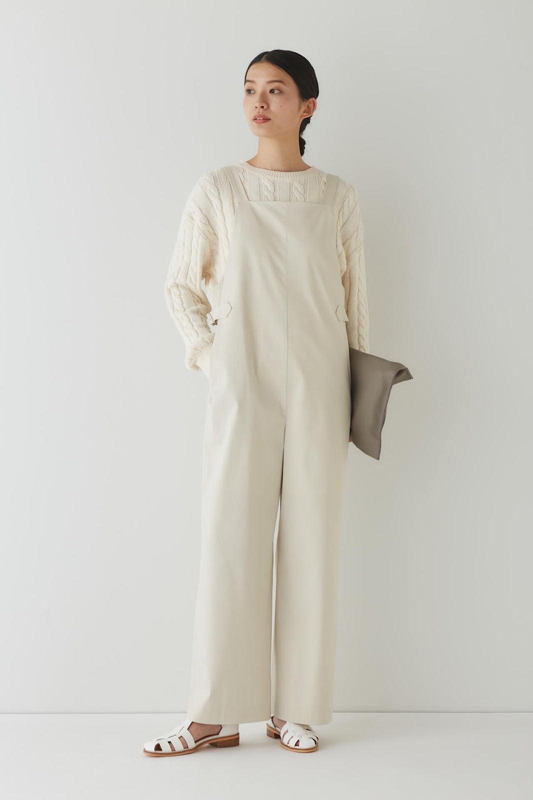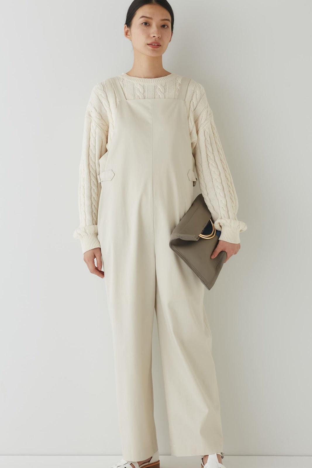 輕鬆打造成人風格的組合 [設計要點] 這款設計簡潔、略帶光澤的組合優雅大方,可通過肩帶背面的圓點紐扣調節長度。迷你腰帶系在側面,您可以寬鬆地穿著,也可以收緊腰帶,讓您看起來更豐滿、更嫵媚。棉質斜紋布面料與 Cupro 混紡面料使其呈現出優雅而略帶光澤的效果。推薦搭配】由於這是一款休閒單品,建議與小巧的針織衫、夾克和其他精美單品搭配。