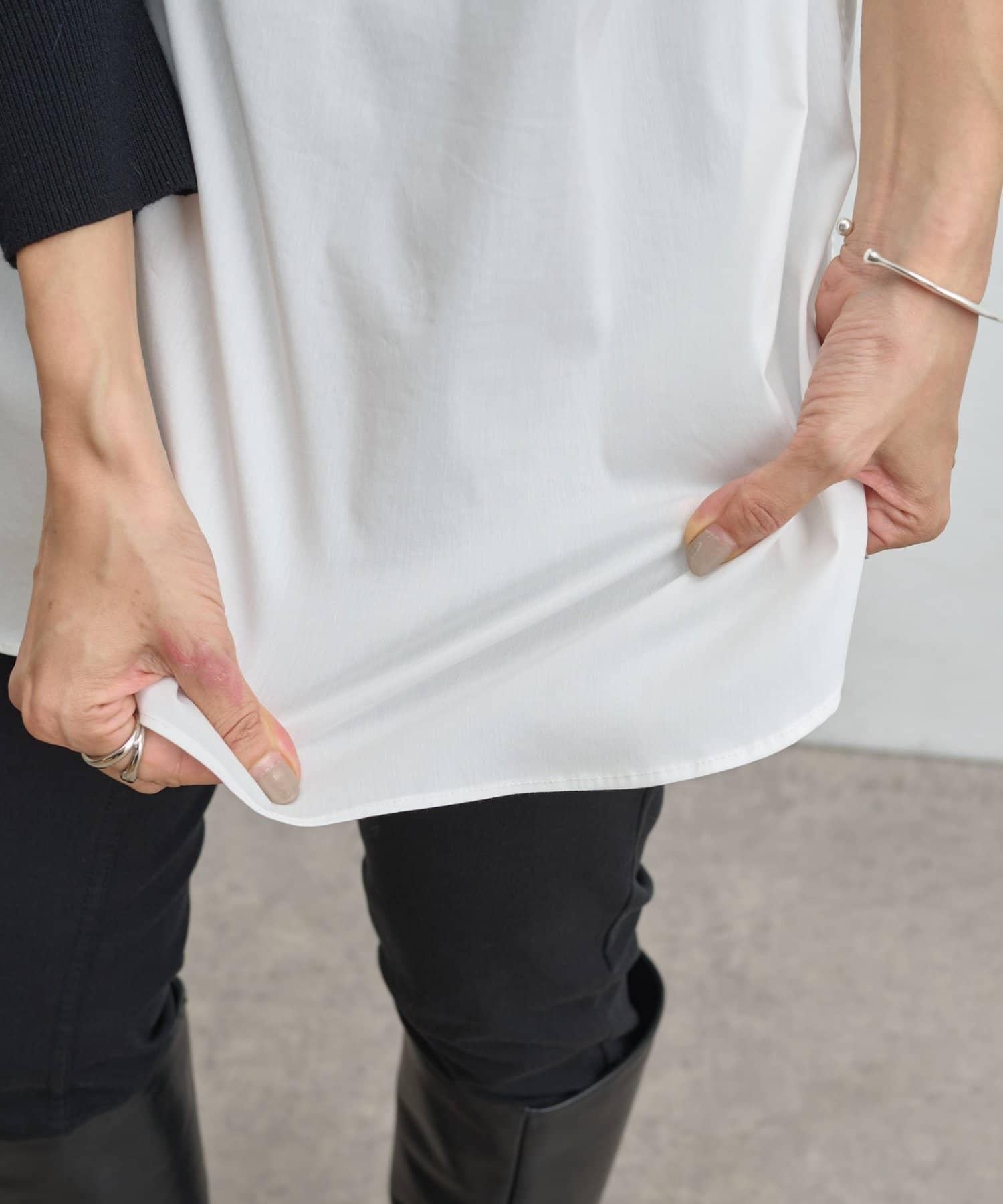 梭織部分在側面隨意切換,前後不同的下襬隱藏了腰部區域,穿起來很整潔。