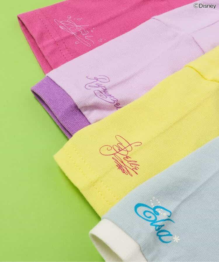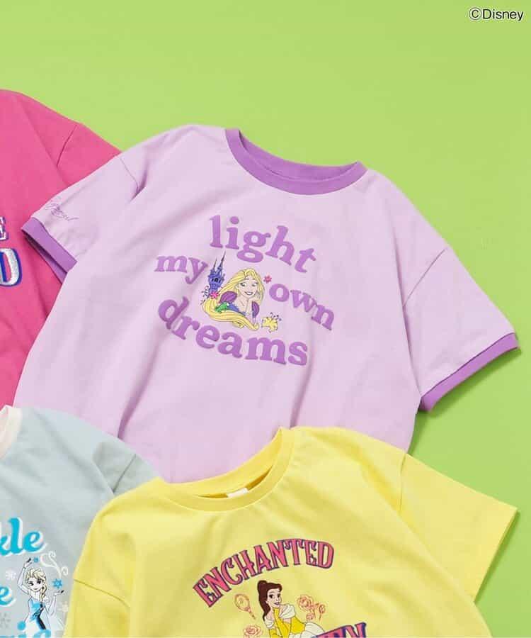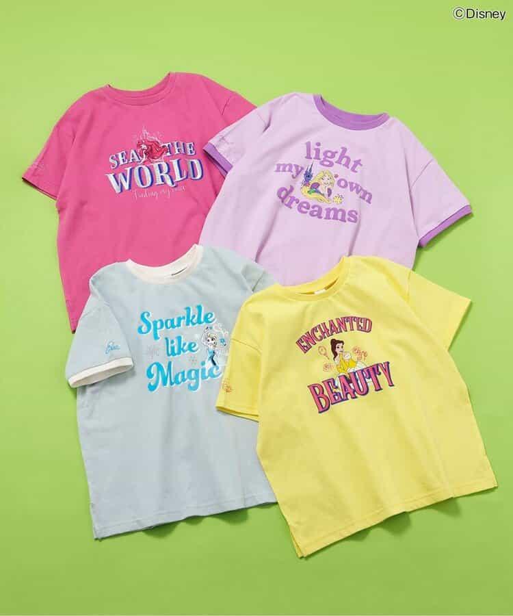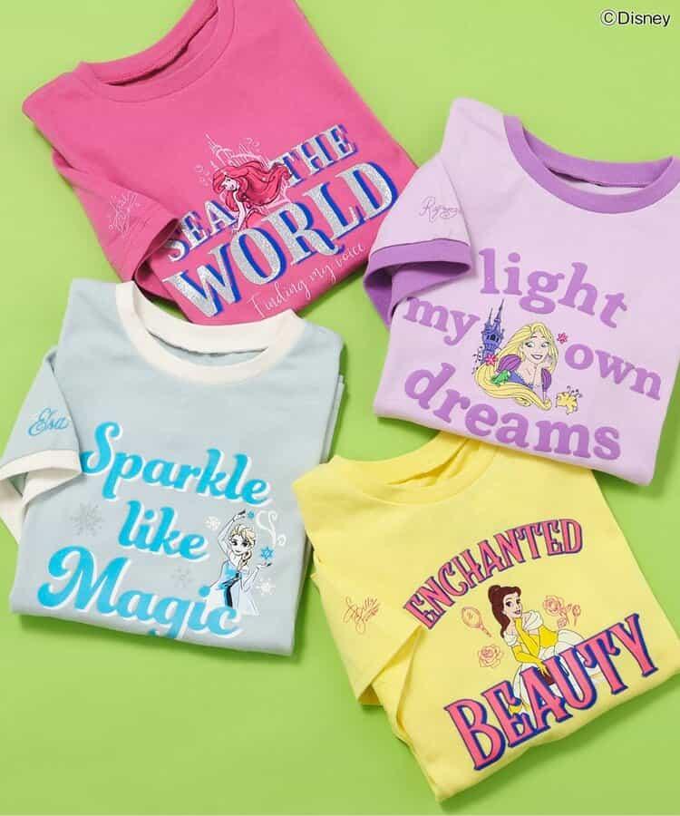 以長髮公主(Rapunzel)、愛麗兒(Ariel)、貝兒(Belle)和艾莎(Elsa)為主題的 T 恤,採用少女般的色彩和設計。