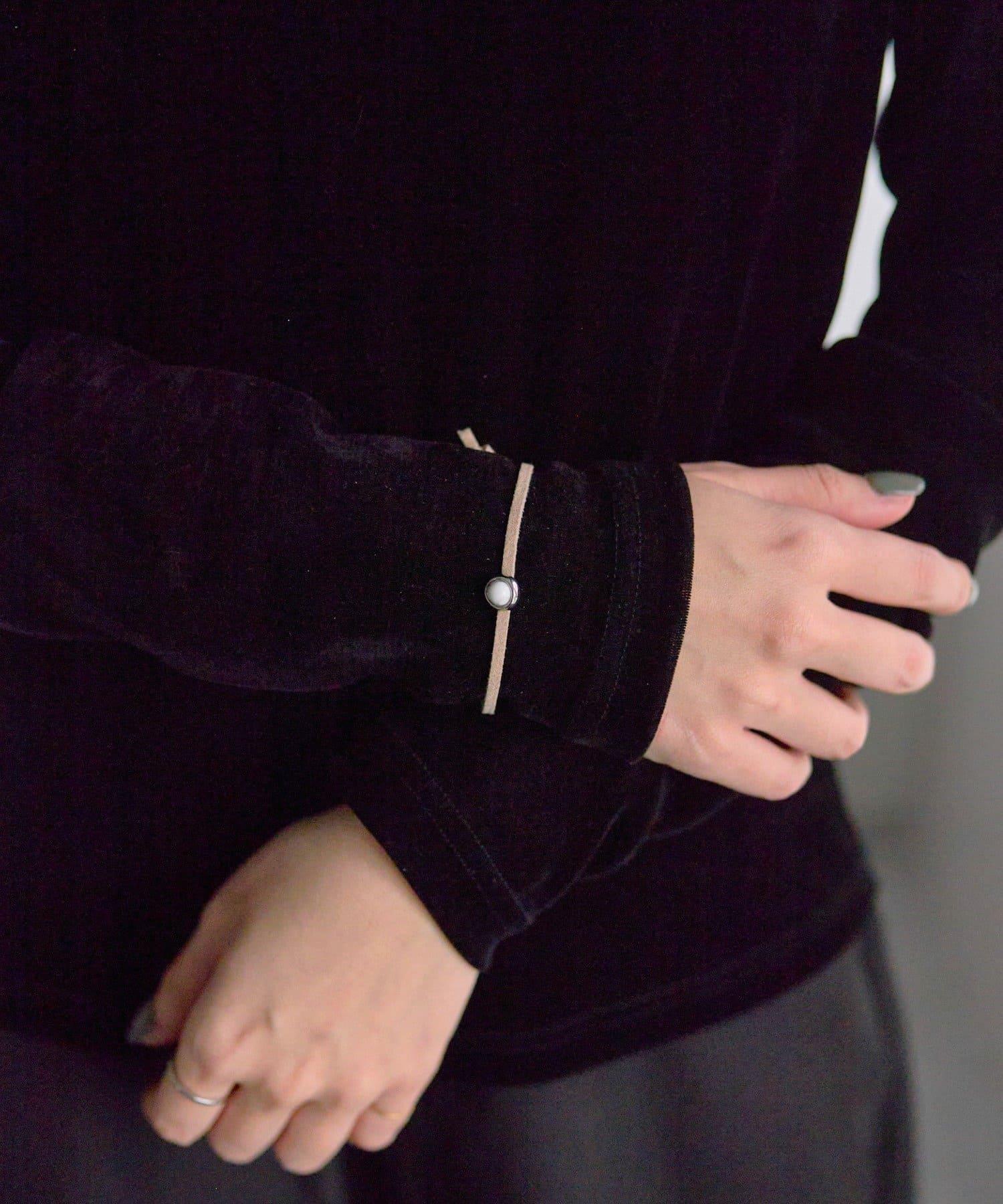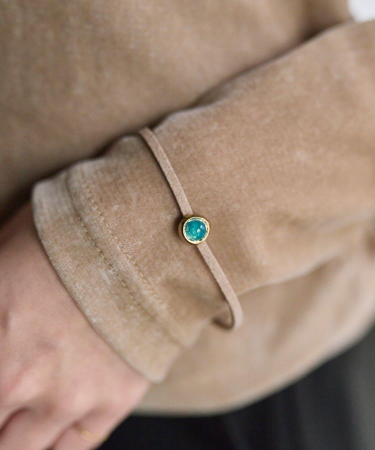 為手部增添微妙的光澤。彩色凸圓形小手鐲 "配麂皮帶。