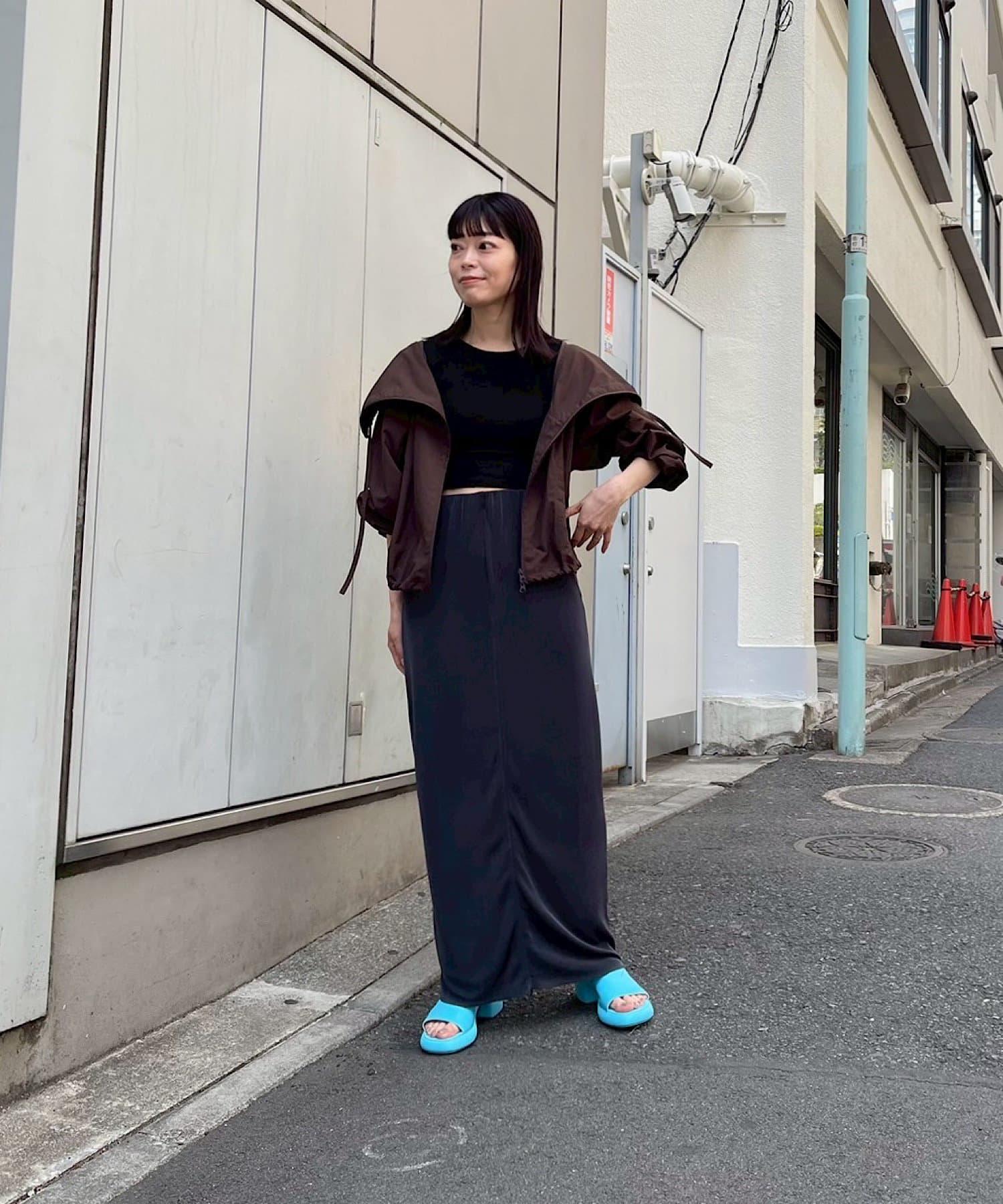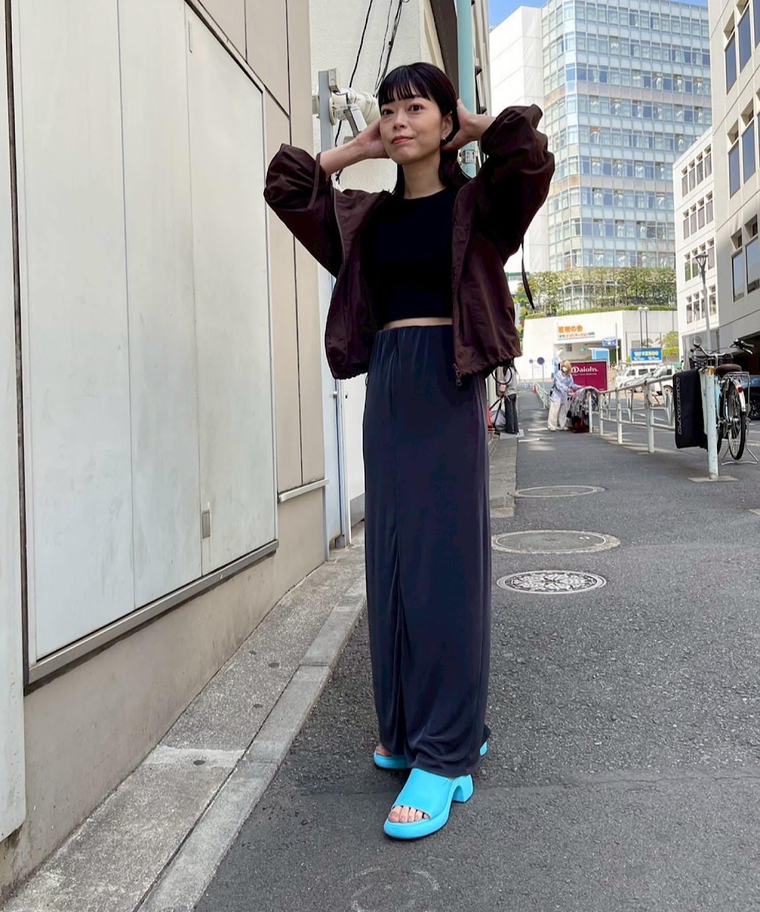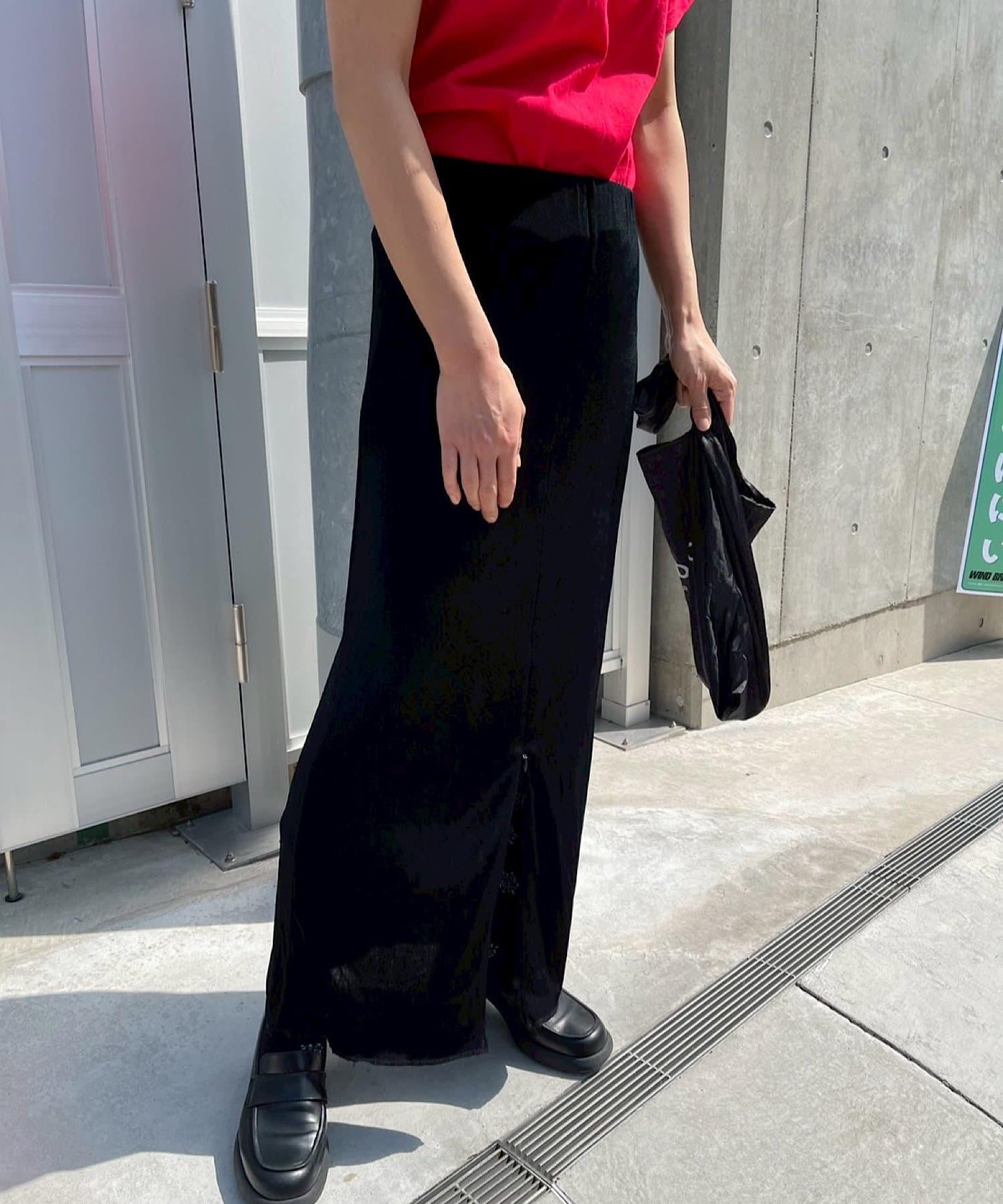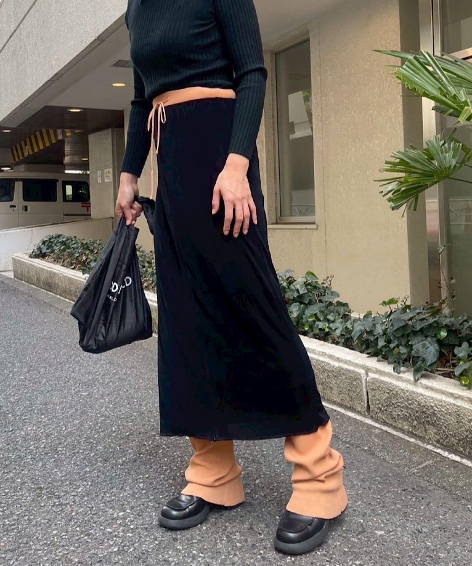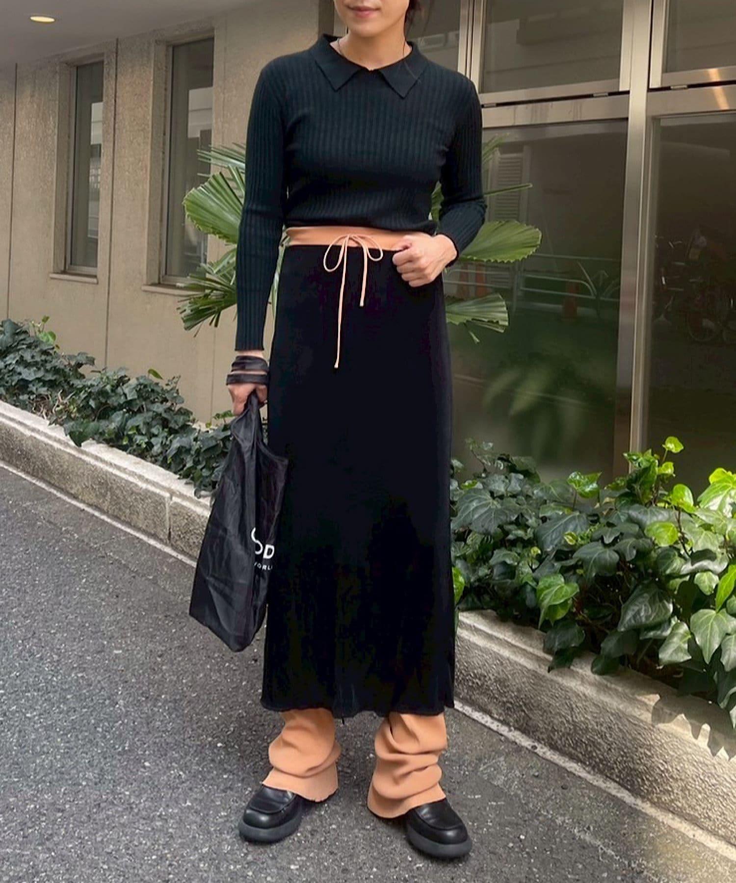 腰部的鬆緊帶可以提至胸前,作為裸上衣穿著;在 STYLE LOOK 中,它被設計成迷你長款外衣裸裙。同樣面料的透視羅紋喇叭褲也可供選擇。(長褲有黑色、棕色和紅色可供選擇)。此外,強烈建議與赤裸外衣搭配作為套裝穿著。