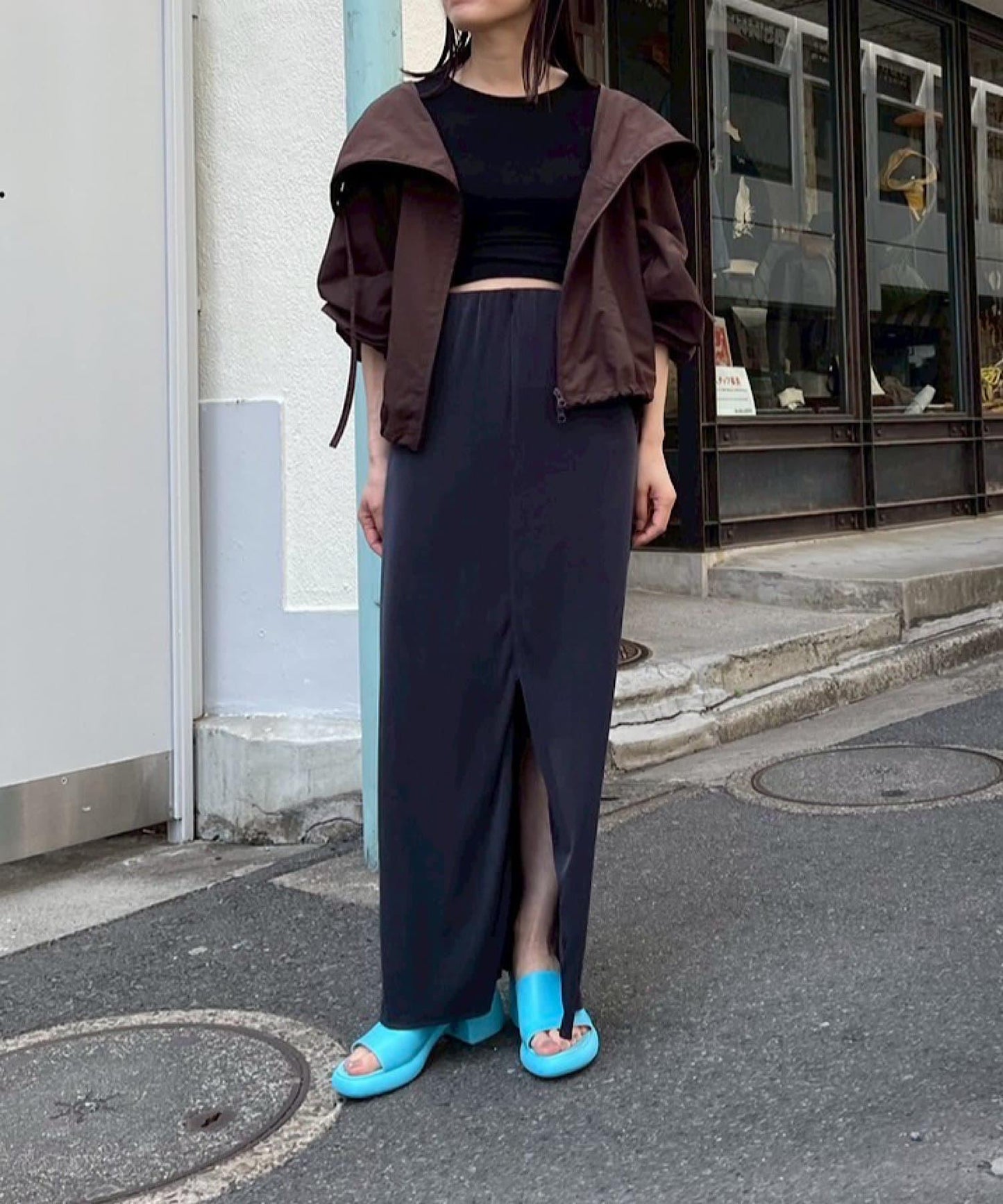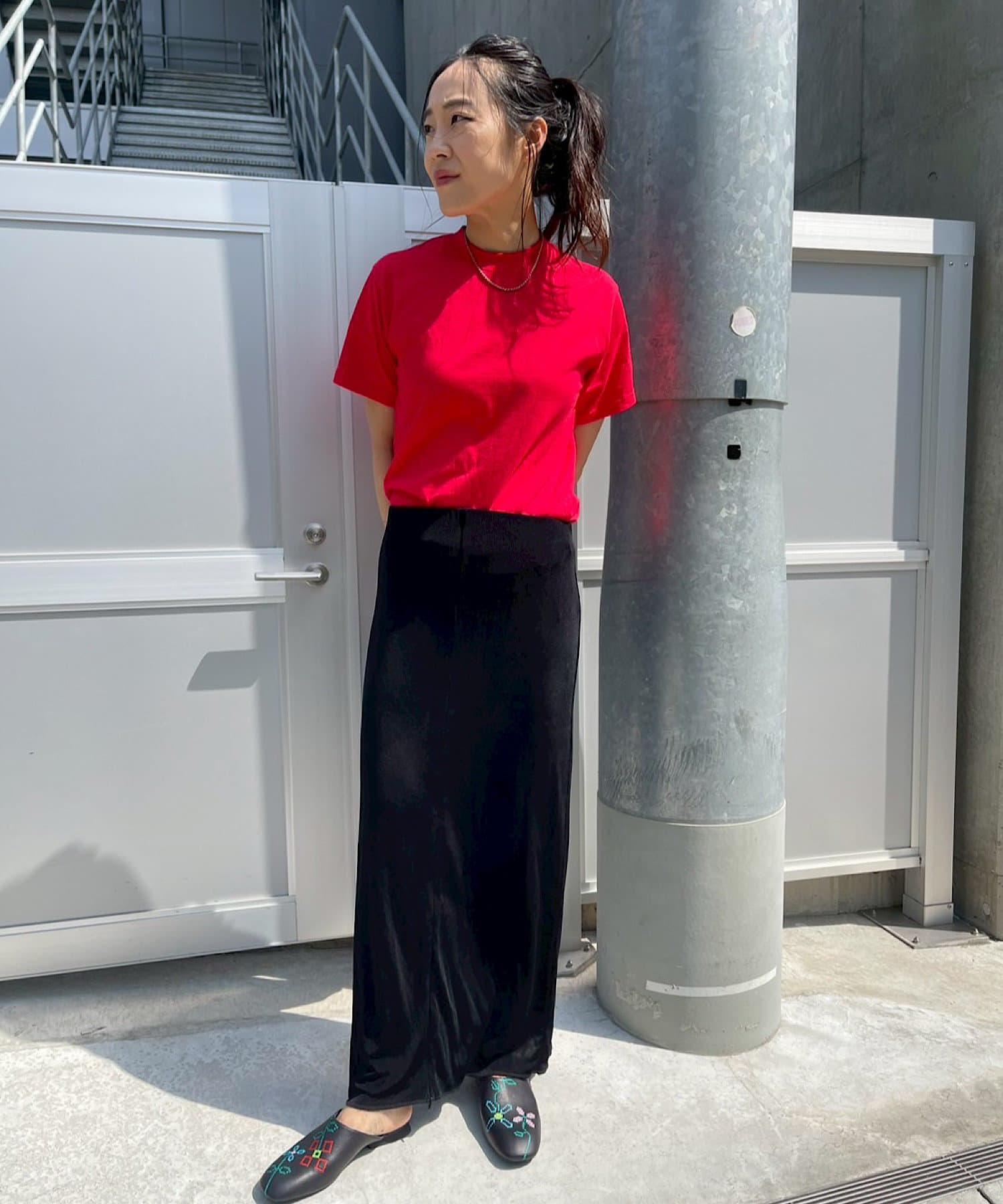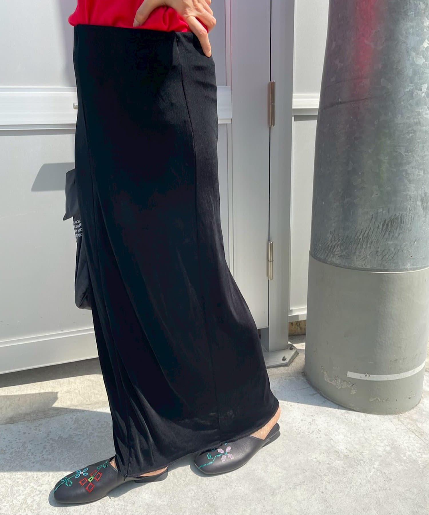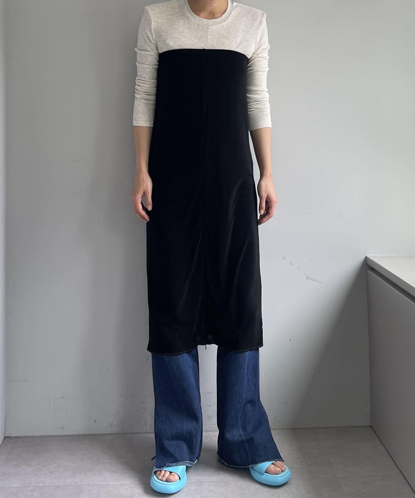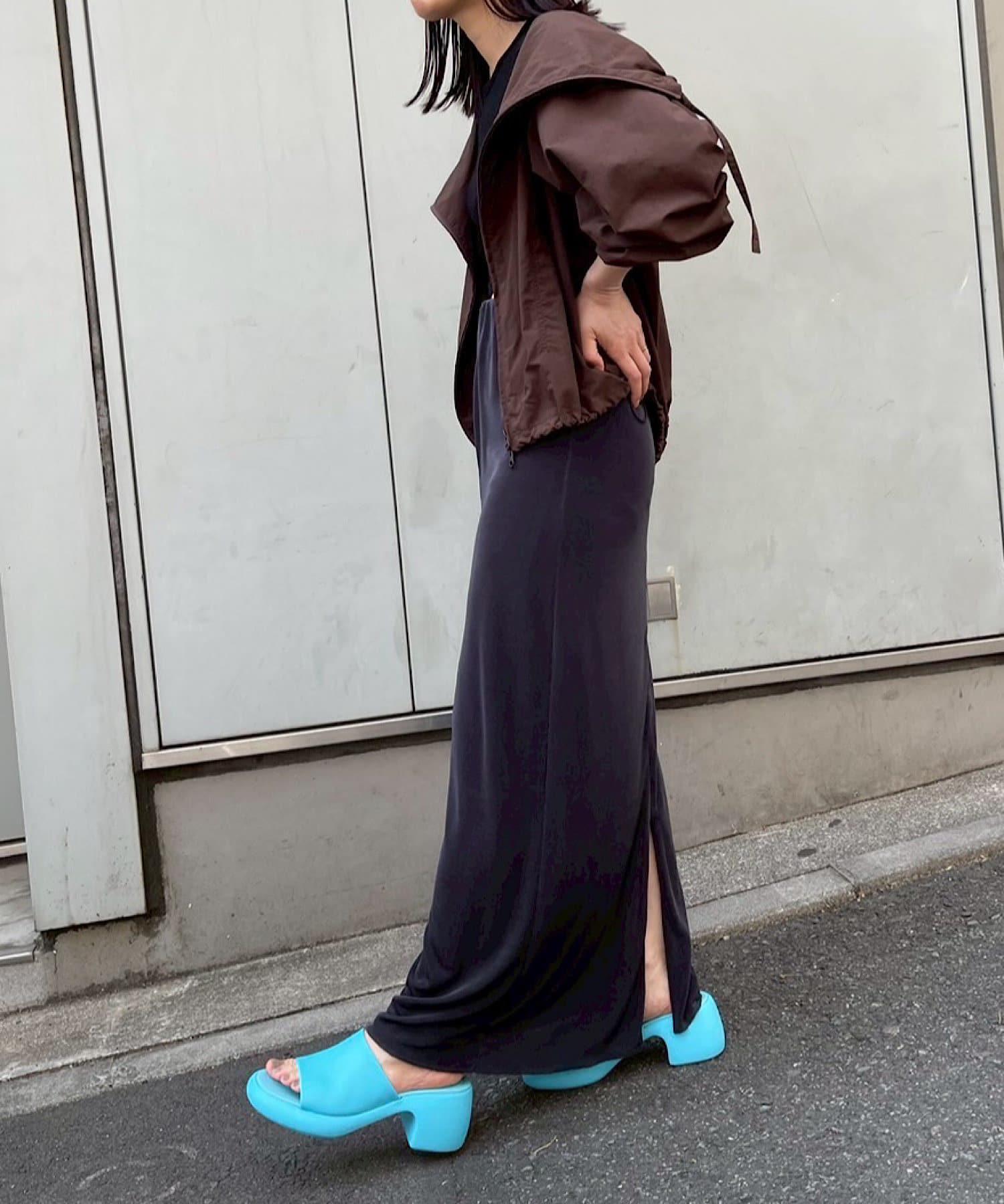 腰部的鬆緊帶可以提至胸前,作為裸上衣穿著;在 STYLE LOOK 中,它被設計成迷你長款外衣裸裙。同樣面料的透視羅紋喇叭褲也可供選擇。(長褲有黑色、棕色和紅色可供選擇)。此外,強烈建議與赤裸外衣搭配作為套裝穿著。