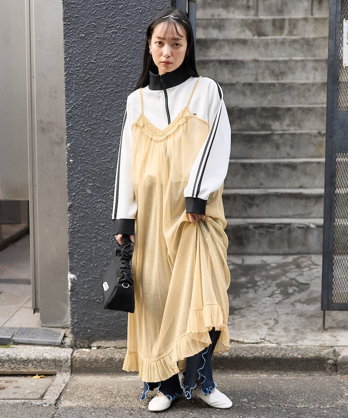 這款吊帶連衣裙的胸部和下襬均飾有荷葉邊。