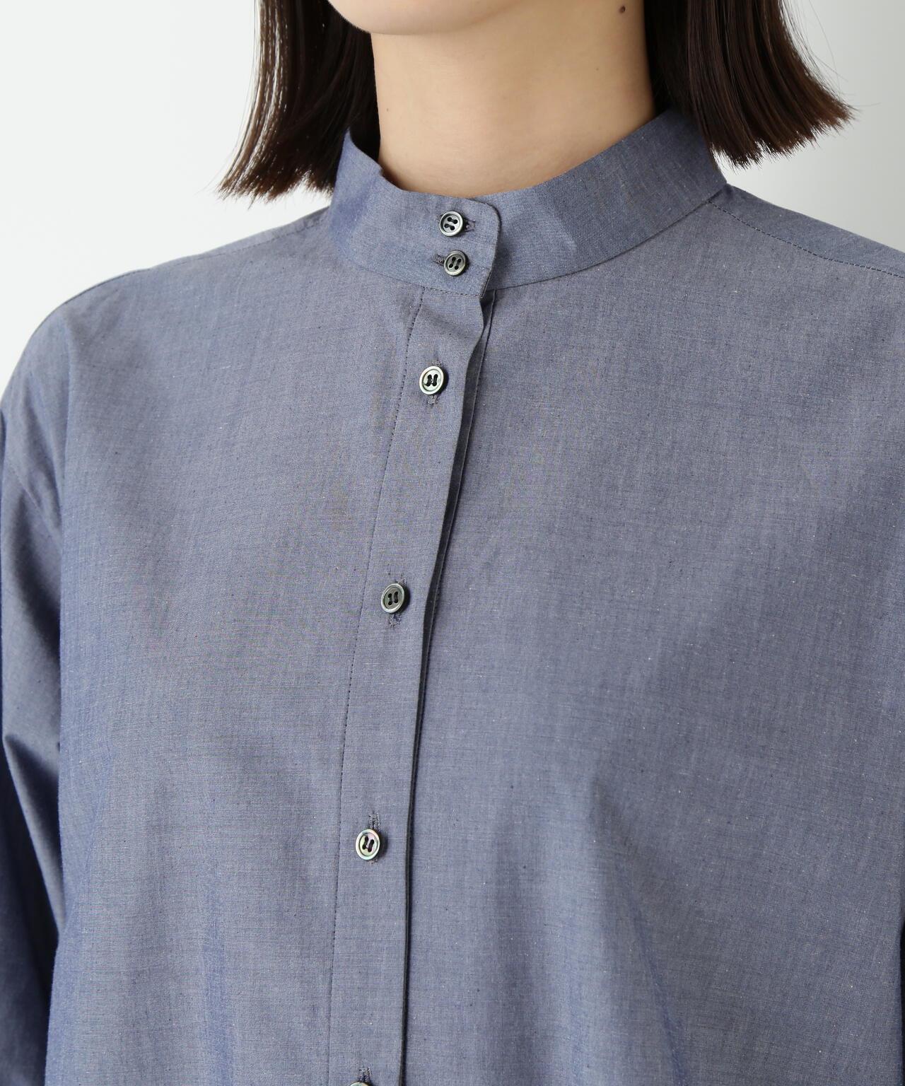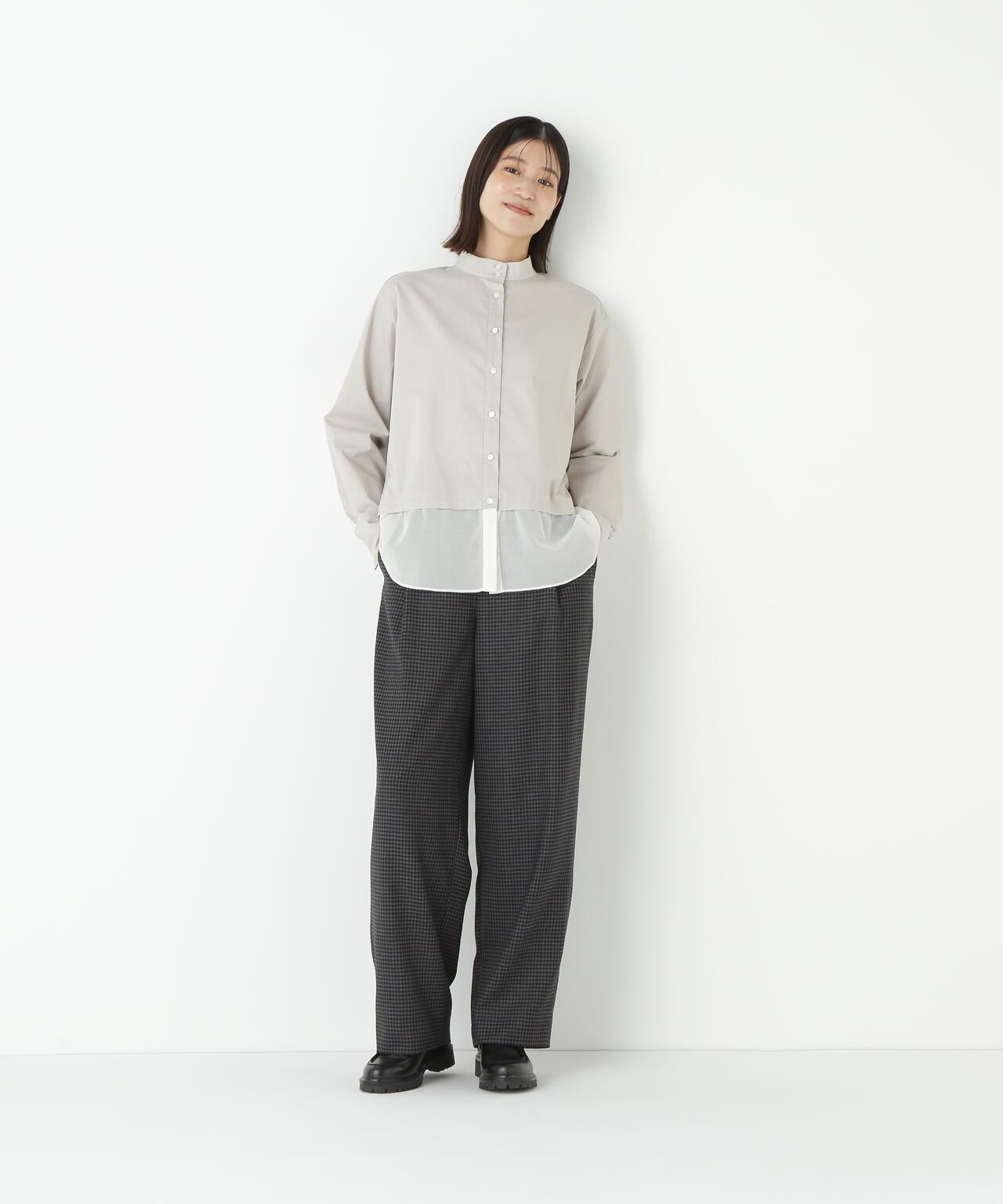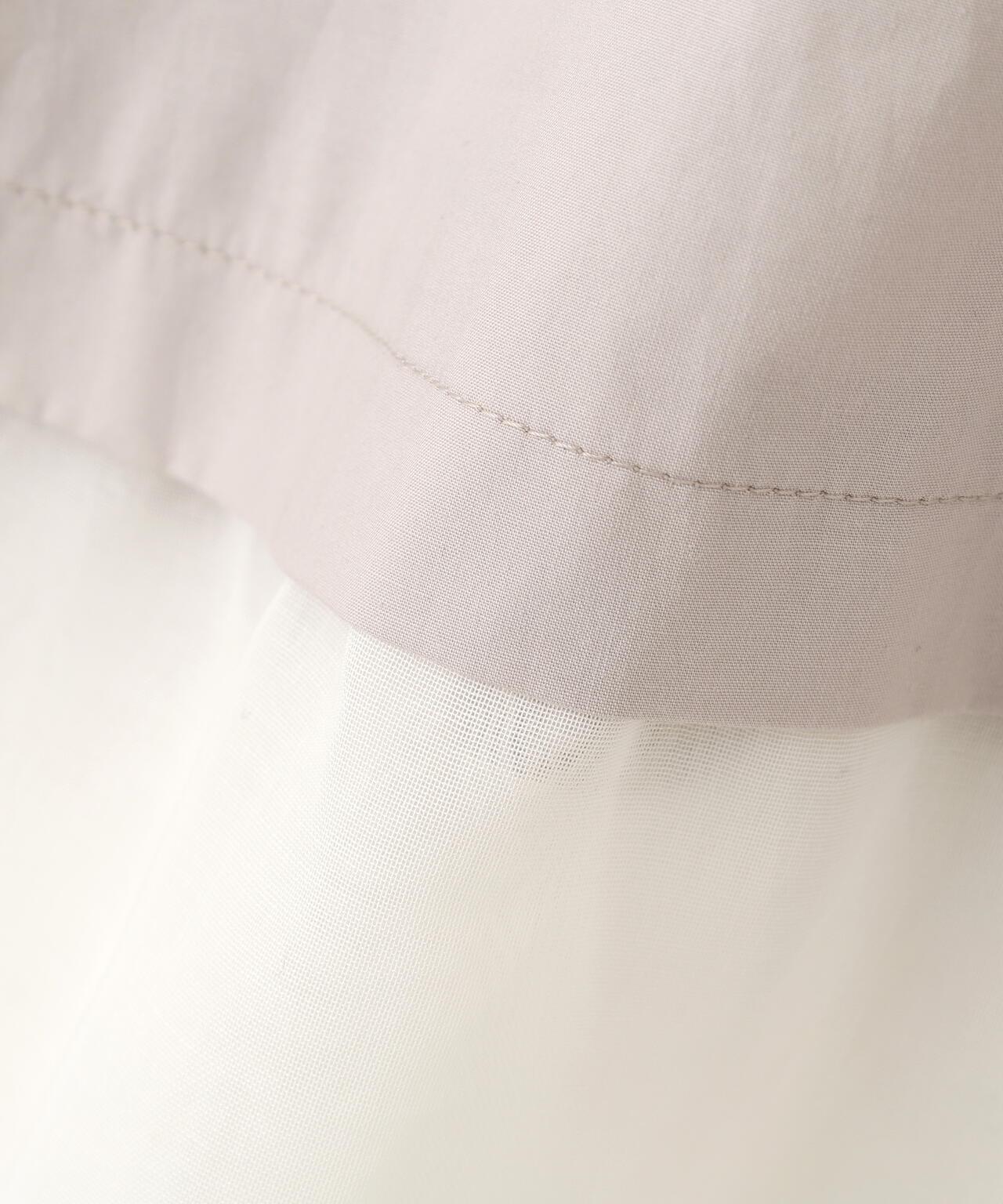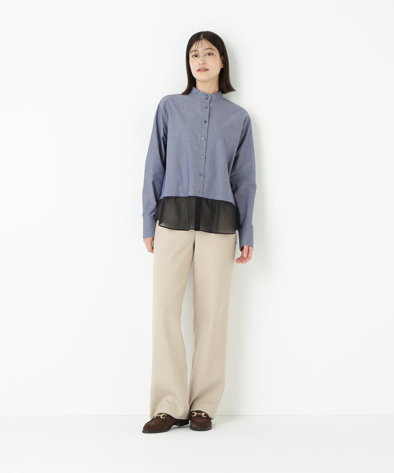 高領襯衫,下襬波點處採用透視面料。衣身由有機棉襯衫面料製成,具有適度的洗衣感。下襬採用優雅的棉質歐根紗製成,手感乾爽而富有彈性。衣身採用洗水手感適中的有機棉襯衫面料,下襬採用乾爽彈力的優雅純棉歐根紗面料。