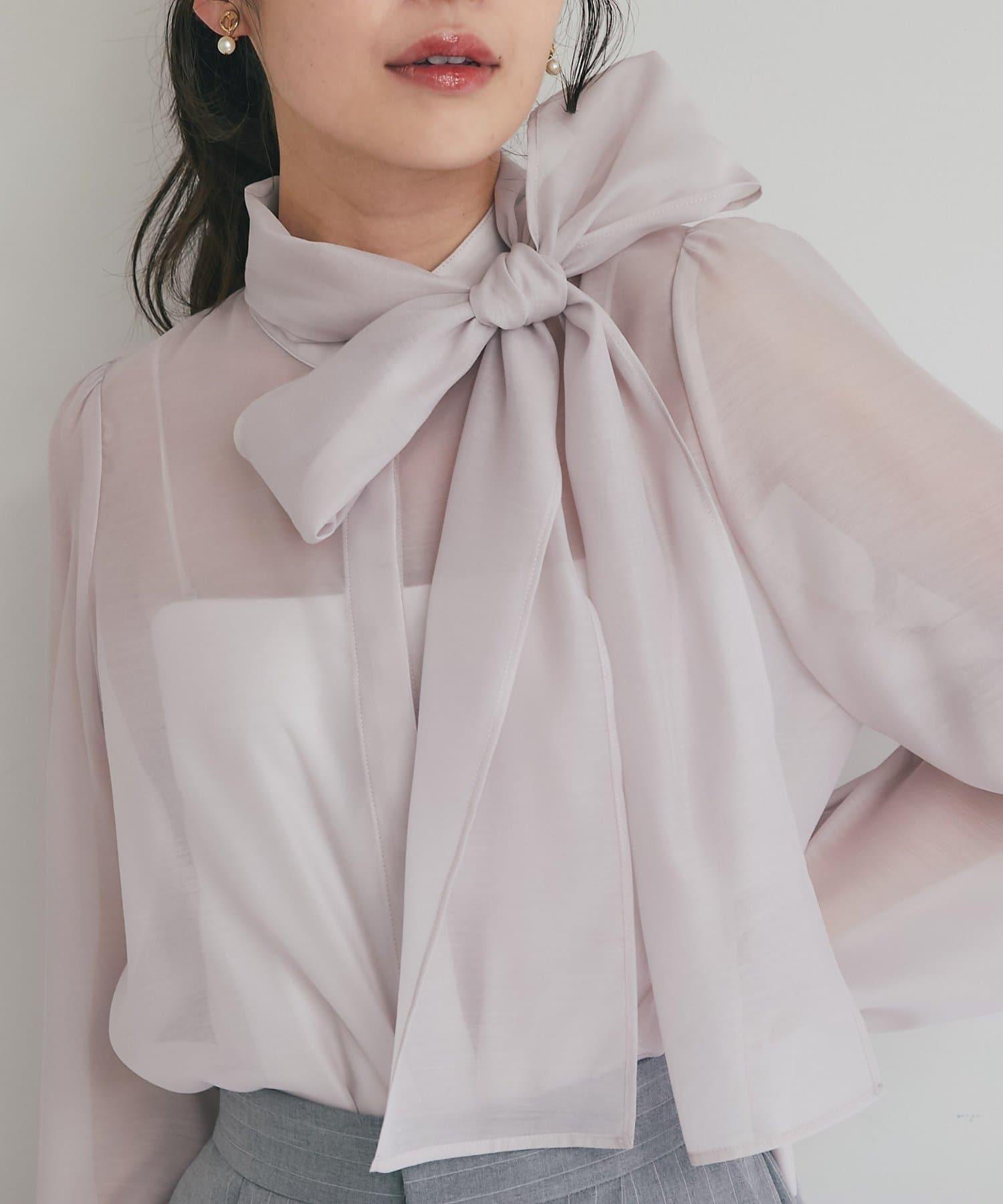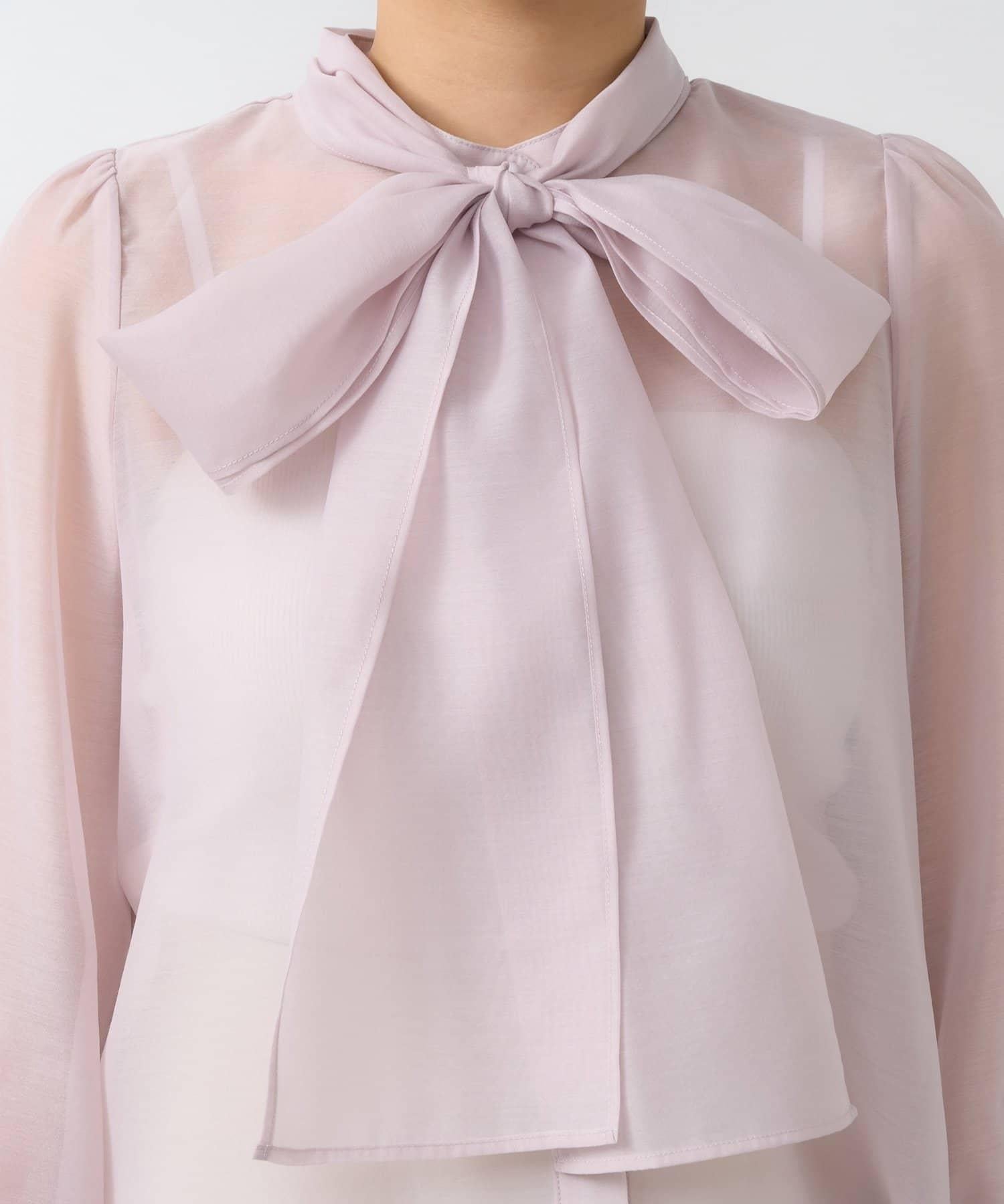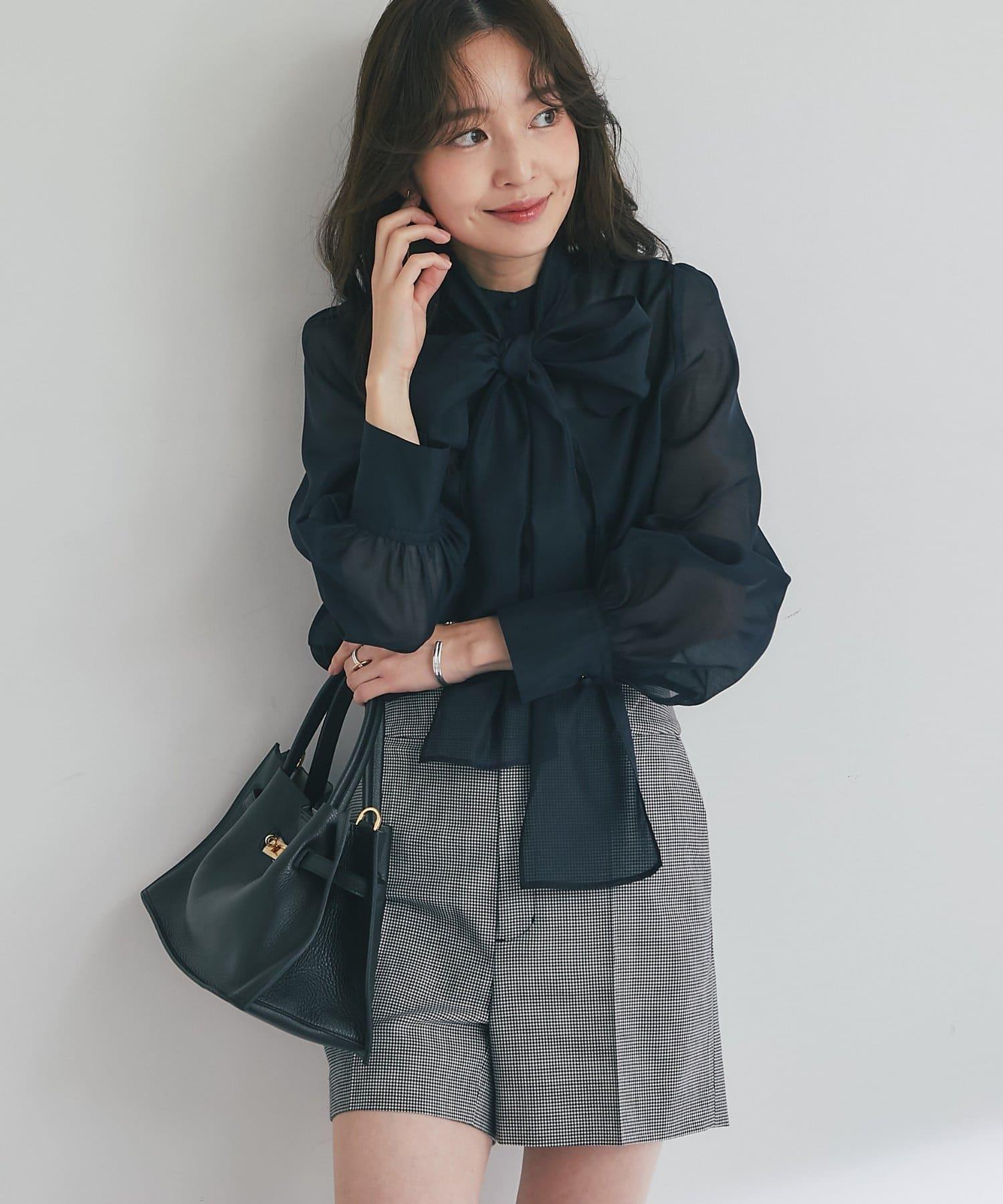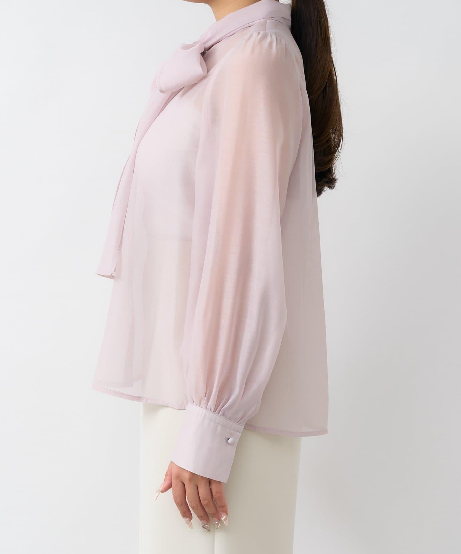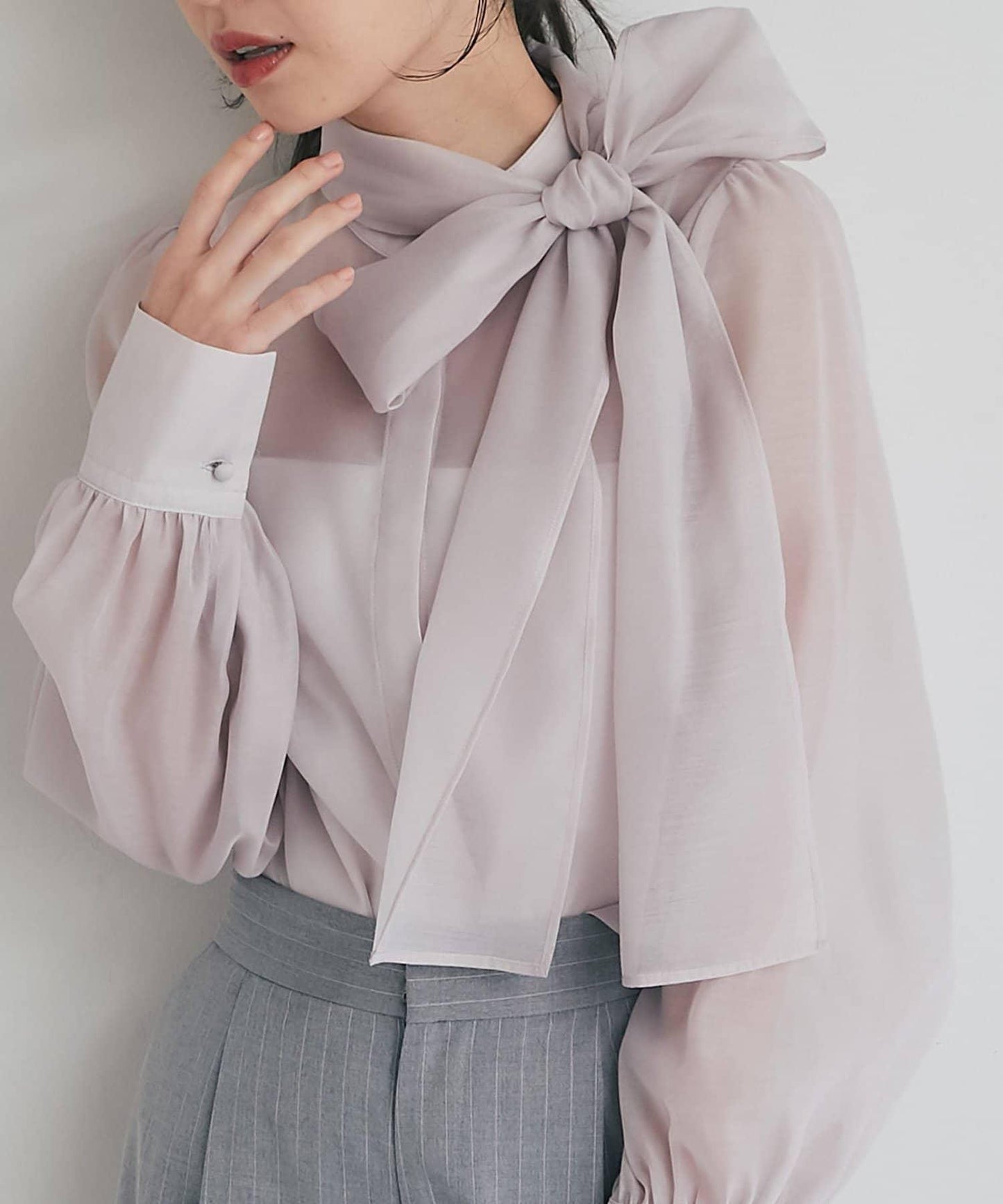 帶有大蝴蝶結領結設計的透視上衣既迷人又優雅。