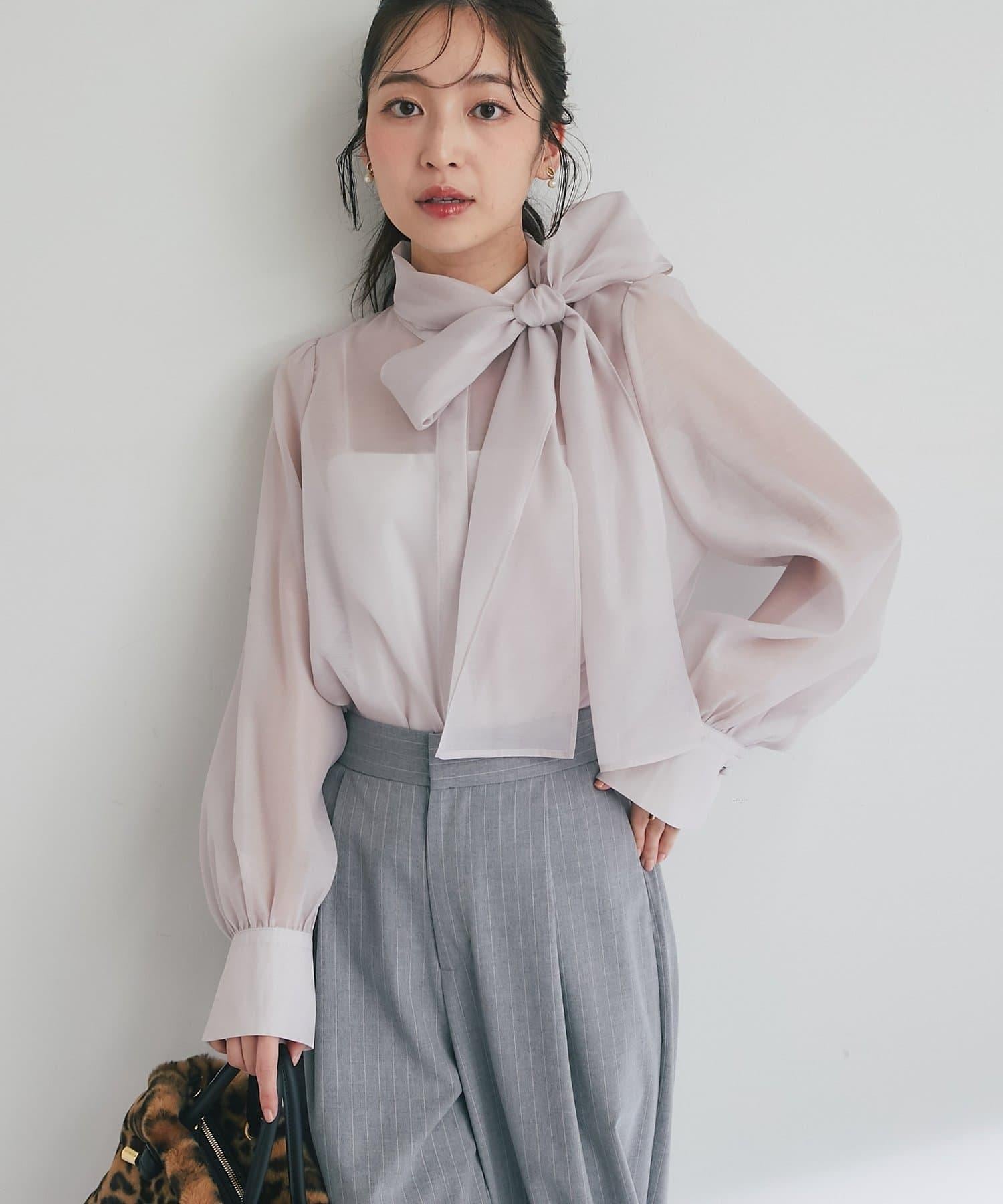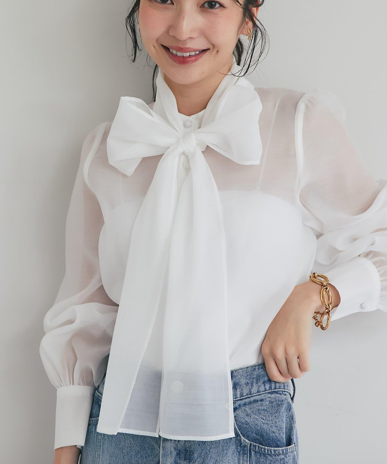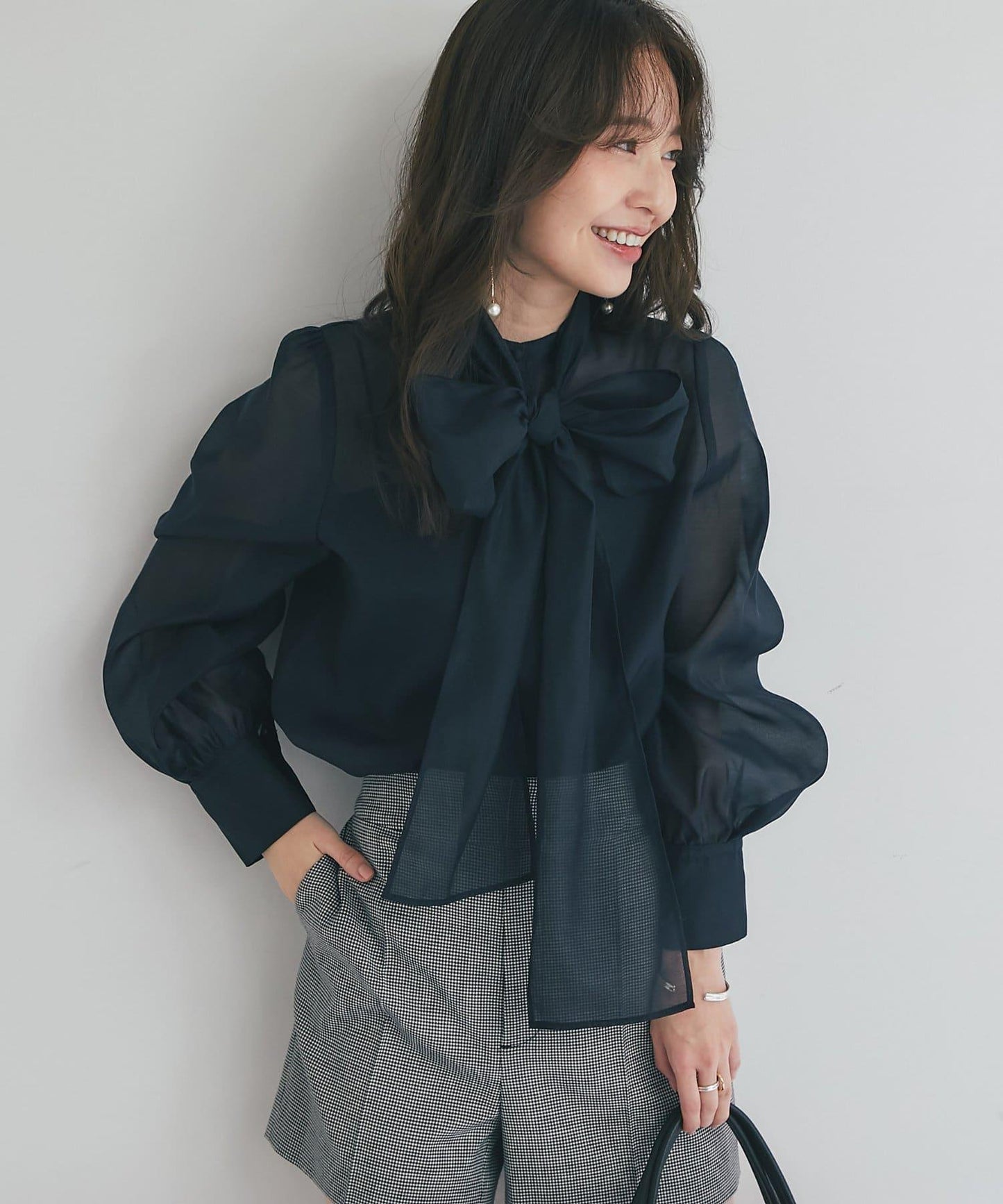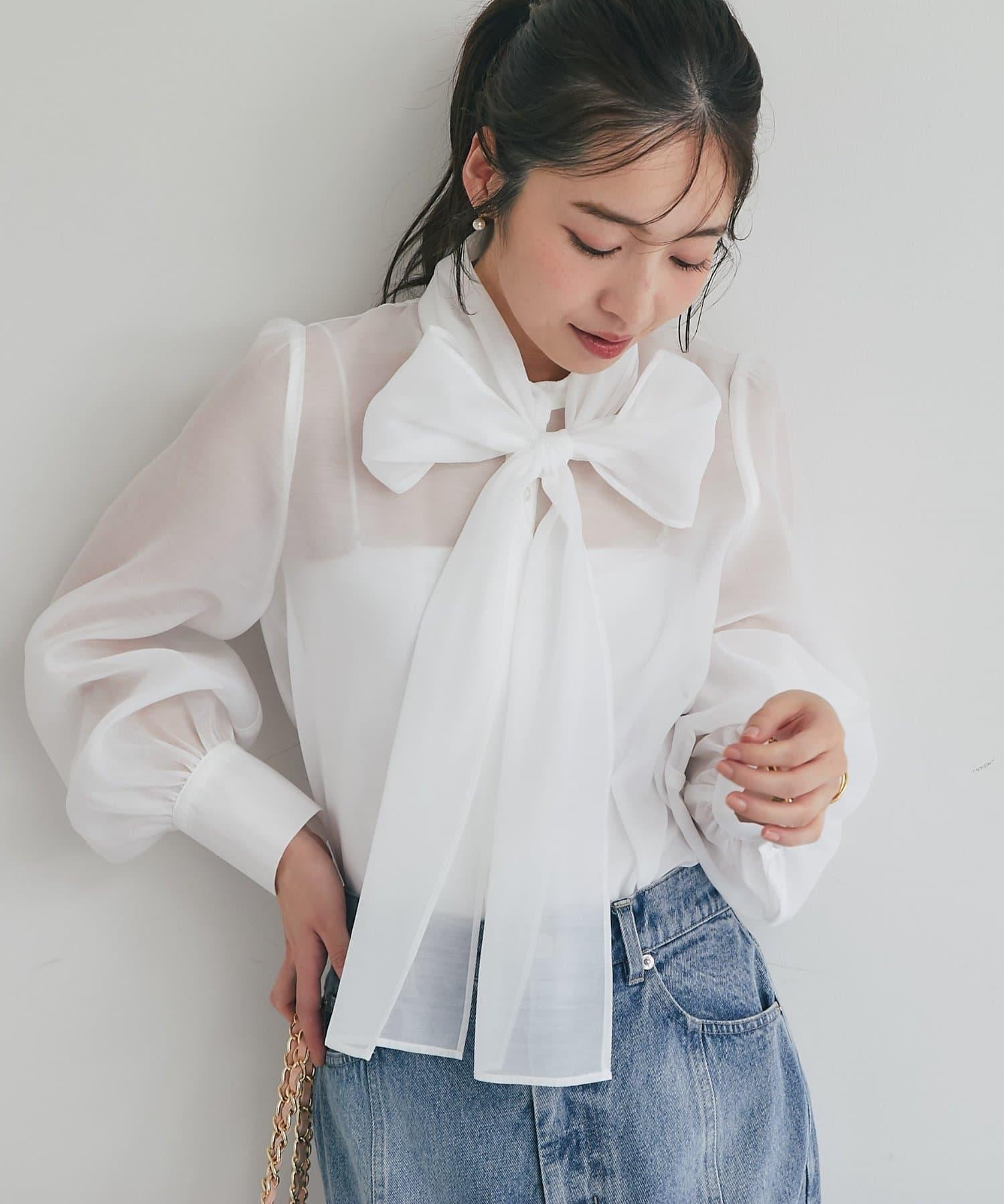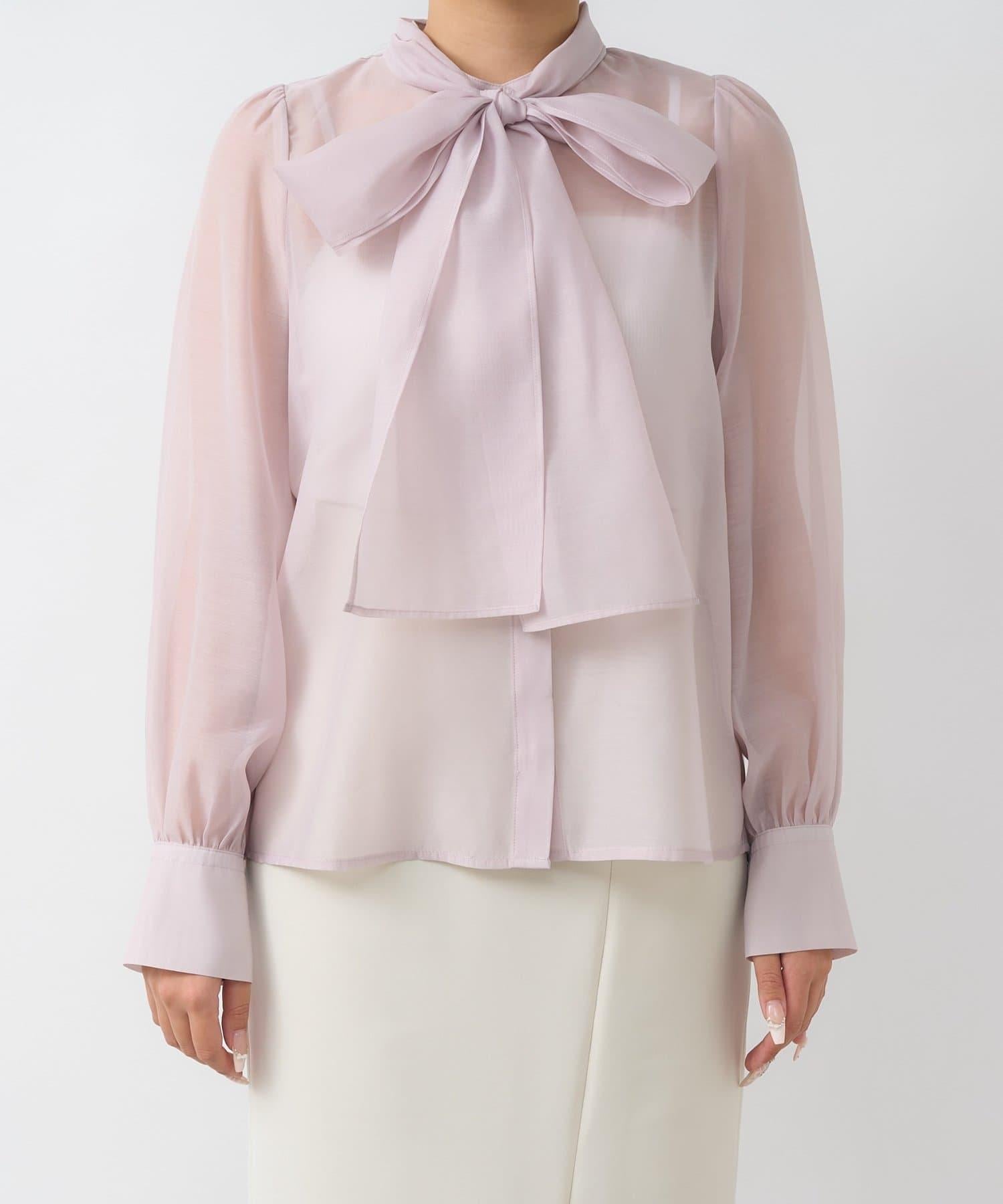 帶有大蝴蝶結領結設計的透視上衣既迷人又優雅。